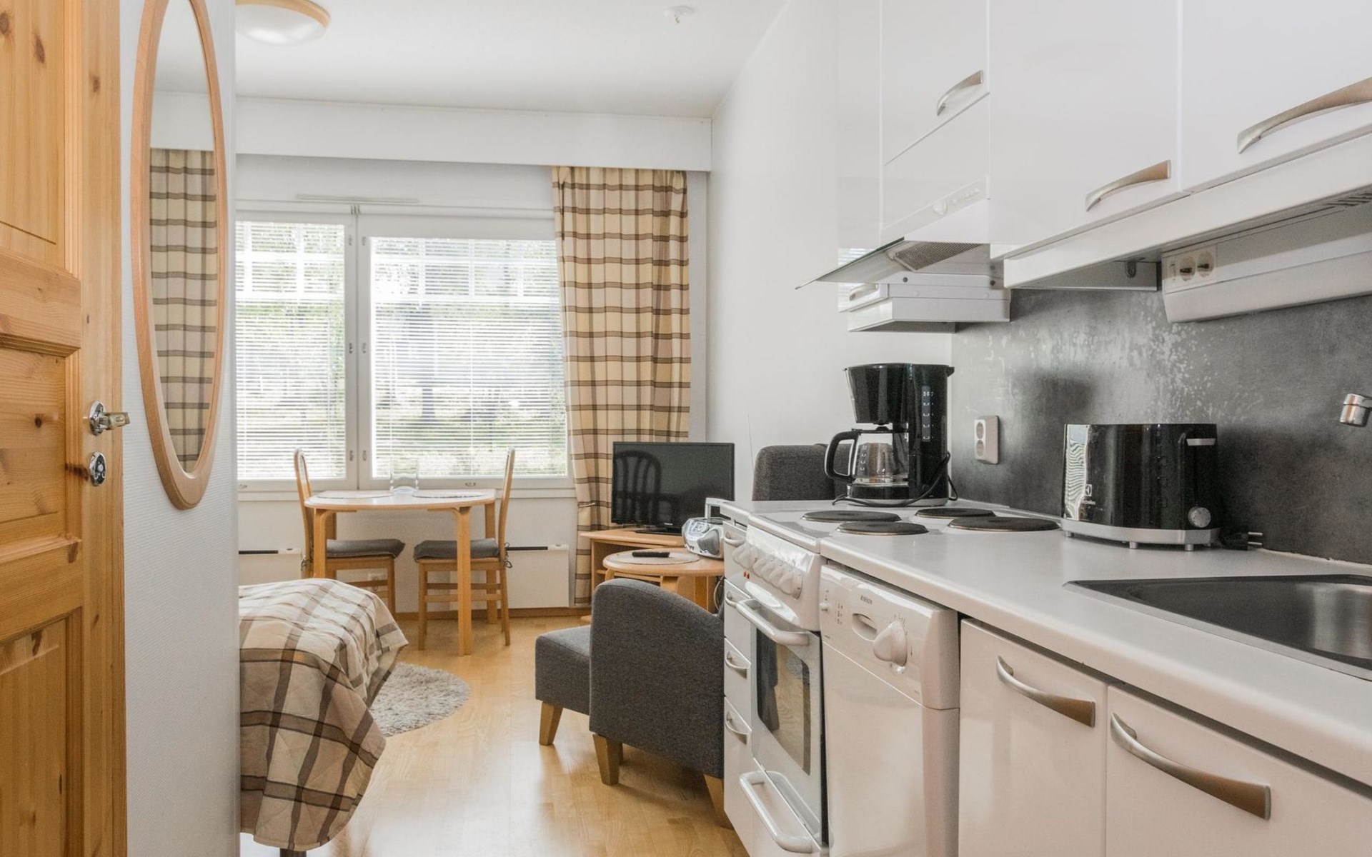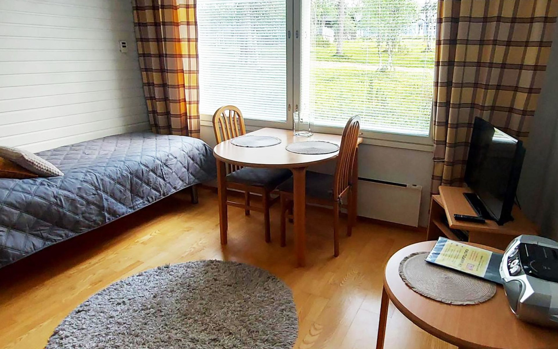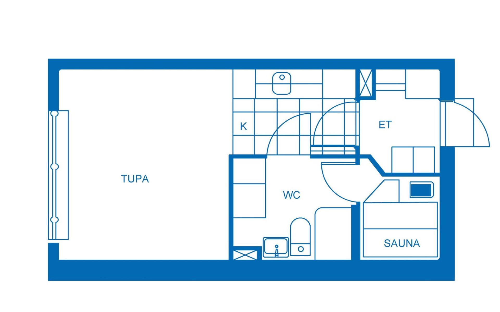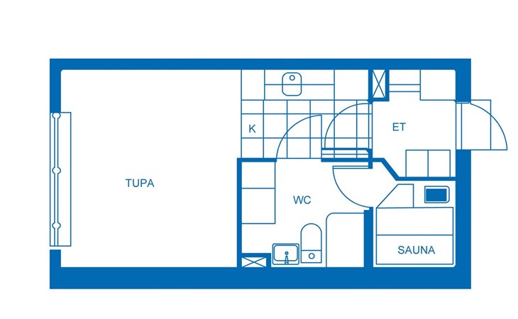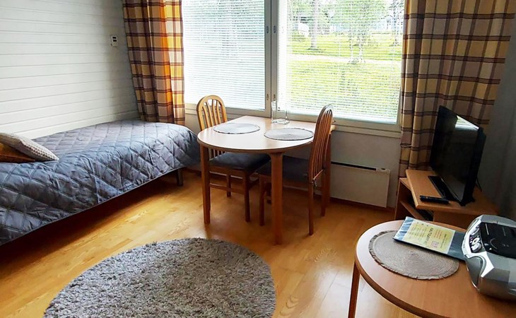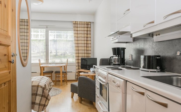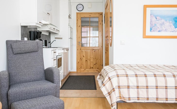 In a 25-square-meter apartment, there is a kitchen/living room, a washroom/toilet, a sauna and a small storage room. Living room with 2 beds. Common ski maintenance room in the premises of the neighboring Outapailakka -house. The key to this room can be found on the wall of the apartment's lockable outdoor storage room. Apartment is renovated between 2022-25.
