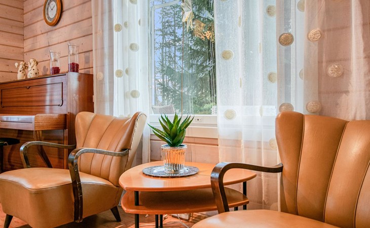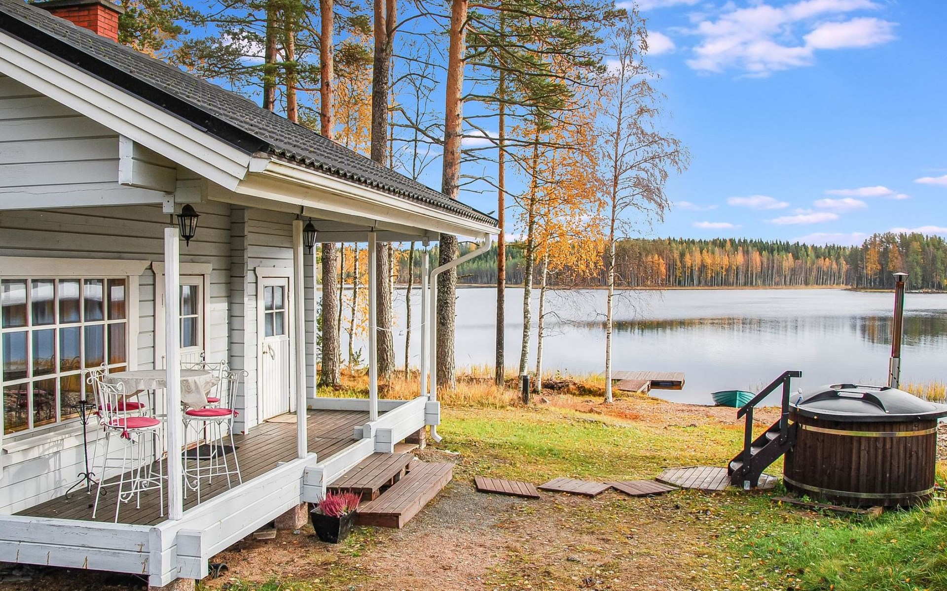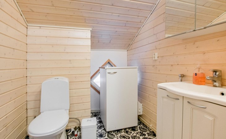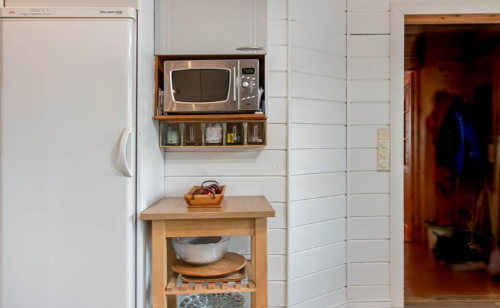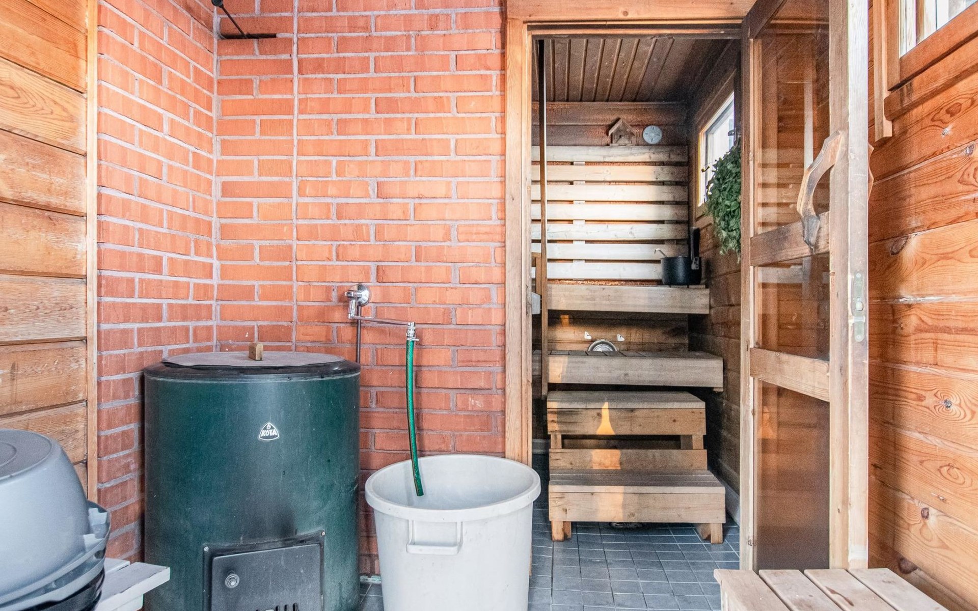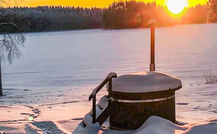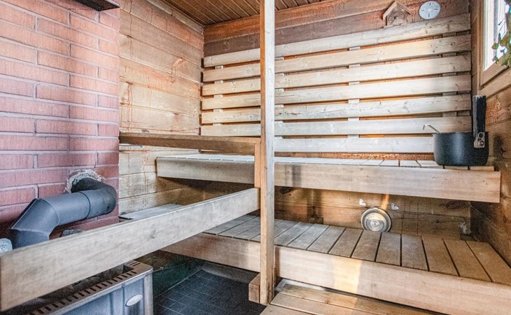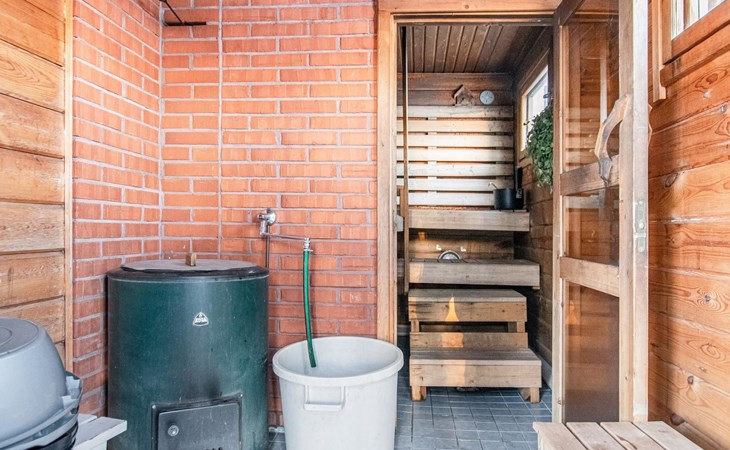 There is a separate lakeside sauna with living area. The living area is equipped with electric heating, a fireplace, and a refrigerator. The sauna features a wood-heated stove and cold water from a tap, with a cauldron for heating water.