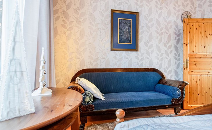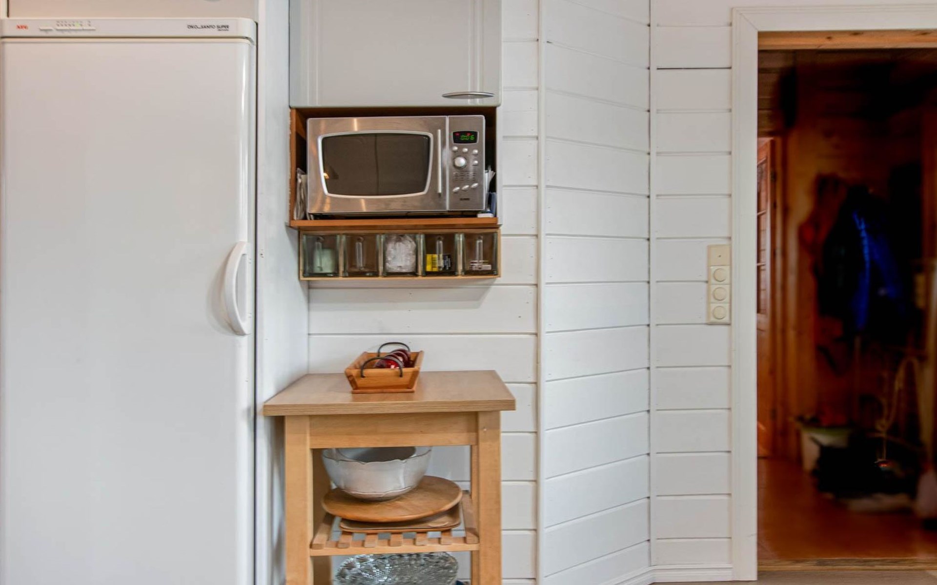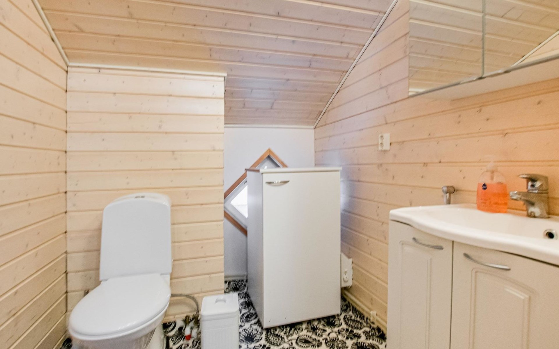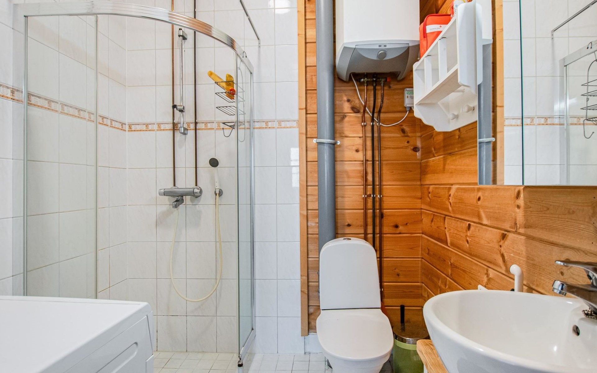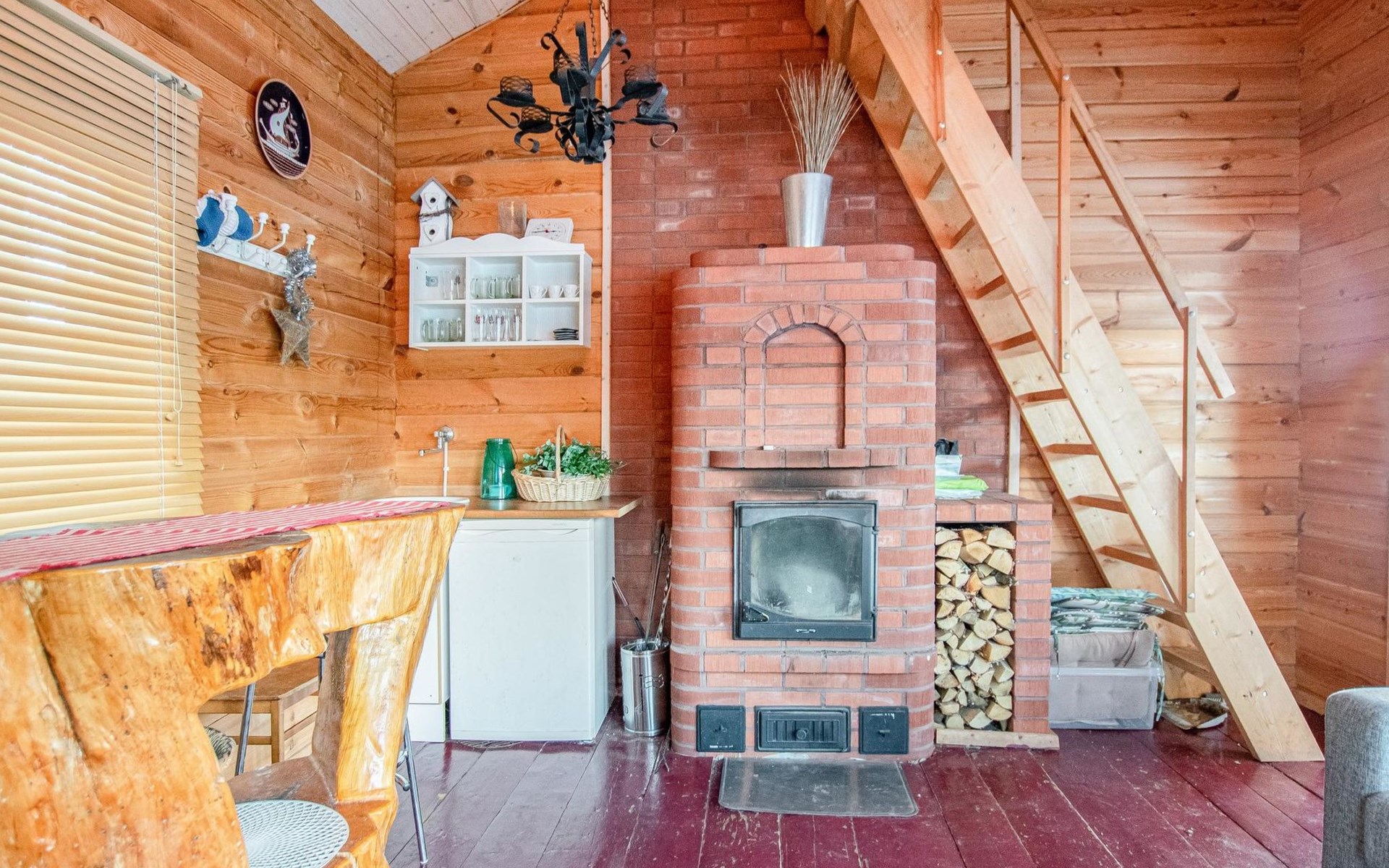 There is a separate lakeside sauna with living area. The living area is equipped with electric heating, a fireplace, and a refrigerator. The sauna features a wood-heated stove and cold water from a tap, with a cauldron for heating water.