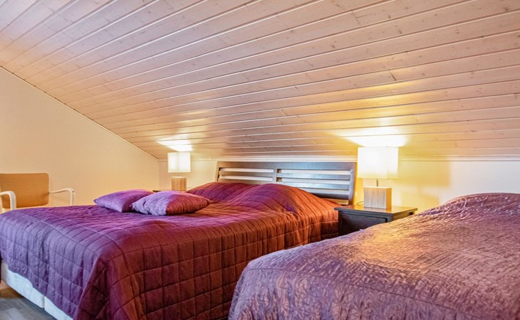 The cabin features a spacious living room with a sofa group, a heat-storing fireplace, large dining area, and a piano. The ground floor has one bedroom (double bed), a separate well-equipped kitchen, and a WC with a shower cubicle and washing machine. The upper floor includes two spacious bedrooms, each with a double bed and an additional single bed.