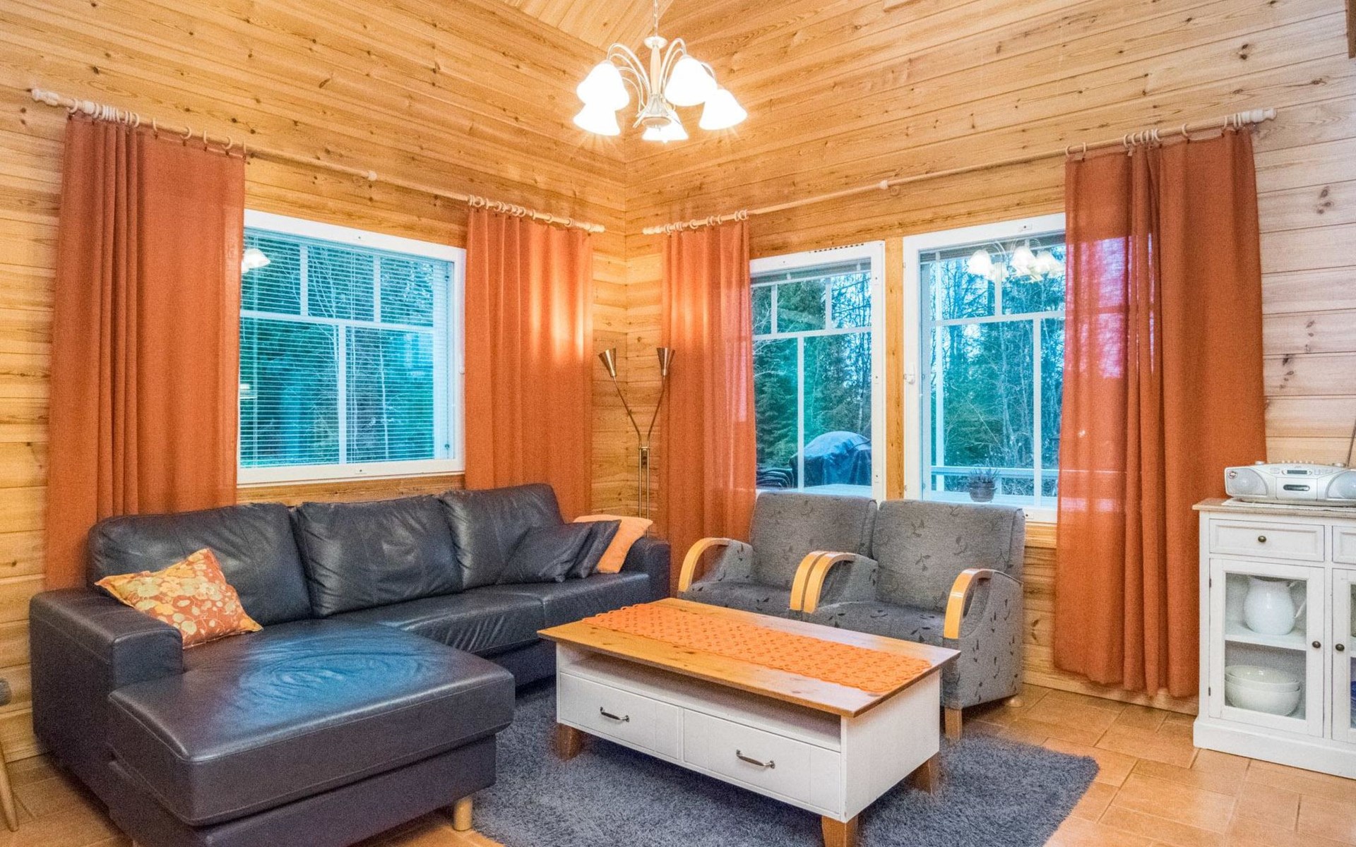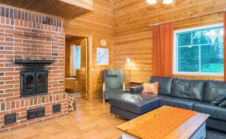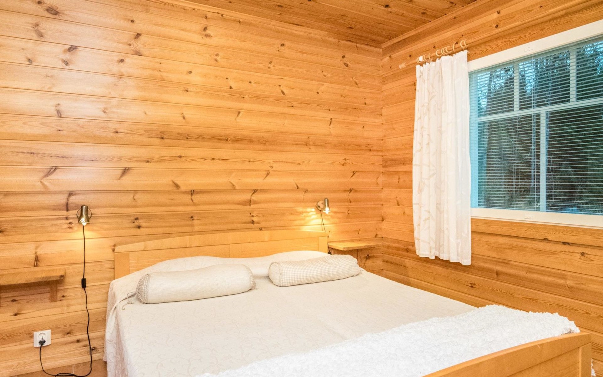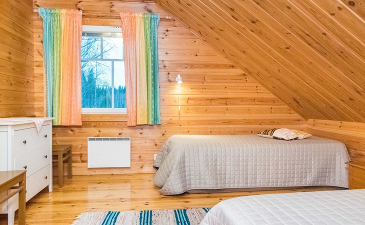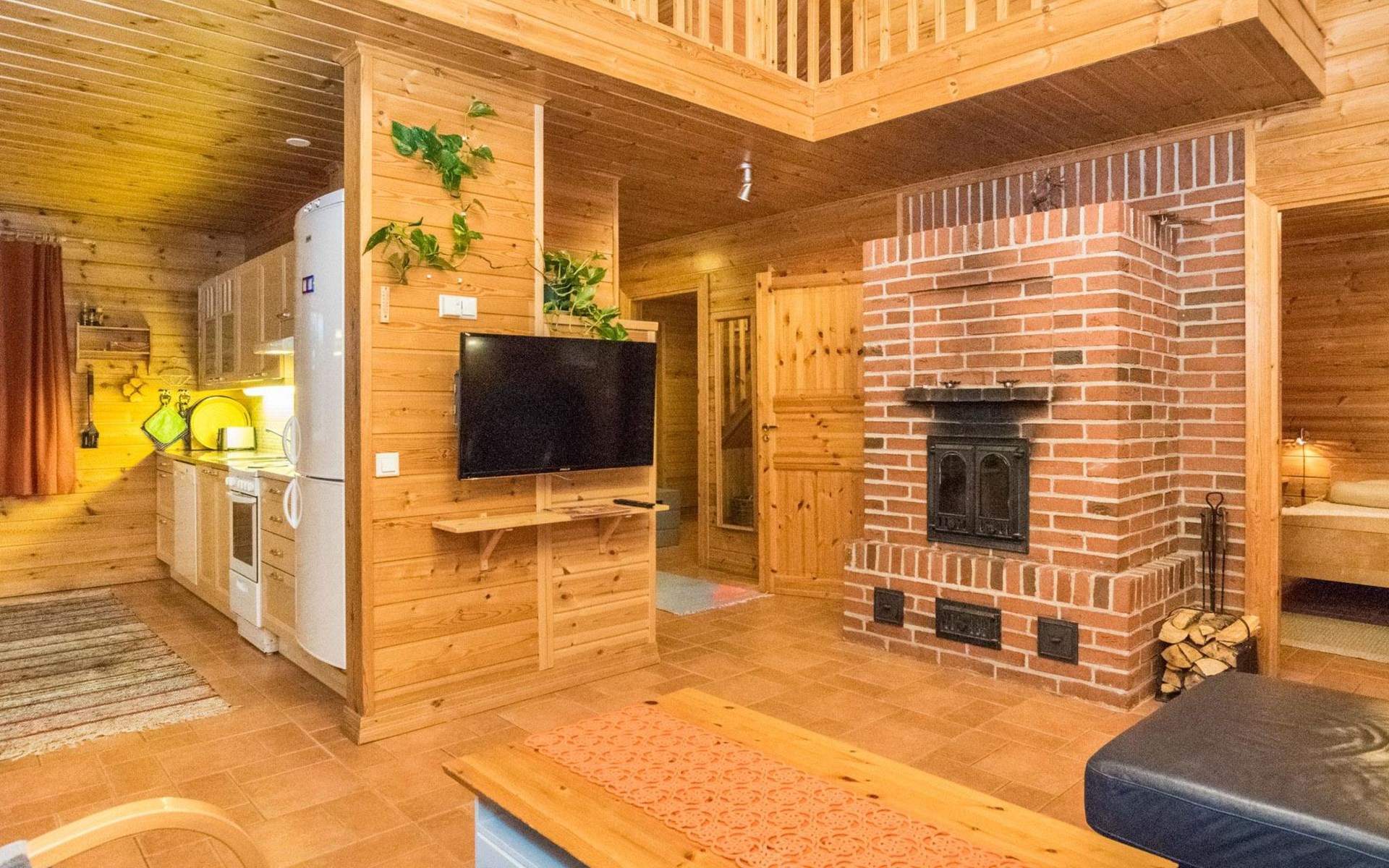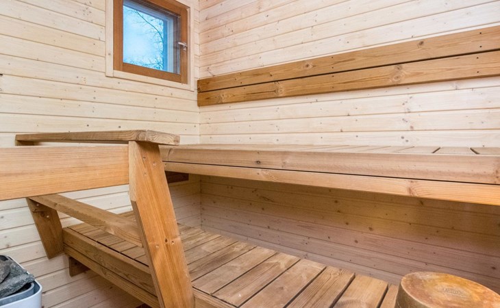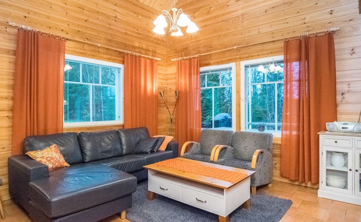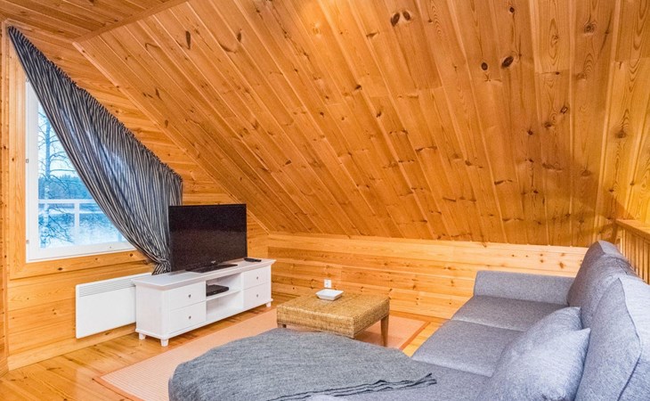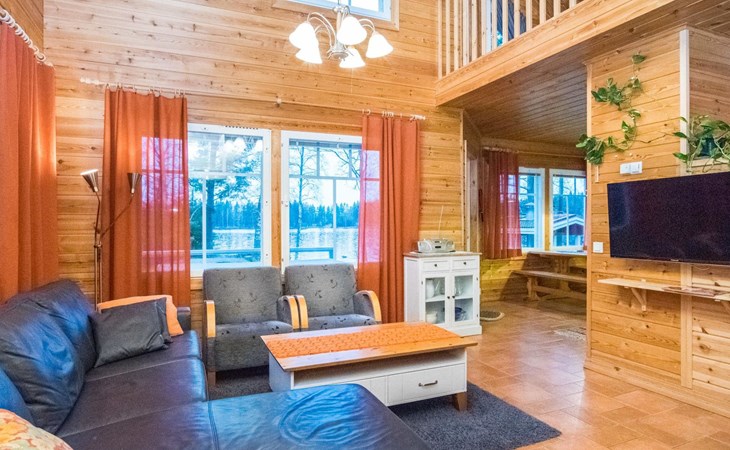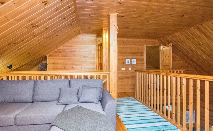 Log-panelled chalet 2002, living room/kitchen, bedroom with double bed, upstairs 2 bedrooms with 2 beds in each, upstairs hall area with convertible sofa, dressing room, washroom, sauna renovated 2016 (elec. stove), toilet, 2 x porch.