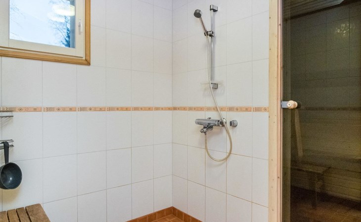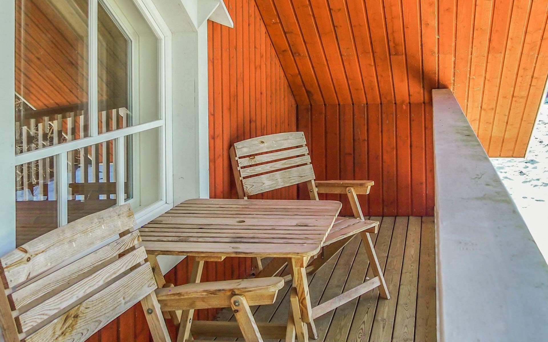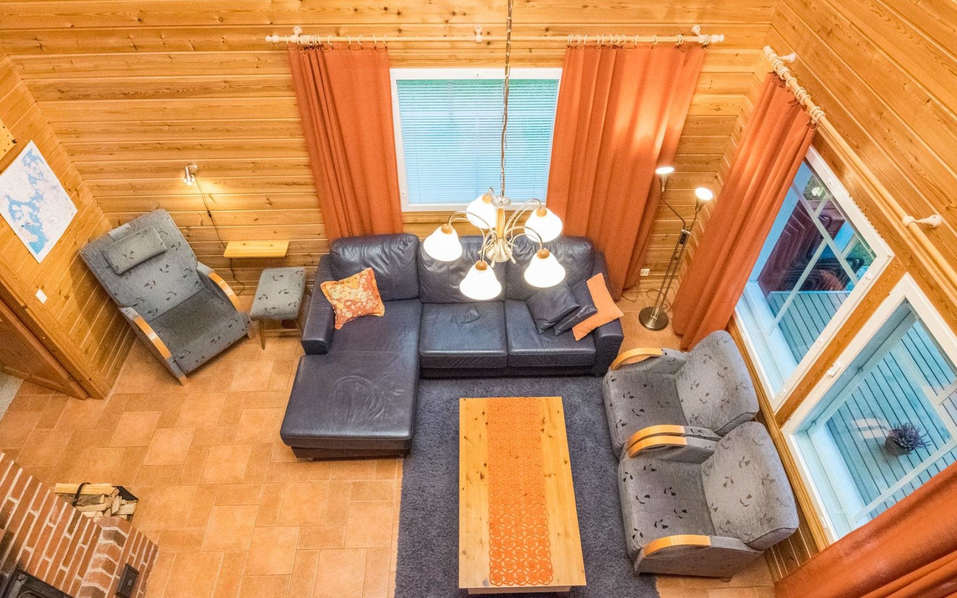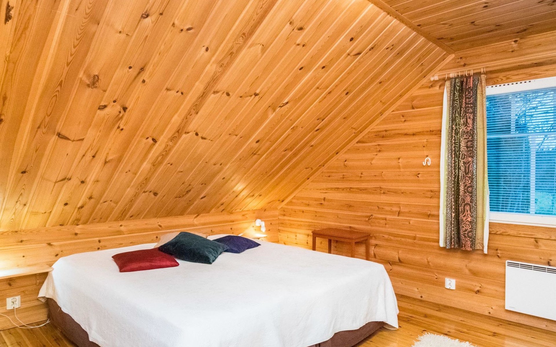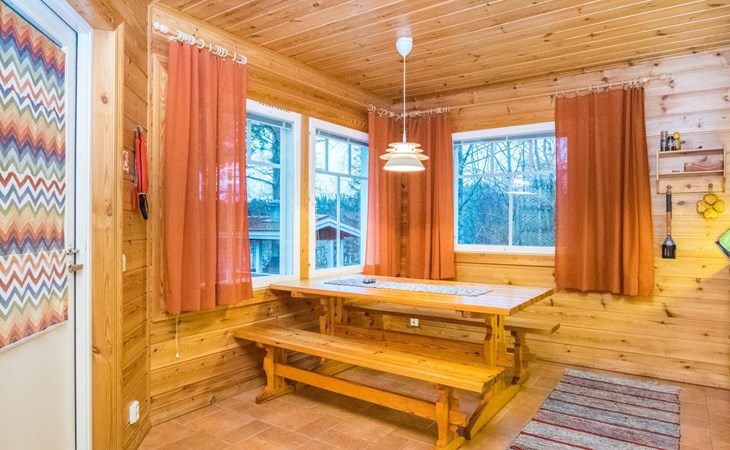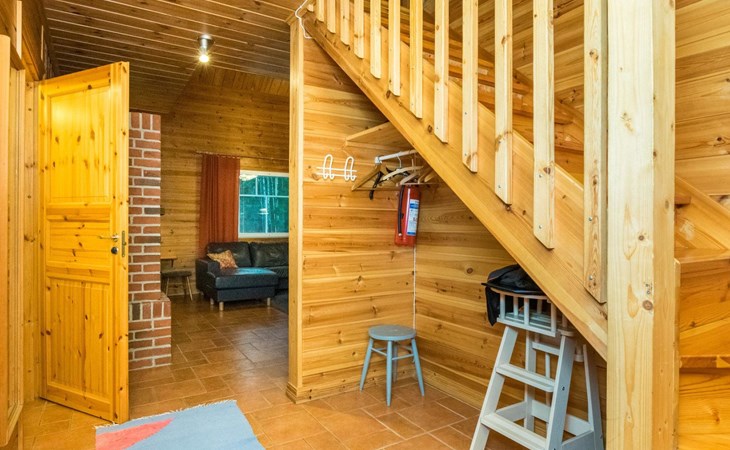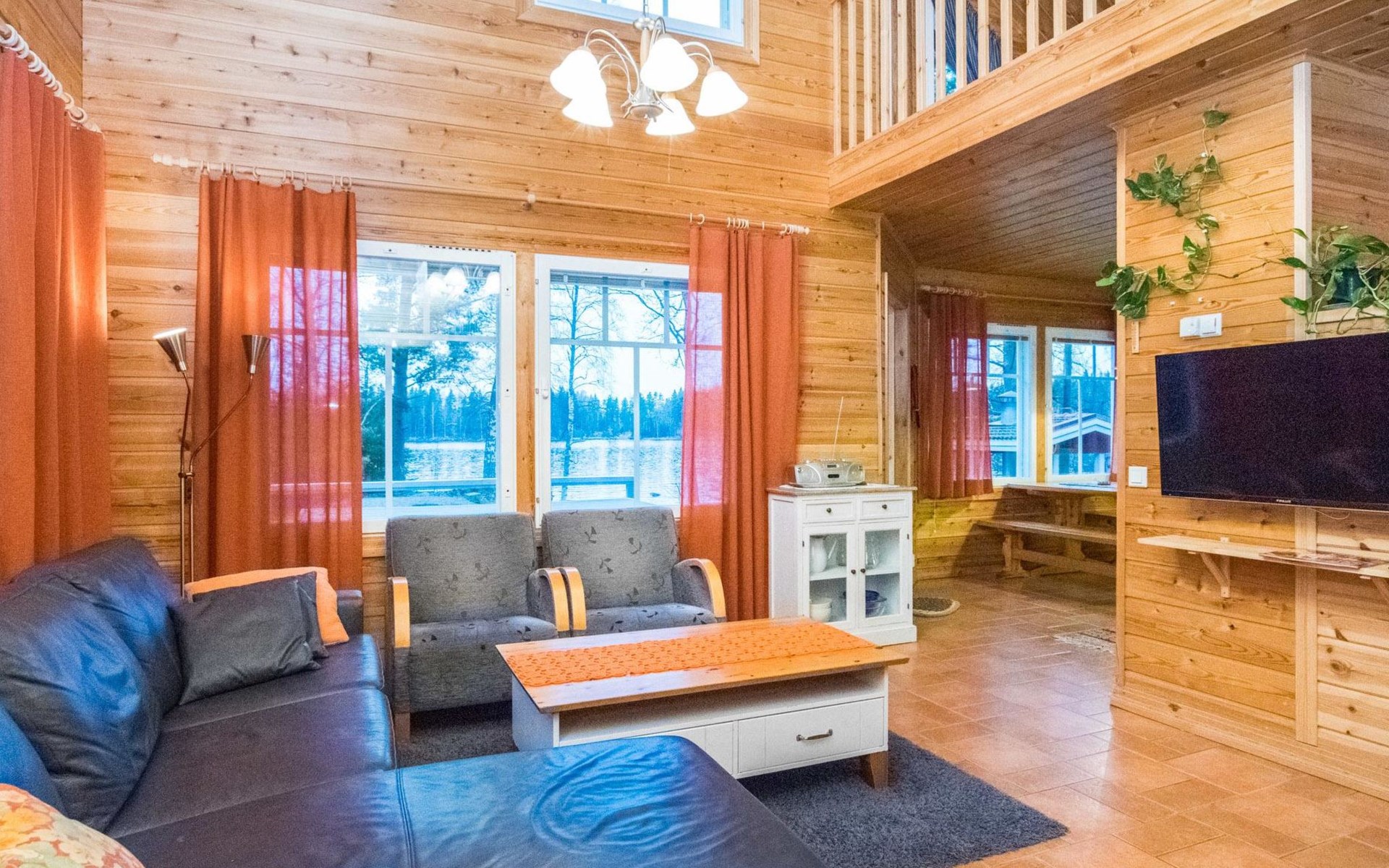 Log-panelled chalet 2002, living room/kitchen, bedroom with double bed, upstairs 2 bedrooms with 2 beds in each, upstairs hall area with convertible sofa, dressing room, washroom, sauna renovated 2016 (elec. stove), toilet, 2 x porch.