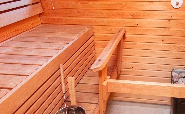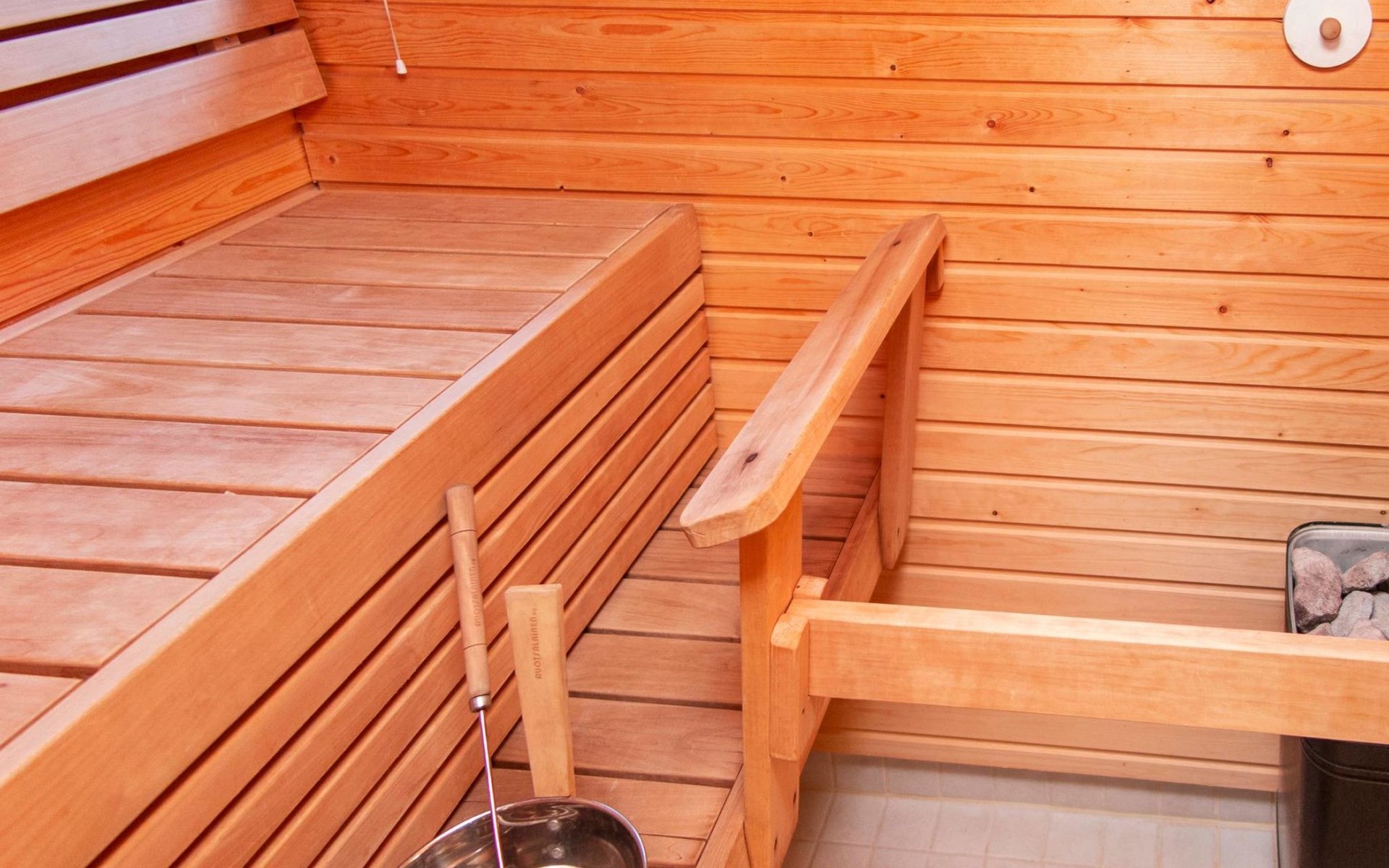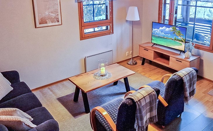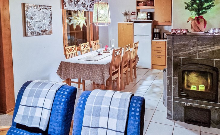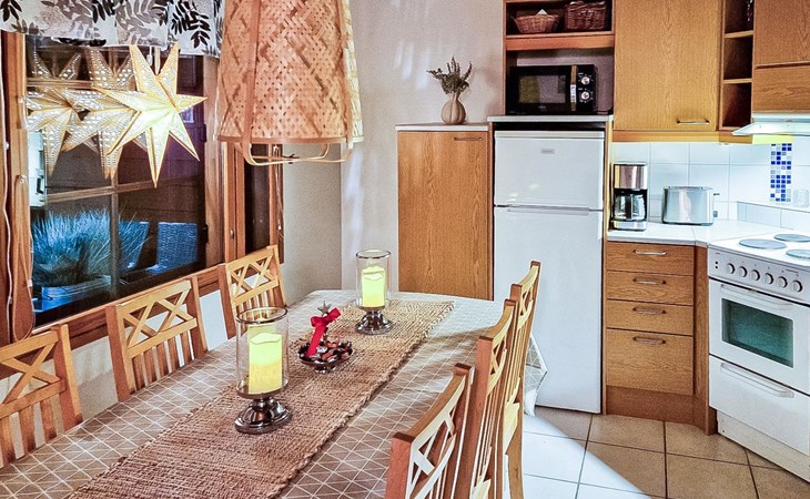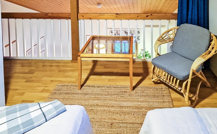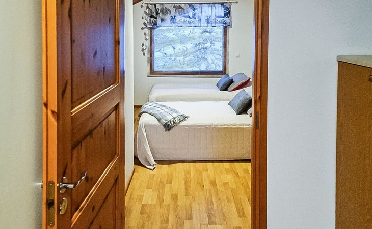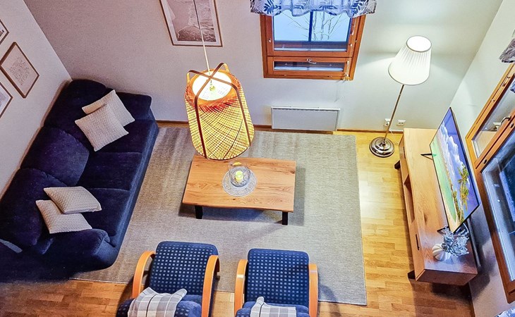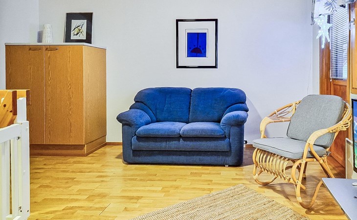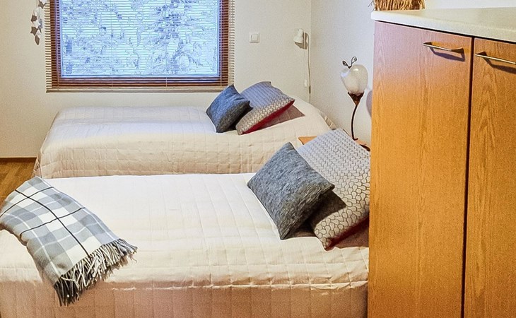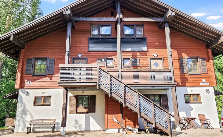 Two-storey chalet 2002, an apartement in the second floor, kitchen-living room, bedroom with 2 beds, upstairs a loft, in which 4 beds, washroom, sauna (electric stove), hall and a big terrace.