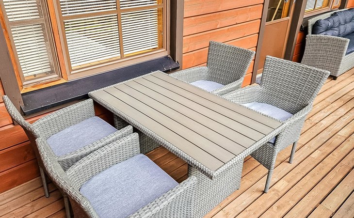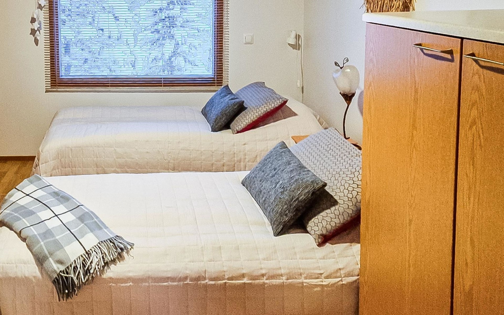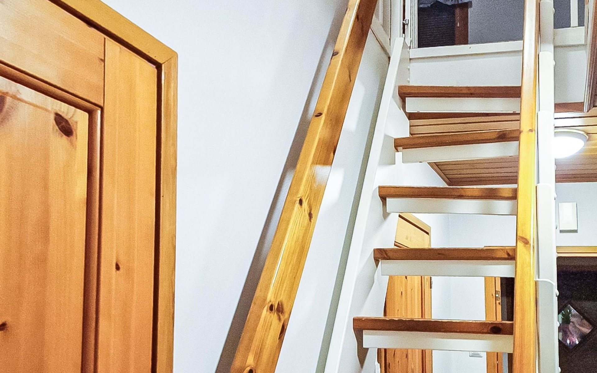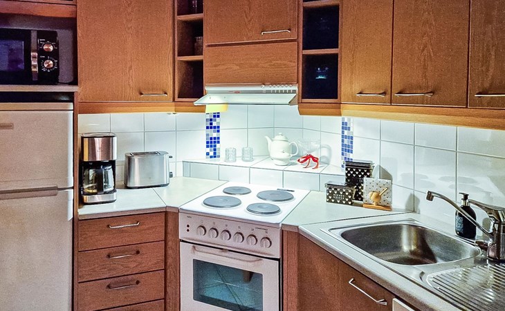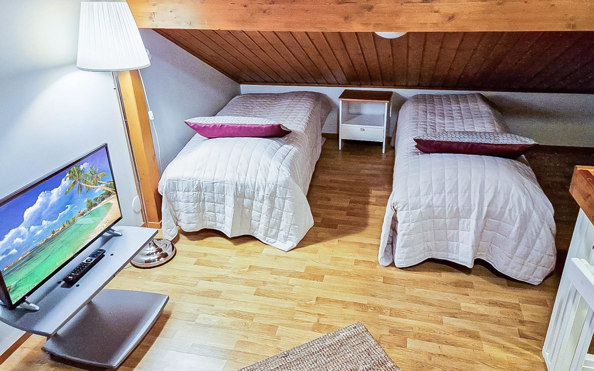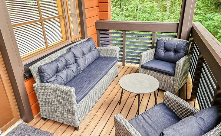 Two-storey chalet 2002, an apartement in the second floor, kitchen-living room, bedroom with 2 beds, upstairs a loft, in which 4 beds, washroom, sauna (electric stove), hall and a big terrace.