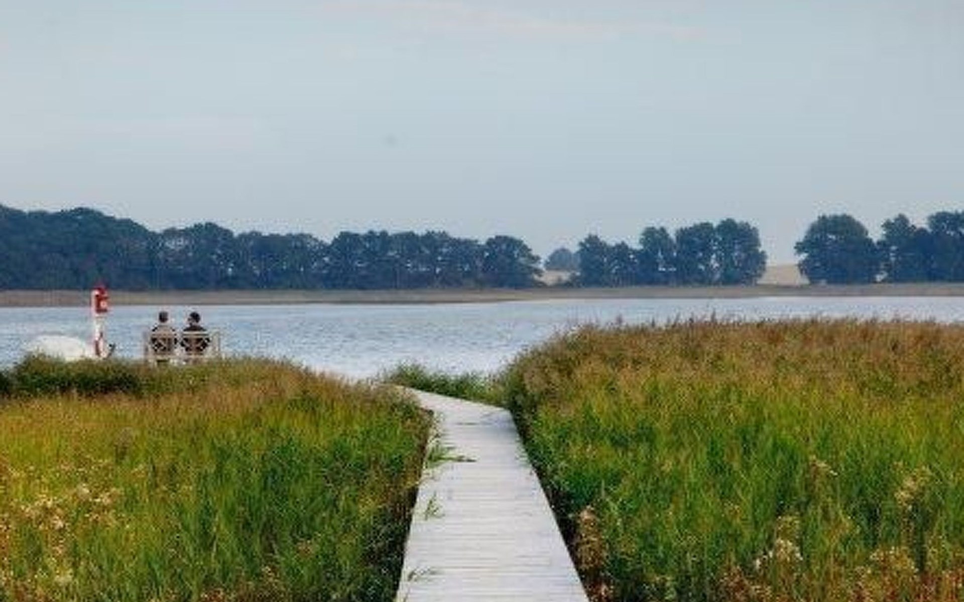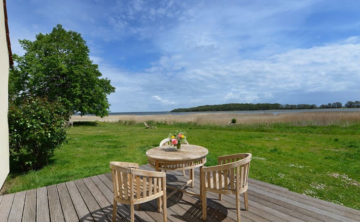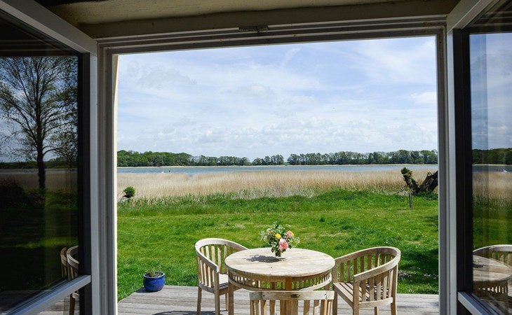Vanuit de woonkamer komt een deur uit op het grote terras met teakhouten meubels en een heel mooi uitzicht op het water en de tuin.