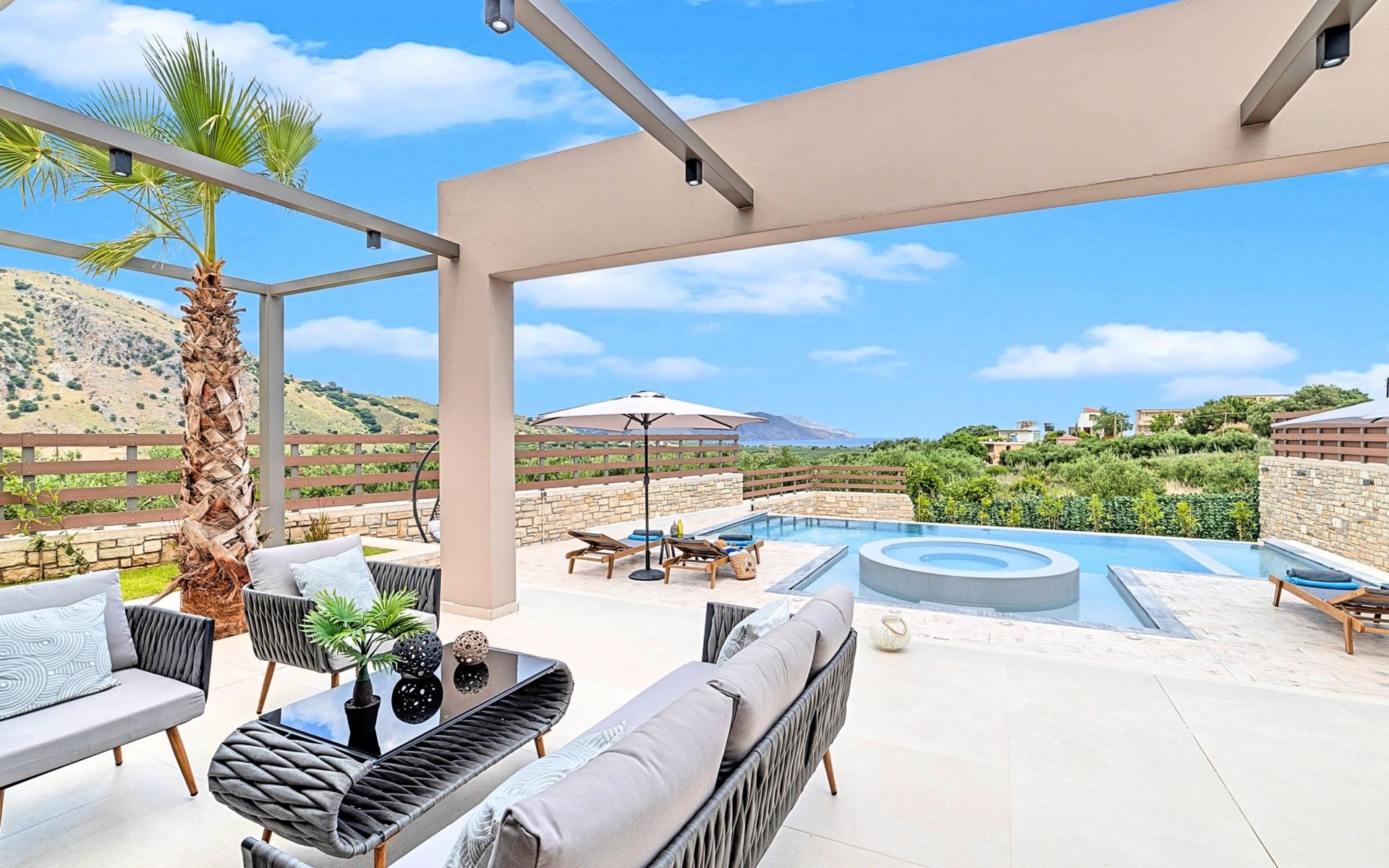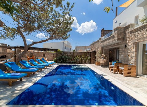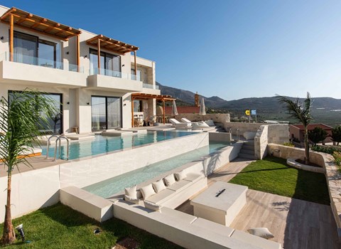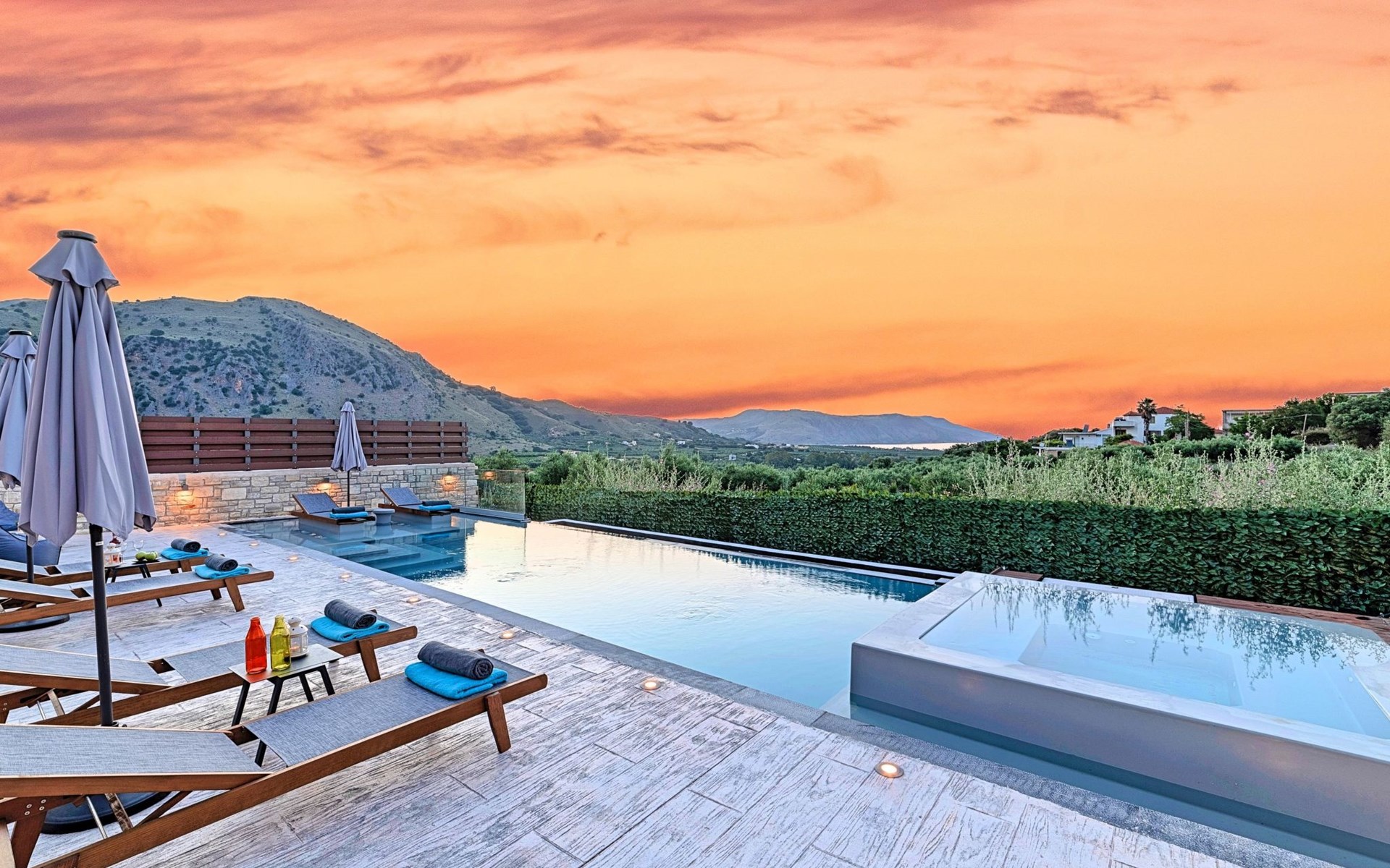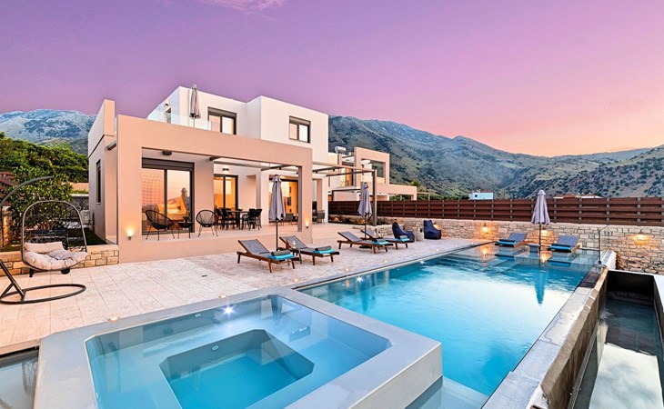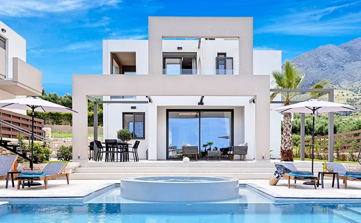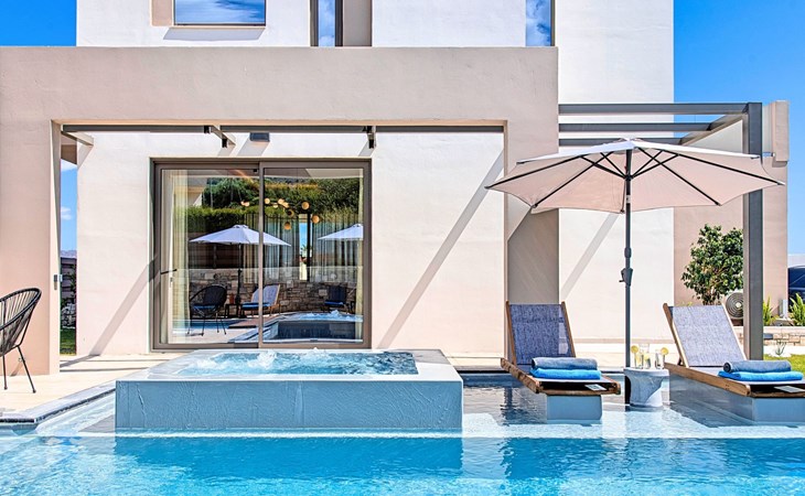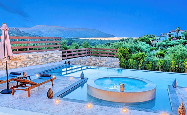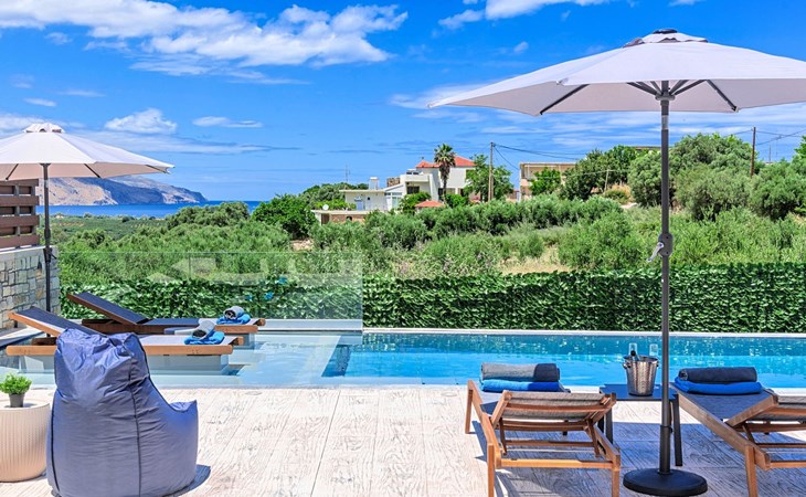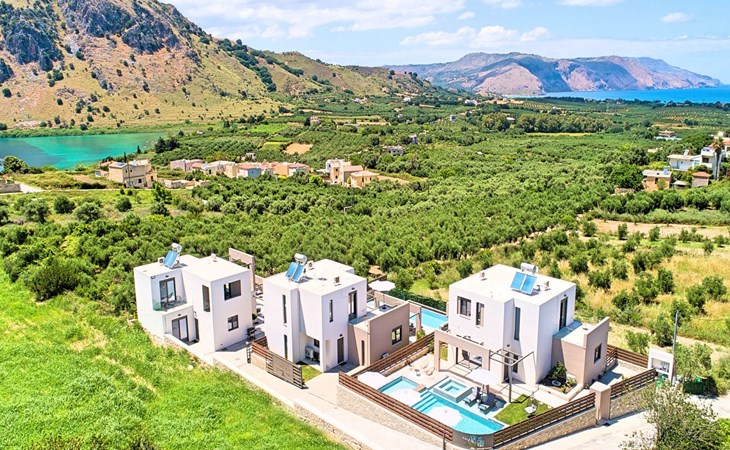 Nuzzled in a gorgeous setting, above the sun kissed beach of Georgioupolis in Crete, Minoas Villas captures the essence of chic and luxurious living only few minutes away from the shimmering sea. Built amphitheatrically with direct sea views, this exceptional built Villas, member of the HotelPraxis Group evokes the island’s Cretan spirit and cosmopolitan charm in its elegant environs while ensuring a holiday beyond comparison. Minoas Villas offers guests the opportunity to truly immerse themselves in the Cretan experience. Within easy reach from the island’s famous Kournas Lake and the popular town of Georgioupolis our villas combine a contemporary, modern style with supreme comfort. Built in 2019 our villas offer guests an exclusive, relaxing experience all within the idyllic setting of Greece’s most hospitable island. Our philosophy is simple: to offer first-rate hospitality coupled with unrivalled privacy. All Villas are fully equipped, offering our quests the required convenience in order to enjoy unforgettable relaxing vacations throughout spring, summer and autumn. Minoas Villas is a complex of three villas, ideal for big families, a group of families or a group of friends. Enjoy your vacations with your parents or with the rest of your family members while at the same time preserving your privacy just like at your own home. Our Villas are built one next to the other.● Private parking area. ● Direct access to the swimming pool area. ● Private Heated Swimming pool with children/jacuzzi section. The outdoor pool is heated and can reach 6 to 8 degrees more that the 24 h average air temperature with maximum value of 29°C ● Swimming Pool cleaning twice per week ● Sun lounge area with sun beds and umbrellas. ● BBQ next to the swimming pool. The villa can accommodate up to ten guests.Facilities of the Villa Ground floor ● A large living-dining room with sofas (can accommodate two guests) with direct access to the terrace. ● Kitchen with an oven, a fridge, dishwasher, a coffee maker, tea facilities, a juicer, a toaster, a dish set and dining area. ● A master bedroom with a queen-size double bed, smart TV Set and private bathroom with shower. ● A large common bathroom with shower at the ground floor. Upper Floor ● A second bedroom with a queen-size double bed, smart TV set. ● A third bedroom with two twin push together single beds ● A fourth bedroom with two twin push together single beds ● A large bathroom with shower ● Smart large TV at the living room. ● Air-conditioning in all areas. ● Free WiFi internet access. ● Outdoor dining set (table with chairs). ● Washing machine and dryer ● Iron and ironing board. ● Safe deposit box. ● Hair dryer. ● Linen and towels. ● Toiletries. ● Swimming pool towels. ● Baby cot. ● High chair for children. ● Housekeeping, towels and bed linen changed and cleaned every 3 or 4 days. Facilities of the Sky Villa Ground floor ● A large living-dining room with sofas (can accommodate two guests) with direct access to the terrace. ● Kitchen with an oven, a fridge, dishwasher, a coffee maker, tea facilities, a juicer, a toaster, a dish set and dining area. ● A master bedroom with a queen-size double bed, smart TV Set and private bathroom with shower. ● A large common bathroom with shower at the ground floor. Upper Floor ● A second bedroom with a queen-size double bed, smart TV set and gym/workout equipment’s. ● A third bedroom with two single twin push together beds ● A large bathroom with shower. ● Smart large TV at the living room. ● Air-conditioning in all areas. ● Free WiFi internet access. ● Outdoor dining set (table with chairs). ● Washing machine and dryer ● Iron and ironing board. ● Safe deposit box. ● Hair dryer. ● Linen and towels. ● Toiletries. ● Swimming pool towels. ● Baby cot. ● High chair for children. ● Housekeeping, towels and bed linen changed and cleaned every 3 or 4 days. ● Private parking area. ● Direct access to the swimming pool area. ● Private Heated Swimming pool with children / jacuzzi section. ● Swimming Pool cleaning twice per week ● Sun lounge area with sun beds and umbrellas. ● BBQ next to the swimming pool. The villa can accommodate up to 8 guests.Kournas Lake is the only freshwater lake in Crete. Lake Kournas was known as Lake Koressia in antiquity but later took its current name from the Arabic word for lake. The lake is in a beautiful landscape, lying in a valley among the hills, about 4 km from Georgioupolis in Chania Prefecture (west Crete). Lake Kournas is relatively small, with a maximum length of 1,087 m and a maximum breadth of 880 m. It covers an area of 579,000 sq. m. and is generally shallow, 22.5 m at its deepest point, while it lies approximately 20 m above sea level. Kournas lake with the sea near Georgioupoli in the background Kournas Lake is the ideal place for an afternoon walk or a daytrip nearby. Many people like to have an afternoon picnic there. The landscape is lovely and relaxing, whether you want to go for a walk in the countryside, swim or ride a pedalo on the lake. There are two springs on the southeast bank, one of which, the Mati or Amati (“eye”) as the locals call it, is visible in late summer. The lake is fed by streams from the nearby mountains and hills, whose underground courses are interrupted by the local bedrock on the way to the sea.DISTANCES Chania Airport: 50 km (45 min. drive to Kournas/Kavalos village). Souda Port of Chania: 35 km (25min. drive to Kournas/Kavalos village). Heraklion Port or Airport: 103 km (90 min. drive to Kournas/Kavalos village). From Chania airport or Souda port: Follow the signs to the highway in the direction of Rethymnon. Take the highway. Upon reaching Georgioupolis decrease your speed. After 600m you will see a sign to Kournas Lake, follow the signs to Kournas Lake. Drive for another 3,5km, when you reach the crossroad who leads to the Lake at your 