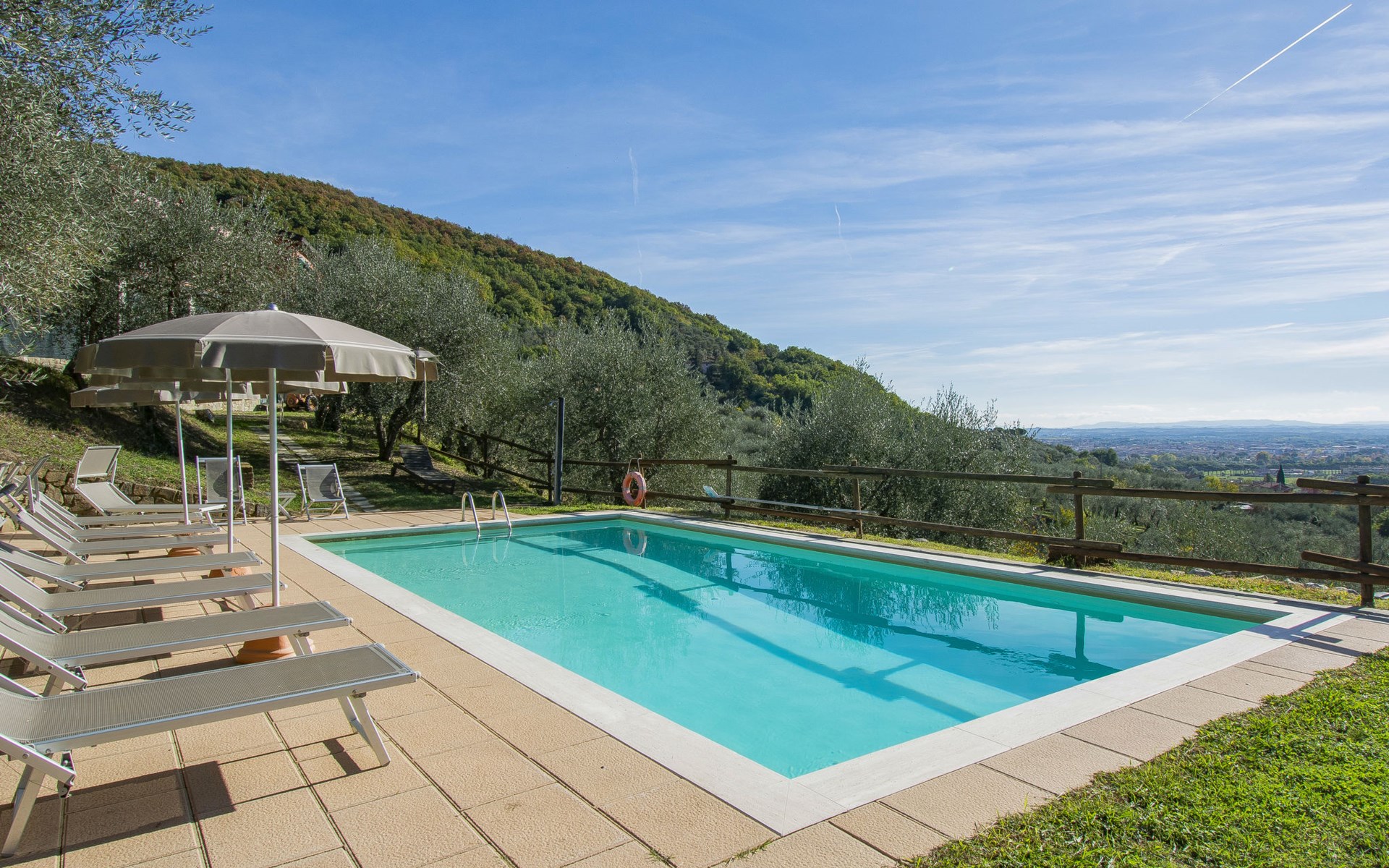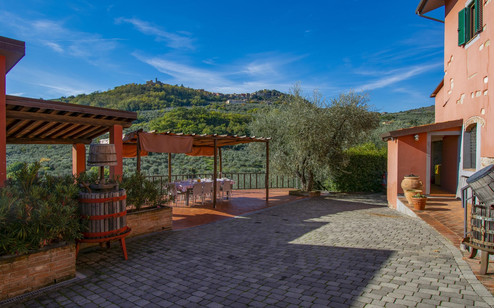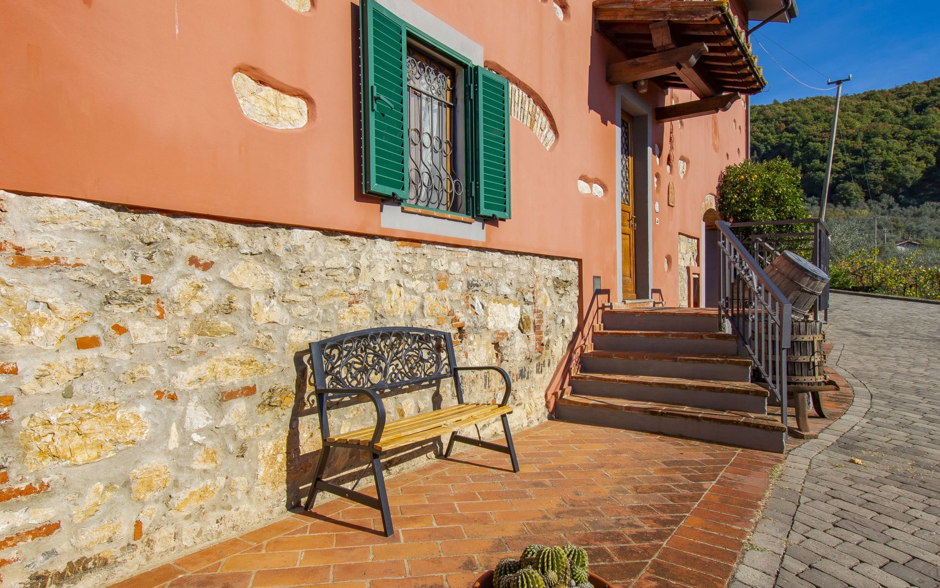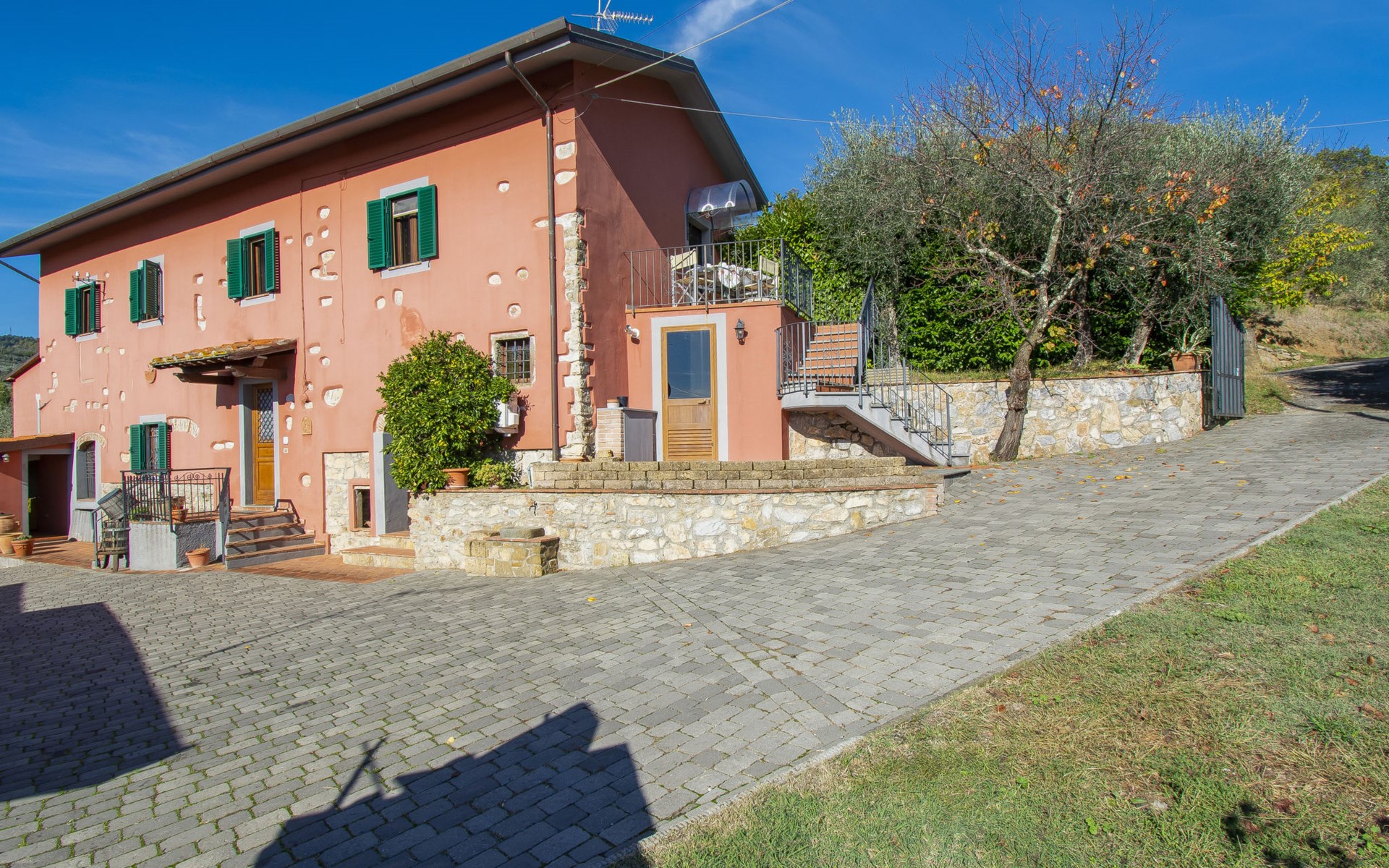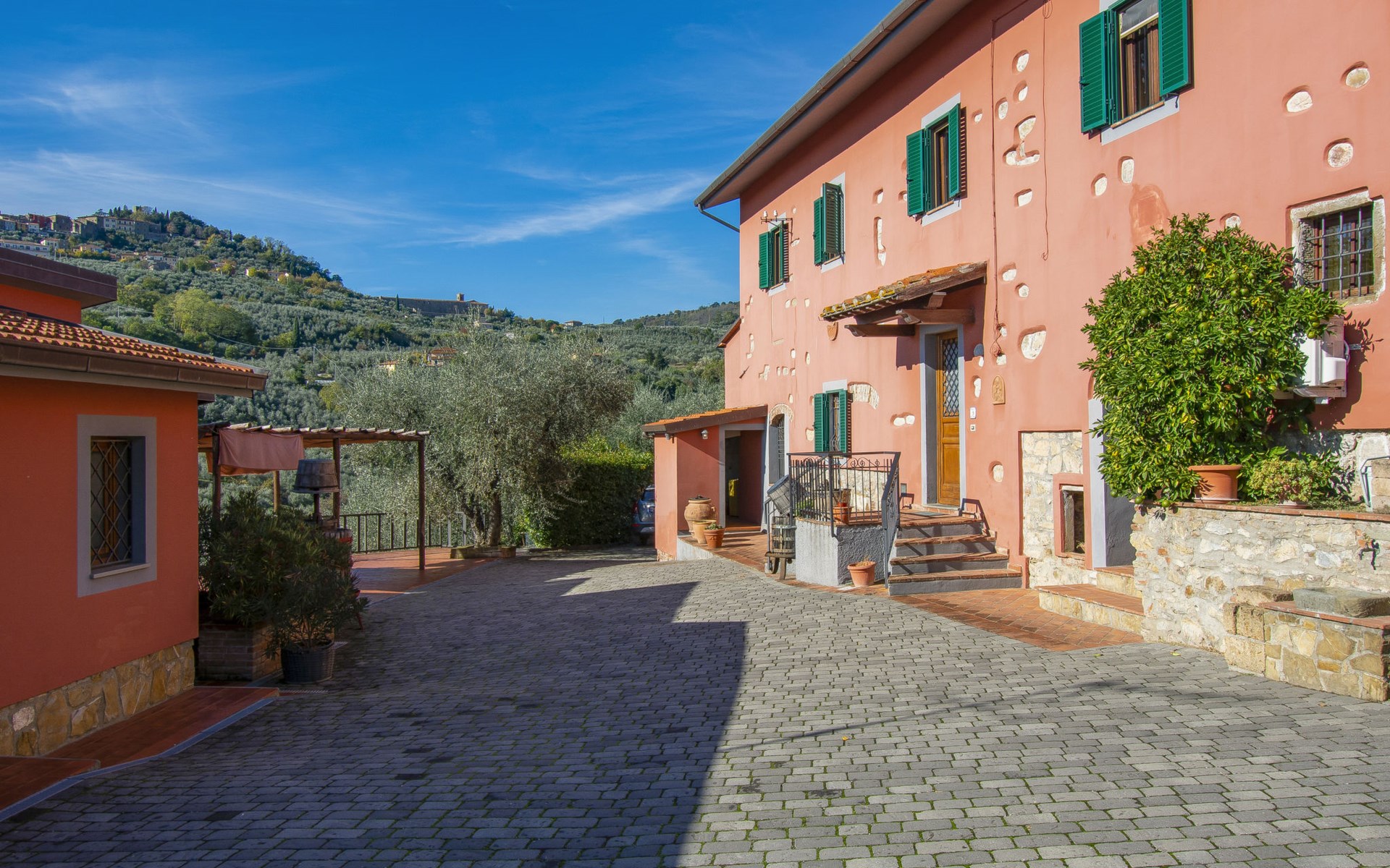 Mooi, rustieke boerderij "Francesco", 80 m boven zeeniveau, omgeven door bomen en velden. 4.5 km van het centrum van Montecatini Terme, 2.5 km van het centrum van Pieve a Nievole, 34 km van het centrum van Lucca, geïsoleerde, zonnige ligging tegen een helling, 60 km van zee, te midden van groen. Voor medegebruik: wild terrein 3 ha, mooie tuin op verschillende niveaus planten en bomen, weide, boomgaard. Voor alleengebruik: openluchtzwembad (10 x 5 m, 120 - 160 cm diepte, seizoensgebonden beschikbaarheid: 04.Apr. - 24.Okt.). Buitendouche, terras, tuinmeubelen, onderhoud zwembad door de eigenaar/tuinman. Parkeerplaats op het terrein. Winkel 2.5 km, supermarkt 4.5 km, bushalte 3 km, treinstation "Montecatini Terme" 5 km, zandstrand "Viareggio" 60 km. Golfterrein (18 holes) 11 km. Een deel van het huis is afgesloten en niet bezet. De eigenaar woont op hetzelfde terrein. Autobaan in de buurt.
