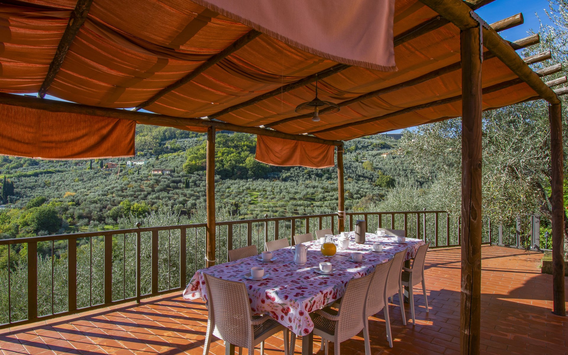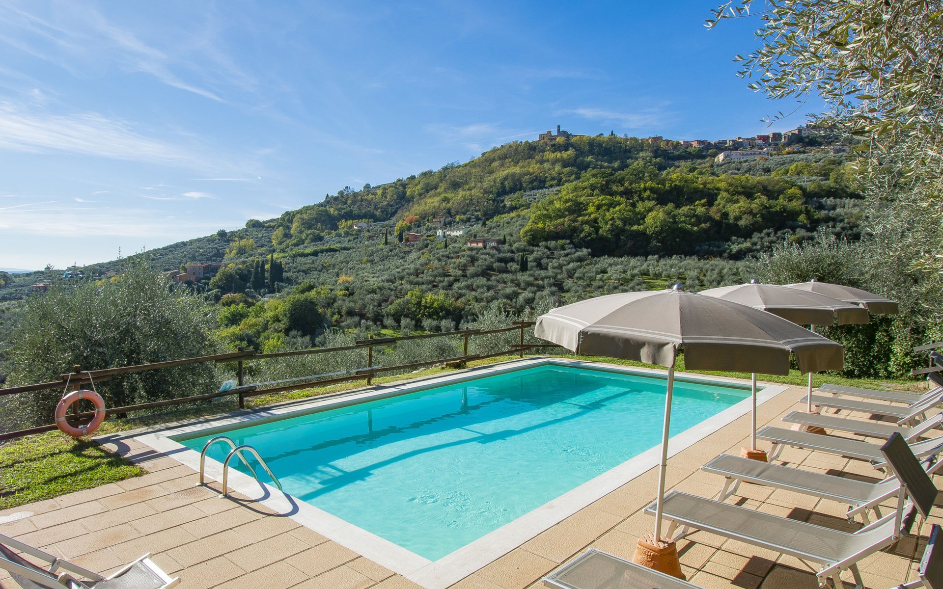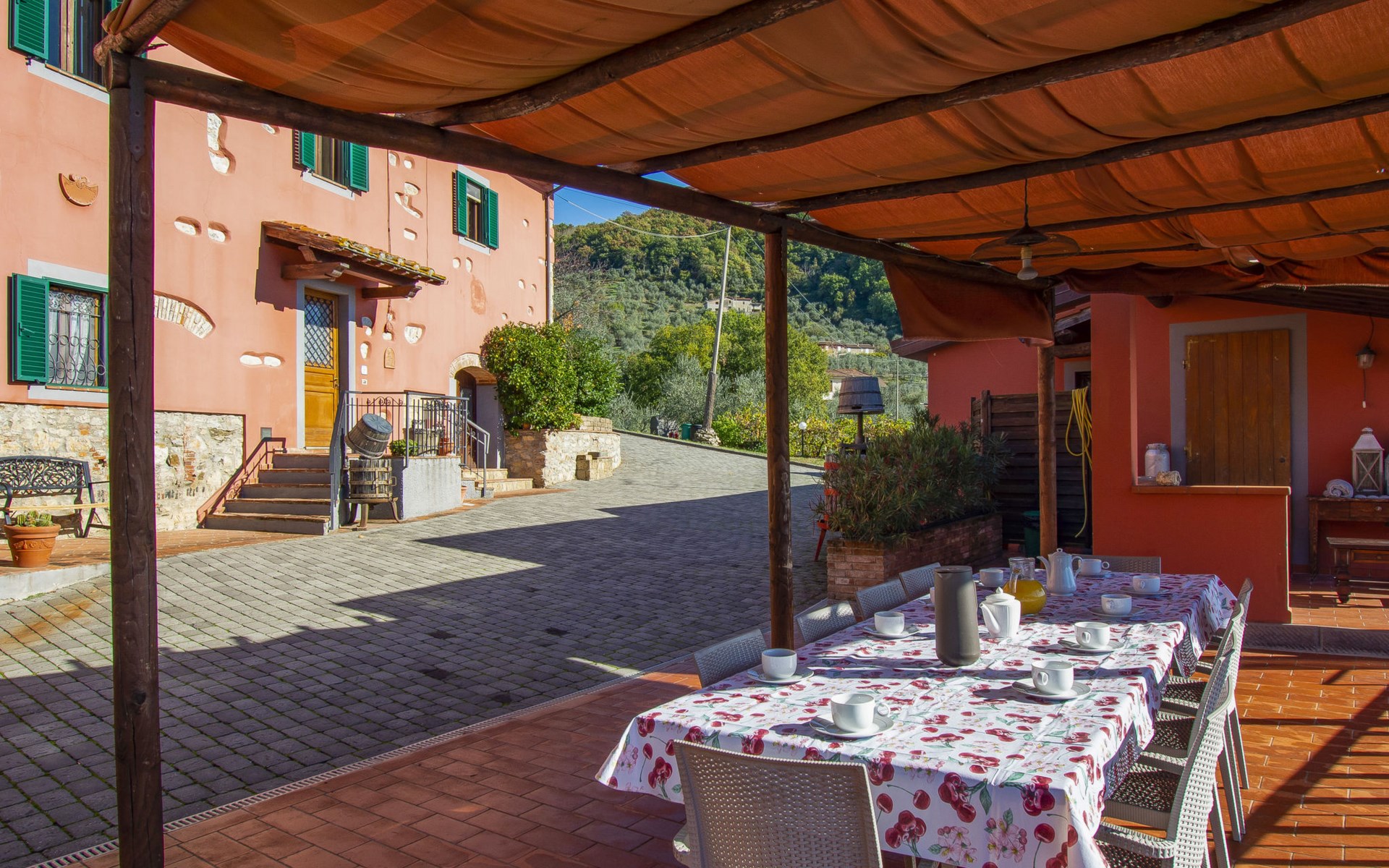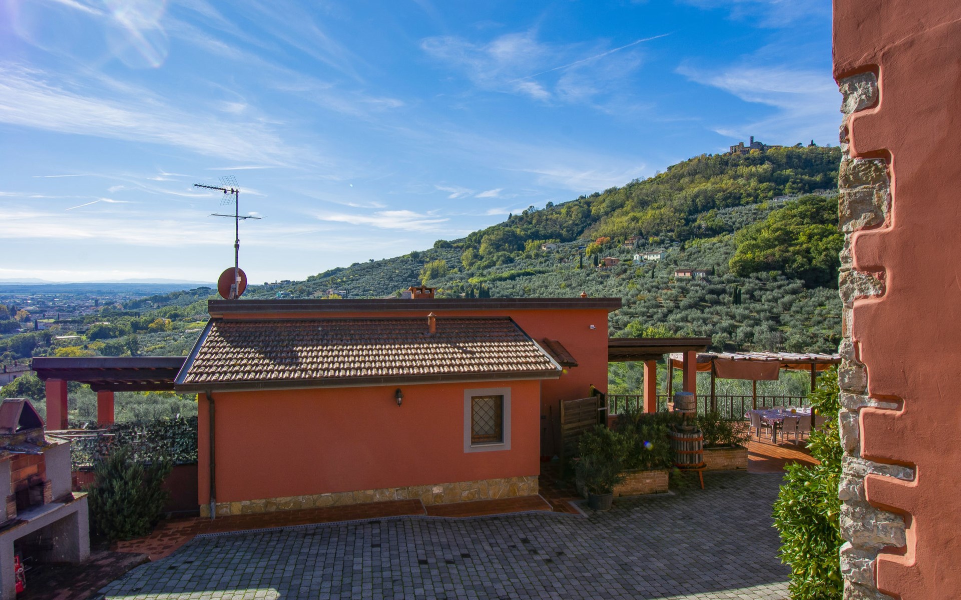 Mooi, rustieke boerderij "Francesco", 80 m boven zeeniveau, omgeven door bomen en velden. 4.5 km van het centrum van Montecatini Terme, 2.5 km van het centrum van Pieve a Nievole, 34 km van het centrum van Lucca, geïsoleerde, zonnige ligging tegen een helling, 60 km van zee, te midden van groen. Voor medegebruik: wild terrein 3 ha, mooie tuin op verschillende niveaus planten en bomen, weide, boomgaard. Voor alleengebruik: openluchtzwembad (10 x 5 m, 120 - 160 cm diepte, seizoensgebonden beschikbaarheid: 04.Apr. - 24.Okt.). Buitendouche, terras, tuinmeubelen, onderhoud zwembad door de eigenaar/tuinman. Parkeerplaats op het terrein. Winkel 2.5 km, supermarkt 4.5 km, bushalte 3 km, treinstation "Montecatini Terme" 5 km, zandstrand "Viareggio" 60 km. Golfterrein (18 holes) 11 km. Een deel van het huis is afgesloten en niet bezet. De eigenaar woont op hetzelfde terrein. Autobaan in de buurt.