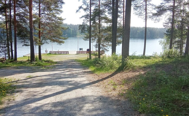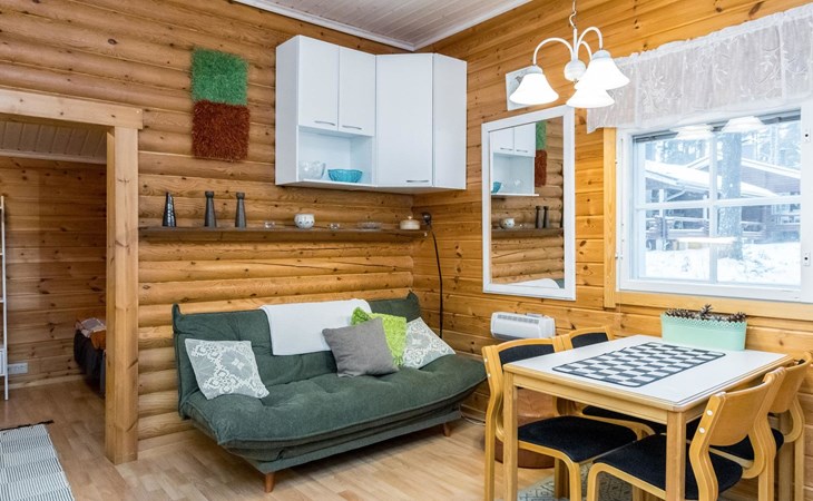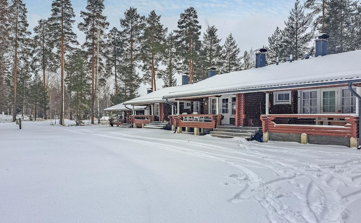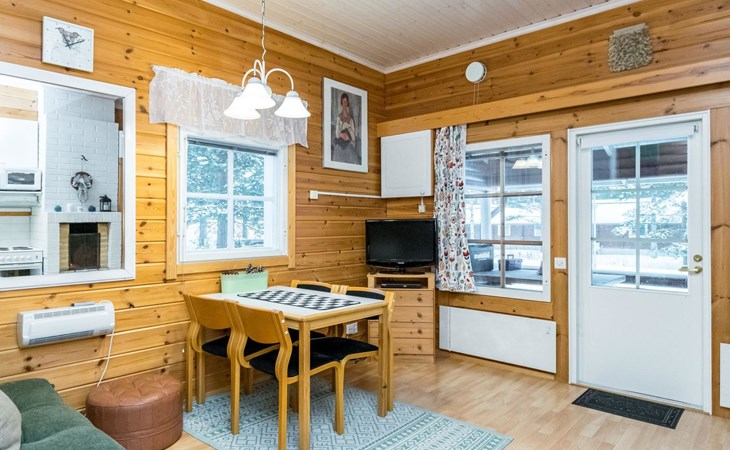 Situated 27 km to the east from Savonlinna, Saimaa 200 m, shared beaches 300 m away . Round log apartment in a row house, built in 1982, features a living room/kitchen, a sleeping alcove with two beds and a bunk bed, a bathroom with a shower and WC, an electric sauna, and a covered porch.