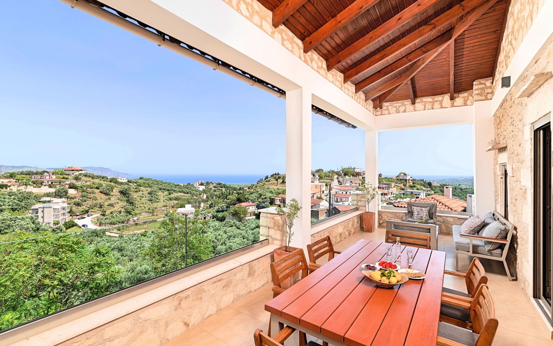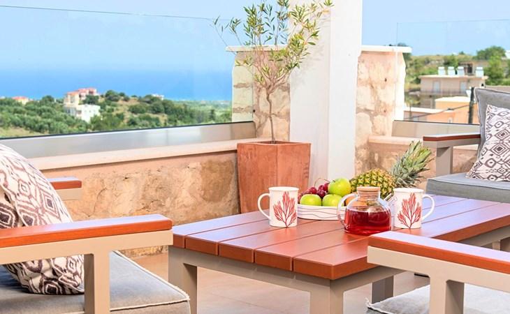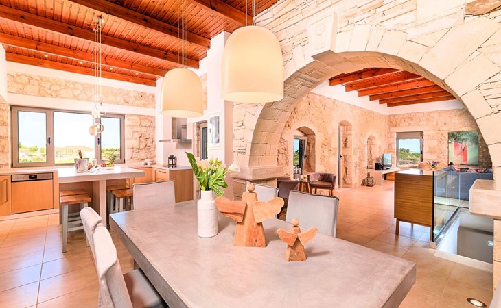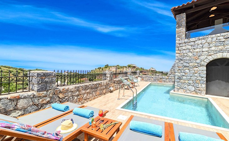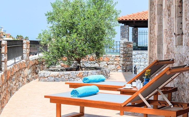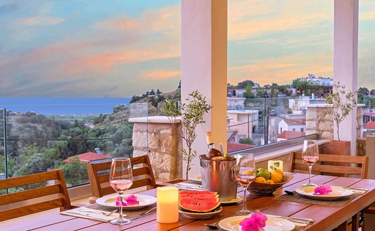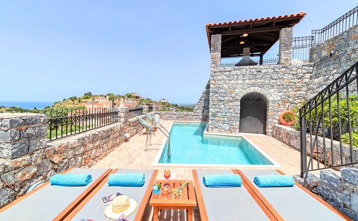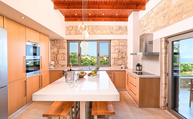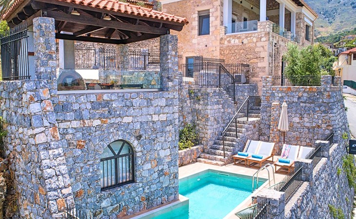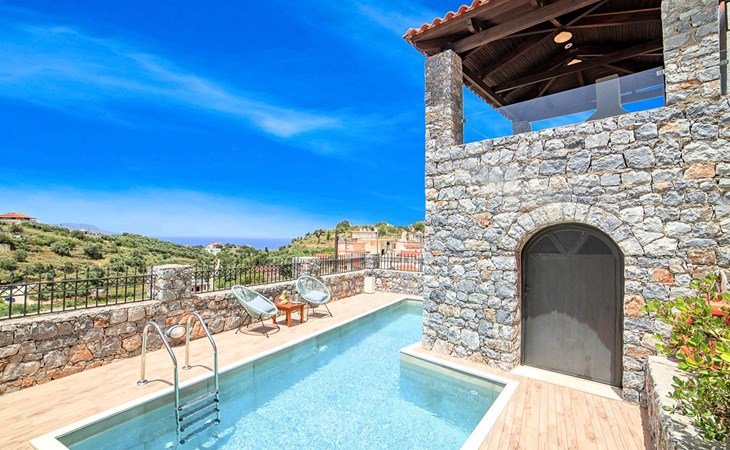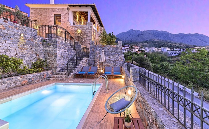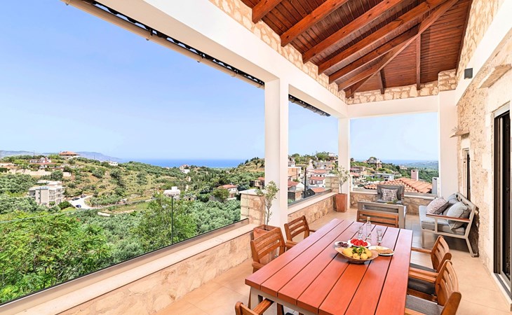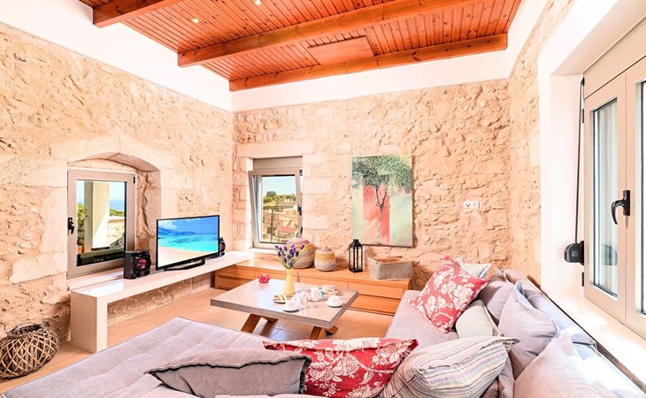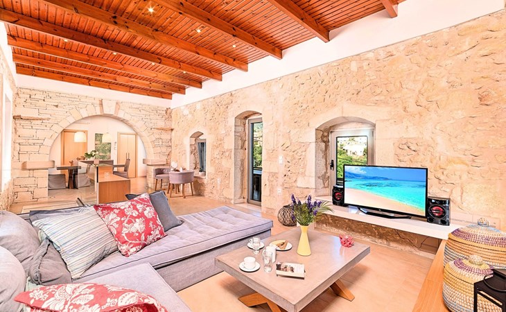 Built of stone and wood, Acrothea with the natural landscape between the slopes of the mountains and the olive trees while giving the sense of a settlement. Crafted with ambition to offer visitors a unique experience through the perfect combination of outdoor activities, the comfort of spacious house and personalized services. Designed with respect to Cretan architecture that ensures the comfort and pleasant hospitality experience of its guests, the house is nestled on the side of a hill. Enjoy fascinating views of the endless Cretan sea and of Kournas village. Luxury is in the fine tactful details, the villa presents a delightful landscape of island Mediterranean gardens, a tranquil atmosphere, protected from the usual crowds. Acrothea Villa is ideal for families or group of friends● Swimming pool with a whirlpool edge ● Two Sun lounge areas with sun beds next to the Swimming pool ● Private Parking.The outdoor pool is heated and can reach 6 to 8 degrees more that the 24 h average air temperature with maximum value of 29°CAcrothea Villa has the following facilities: ● A large living-dining room with easy access to the terraces and the pool and the whirlpool area. ● House Kitchen provide oven, fridge, coffee maker, tea facilities, juicer, toaster and dish sets. ● The house offers two bathrooms and a wc at the living room ● Three bedrooms ● Master bedroom with a Queen size double bed, wardrobe room, private bathroom with bathtub. ● Second bedroom with a two twin push together single beds. ● Third bedroom with two twin push together single beds. ● A living area between the bedrooms with a large sofa (the sofa offers two bunk beds ● TV at the Living Room and the bedrooms ● Air-condition ● Free WiFi internet access ● Outdoor Dinning Set (table with chairs) ● BBQ area with traditional brick oven and Dinning set ● Washing machine ● Dishwasher ● An iron and an ironing board ● Safe deposit box ● Hair dryer ● Fine linens and towels ● Toiletries ● Swimming pool towels ● Baby cot ● High chair ● Towels / bed linen, Cleaning- Every 3 or 4 days Guests of Acrothea Villa can also be provided with the following services, upon request and at extra cost: ● Car rental service ● Transfer service ● Travel services ● Massage sessions ● Daily delivery of groceries ● Diving lessons ● Climbing lessons ● Water sports ● Yacht cruises ● BabysittingThe old houses, the village square, the pottery workshop opposite the large kafeneio and Agapinakis's taverna "Kali Kardia", with its wonderful salads and delicious meat, are the first things you will notice in the village of Kournas. The village of Kournas has 500 inhabitants and lies at an altitude of 200 metres in the foothills of Mount Dafnomadara (1680 m). Kournas prospered from the 16th century onwards and is linked to many battles for freedom from the Turks. It was the seat of the Revolutionary Government in the Rising of 1866 and the seat of the Cretan General Assembly in 1897. The village of Kournas lacks particular facilities for tourists, but nearby Georgioupoli offers everything you might need. In the village of Kournas is the church of Agios Georgios, to which leads a road to the right of the square. It was built in Byzantine times, with architectural features added later during the Venetian period. The church is locked and you will not be able to see inside unless you find someone in the neighbourhood to give you the key, but it’s worth a try.Kournas is a pretty traditional village 8 km from Georgioupoli and about 4 km from Lake Kournas. If you are visiting Lake Kournas it is worth driving 15 minutes further along the narrow uphill road to Kournas. While the lake is 'touristy', Kournas village is completely unaffected by tourism and takes visitors on a journey back in time, as do many villages in the interior of Crete (these words were written in 2009, I hope I won’t need to change them in future…). 1002432
