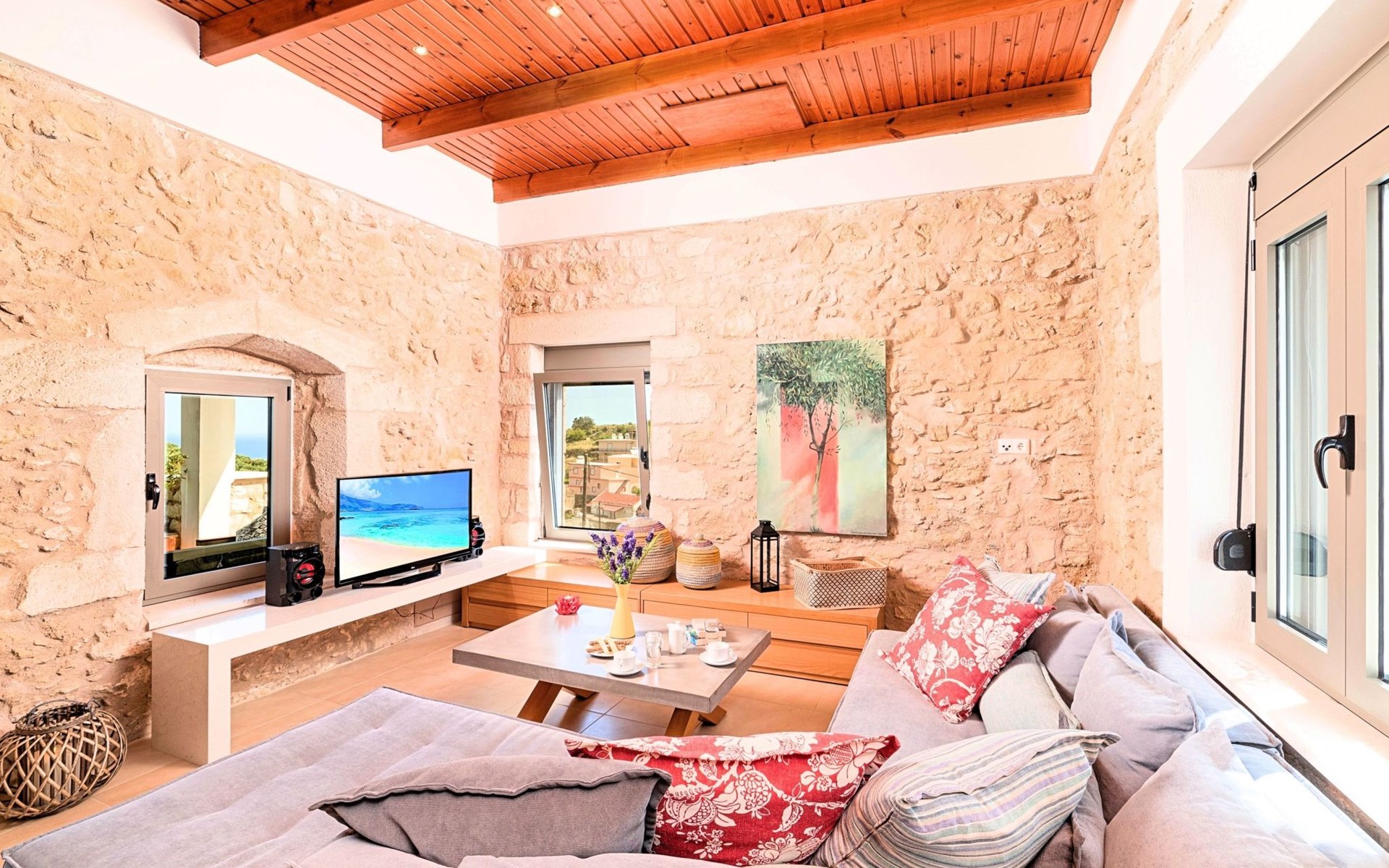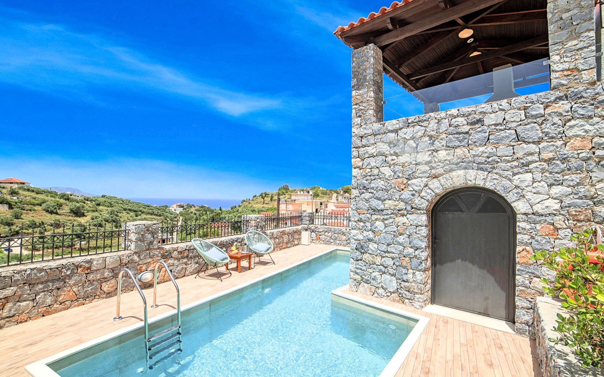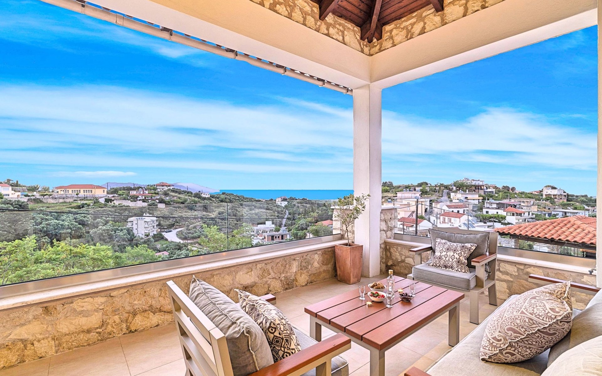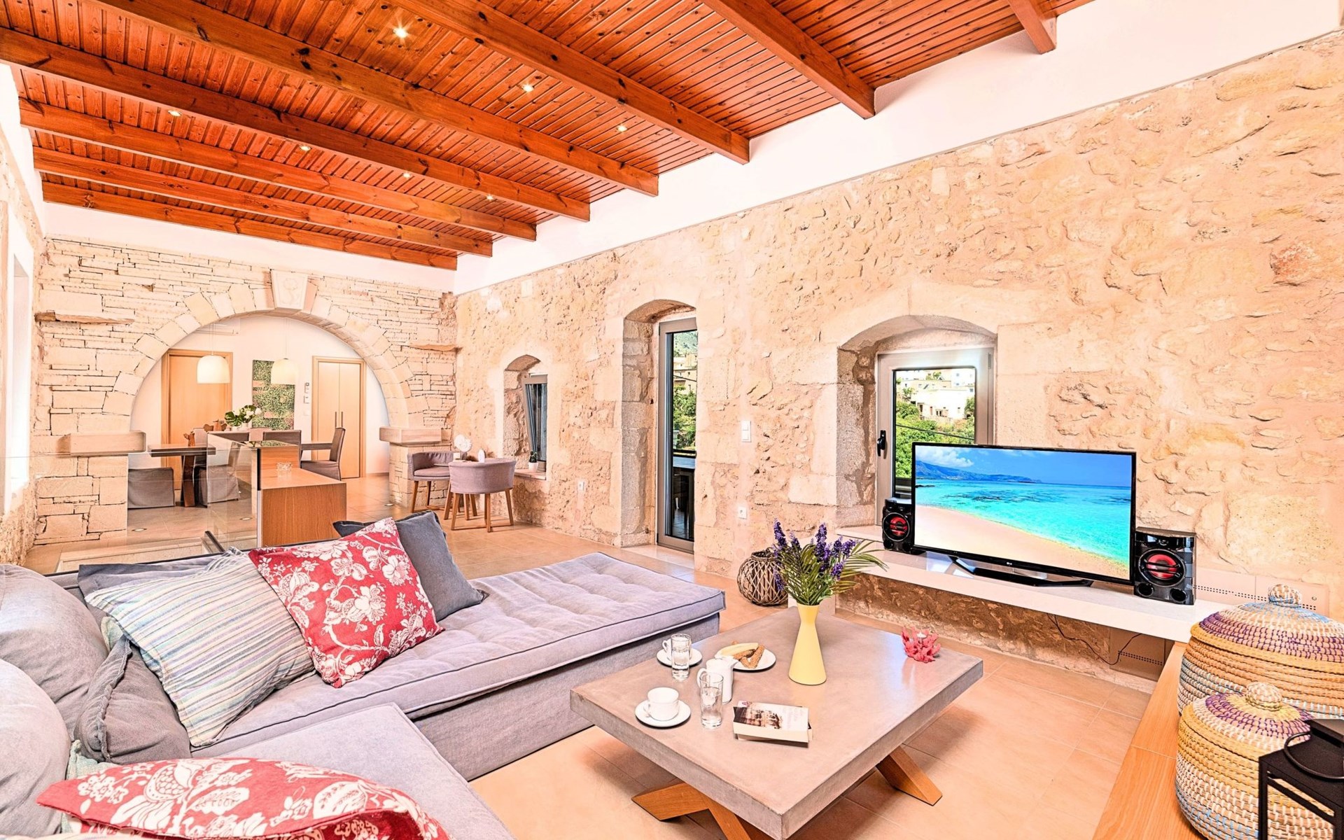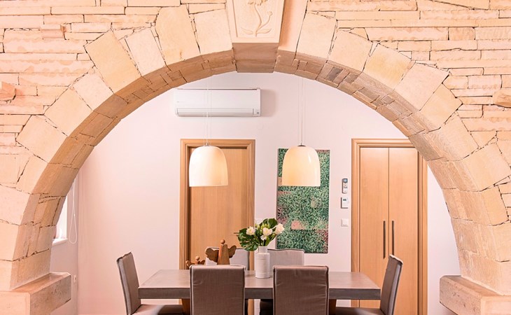 Built of stone and wood, Acrothea with the natural landscape between the slopes of the mountains and the olive trees while giving the sense of a settlement. Crafted with ambition to offer visitors a unique experience through the perfect combination of outdoor activities, the comfort of spacious house and personalized services. Designed with respect to Cretan architecture that ensures the comfort and pleasant hospitality experience of its guests, the house is nestled on the side of a hill. Enjoy fascinating views of the endless Cretan sea and of Kournas village. Luxury is in the fine tactful details, the villa presents a delightful landscape of island Mediterranean gardens, a tranquil atmosphere, protected from the usual crowds. Acrothea Villa is ideal for families or group of friends● Swimming pool with a whirlpool edge ● Two Sun lounge areas with sun beds next to the Swimming pool ● Private Parking.The outdoor pool is heated and can reach 6 to 8 degrees more that the 24 h average air temperature with maximum value of 29°CAcrothea Villa has the following facilities: ● A large living-dining room with easy access to the terraces and the pool and the whirlpool area. ● House Kitchen provide oven, fridge, coffee maker, tea facilities, juicer, toaster and dish sets. ● The house offers two bathrooms and a wc at the living room ● Three bedrooms ● Master bedroom with a Queen size double bed, wardrobe room, private bathroom with bathtub. ● Second bedroom with a two twin push together single beds. ● Third bedroom with two twin push together single beds. ● A living area between the bedrooms with a large sofa (the sofa offers two bunk beds ● TV at the Living Room and the bedrooms ● Air-condition ● Free WiFi internet access ● Outdoor Dinning Set (table with chairs) ● BBQ area with traditional brick oven and Dinning set ● Washing machine ● Dishwasher ● An iron and an ironing board ● Safe deposit box ● Hair dryer ● Fine linens and towels ● Toiletries ● Swimming pool towels ● Baby cot ● High chair ● Towels / bed linen, Cleaning- Every 3 or 4 days Guests of Acrothea Villa can also be provided with the following services, upon request and at extra cost: ● Car rental service ● Transfer service ● Travel services ● Massage sessions ● Daily delivery of groceries ● Diving lessons ● Climbing lessons ● Water sports ● Yacht cruises ● BabysittingThe old houses, the village square, the pottery workshop opposite the large kafeneio and Agapinakis's taverna "Kali Kardia", with its wonderful salads and delicious meat, are the first things you will notice in the village of Kournas. The village of Kournas has 500 inhabitants and lies at an altitude of 200 metres in the foothills of Mount Dafnomadara (1680 m). Kournas prospered from the 16th century onwards and is linked to many battles for freedom from the Turks. It was the seat of the Revolutionary Government in the Rising of 1866 and the seat of the Cretan General Assembly in 1897. The village of Kournas lacks particular facilities for tourists, but nearby Georgioupoli offers everything you might need. In the village of Kournas is the church of Agios Georgios, to which leads a road to the right of the square. It was built in Byzantine times, with architectural features added later during the Venetian period. The church is locked and you will not be able to see inside unless you find someone in the neighbourhood to give you the key, but it’s worth a try.Kournas is a pretty traditional village 8 km from Georgioupoli and about 4 km from Lake Kournas. If you are visiting Lake Kournas it is worth driving 15 minutes further along the narrow uphill road to Kournas. While the lake is 'touristy', Kournas village is completely unaffected by tourism and takes visitors on a journey back in time, as do many villages in the interior of Crete (these words were written in 2009, I hope I won’t need to change them in future…). 1002432