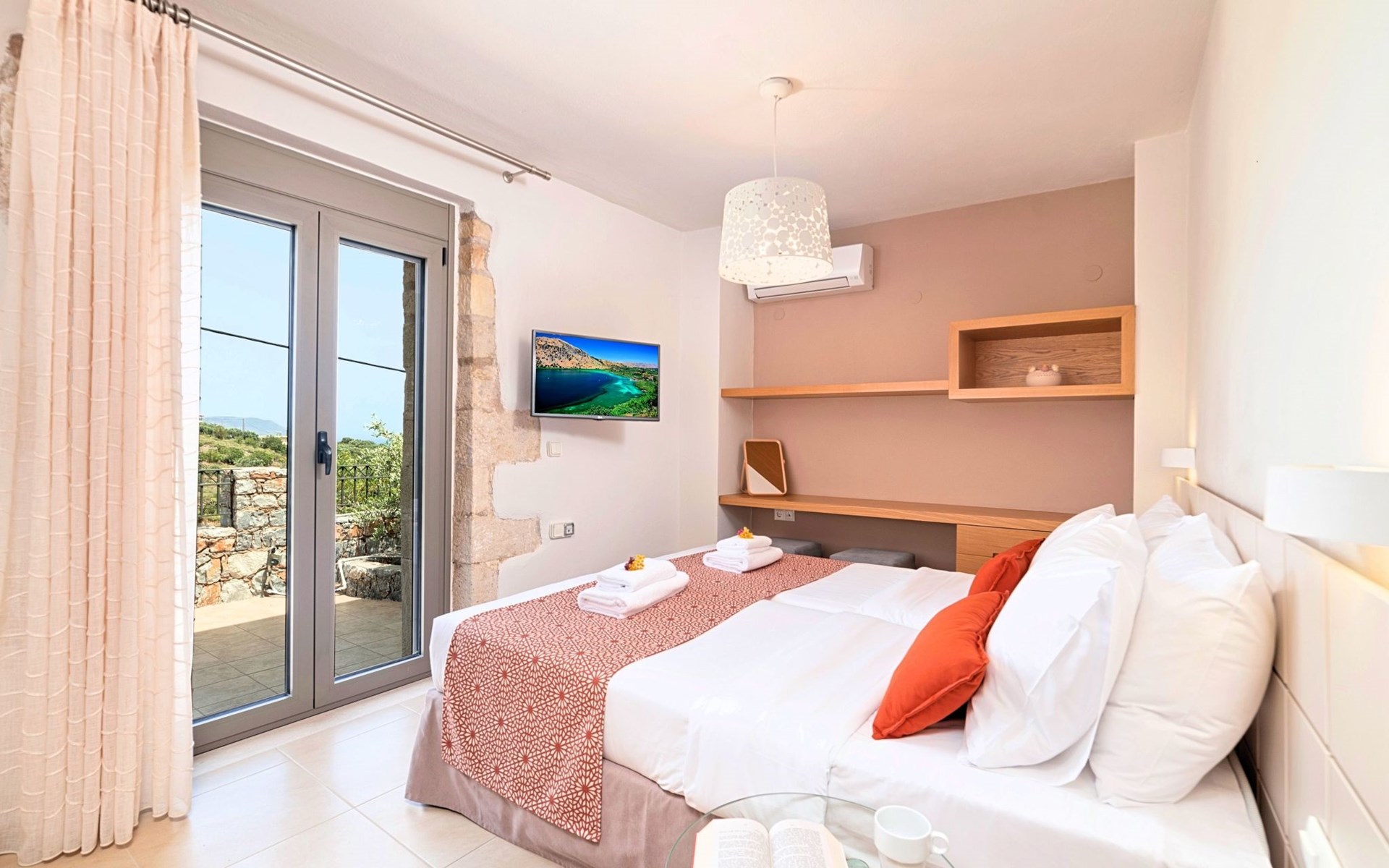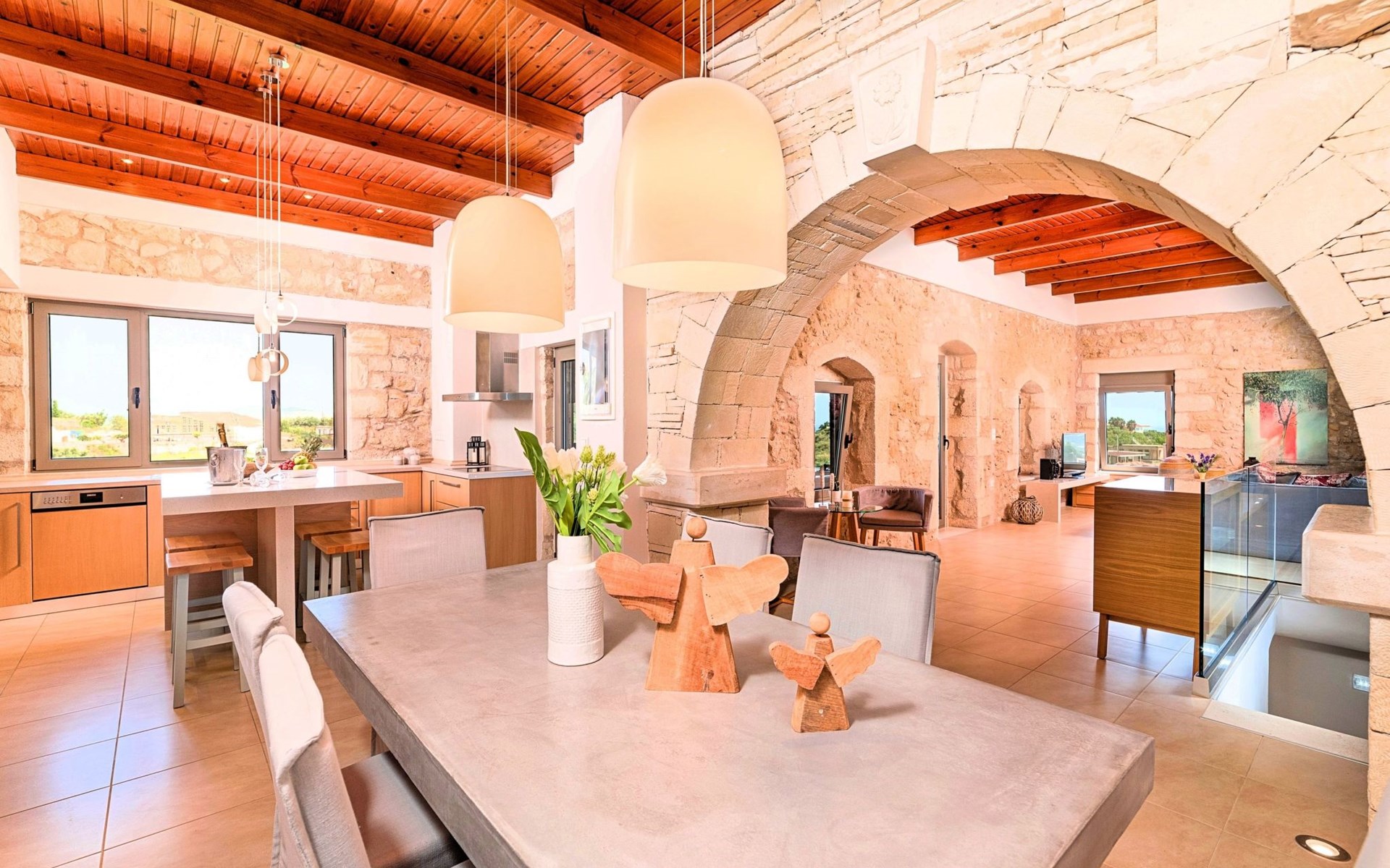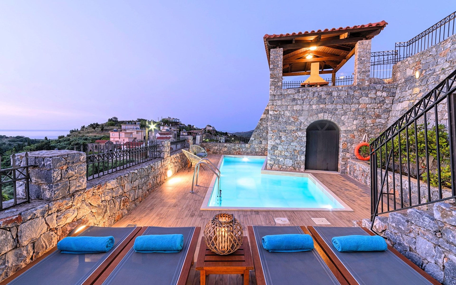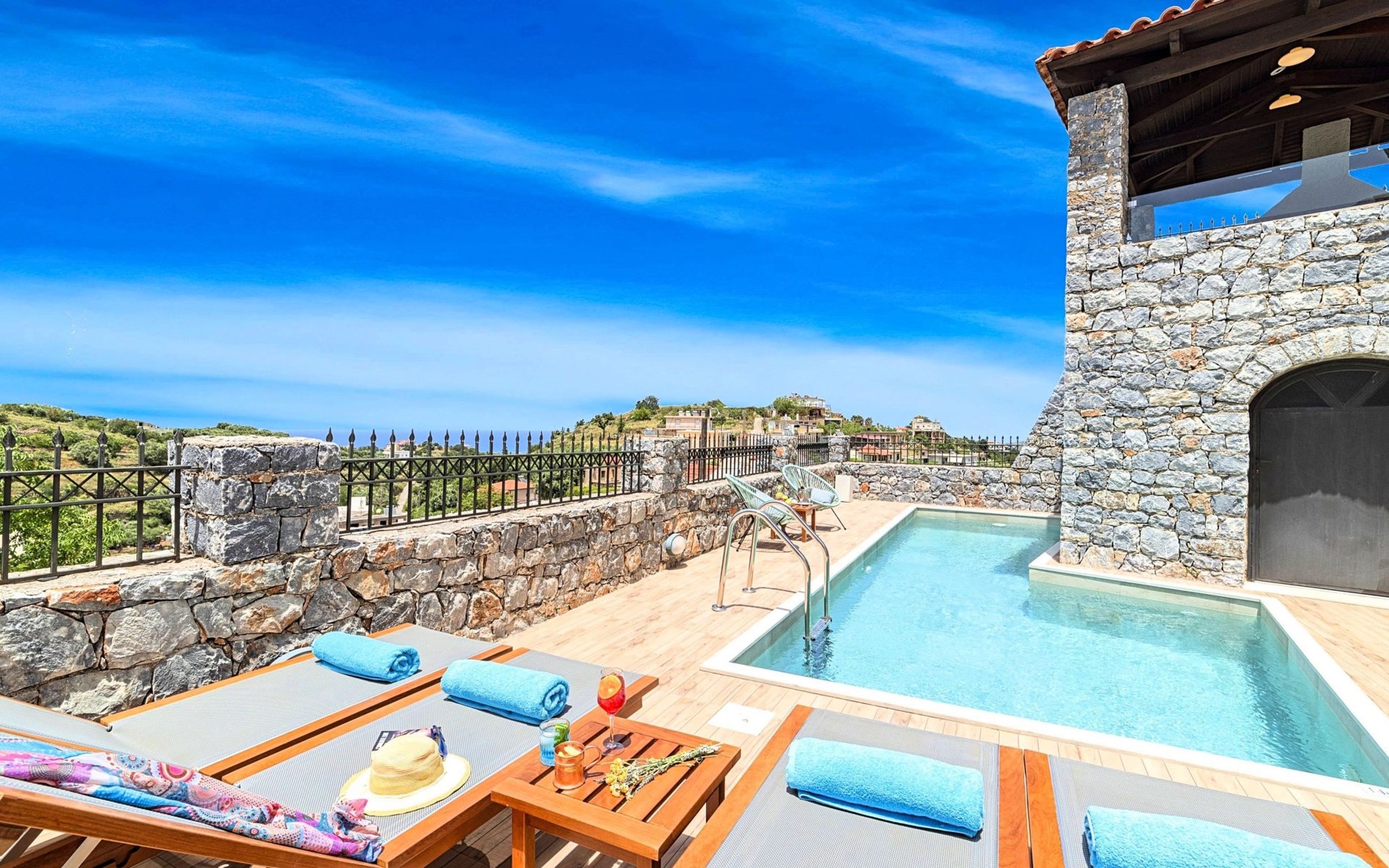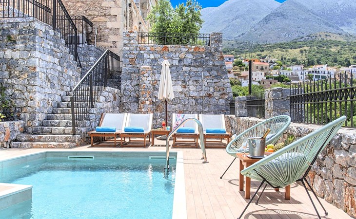 Built of stone and wood, Acrothea with the natural landscape between the slopes of the mountains and the olive trees while giving the sense of a settlement. Crafted with ambition to offer visitors a unique experience through the perfect combination of outdoor activities, the comfort of spacious house and personalized services. Designed with respect to Cretan architecture that ensures the comfort and pleasant hospitality experience of its guests, the house is nestled on the side of a hill. Enjoy fascinating views of the endless Cretan sea and of Kournas village. Luxury is in the fine tactful details, the villa presents a delightful landscape of island Mediterranean gardens, a tranquil atmosphere, protected from the usual crowds. Acrothea Villa is ideal for families or group of friends● Swimming pool with a whirlpool edge ● Two Sun lounge areas with sun beds next to the Swimming pool ● Private Parking.The outdoor pool is heated and can reach 6 to 8 degrees more that the 24 h average air temperature with maximum value of 29°CAcrothea Villa has the following facilities: ● A large living-dining room with easy access to the terraces and the pool and the whirlpool area. ● House Kitchen provide oven, fridge, coffee maker, tea facilities, juicer, toaster and dish sets. ● The house offers two bathrooms and a wc at the living room ● Three bedrooms ● Master bedroom with a Queen size double bed, wardrobe room, private bathroom with bathtub. ● Second bedroom with a two twin push together single beds. ● Third bedroom with two twin push together single beds. ● A living area between the bedrooms with a large sofa (the sofa offers two bunk beds ● TV at the Living Room and the bedrooms ● Air-condition ● Free WiFi internet access ● Outdoor Dinning Set (table with chairs) ● BBQ area with traditional brick oven and Dinning set ● Washing machine ● Dishwasher ● An iron and an ironing board ● Safe deposit box ● Hair dryer ● Fine linens and towels ● Toiletries ● Swimming pool towels ● Baby cot ● High chair ● Towels / bed linen, Cleaning- Every 3 or 4 days Guests of Acrothea Villa can also be provided with the following services, upon request and at extra cost: ● Car rental service ● Transfer service ● Travel services ● Massage sessions ● Daily delivery of groceries ● Diving lessons ● Climbing lessons ● Water sports ● Yacht cruises ● BabysittingThe old houses, the village square, the pottery workshop opposite the large kafeneio and Agapinakis's taverna "Kali Kardia", with its wonderful salads and delicious meat, are the first things you will notice in the village of Kournas. The village of Kournas has 500 inhabitants and lies at an altitude of 200 metres in the foothills of Mount Dafnomadara (1680 m). Kournas prospered from the 16th century onwards and is linked to many battles for freedom from the Turks. It was the seat of the Revolutionary Government in the Rising of 1866 and the seat of the Cretan General Assembly in 1897. The village of Kournas lacks particular facilities for tourists, but nearby Georgioupoli offers everything you might need. In the village of Kournas is the church of Agios Georgios, to which leads a road to the right of the square. It was built in Byzantine times, with architectural features added later during the Venetian period. The church is locked and you will not be able to see inside unless you find someone in the neighbourhood to give you the key, but it’s worth a try.Kournas is a pretty traditional village 8 km from Georgioupoli and about 4 km from Lake Kournas. If you are visiting Lake Kournas it is worth driving 15 minutes further along the narrow uphill road to Kournas. While the lake is 'touristy', Kournas village is completely unaffected by tourism and takes visitors on a journey back in time, as do many villages in the interior of Crete (these words were written in 2009, I hope I won’t need to change them in future…). 1002432
