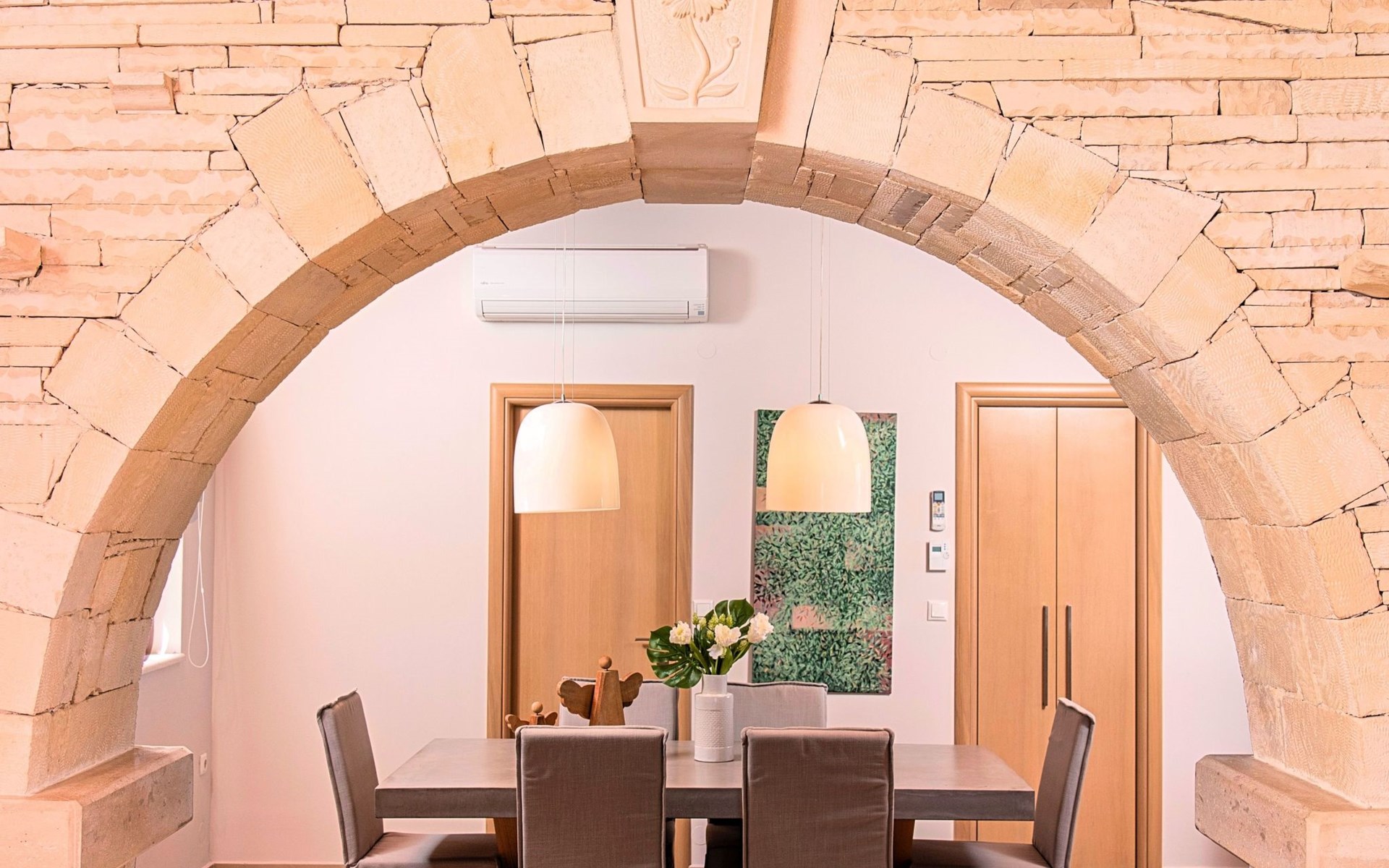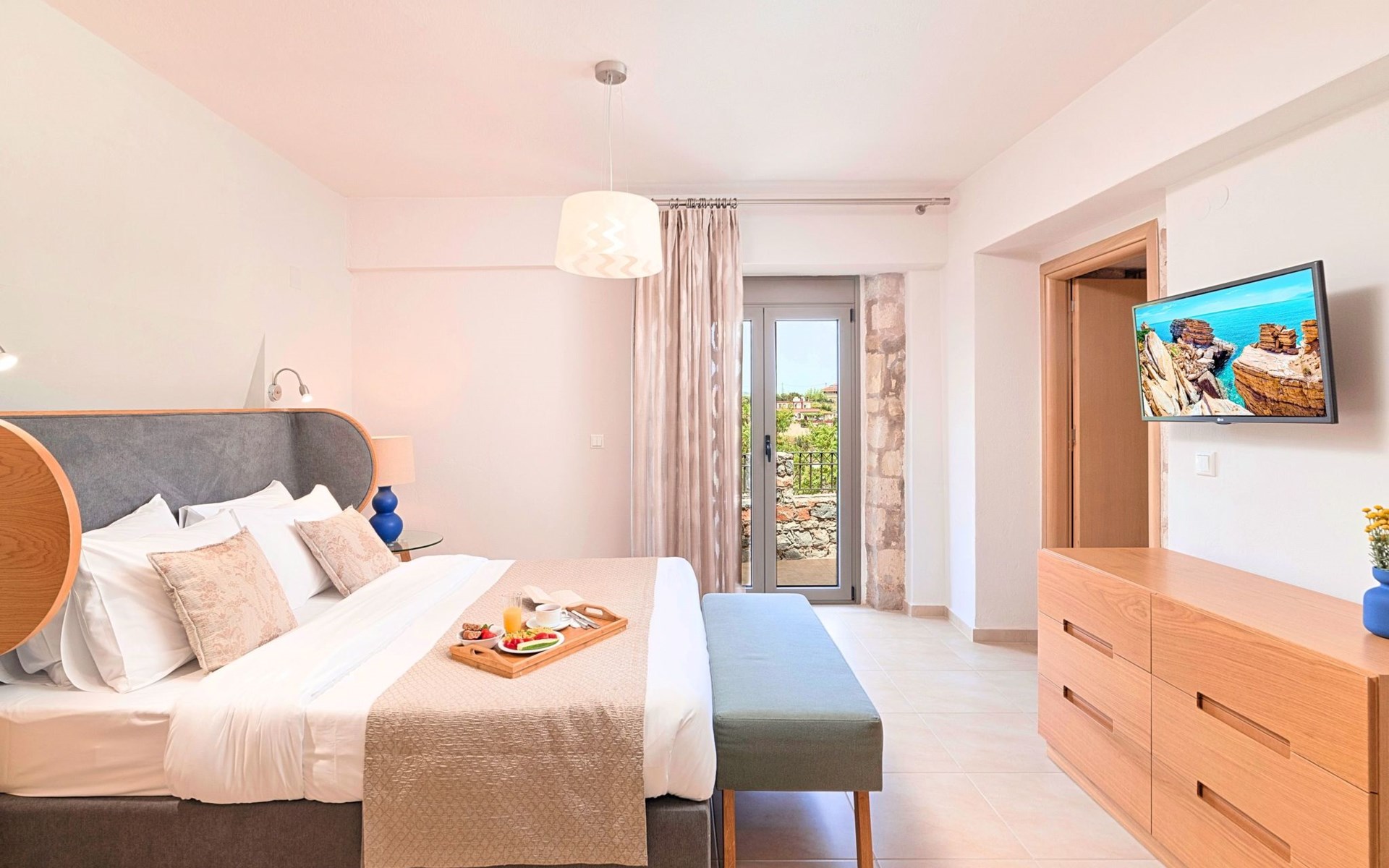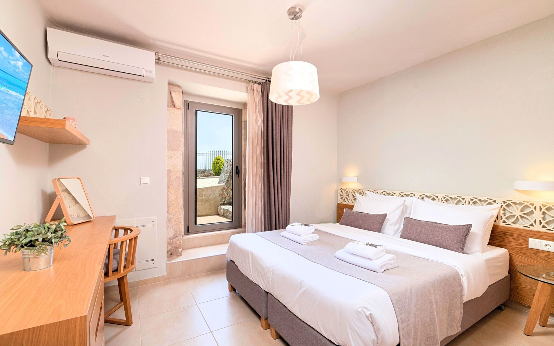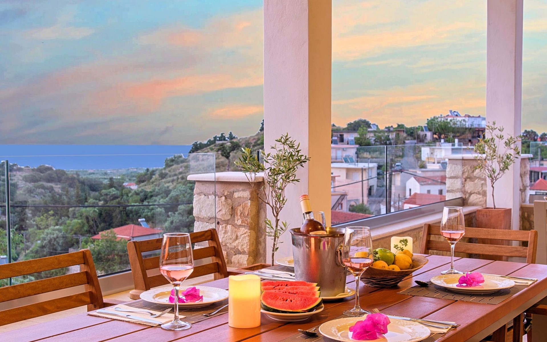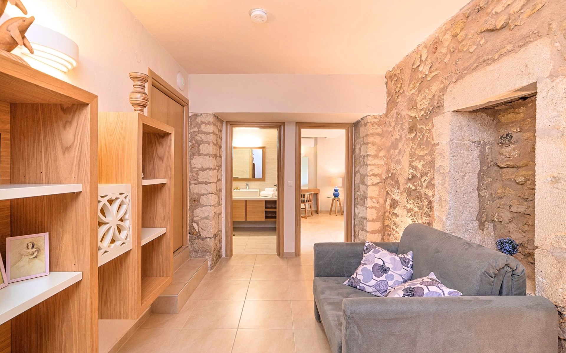 Built of stone and wood, Acrothea with the natural landscape between the slopes of the mountains and the olive trees while giving the sense of a settlement. Crafted with ambition to offer visitors a unique experience through the perfect combination of outdoor activities, the comfort of spacious house and personalized services. Designed with respect to Cretan architecture that ensures the comfort and pleasant hospitality experience of its guests, the house is nestled on the side of a hill. Enjoy fascinating views of the endless Cretan sea and of Kournas village. Luxury is in the fine tactful details, the villa presents a delightful landscape of island Mediterranean gardens, a tranquil atmosphere, protected from the usual crowds. Acrothea Villa is ideal for families or group of friends● Swimming pool with a whirlpool edge ● Two Sun lounge areas with sun beds next to the Swimming pool ● Private Parking.The outdoor pool is heated and can reach 6 to 8 degrees more that the 24 h average air temperature with maximum value of 29°CAcrothea Villa has the following facilities: ● A large living-dining room with easy access to the terraces and the pool and the whirlpool area. ● House Kitchen provide oven, fridge, coffee maker, tea facilities, juicer, toaster and dish sets. ● The house offers two bathrooms and a wc at the living room ● Three bedrooms ● Master bedroom with a Queen size double bed, wardrobe room, private bathroom with bathtub. ● Second bedroom with a two twin push together single beds. ● Third bedroom with two twin push together single beds. ● A living area between the bedrooms with a large sofa (the sofa offers two bunk beds ● TV at the Living Room and the bedrooms ● Air-condition ● Free WiFi internet access ● Outdoor Dinning Set (table with chairs) ● BBQ area with traditional brick oven and Dinning set ● Washing machine ● Dishwasher ● An iron and an ironing board ● Safe deposit box ● Hair dryer ● Fine linens and towels ● Toiletries ● Swimming pool towels ● Baby cot ● High chair ● Towels / bed linen, Cleaning- Every 3 or 4 days Guests of Acrothea Villa can also be provided with the following services, upon request and at extra cost: ● Car rental service ● Transfer service ● Travel services ● Massage sessions ● Daily delivery of groceries ● Diving lessons ● Climbing lessons ● Water sports ● Yacht cruises ● BabysittingThe old houses, the village square, the pottery workshop opposite the large kafeneio and Agapinakis's taverna "Kali Kardia", with its wonderful salads and delicious meat, are the first things you will notice in the village of Kournas. The village of Kournas has 500 inhabitants and lies at an altitude of 200 metres in the foothills of Mount Dafnomadara (1680 m). Kournas prospered from the 16th century onwards and is linked to many battles for freedom from the Turks. It was the seat of the Revolutionary Government in the Rising of 1866 and the seat of the Cretan General Assembly in 1897. The village of Kournas lacks particular facilities for tourists, but nearby Georgioupoli offers everything you might need. In the village of Kournas is the church of Agios Georgios, to which leads a road to the right of the square. It was built in Byzantine times, with architectural features added later during the Venetian period. The church is locked and you will not be able to see inside unless you find someone in the neighbourhood to give you the key, but it’s worth a try.Kournas is a pretty traditional village 8 km from Georgioupoli and about 4 km from Lake Kournas. If you are visiting Lake Kournas it is worth driving 15 minutes further along the narrow uphill road to Kournas. While the lake is 'touristy', Kournas village is completely unaffected by tourism and takes visitors on a journey back in time, as do many villages in the interior of Crete (these words were written in 2009, I hope I won’t need to change them in future…). 1002432