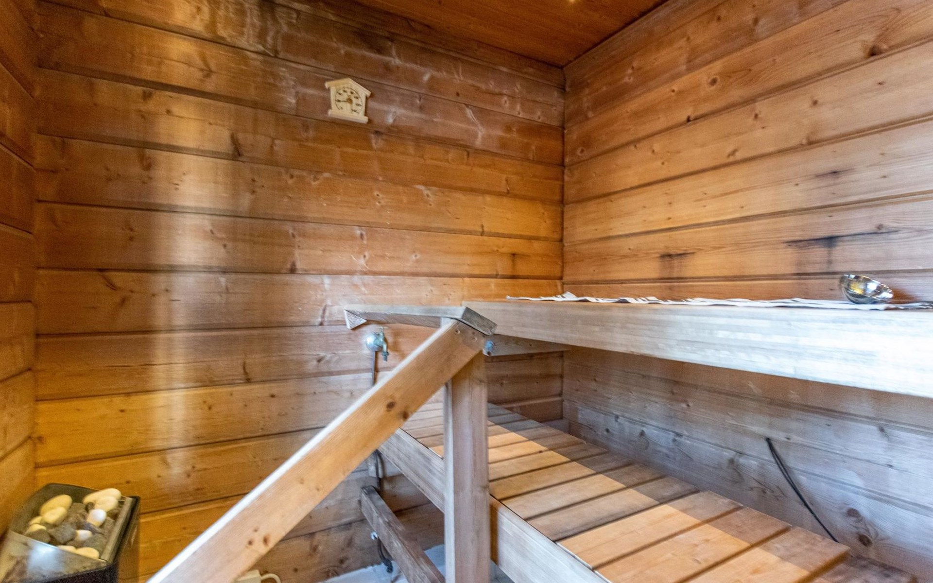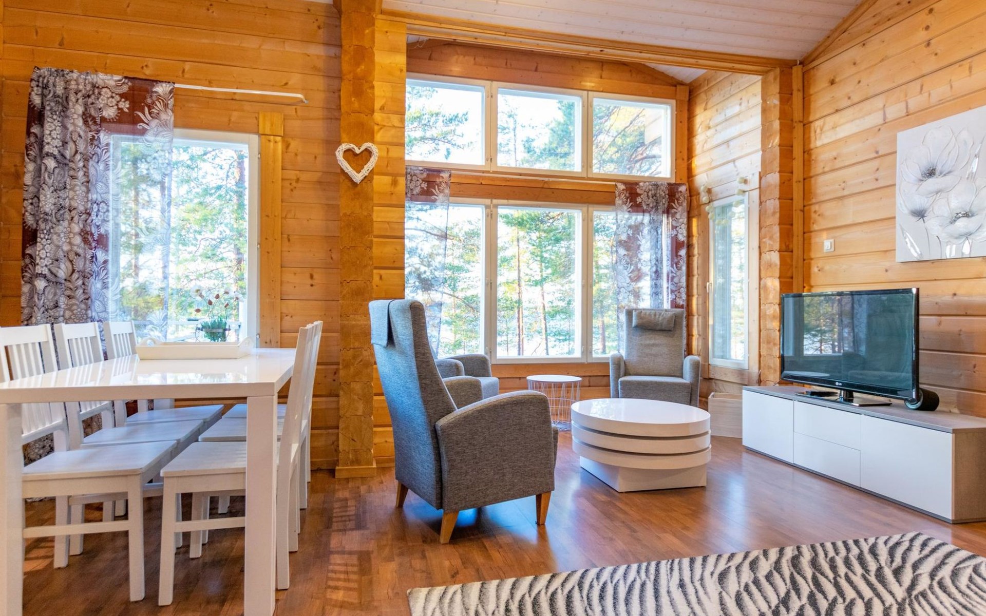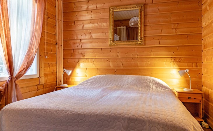 The log villa, built in 2006, features a spacious living room, dining area, and combined living room/kitchen. There are three bedrooms, each with two beds. Additionally, the living room includes a sofa bed (140 x 200 cm) that can accommodate two more guests.