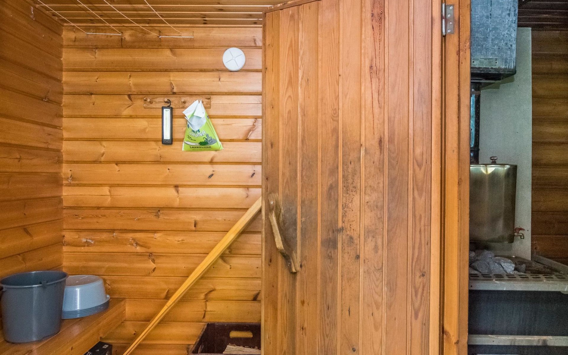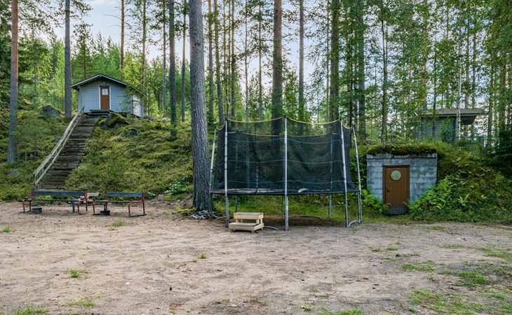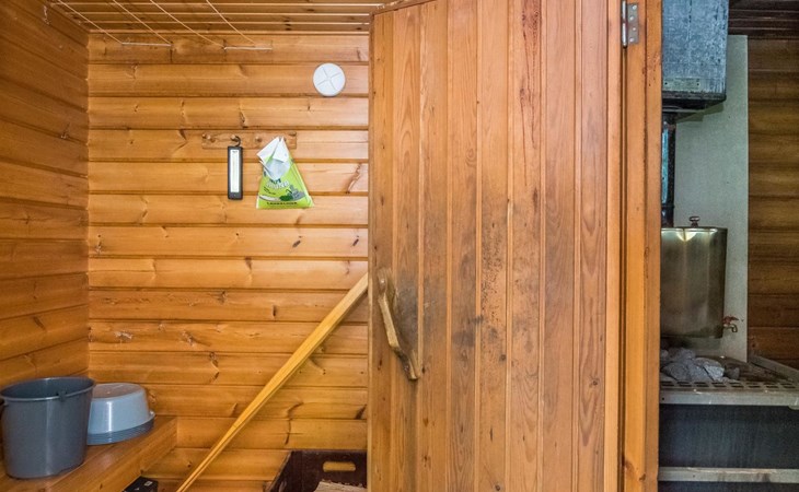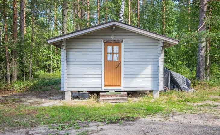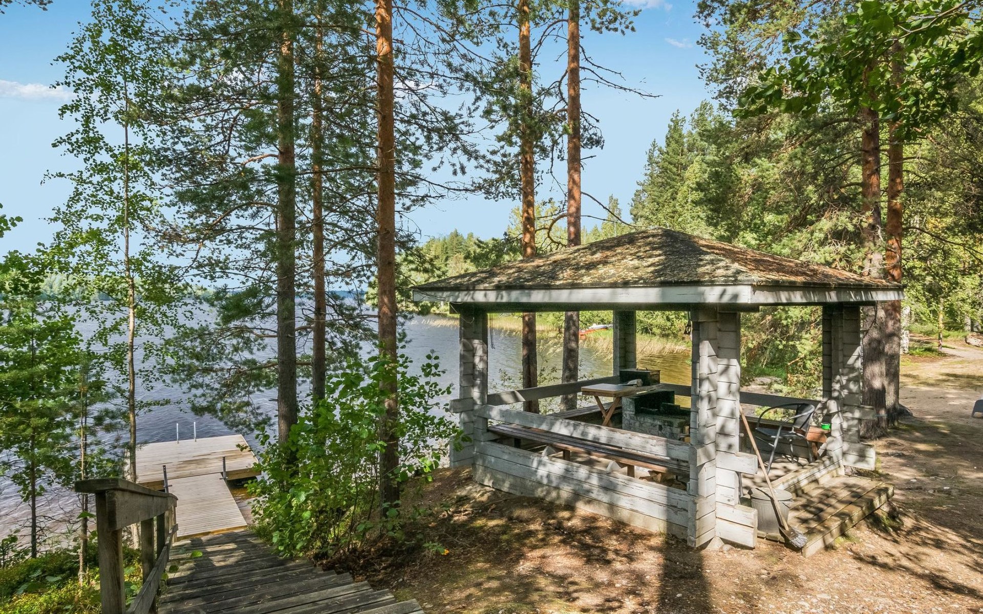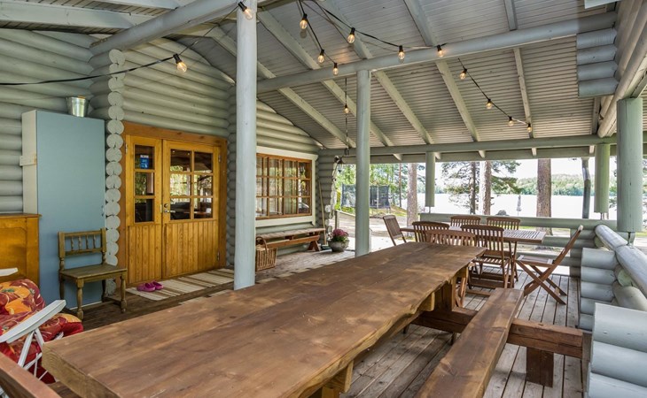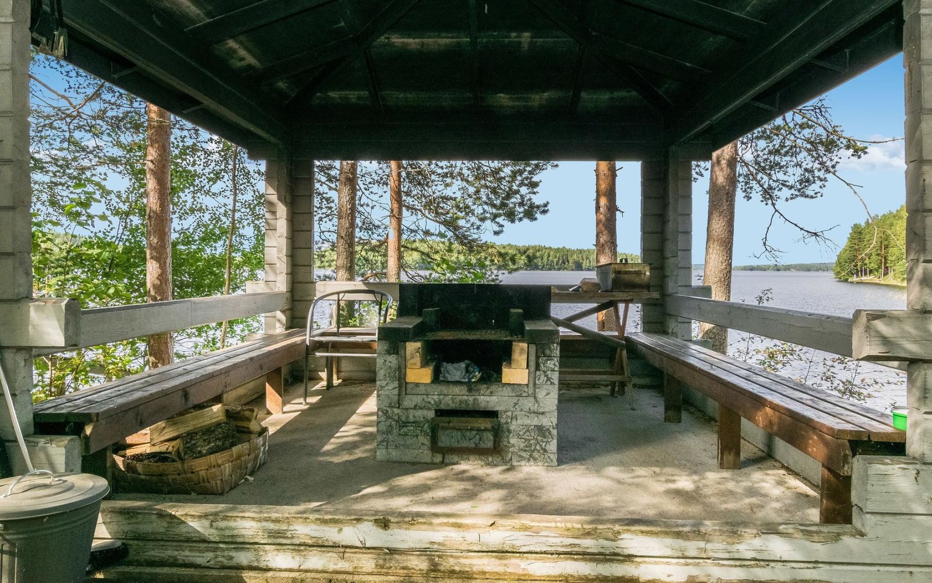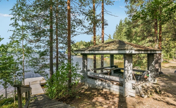 Lakeside sauna with wood-burning sauna stove and dressing room, no electricity, water comes from the well by using a pump. Covered cooking area with masonry grill. Also gas grill at the property.
