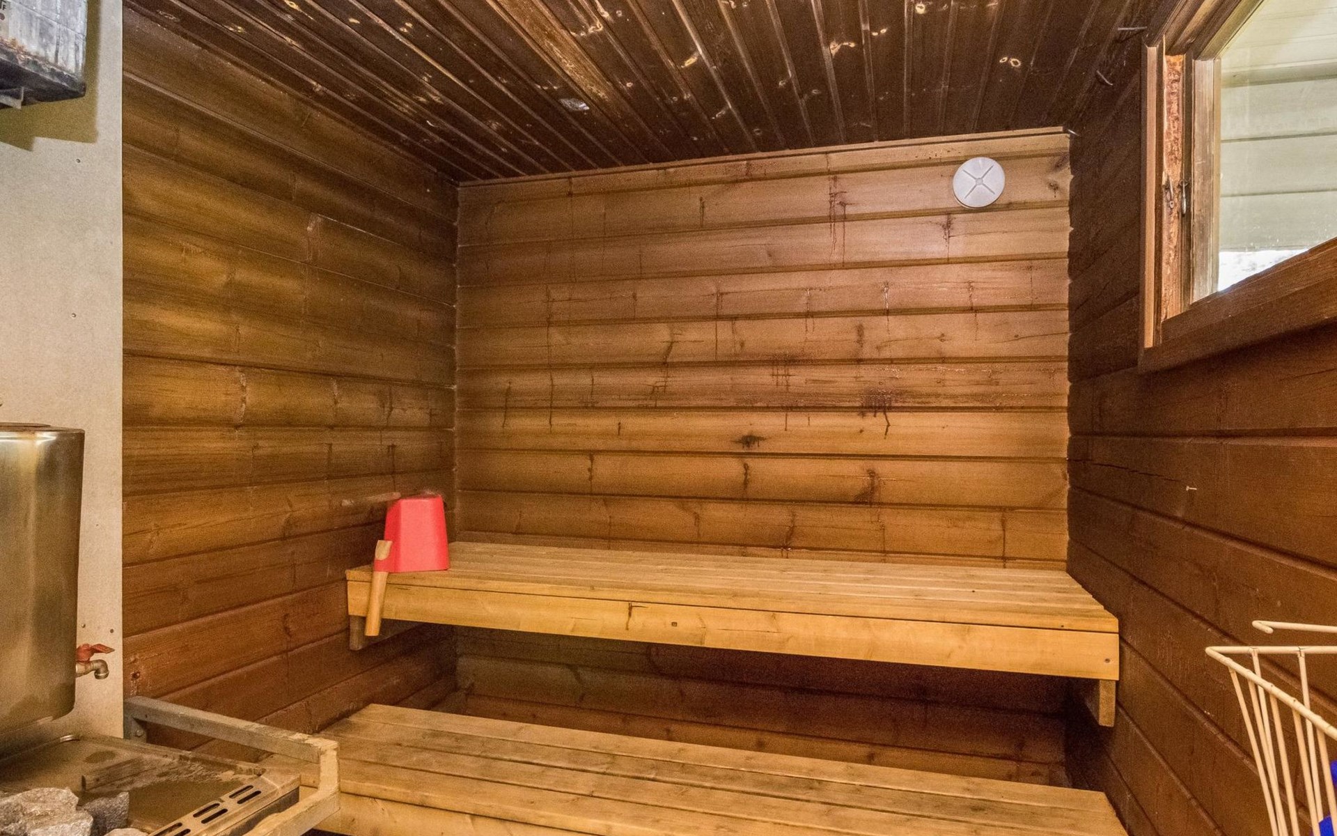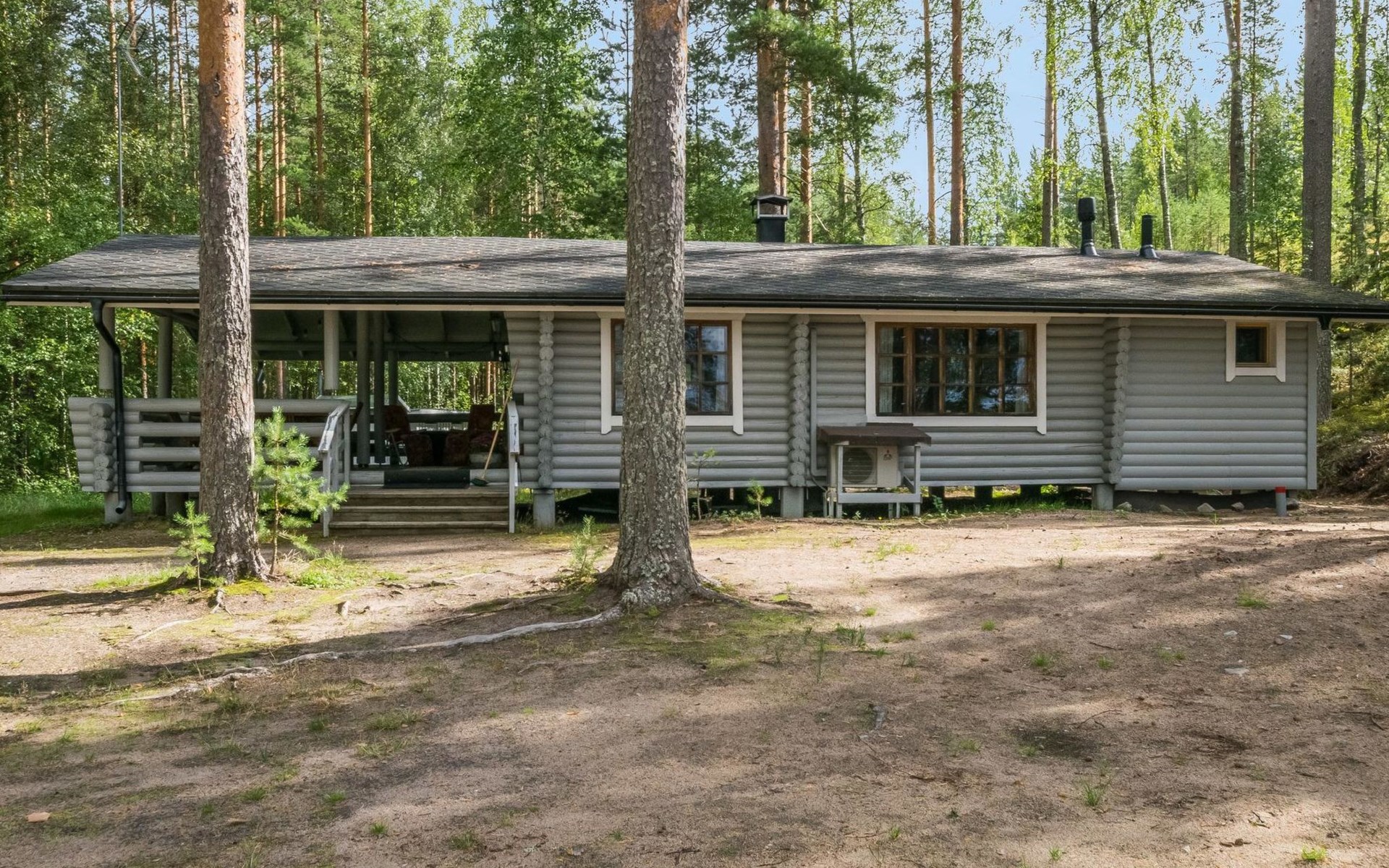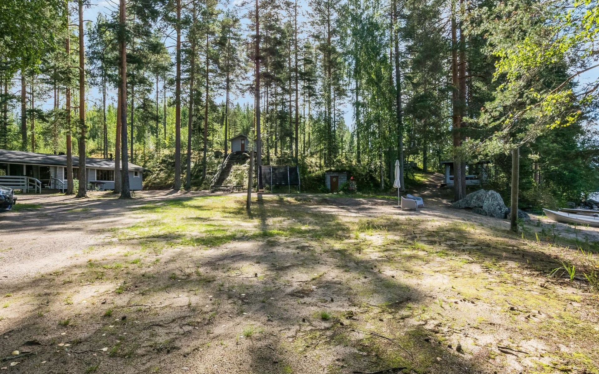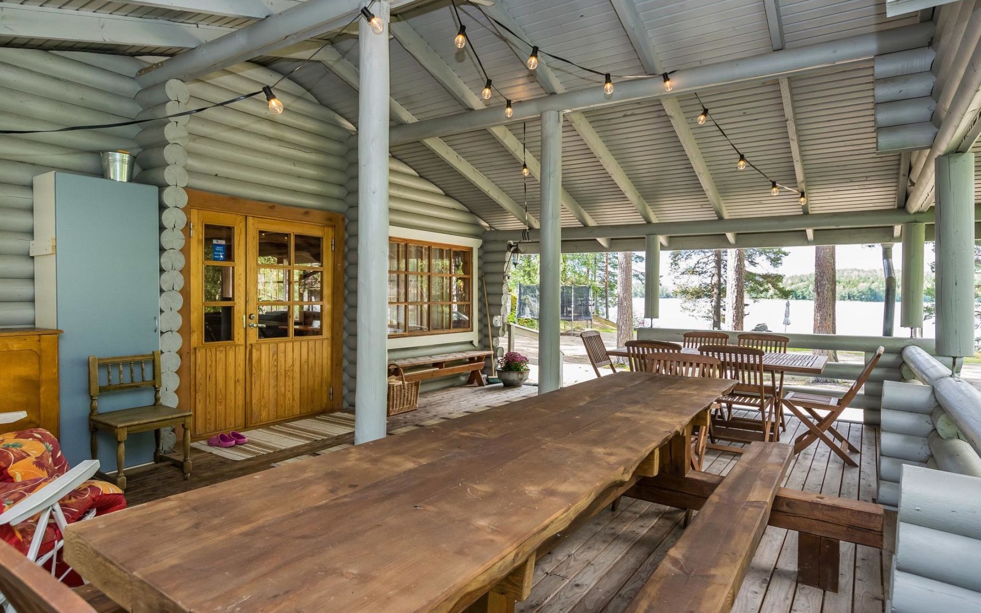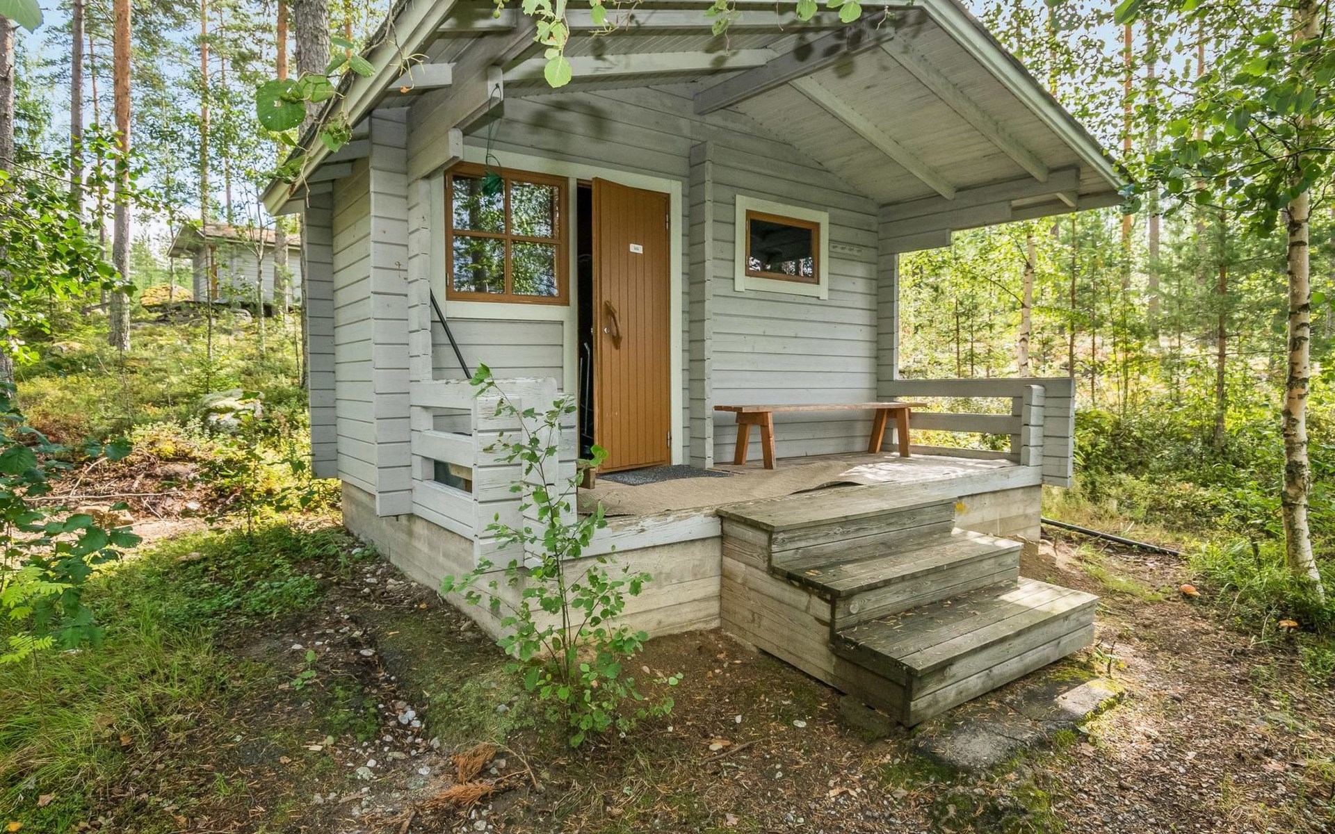 Lakeside sauna with wood-burning sauna stove and dressing room, no electricity, water comes from the well by using a pump. Covered cooking area with masonry grill. Also gas grill at the property.