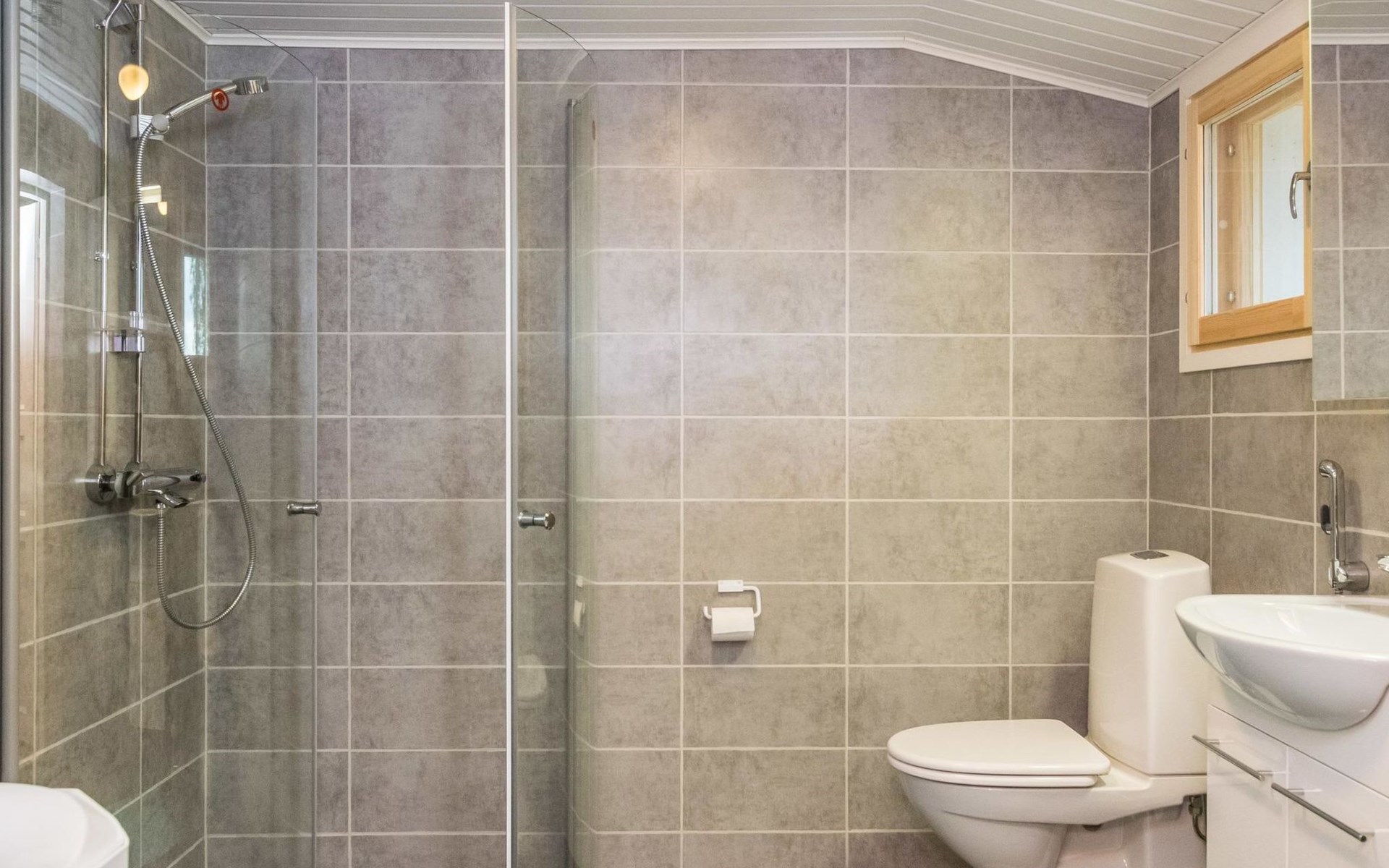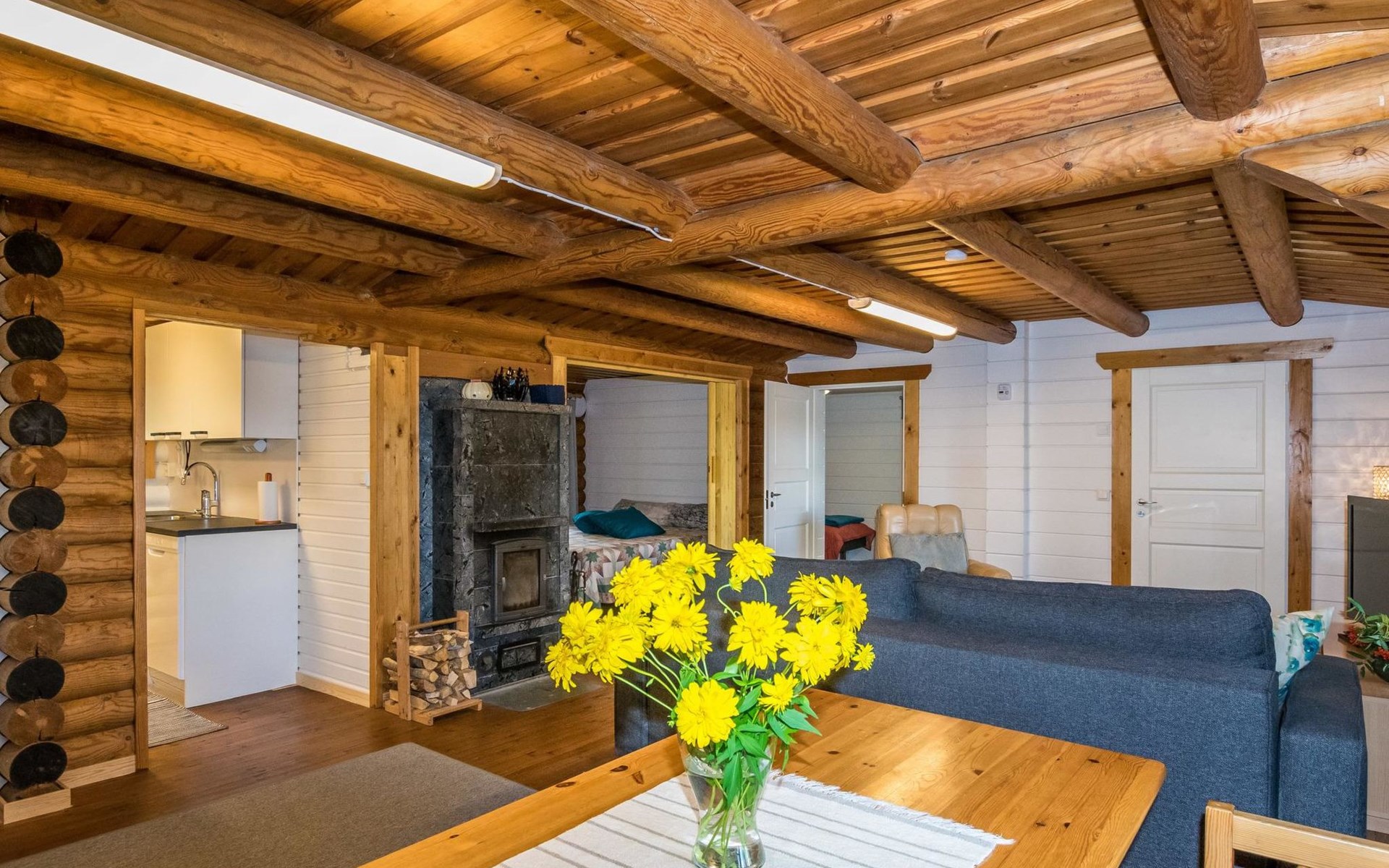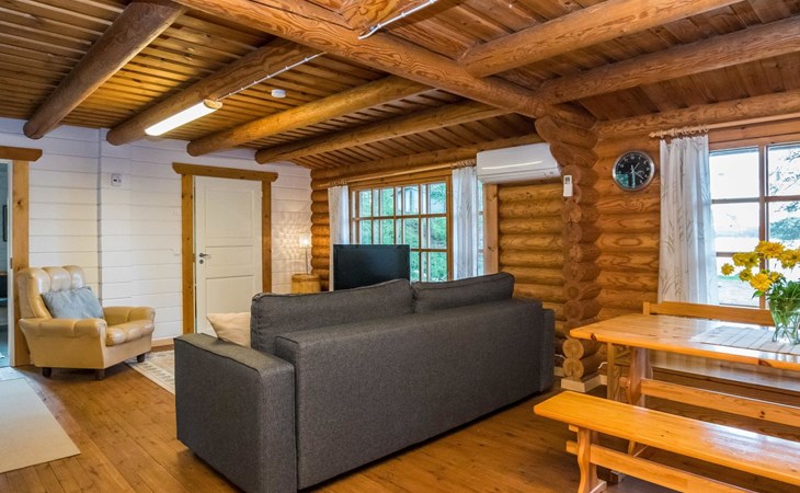 Kitchen, sofa bed for two in the living room (30 m²) two connected beds in the bedroom (sliding door), two beds in the another bedroom, WC and shower in the washroom.