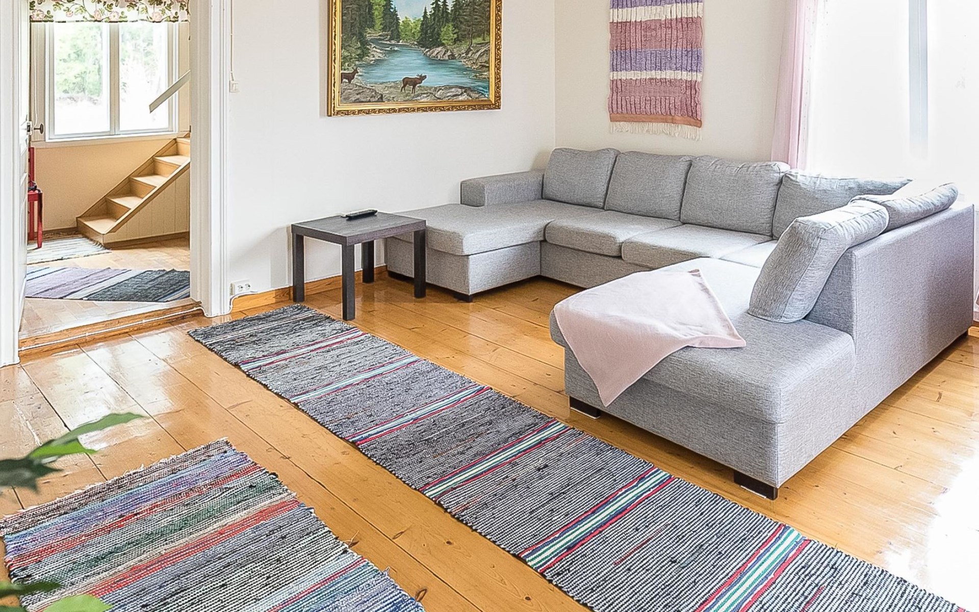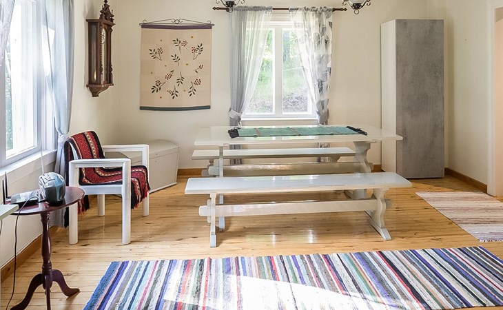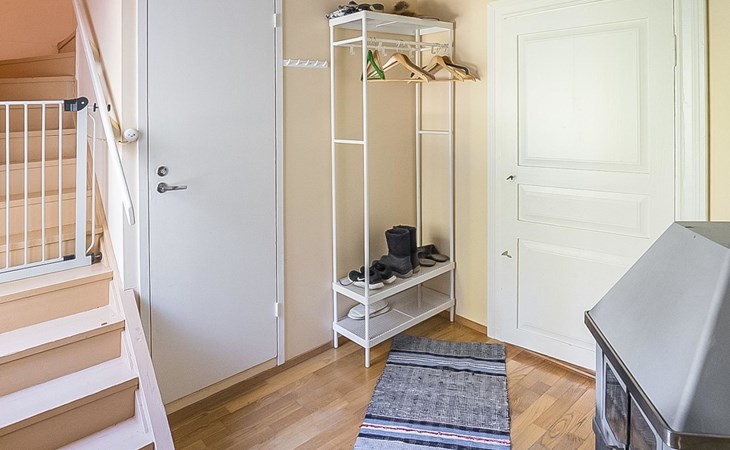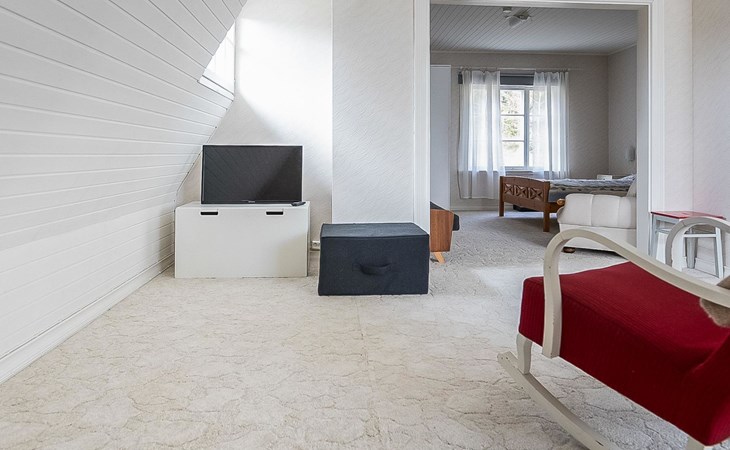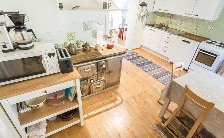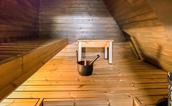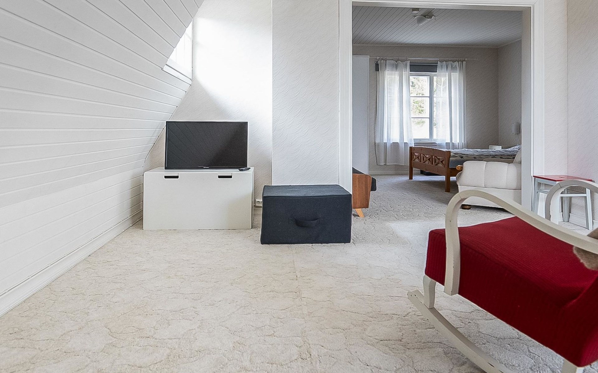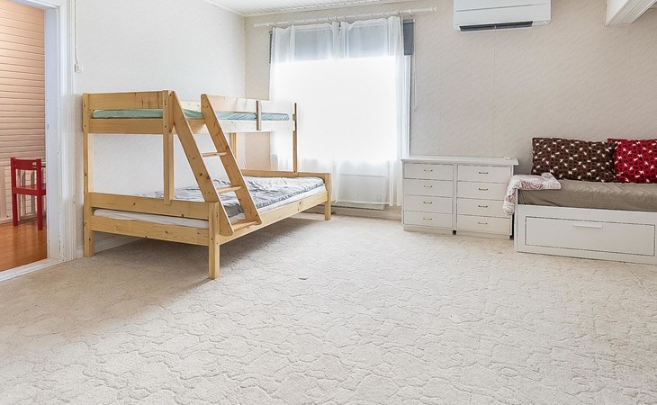 On the upper floor, there are two bedrooms separated by curtain. The master bedroom has a double bed and sofa bed. Another bedroom has a bunk bed. Lower bed is 120 cm wide and the upper bed is 80 cm wide. In addition, the room has a spreadable sofa bed, TV and DVD-player. Some extra beds are available by using cubic chair beds (3 beds total). On the upper floor, there are also newly renovated washroom and electric sauna.