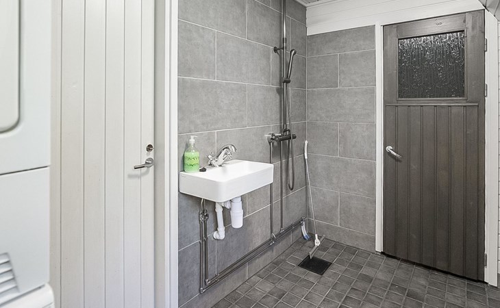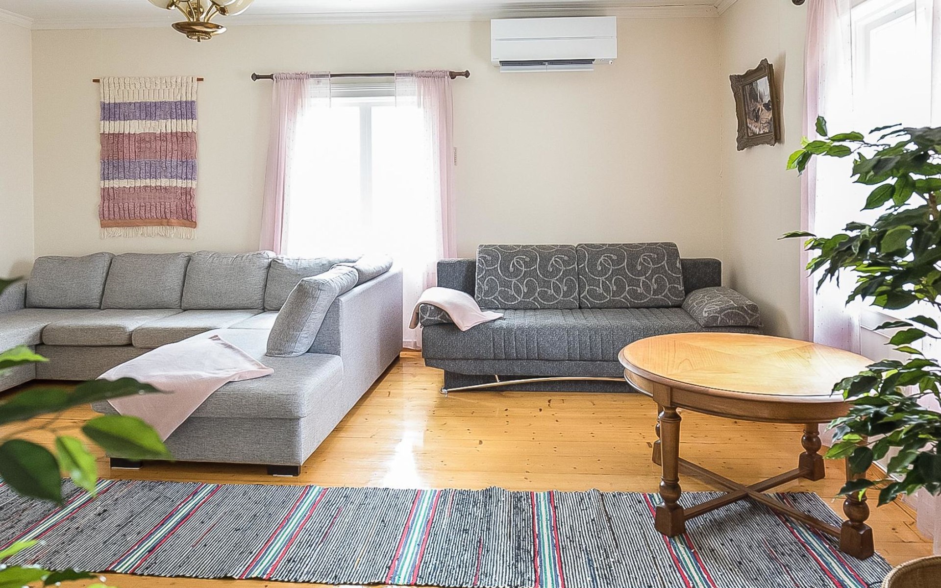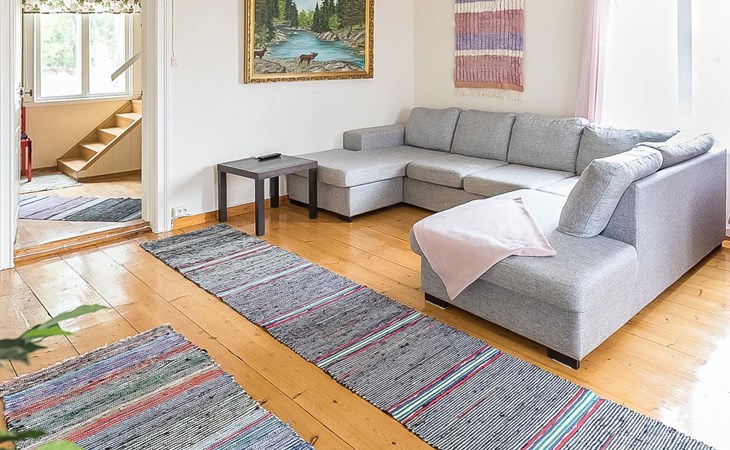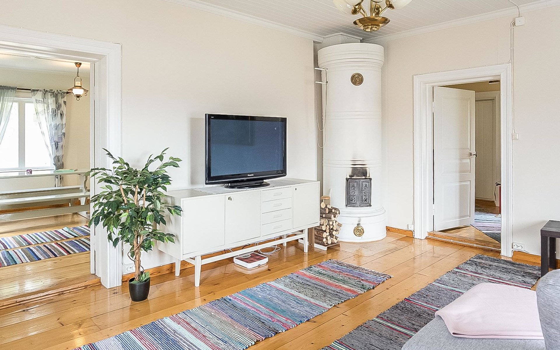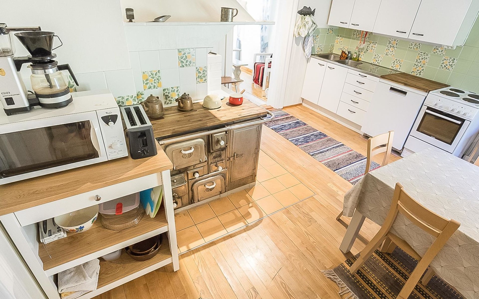 On the upper floor, there are two bedrooms separated by curtain. The master bedroom has a double bed and sofa bed. Another bedroom has a bunk bed. Lower bed is 120 cm wide and the upper bed is 80 cm wide. In addition, the room has a spreadable sofa bed, TV and DVD-player. Some extra beds are available by using cubic chair beds (3 beds total). On the upper floor, there are also newly renovated washroom and electric sauna.
