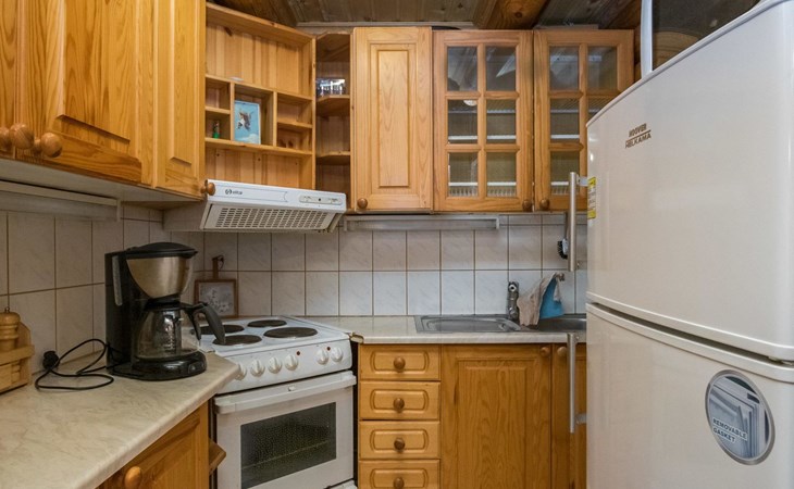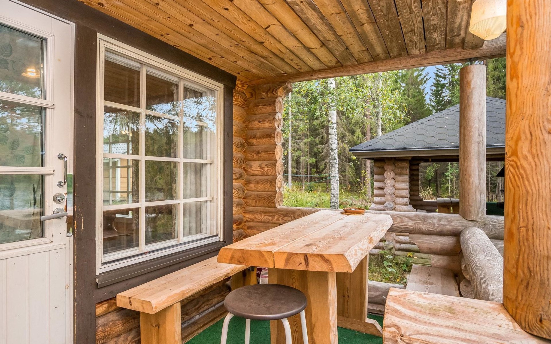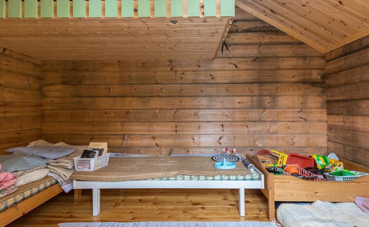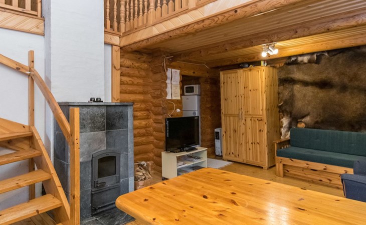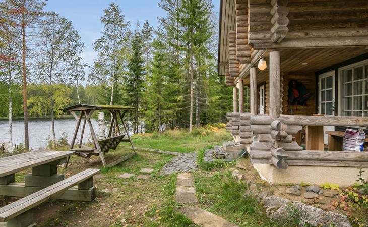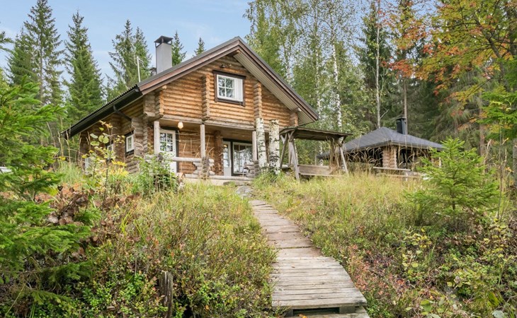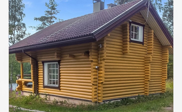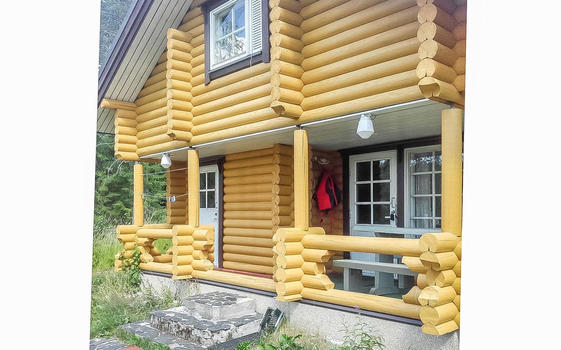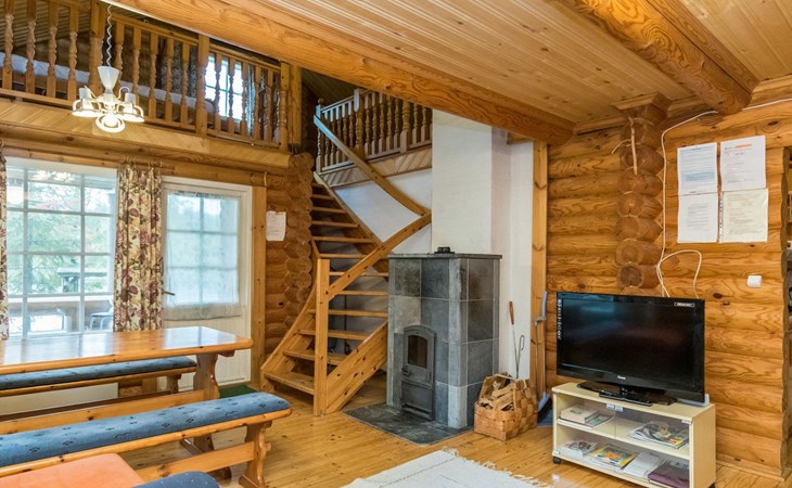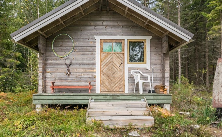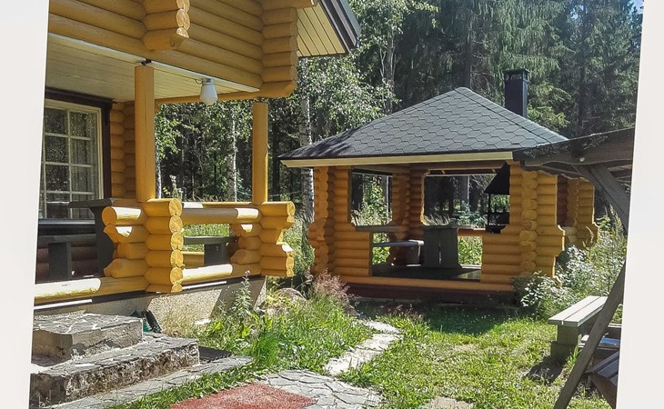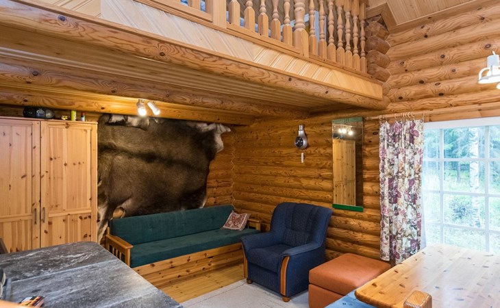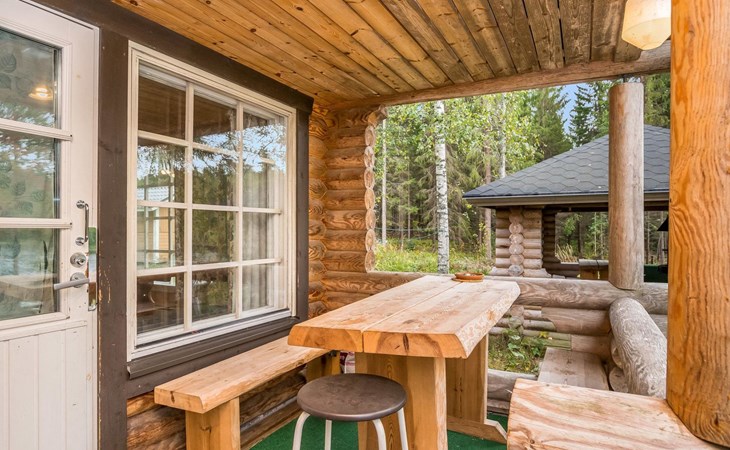 Log cabin, 1997, kitchenette, living room, sleeping loft with 2 double beds, sauna, washing room (toilet) access through porch, veranda.