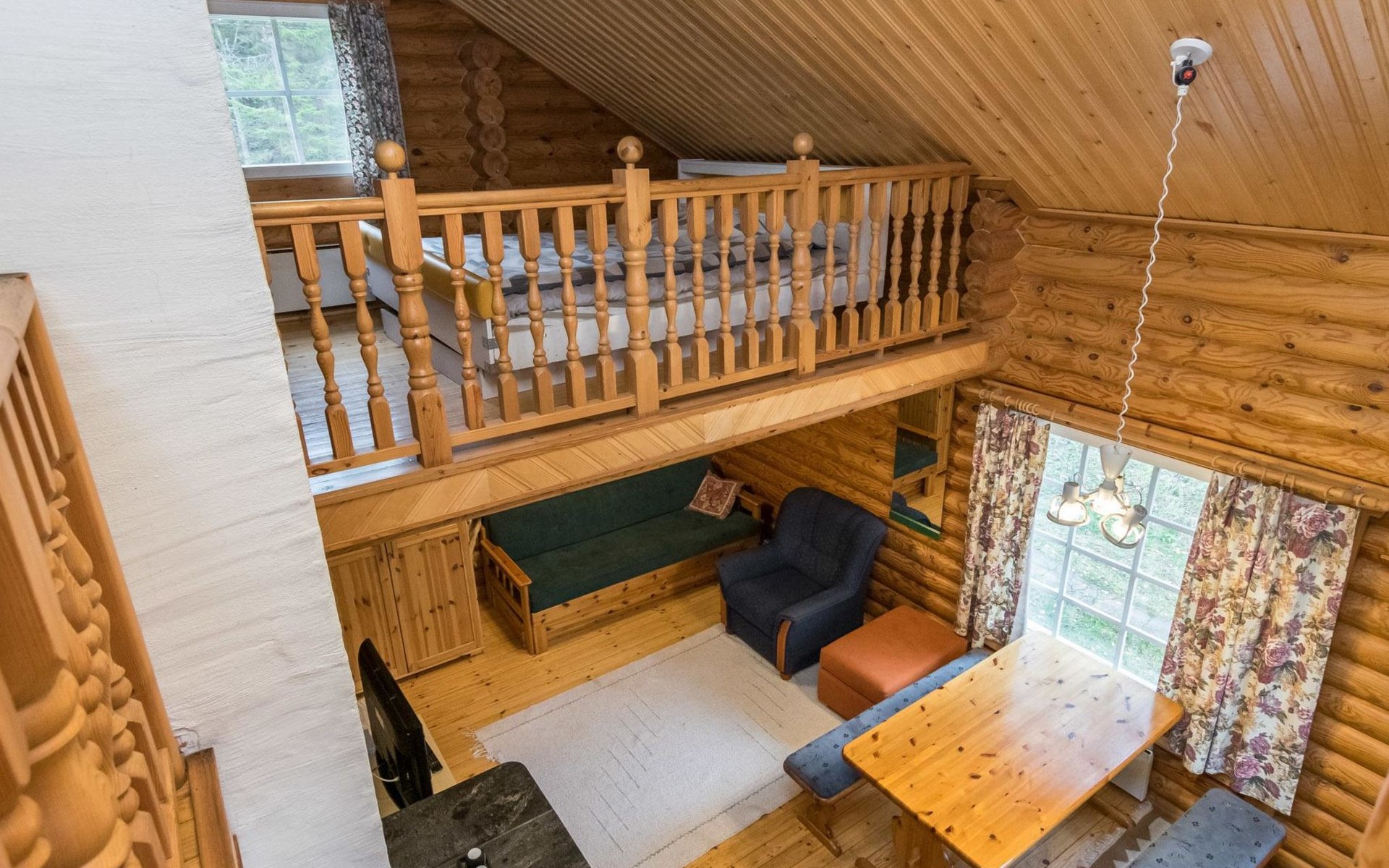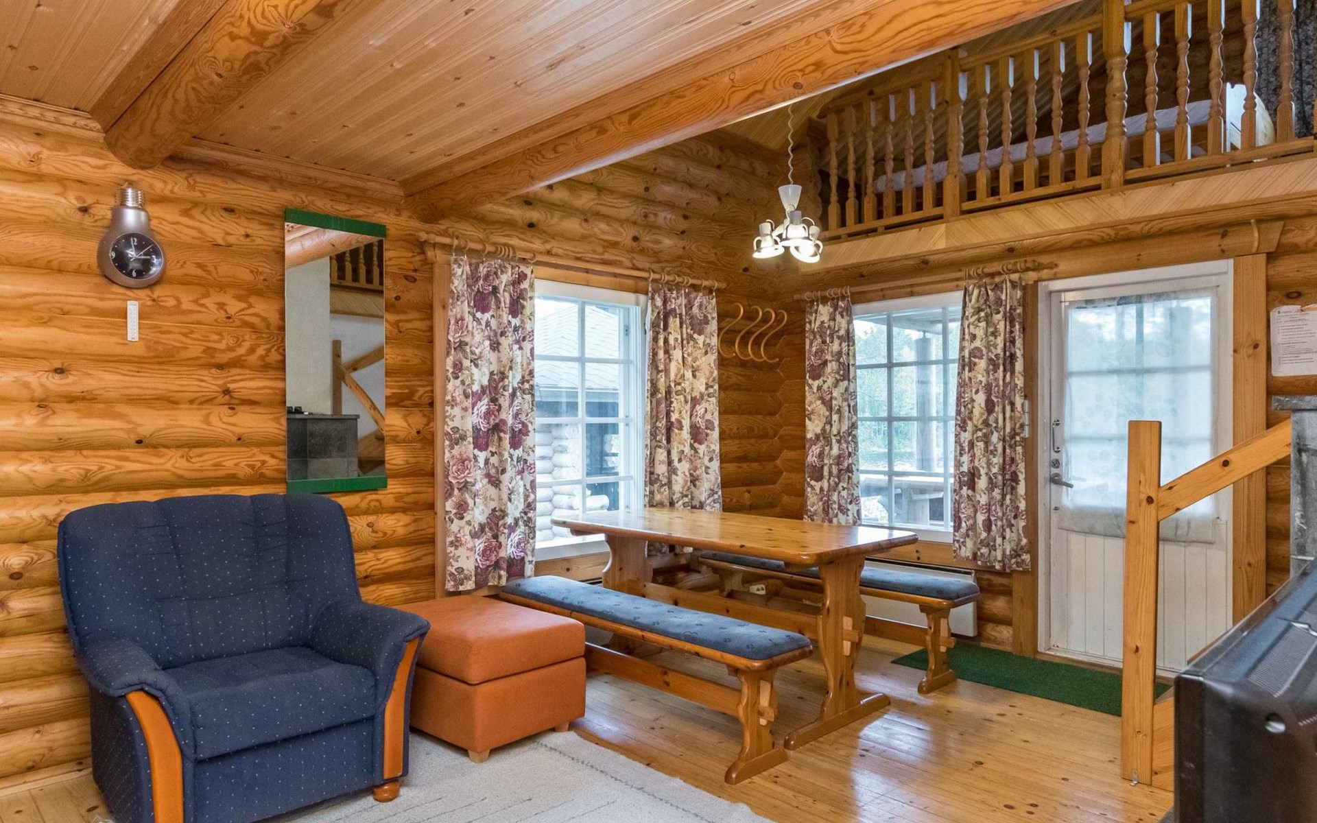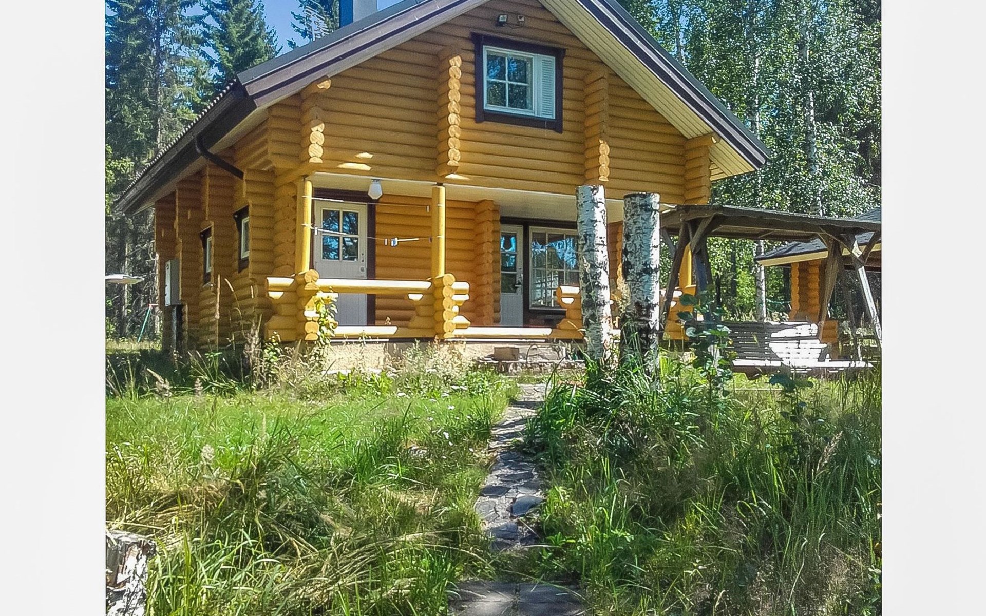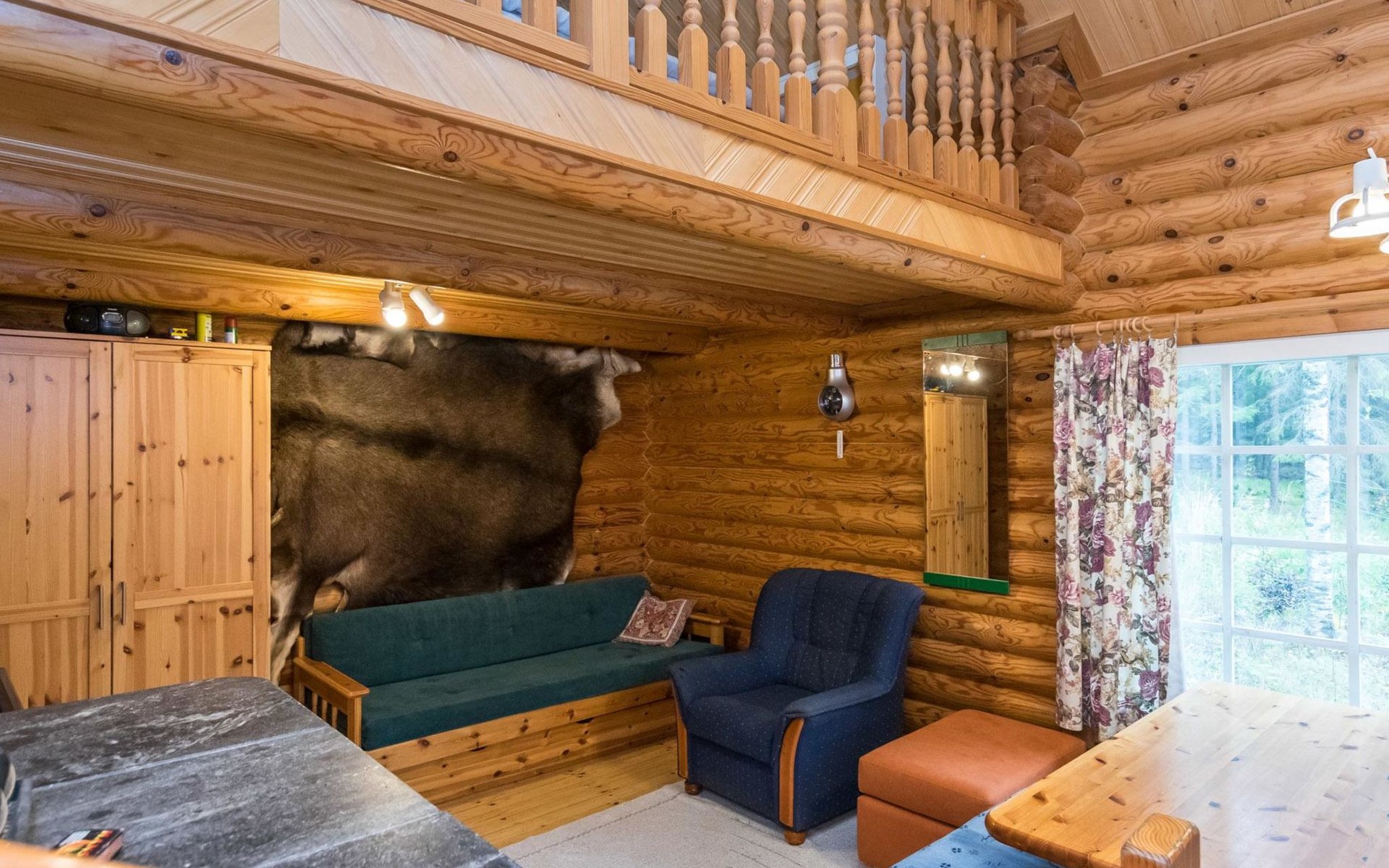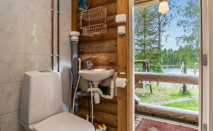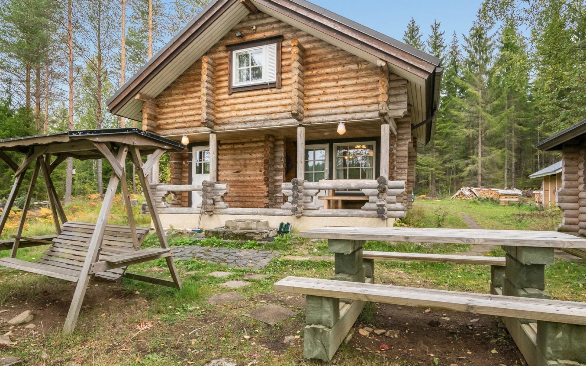 Log cabin, 1997, kitchenette, living room, sleeping loft with 2 double beds, sauna, washing room (toilet) access through porch, veranda.
