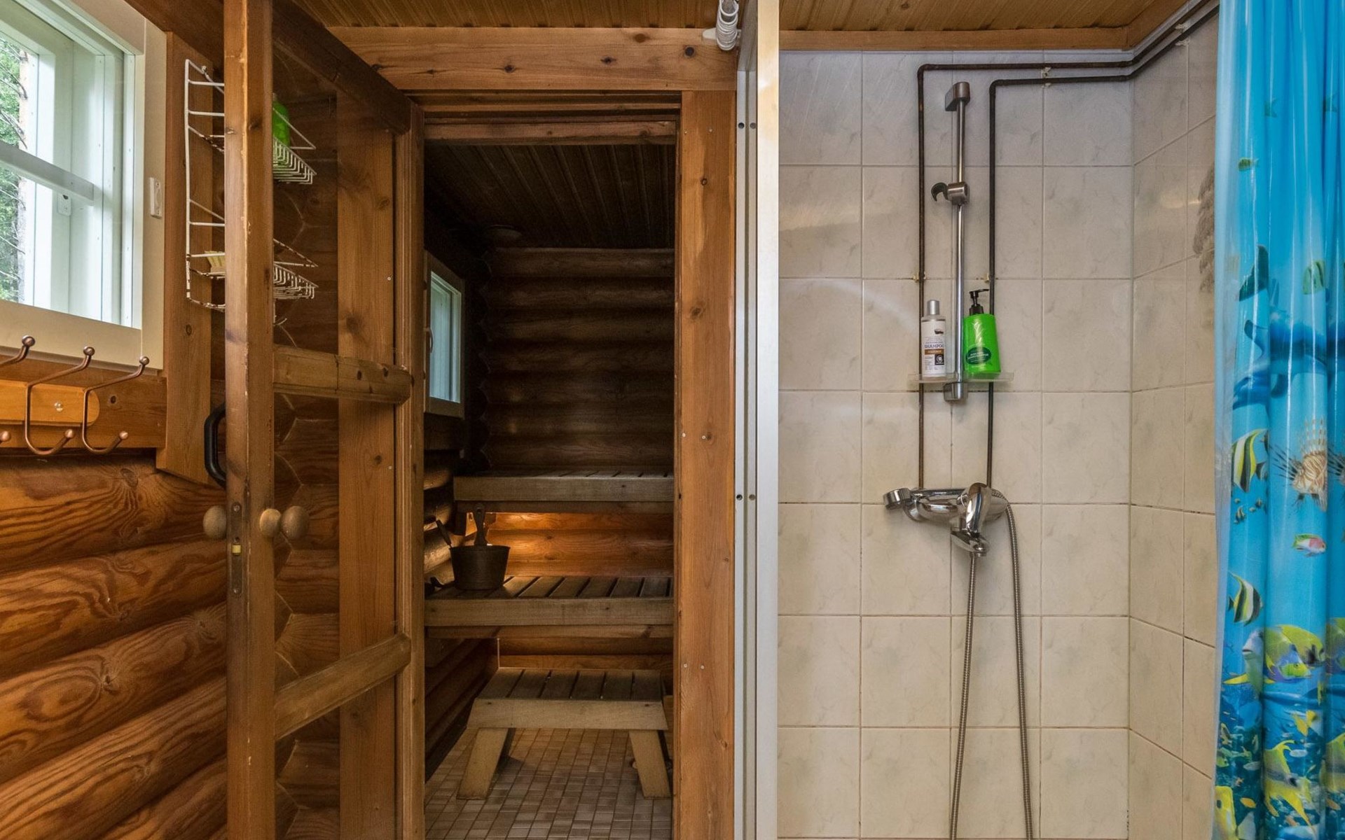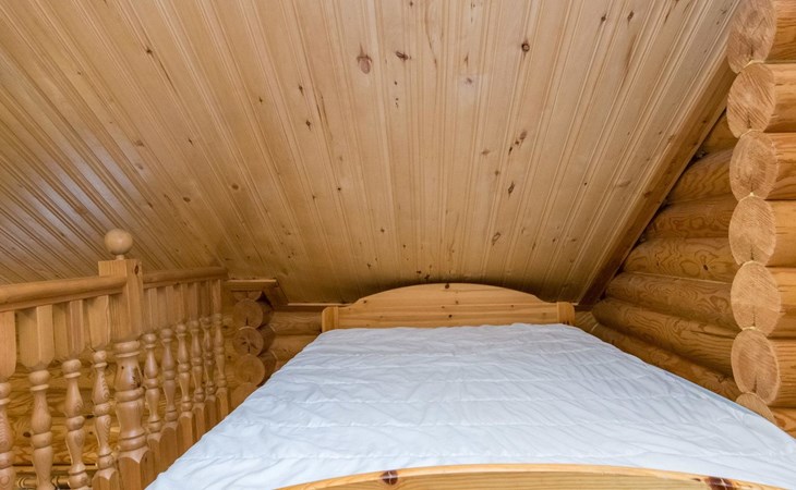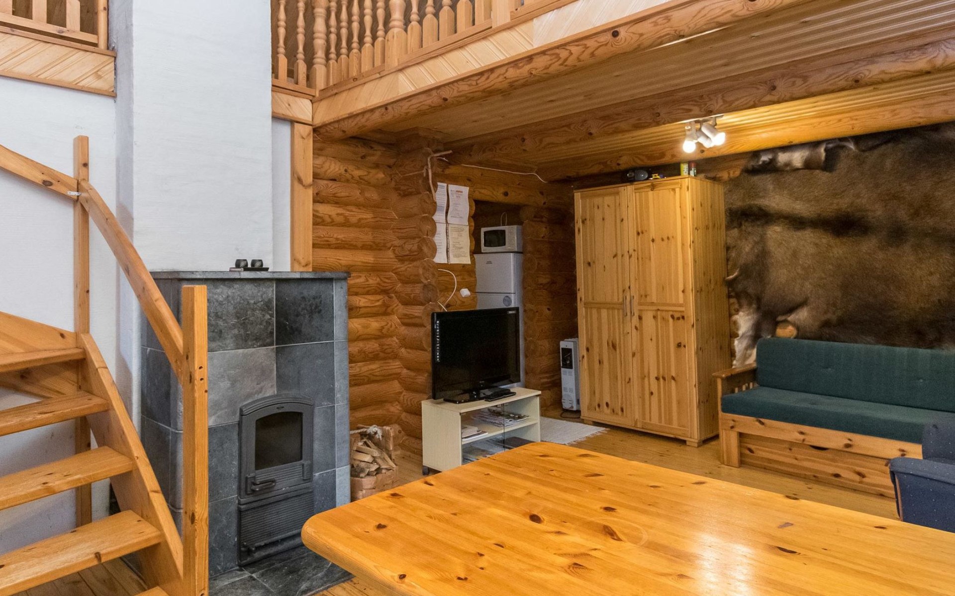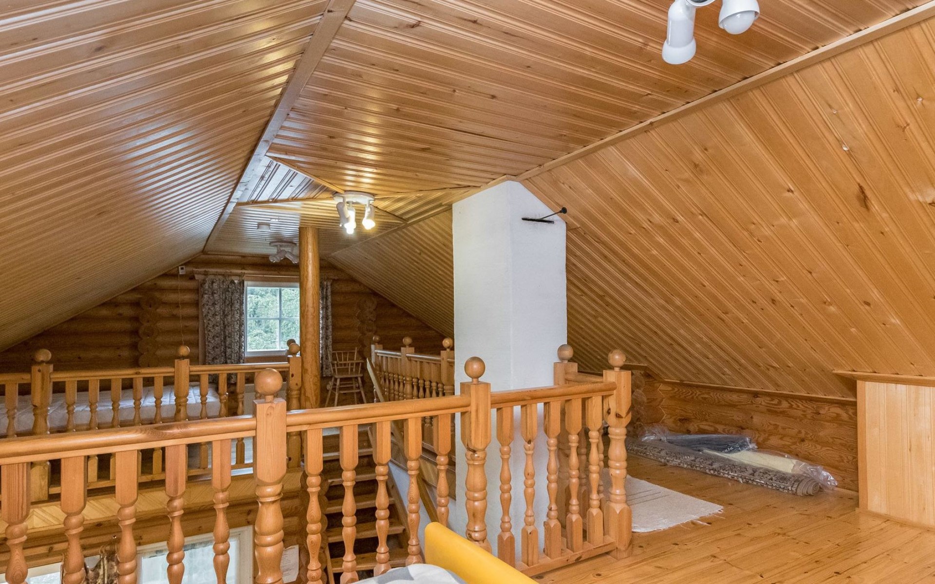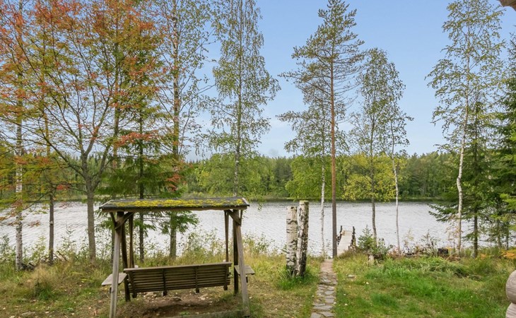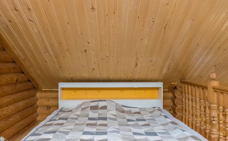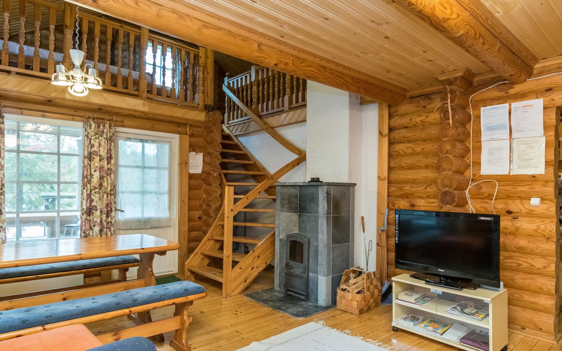 Log cabin, 1997, kitchenette, living room, sleeping loft with 2 double beds, sauna, washing room (toilet) access through porch, veranda.