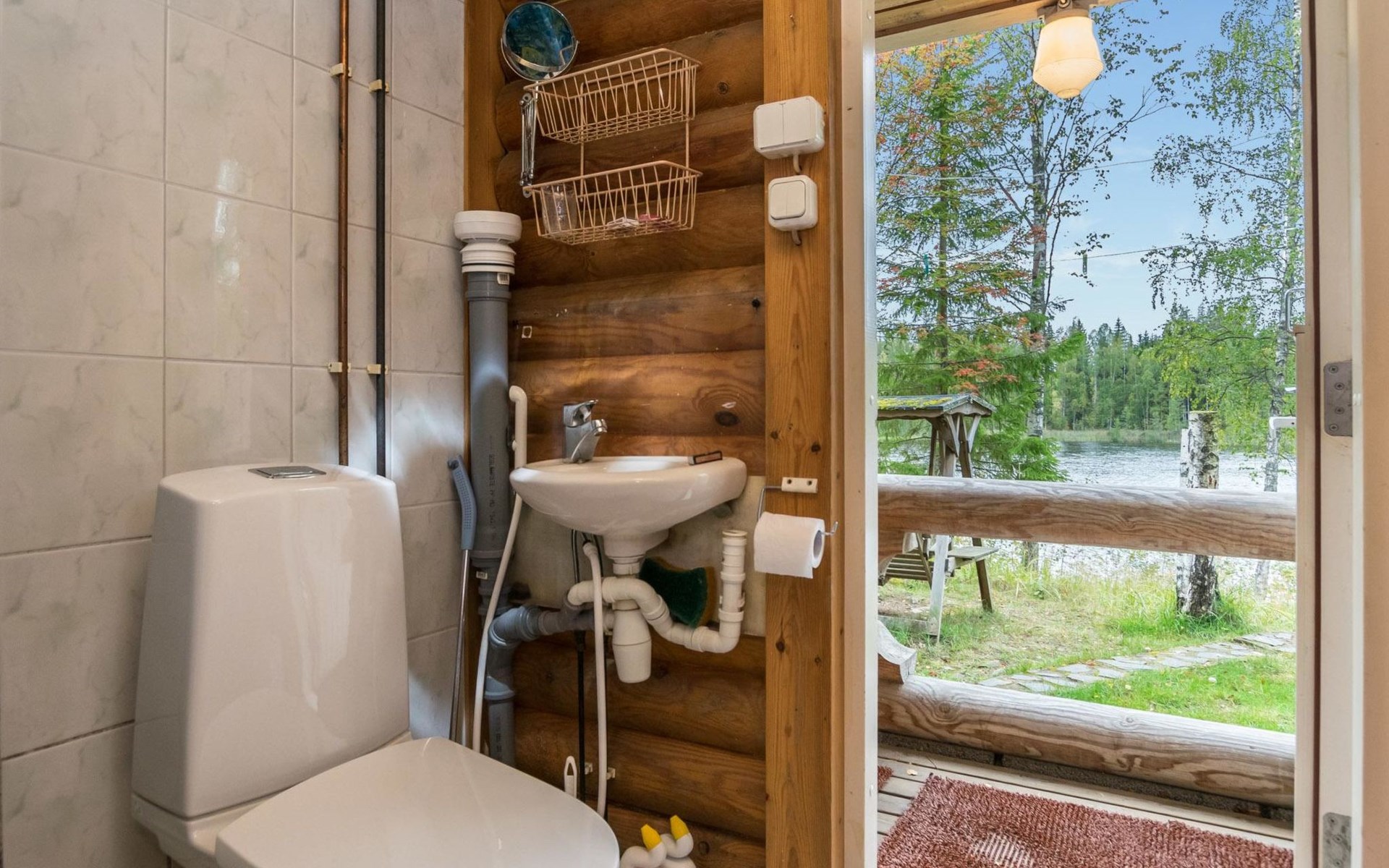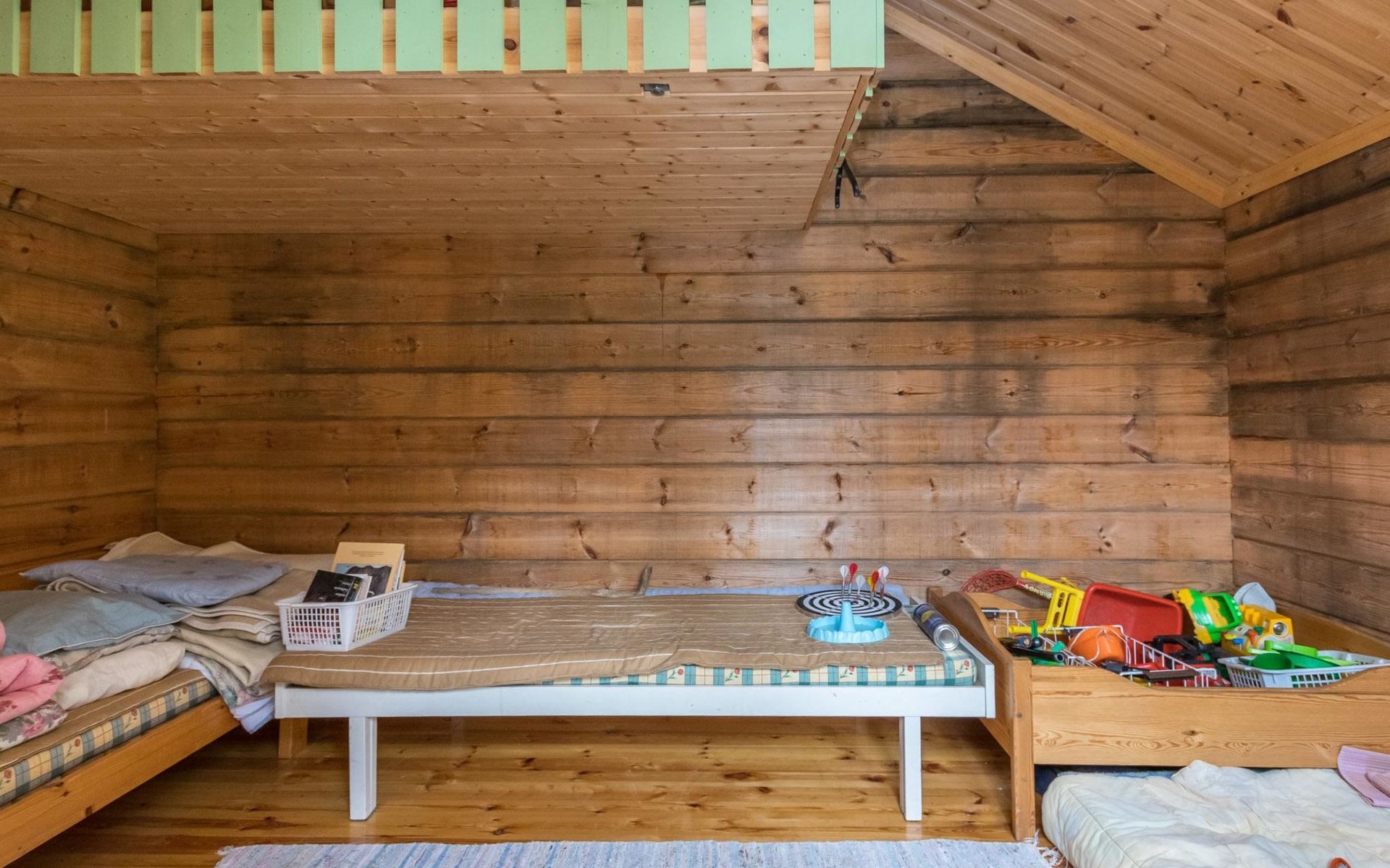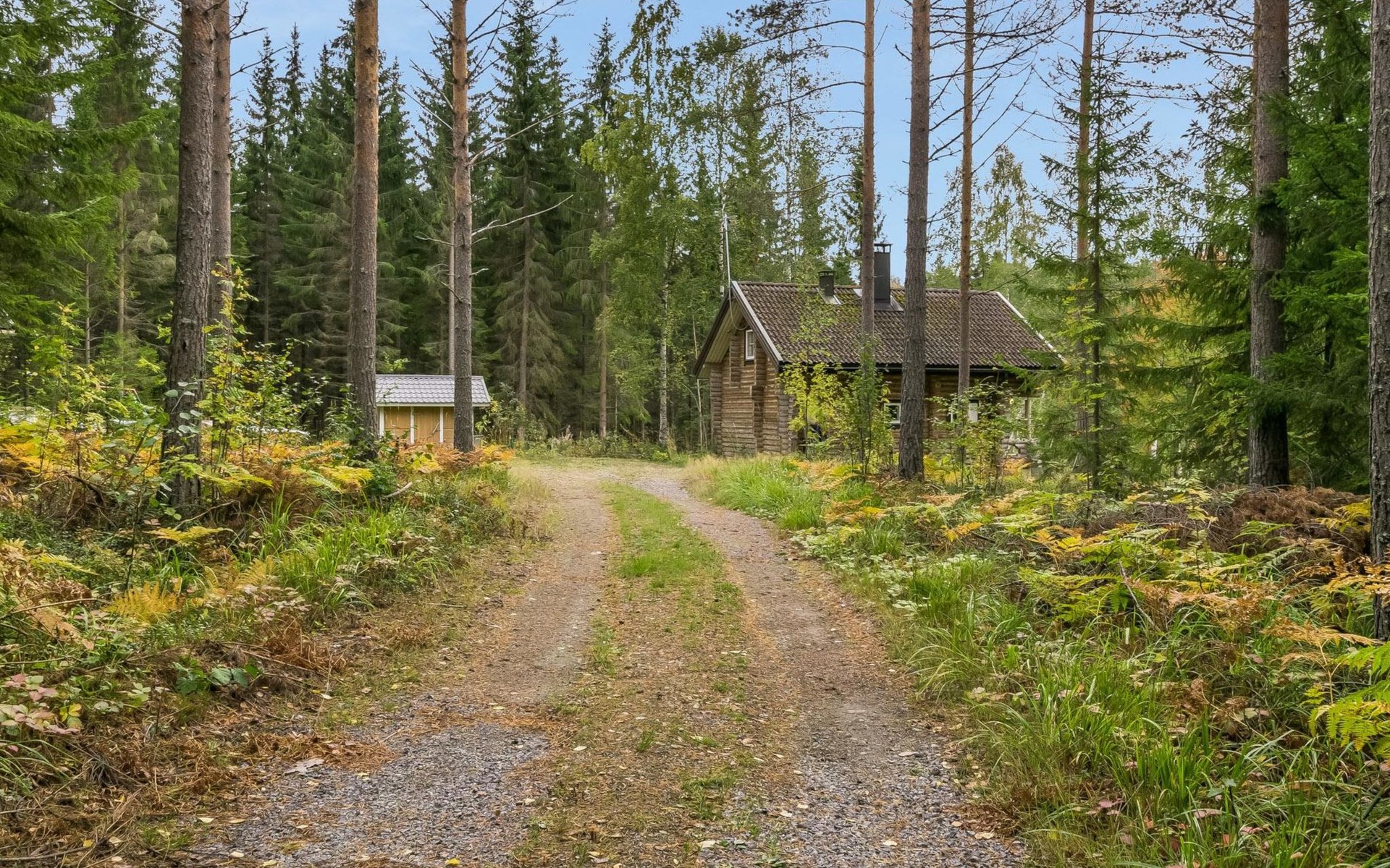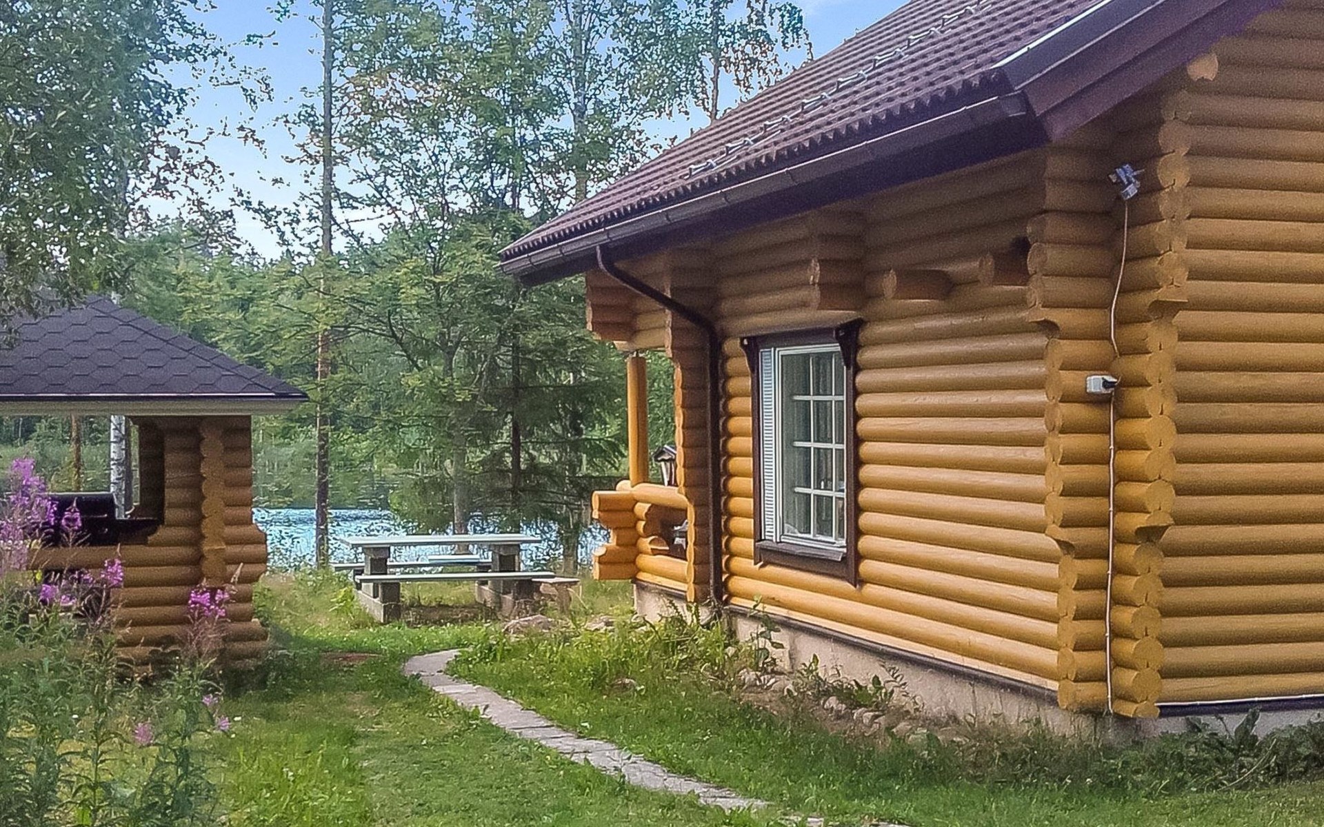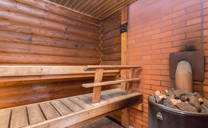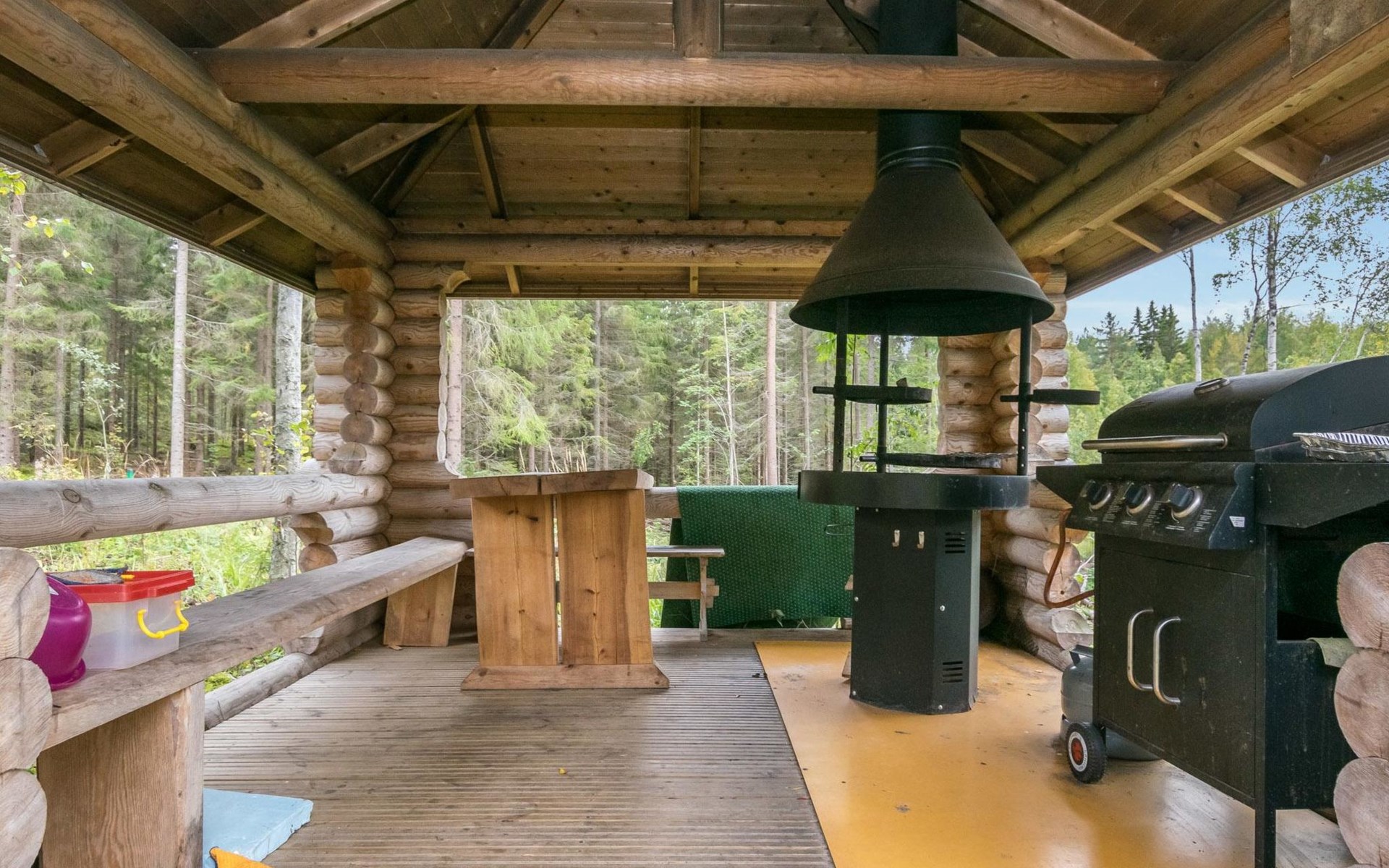 Log cabin, 1997, kitchenette, living room, sleeping loft with 2 double beds, sauna, washing room (toilet) access through porch, veranda.