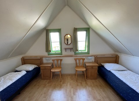 De eerste slaapruimte is voorzien van twee boxprings. In de tweede slaapruimte bevindt zich een stapelbed De badkamer is voorzien van toilet, wastafel en douche.