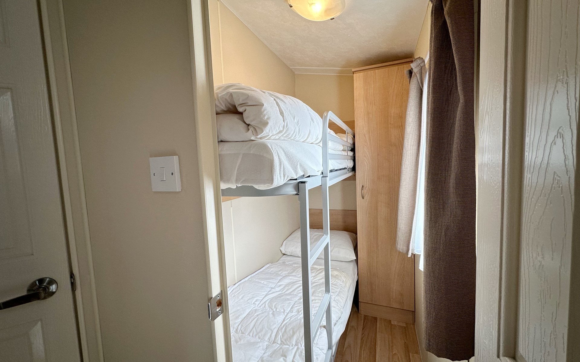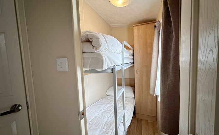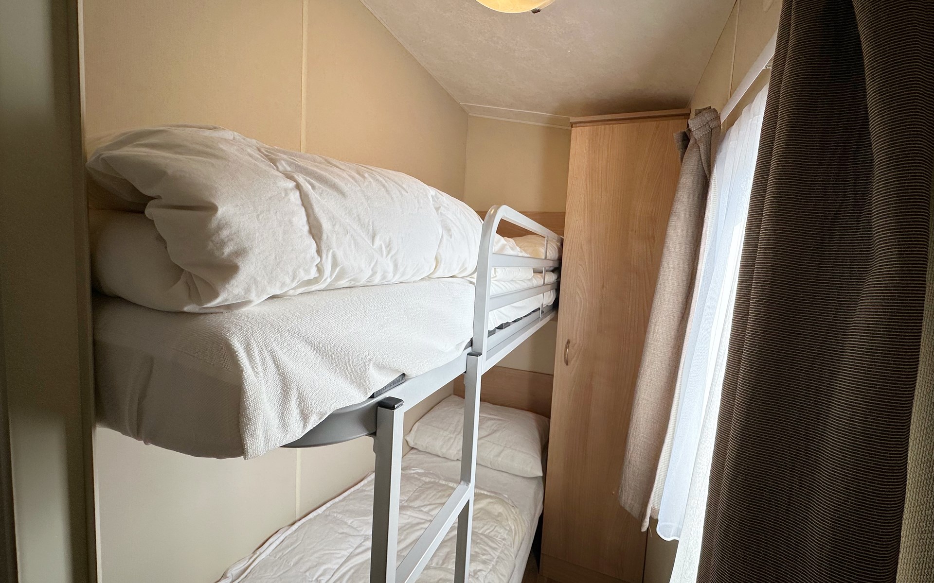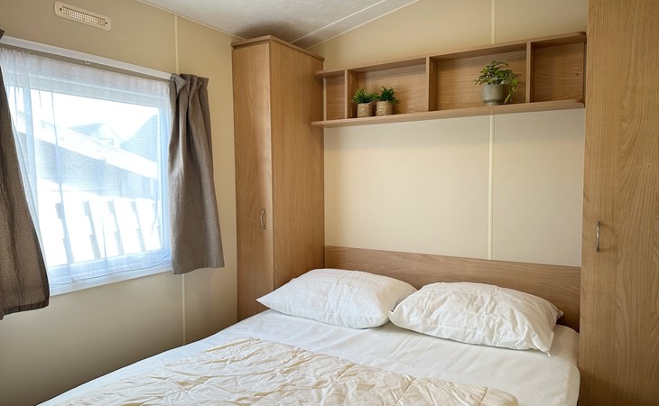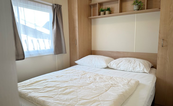 Dit knusse vintage chalet van 20m² biedt comfort met twee slaapkamers. Dit chalet is geschikt voor twee volwassenen met kleine kinderen. Vier volwassenen wordt afgeraden. In de grote slaapkamer staat een tweepersoonsbed, terwijl de tweede slaapkamer een stapelbed heeft.