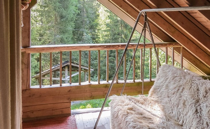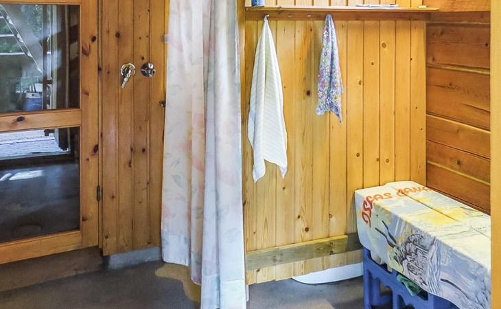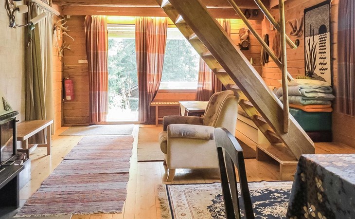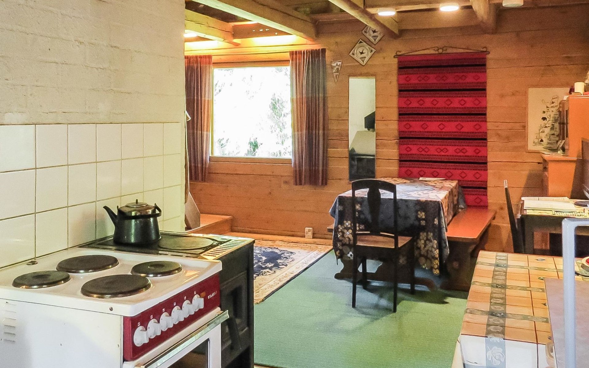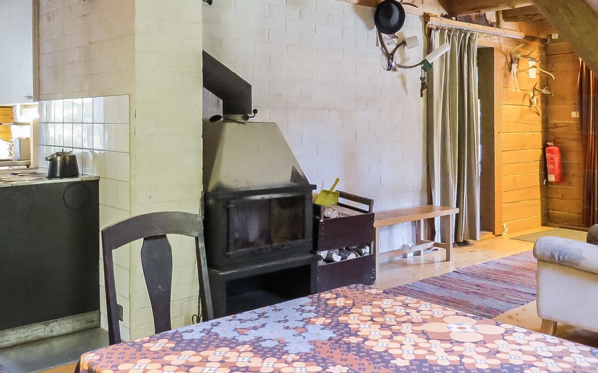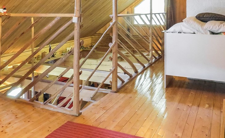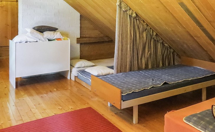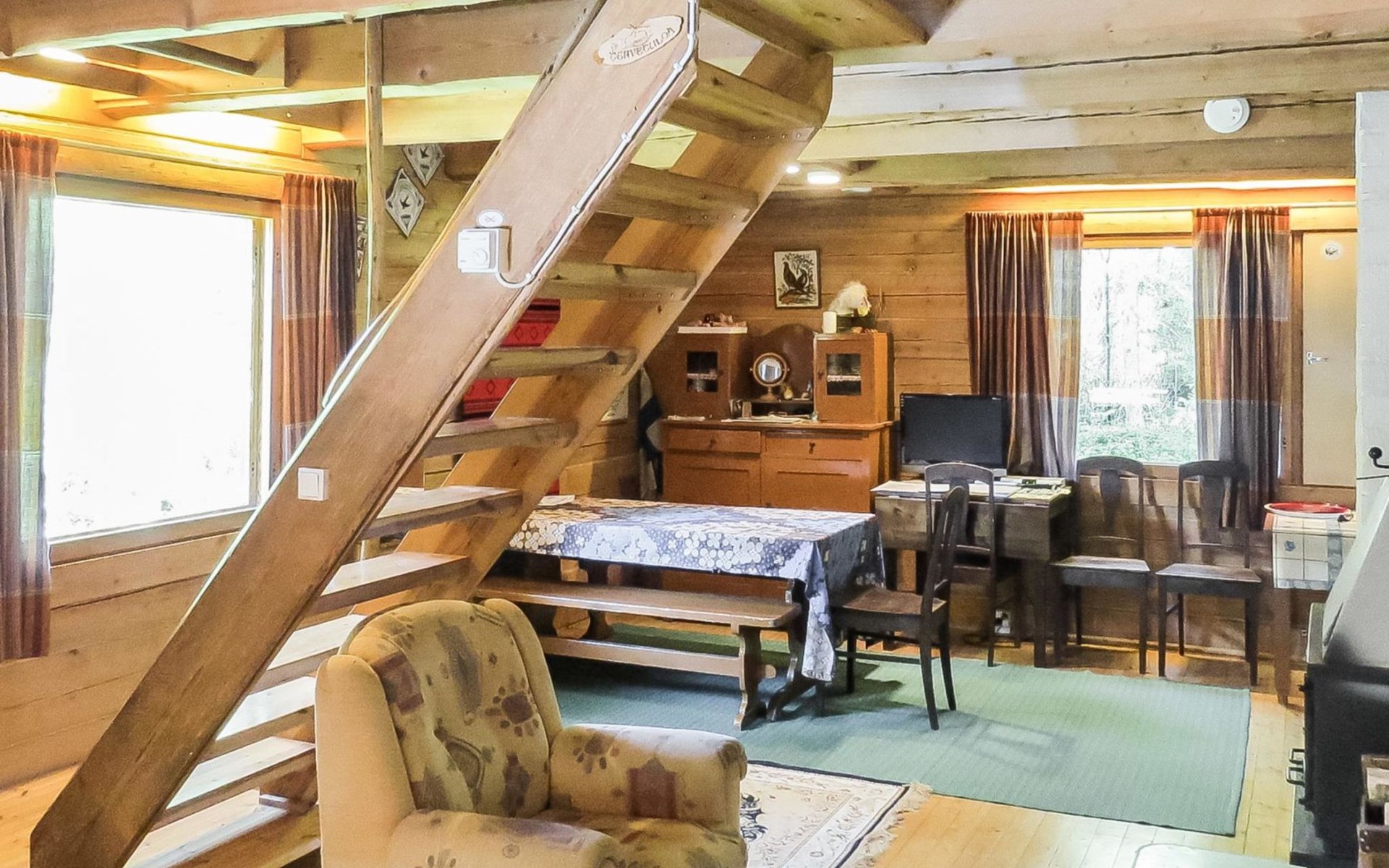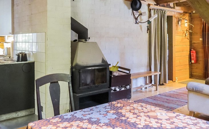 Log cabin 1994, living-room/kitchen with 2 extra beds, alcove with 2 beds, sleeping loft 2+2 beds, alcove in the loft with 2 beds, dressing room (electric toilet), sauna, open veranda and balcony. The cottage has a metal fireplace.