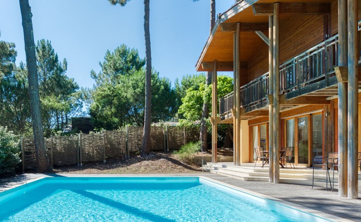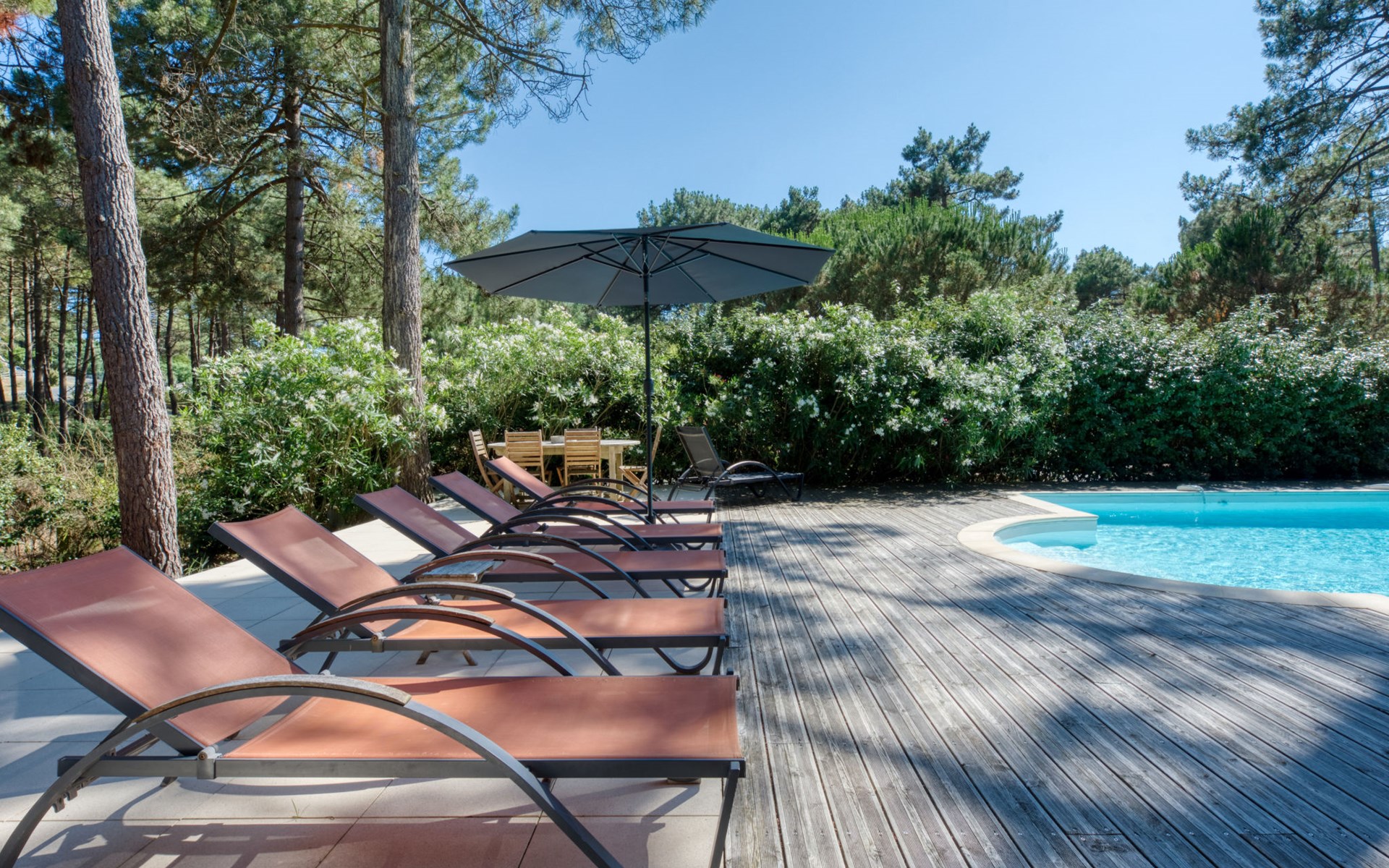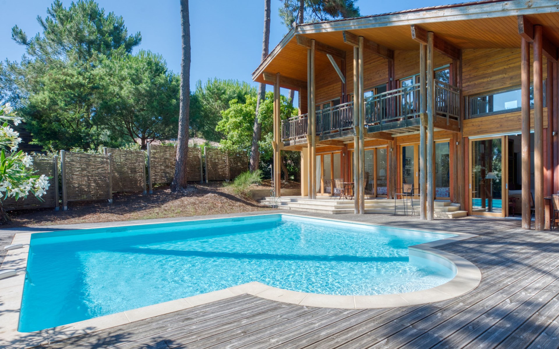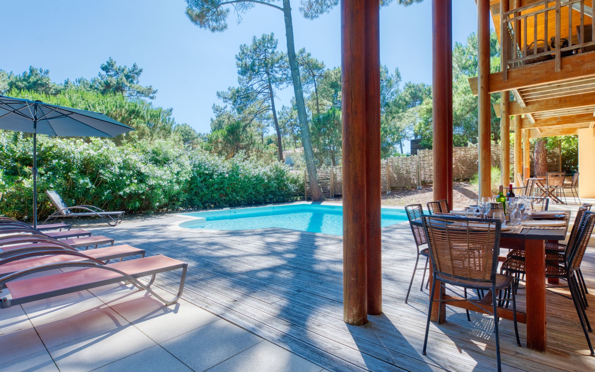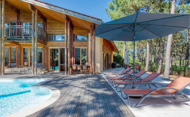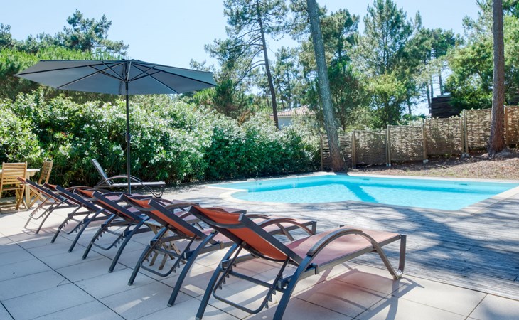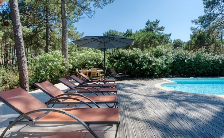 Groot, mooi villa "La Lisière des Pins", bouwjaar 2013. 2.5 km van het centrum van Lacanau-Océan, 12 km van het centrum van Lacanau-Ville, 55 km van het centrum van Bordeaux, in een woonwijk, 2 km van zee, 2 km van het strand, aan een doodlopende weg. Voor alleengebruik: wild terrein 850 m2 (omheind) met bomen, openluchtzwembad (7 x 7 m, 160 - 200 cm diepte, seizoensgebonden beschikbaarheid: 26.Apr. - 27.Sep.) met alarminstallatie. Buitendouche, terras, tuinmeubelen. In het huis: tafeltennis, tafelvoetbal. Parkeerplaats (voor 2 auto's) bij het huis op het terrein. Supermarkt 2 km, zandstrand "Plage Lacanau Sud" 2 km, meer (zwemmen) "Lacanau Le Moutchic" 5.5 km. Golfterrein (18 holes) 2 km, surfschool 2 km, manege 1 km. De eigenaar accepteert geen groepen. De eigenaar accepteert geen jeugdgroepen. De omgeving is gevoelig voor geluidsoverlast. Gelieve geen lawaai te maken en de rust te bewaren.