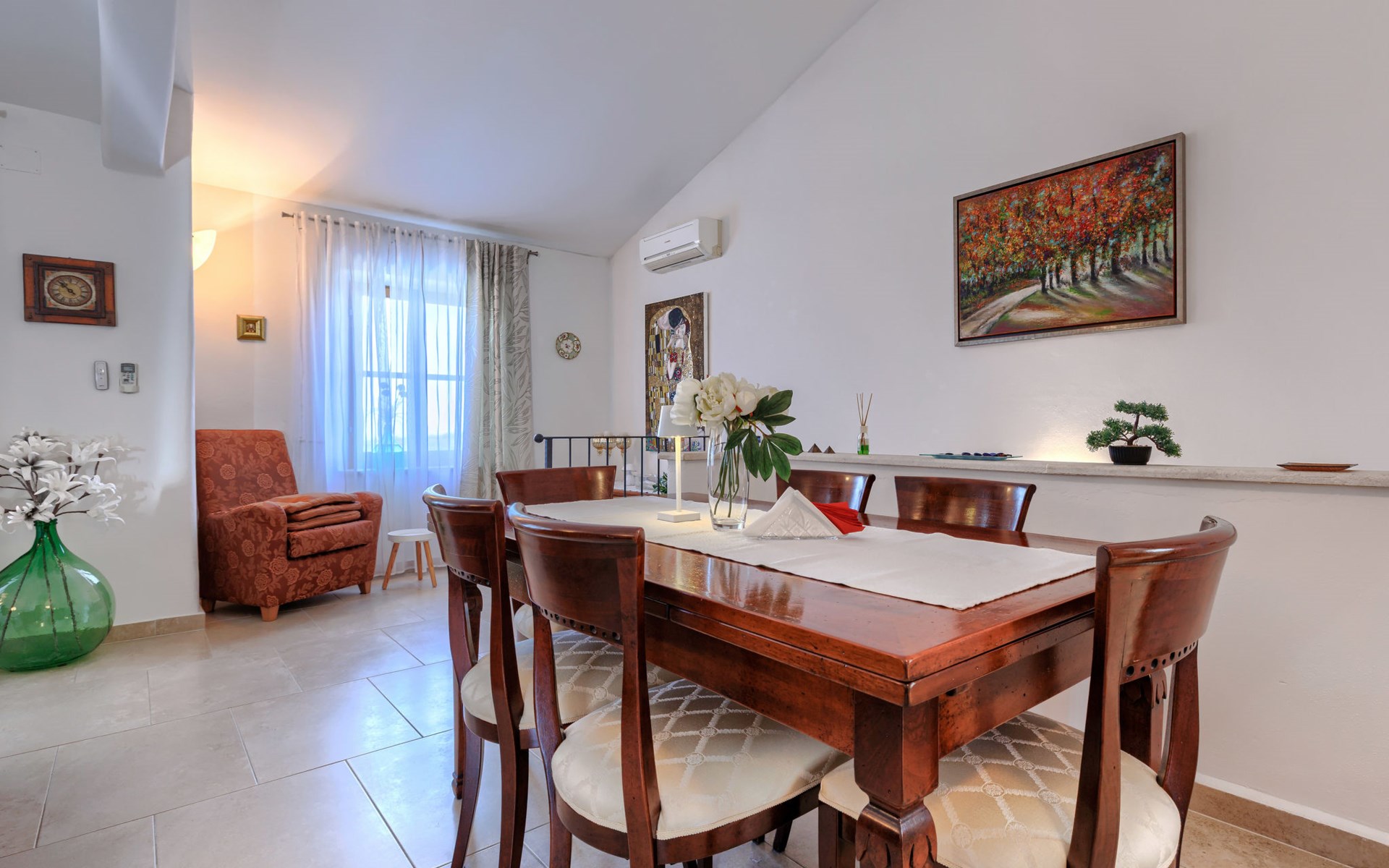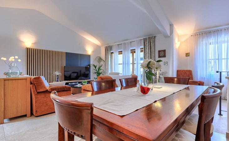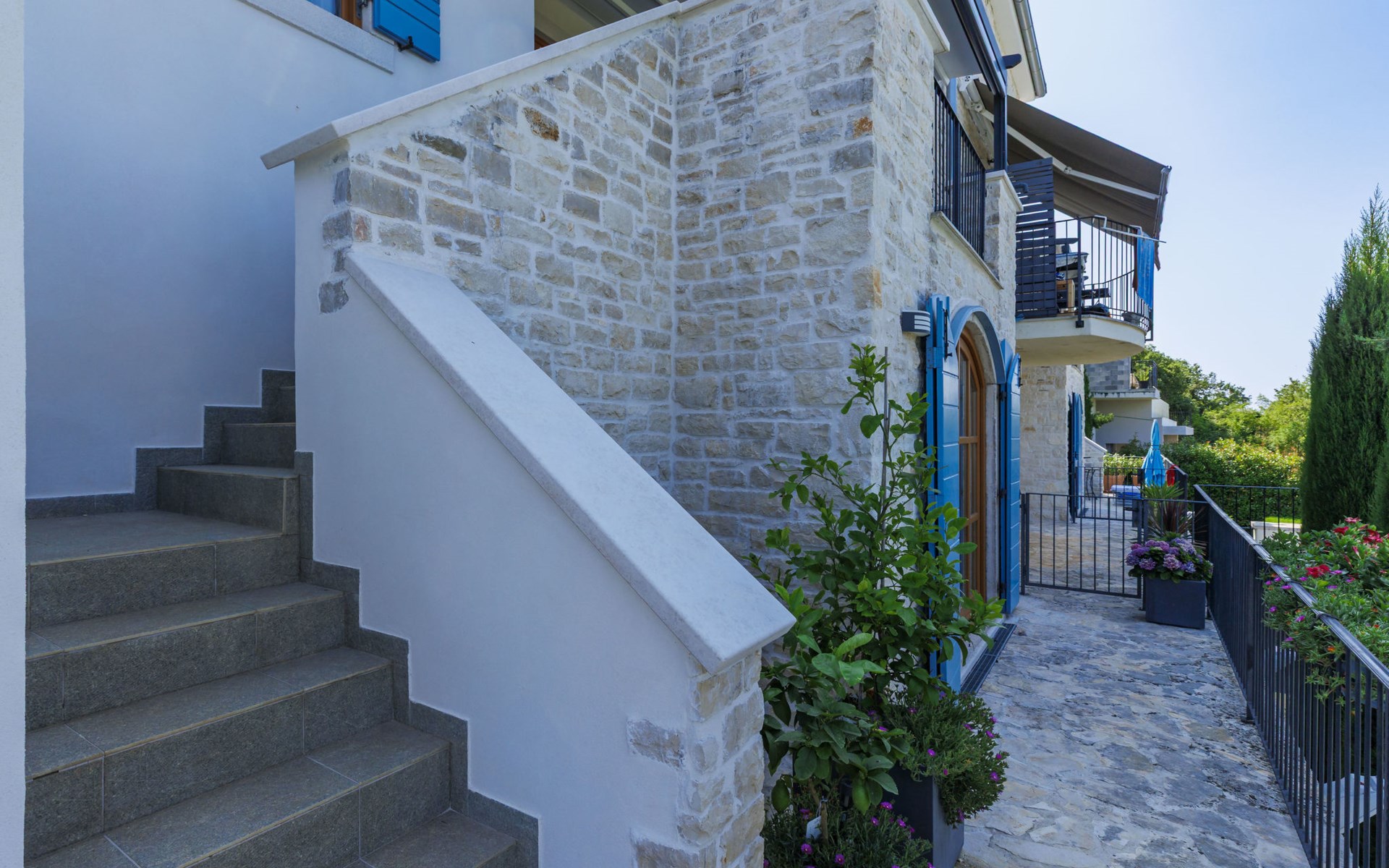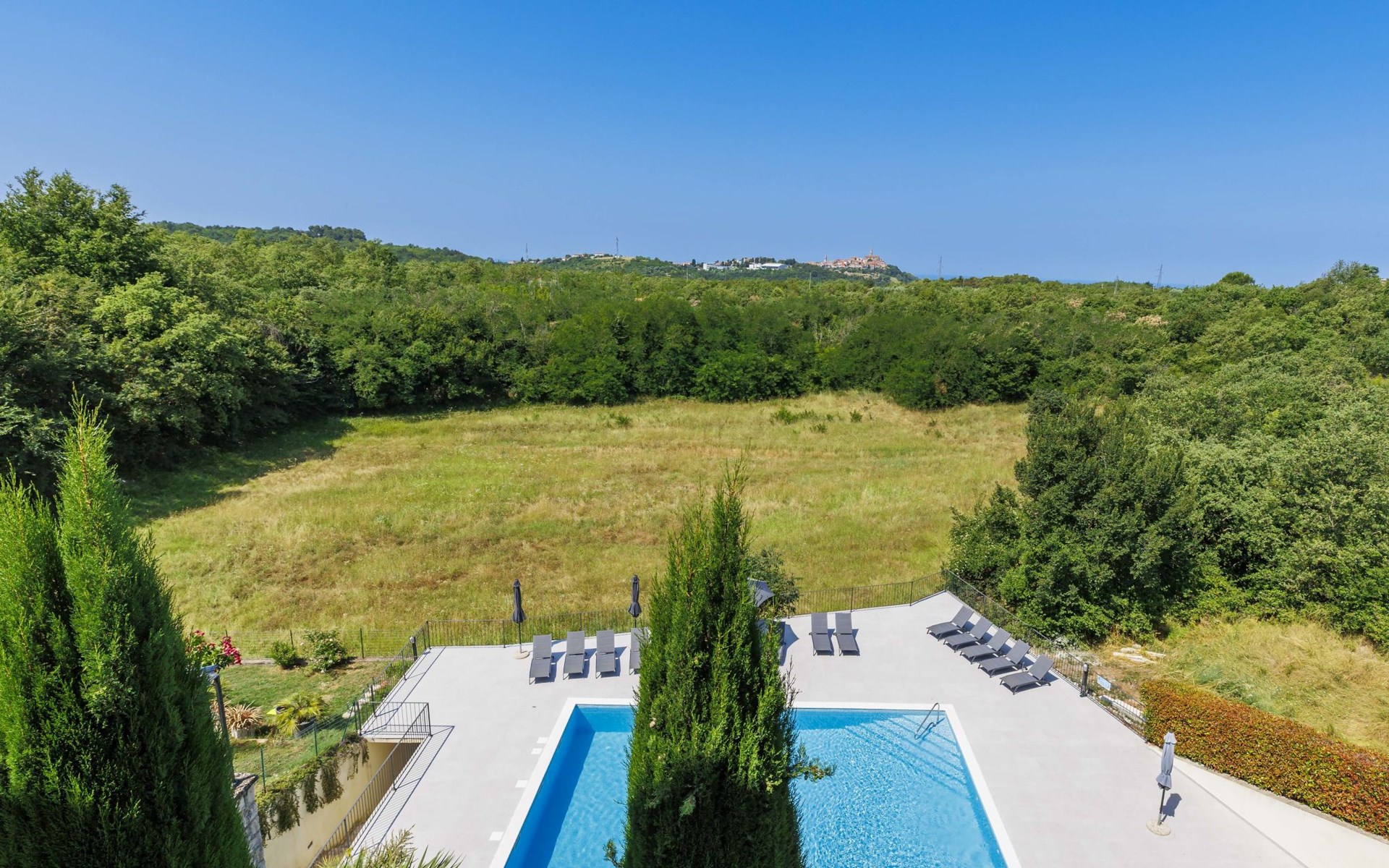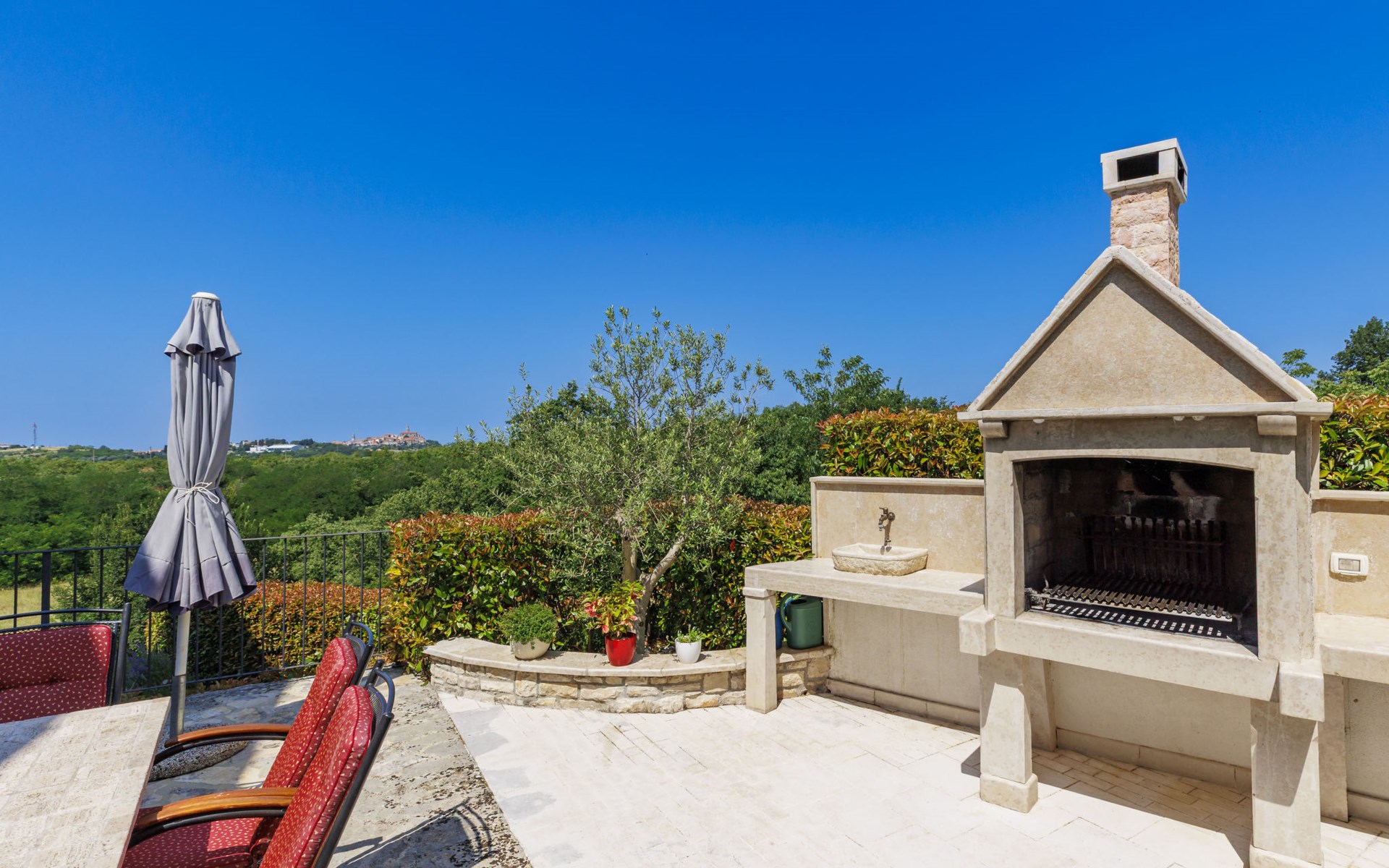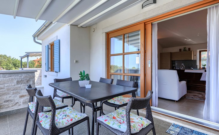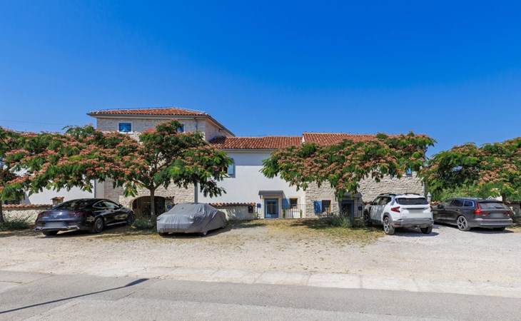 Mooi rijtjeshuis "Bibali", van 2 verdiepingen. In het gehucht Bibali, 2 km van het centrum van Buje, rustige, zonnige ligging tegen een helling, 12 km van zee. Voor medegebruik: terrein 2.000 m2 (omheind), tuin, openluchtzwembad hoekig (11 x 8 m, 100 - 150 cm diepte, seizoensgebonden beschikbaarheid: 15.Apr. - 15.Okt.) met trap. Buitendouche. In het huis: internetaansluiting, wasmachine, droger. Parkeerplaats bij het huis op het terrein. Winkel 2 km, restaurant 2 km, bushalte 2 km, treinstation 28 km, kiezelstrand 12 km. Golfterrein (18 holes) 17 km, tennis 1 km, manege 5 km, wandelroutes 1 km vanaf het huis, fietspad 1 km. De omgeving is gevoelig voor geluidsoverlast. Gelieve geen lawaai te maken en de rust te bewaren.