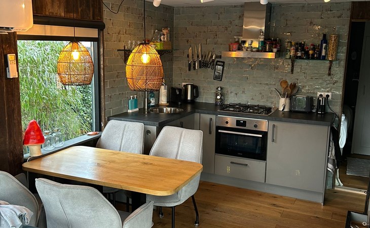 Het chalet is perfect voor twee volwassenen en eventueel één of twee kleine kinderen. De sfeervolle woonkamer is uitgerust met een luxe open keuken, voorzien van alle moderne gemakken: een vaatwasser, combi‑magnetron/oven en een Nespresso koffiemachine.