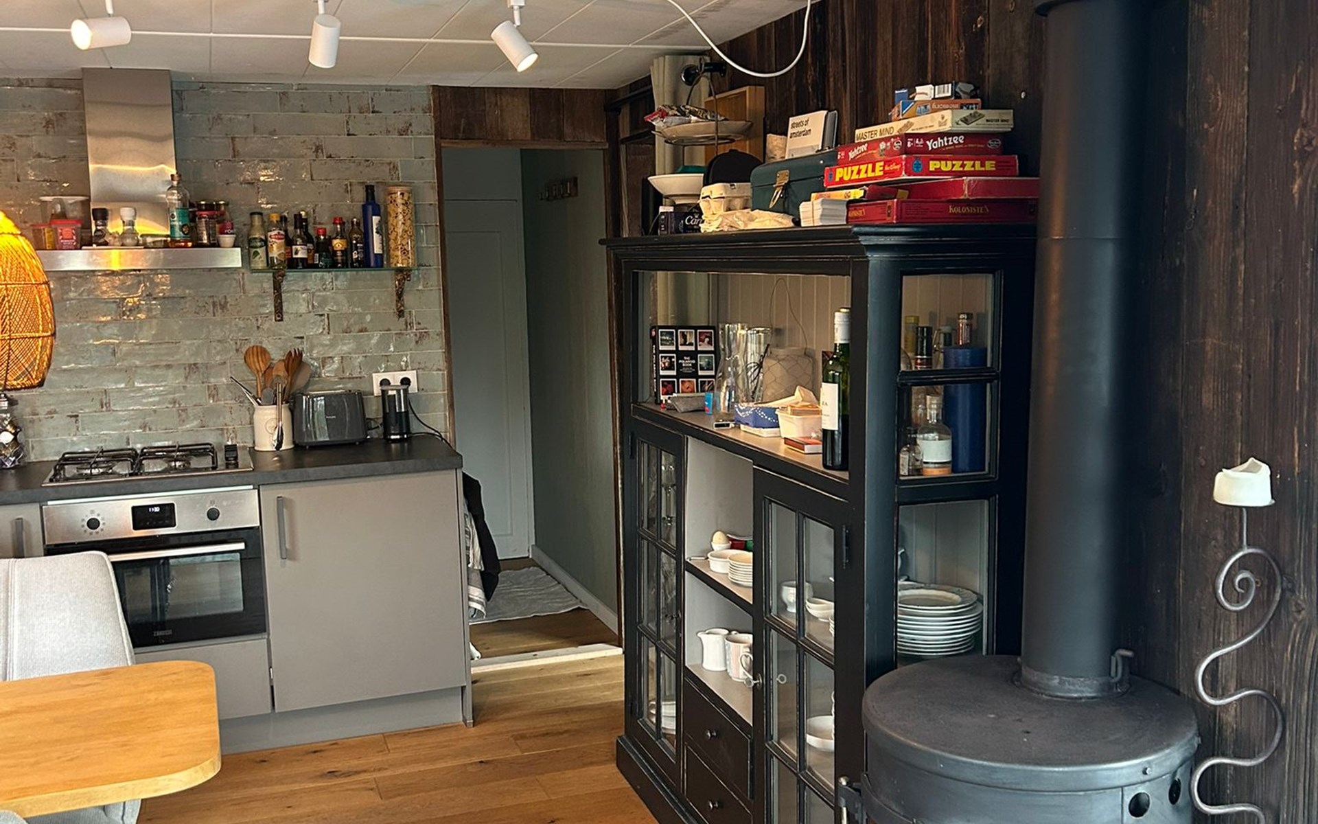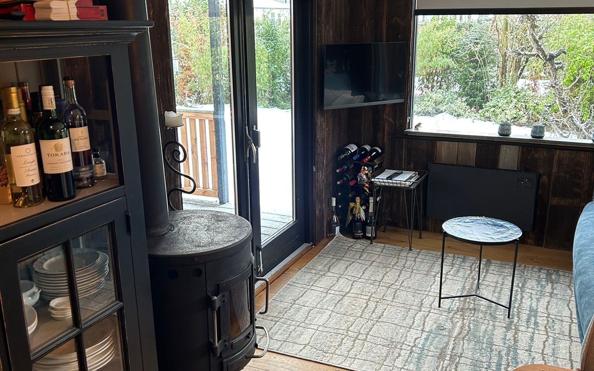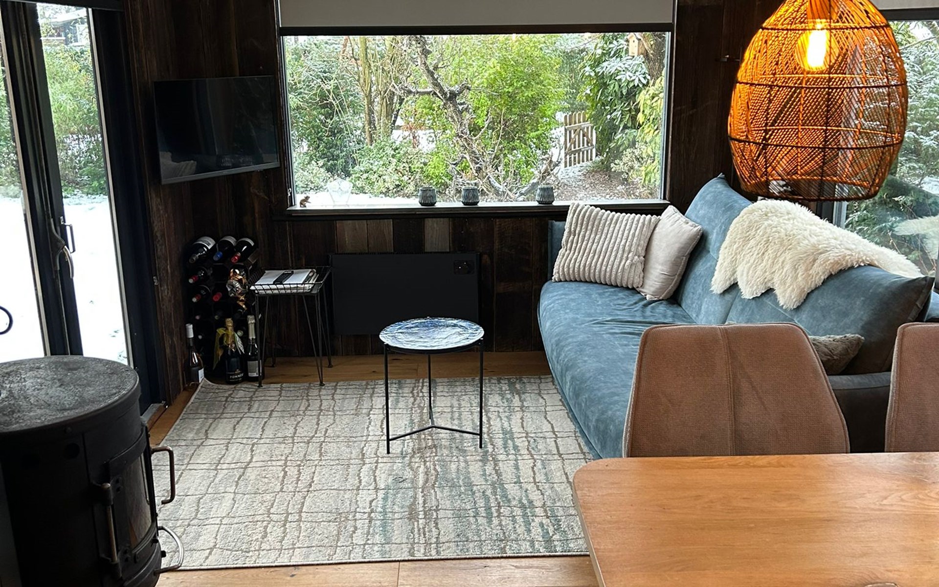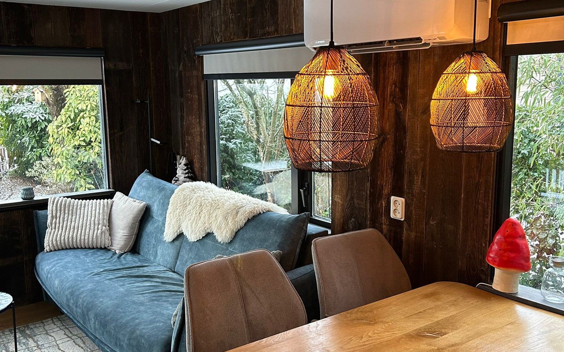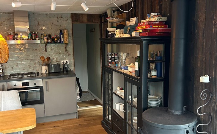 De comfortabele slaapbank biedt een slaapplek voor twee kinderen en de houtkachel zorgt voor warmte én een gezellige ambiance.