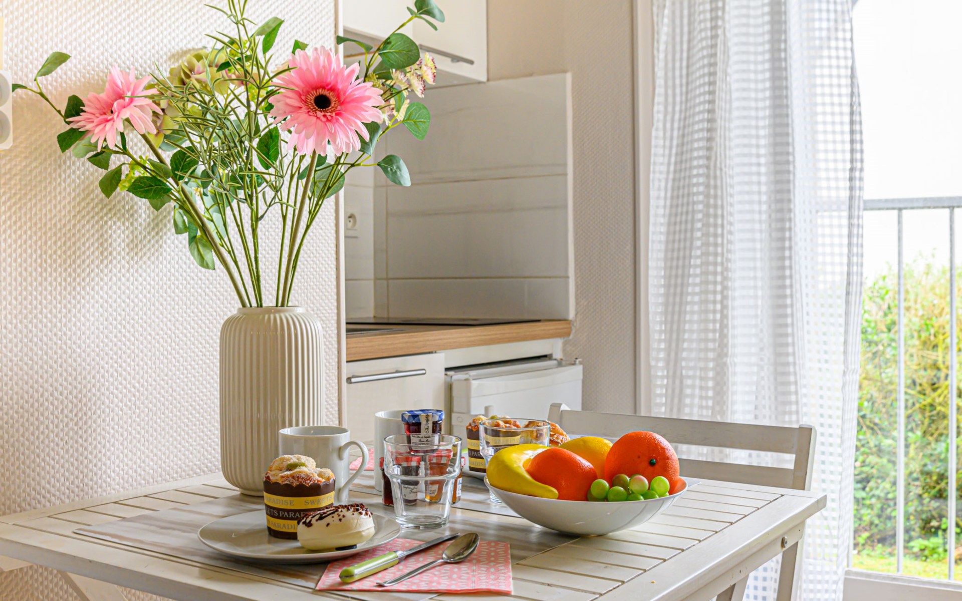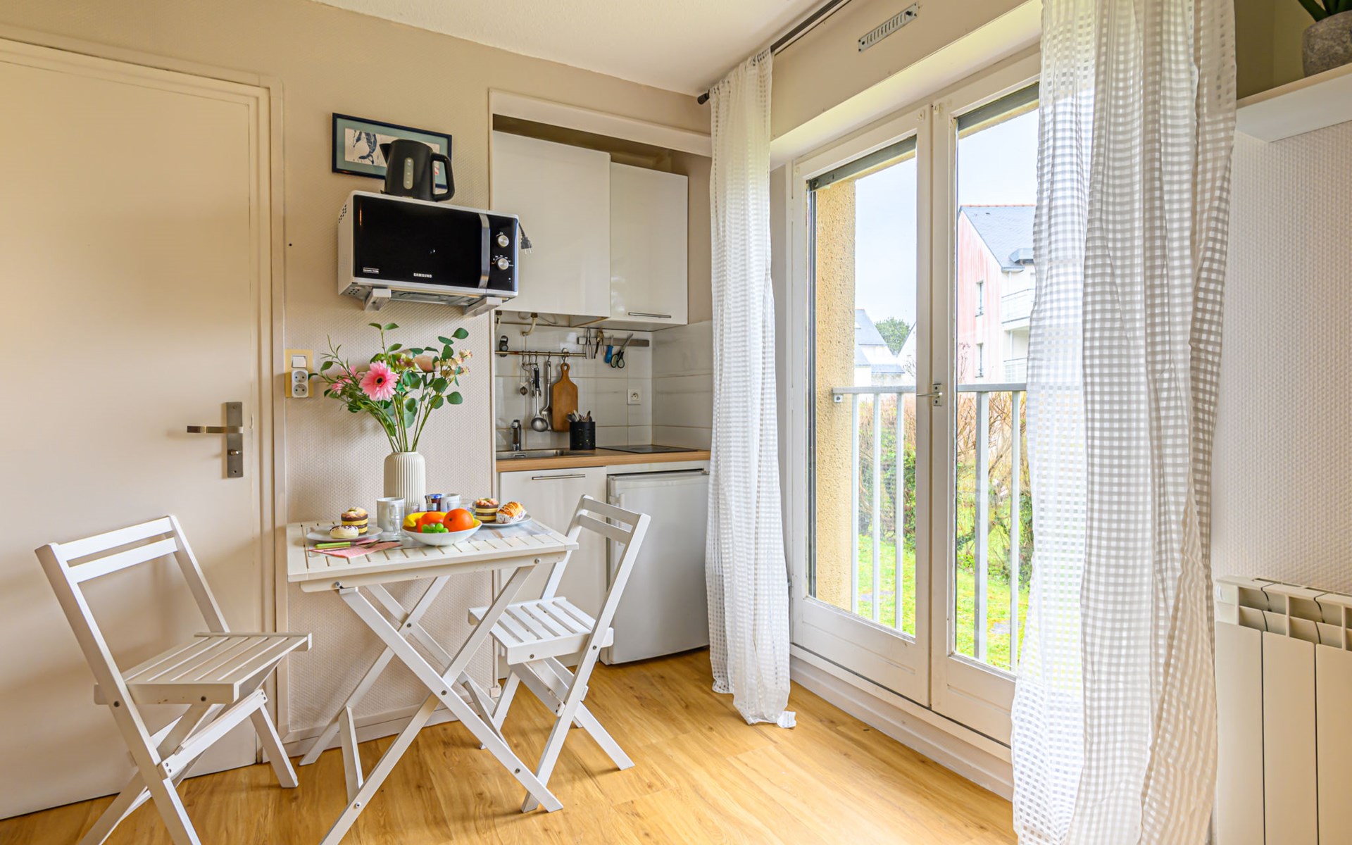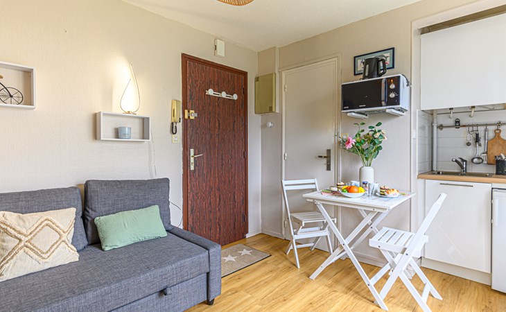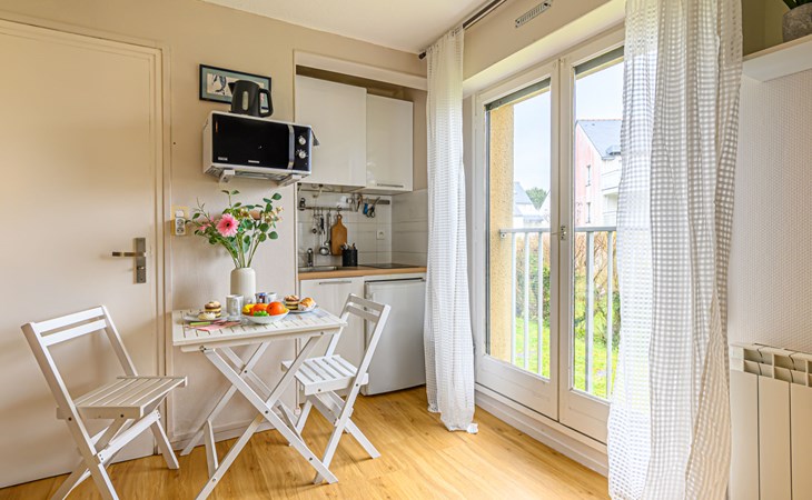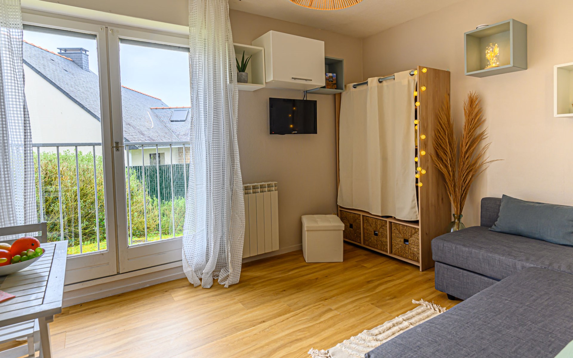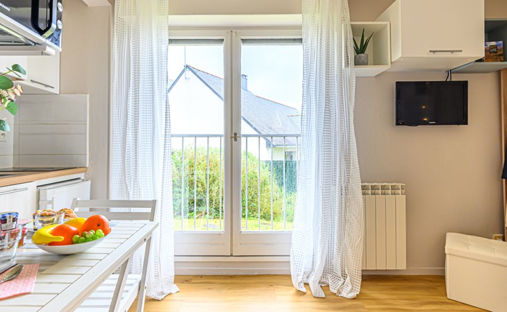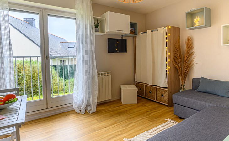 Flatgebouw "Rose des Vents". In de plaats, 1.5 km van het centrum, 500 m van zee, op het zuidoosten. Openbare parkeerplaatsen in de straat. Levensmiddelenwinkel 1.5 km, restaurant 1.5 km, station 1.5 km, thermaalbad "thalasso" 200 m. Jachthaven 1.8 km, golfterrein (9 holes) 1 km, tennis 100 m. Attracties in de buurt: Alignements de Carnac 21 km, La Trinité-sur-Mer 30 km, Vannes 47 km. De sleuteloverdracht vindt plaats bij het agentschap Interhome in Quiberon, 1 km.