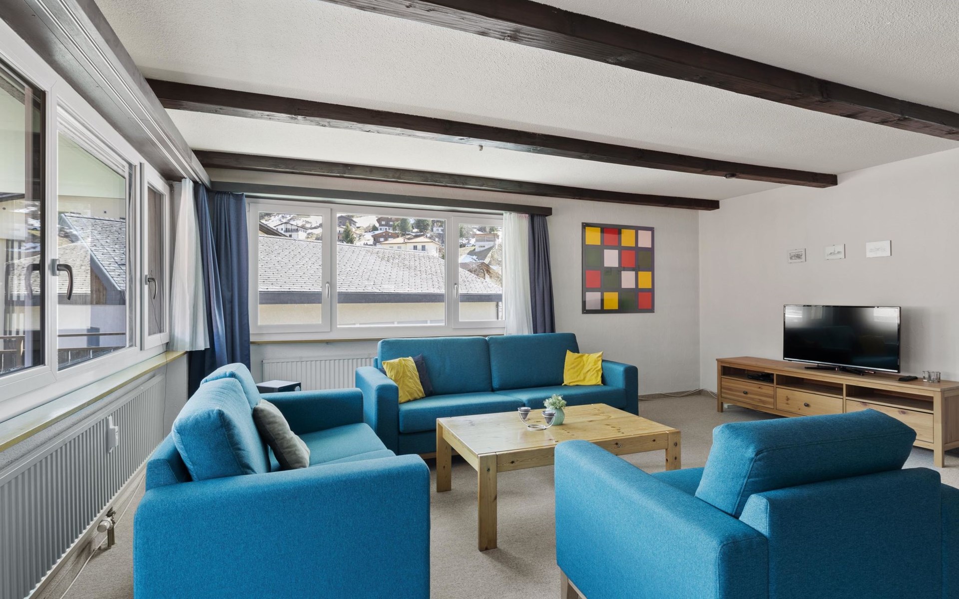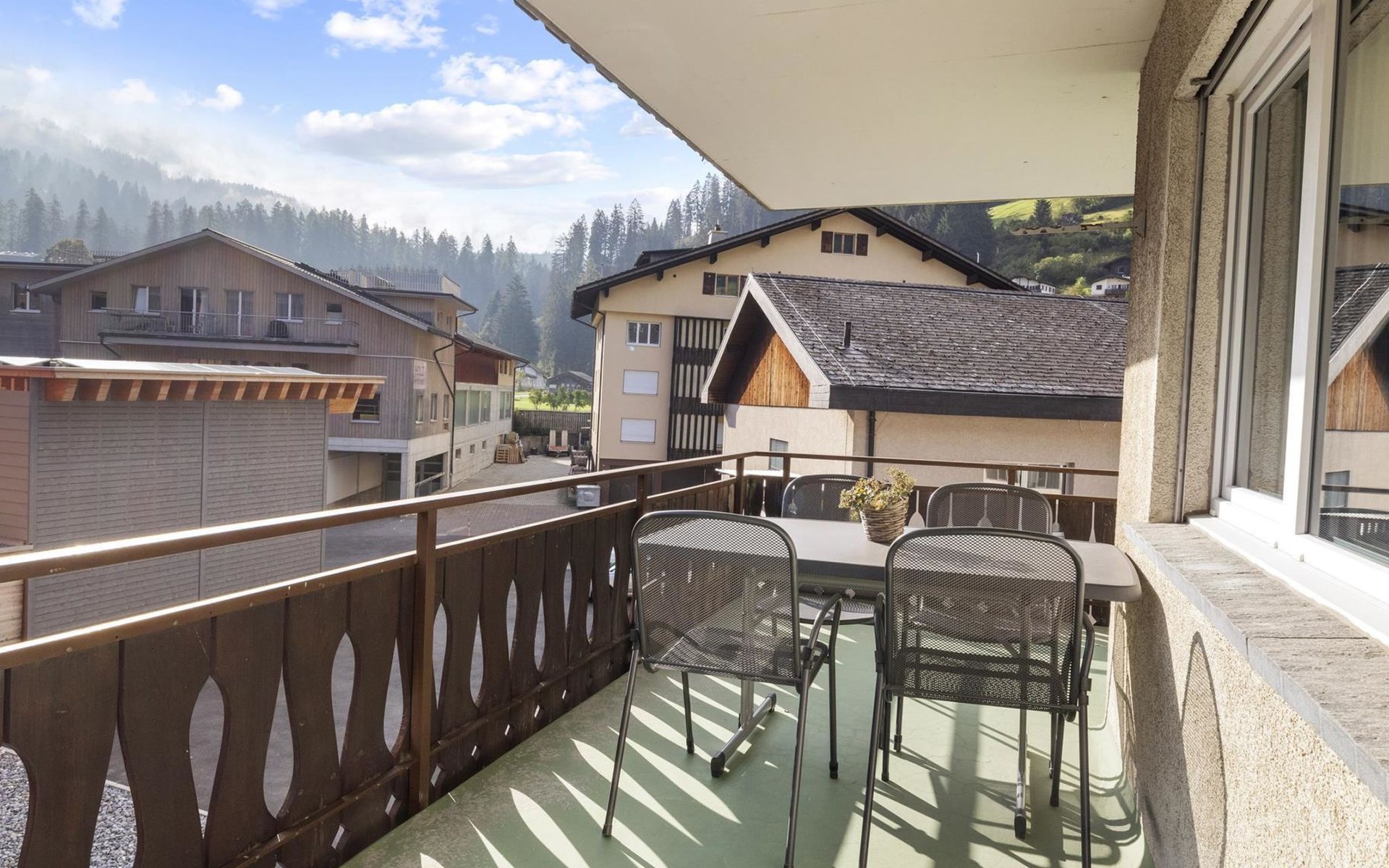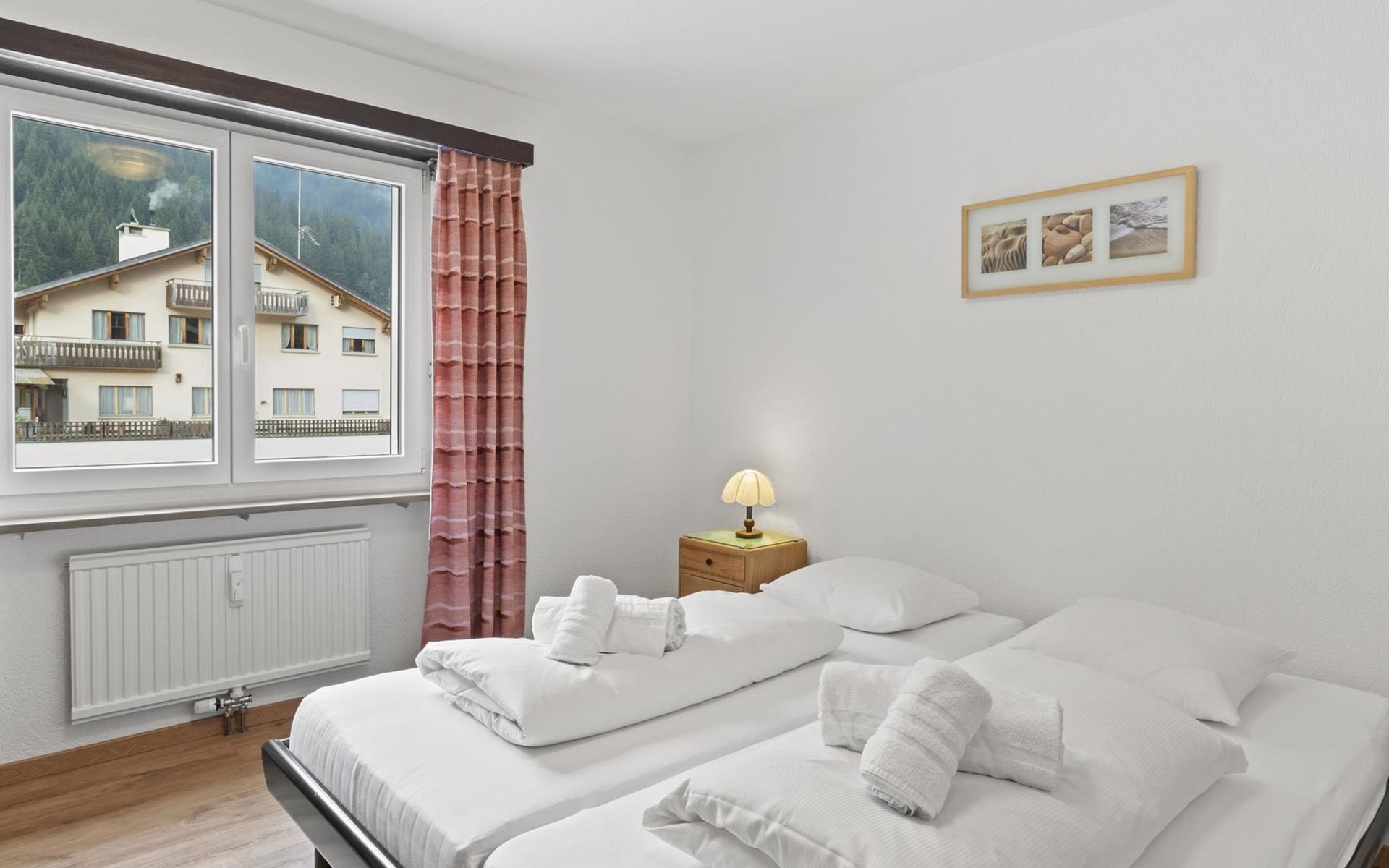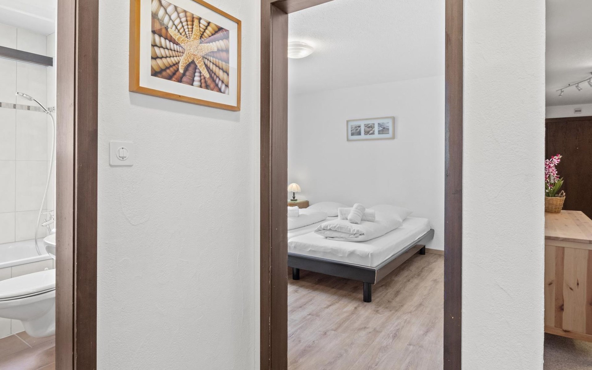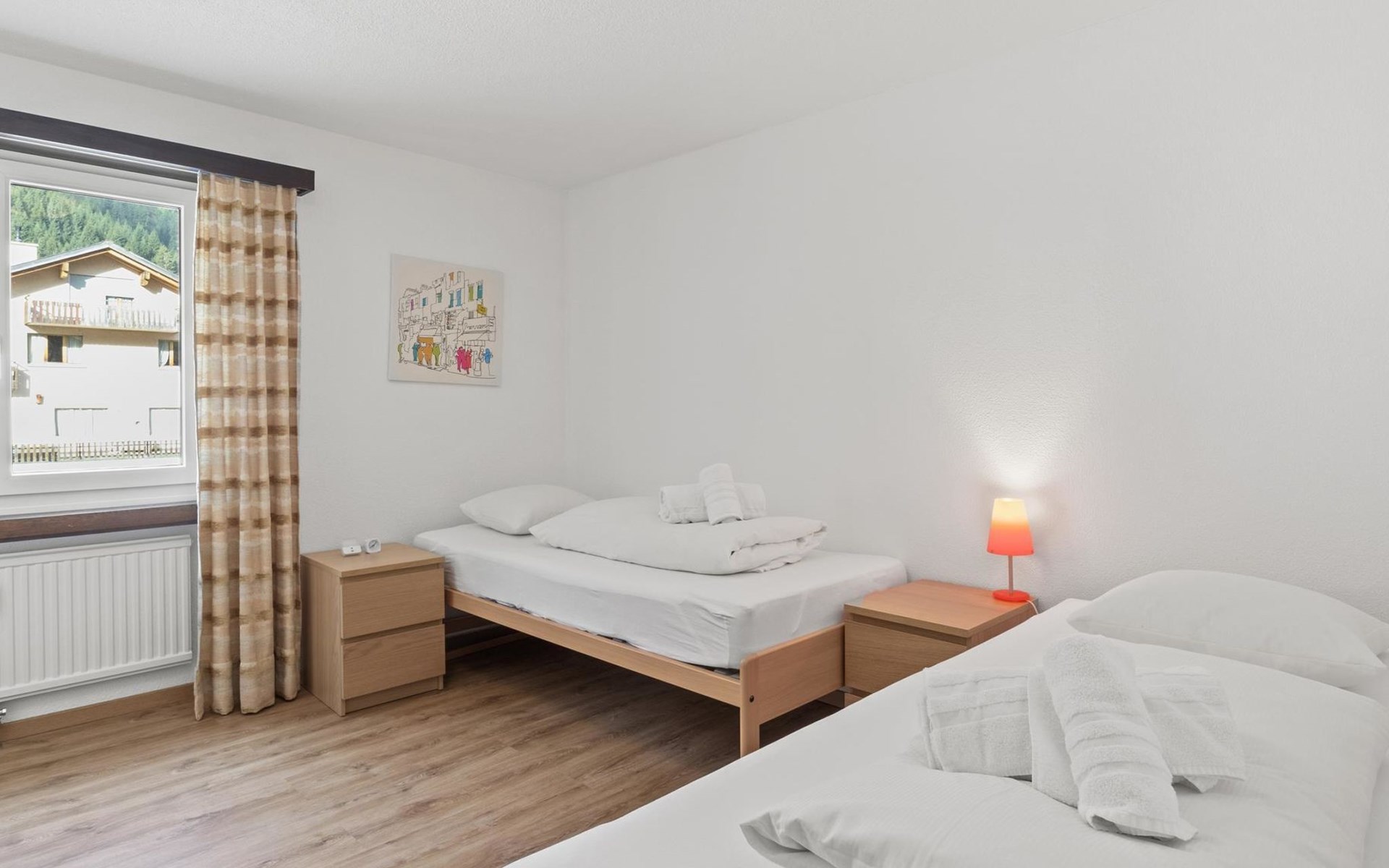 2nd floor / Lift / Wifi yes / 2 rooms with double beds / 1 room with two single beds / 1 bathroom with WC and shower / 1 bathroom with WC and bathtub.The shopping facilities Coop and Migros, as well as the sports shop and the mountain railways are in the immediate vicinity. In summer, the heated outdoor swimming pool is only a few steps away from the house. (In the same house as the holiday flats Zondler and Lang)