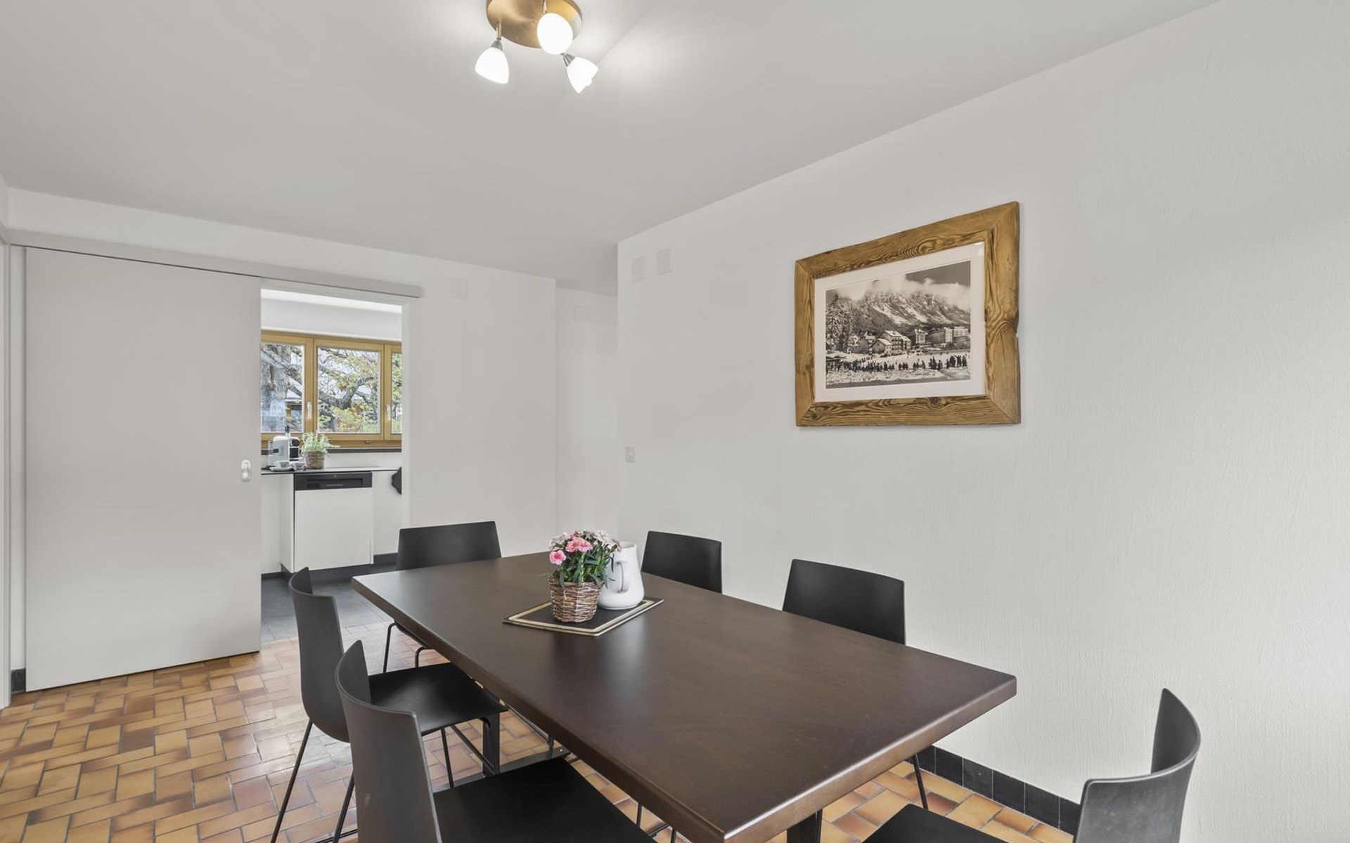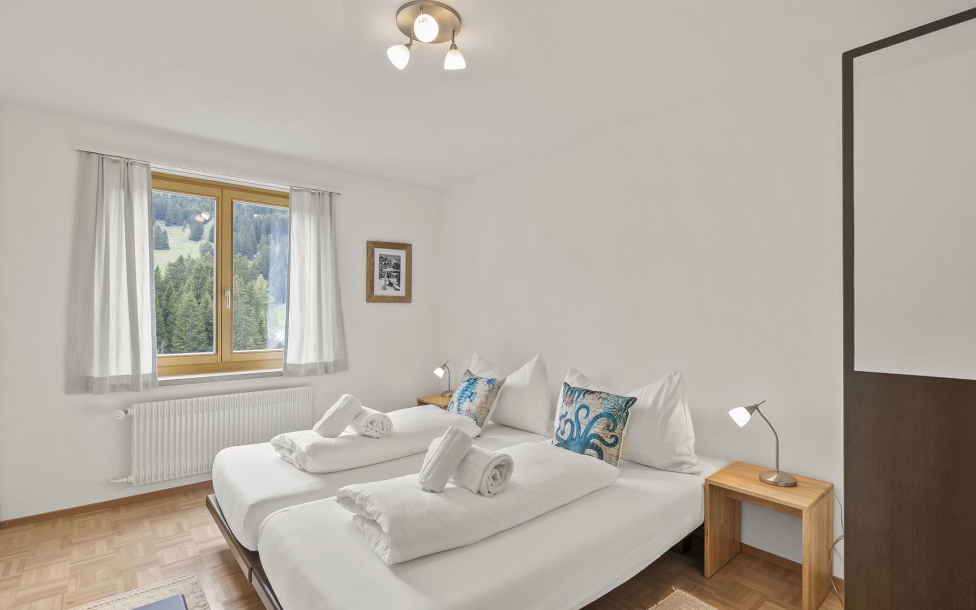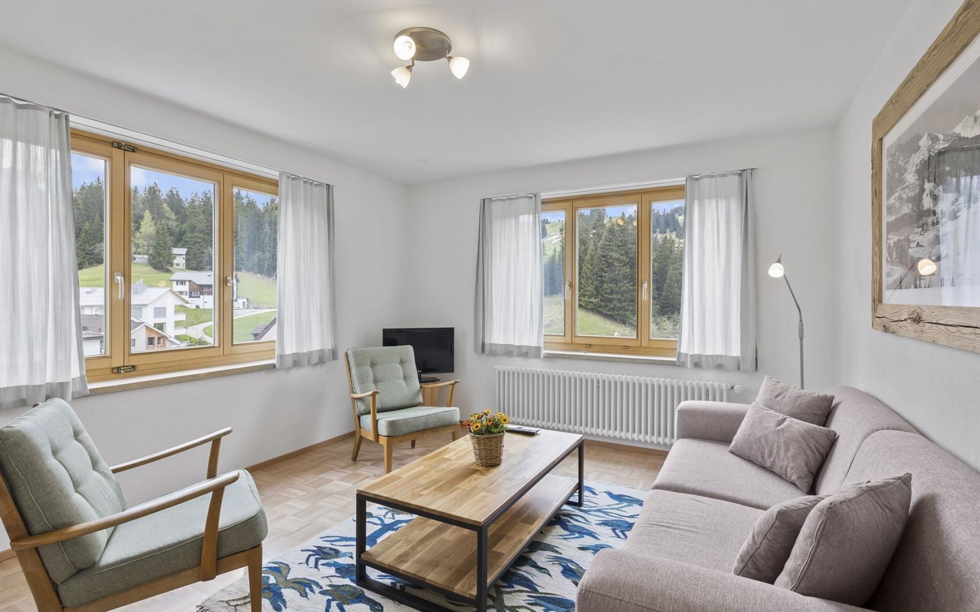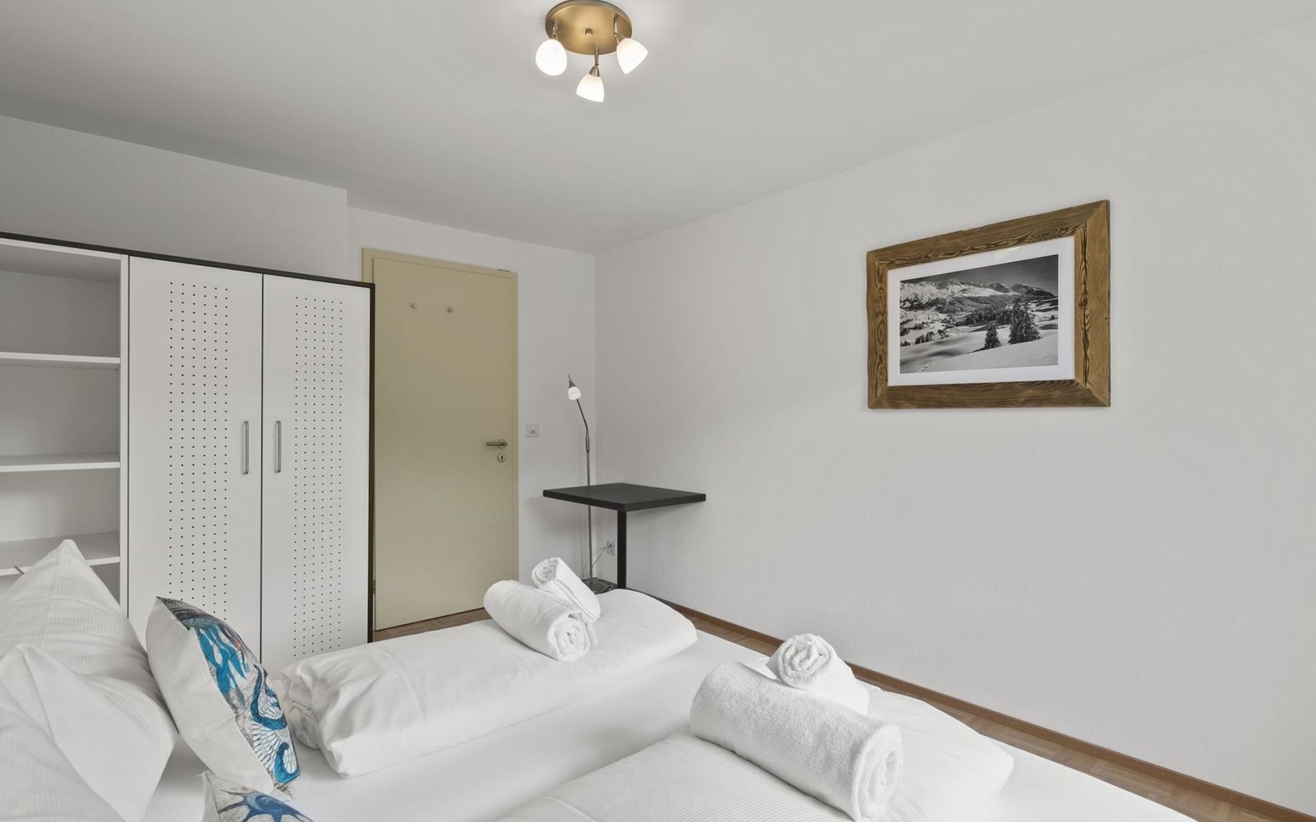 1 upper floor / no lift / Wifi yes / 2 bedrooms with double beds / 1 bedroom with two single beds / 1 bathroom with WC and shower. The flat is located in the village centre near the church. Also, a good starting point for hikes or bike tours and in winter for the skiing area of Lenzerheide. (The Bellavista 4 holiday flat is in the same house).