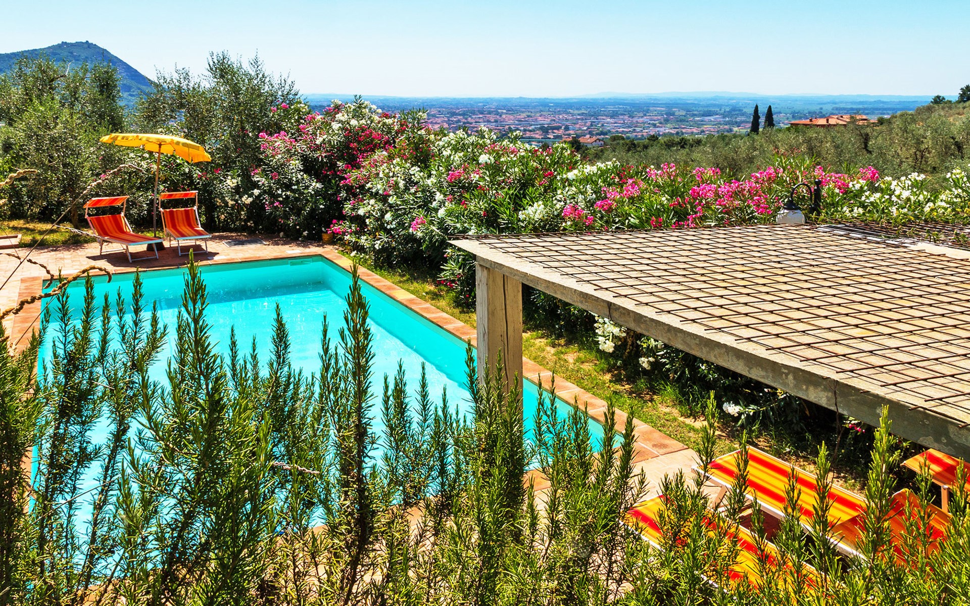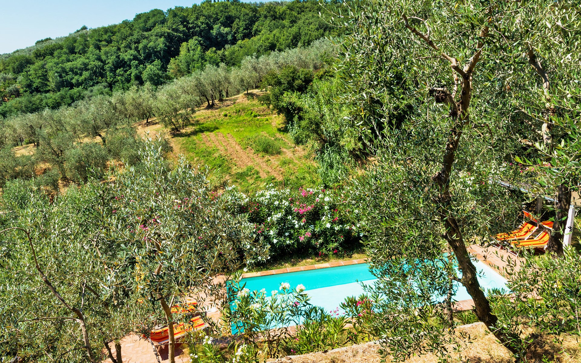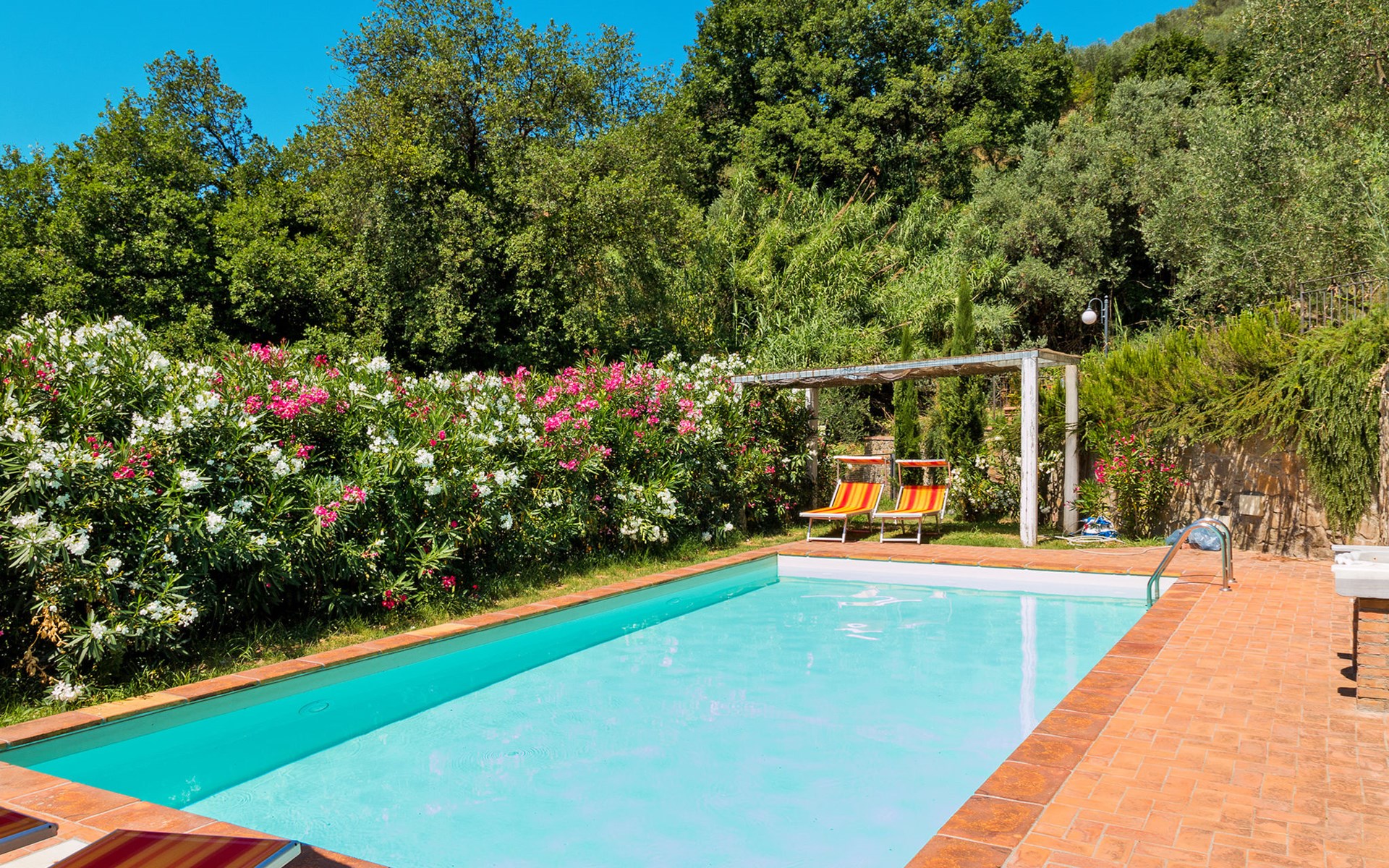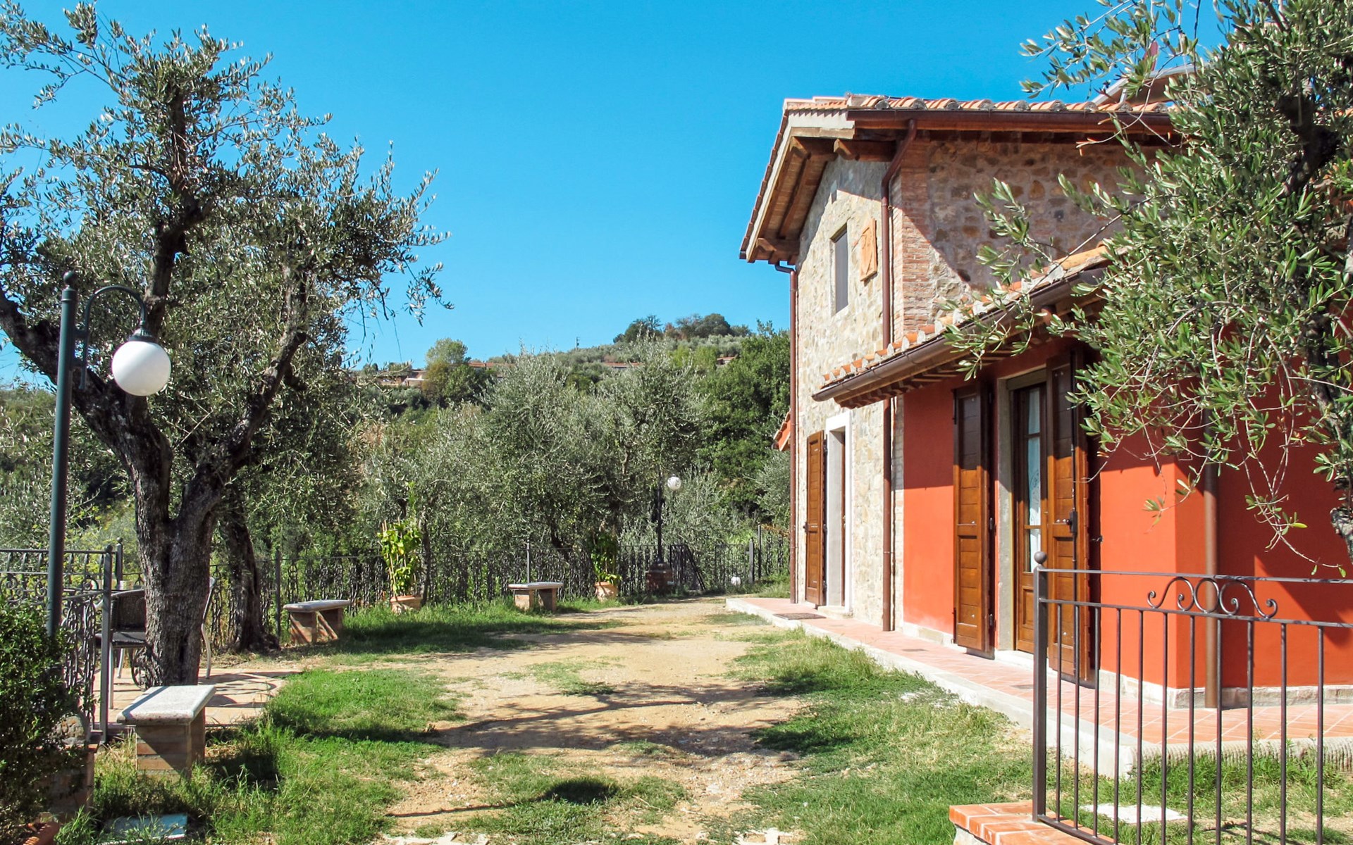 Mooi, rustieke, comfortabel landhuis "Iacopo", 150 m boven zeeniveau, omgeven door bomen en velden. 4 km van het centrum van Montecatini Terme, 30 km van het centrum van Lucca, 50 km van het centrum van Firenze, geïsoleerde, zonnige ligging tegen een helling, 55 km van zee, te midden van groen. Voor medegebruik: tafeltennis. Voor alleengebruik: groot tuin op verschillende niveaus, 2 ha met planten en bomen, wilde tuin, openluchtzwembad omheind (9 x 4 m, 110 - 150 cm diepte, seizoensgebonden beschikbaarheid: 25.Apr. - 15.Okt.). Buitendouche, patio, terras, tuinmeubelen, onderhoud zwembad door de eigenaar/tuinman. In het complex: sauna, stoombad, hot tub (alles extra). 400 m lange smalle toegangsweg (200 m onverharde weg). Parkeerplaats op het terrein. Levensmiddelenwinkel 600 m, supermarkt 1.5 km, restaurant 200 m, bushalte 3 km, treinstation "Montecatini Terme" 4 km, zandstrand "Lido di Camaiore" 55 km. Golfterrein (18 holes) 10 km. Lokale verkoop van streekproducten. Let op: De Spa bevindt zich in de boerderij op ongeveer 300 m. hoogte. Restaurant op de boerderij een dag per week geopend.