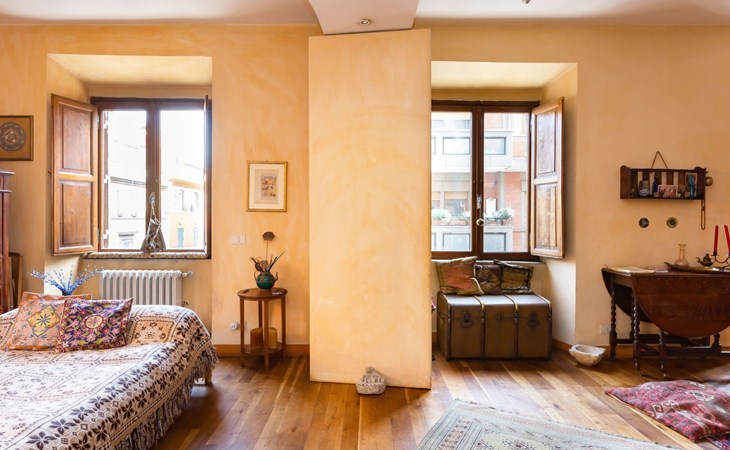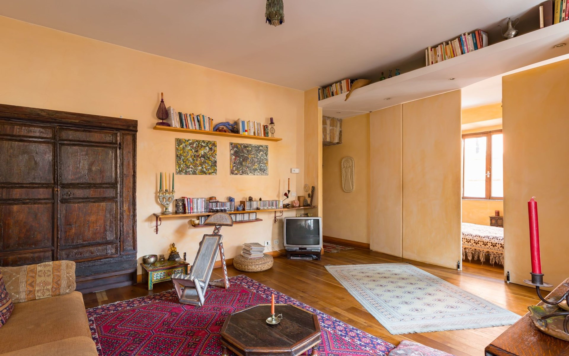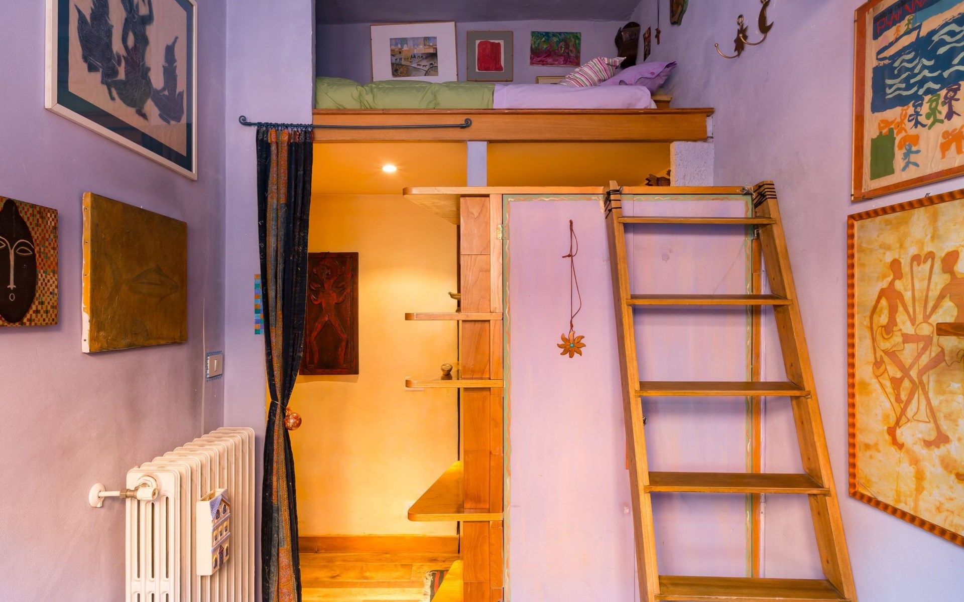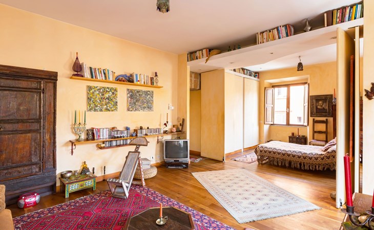 The Celio is a typical Roman quarter in the historic centre. The Colosseum is only a few metres away and is well connected by public transport. The Colosseum metro station is only 300 metres away.We are in the heart of history and you will not need public transport to reach Rome's main attractions.This bohemian-style house, with many windows, is very bright and has been built with natural, quality materials. It is embellished with works of art and antiques, oak parquet floors, books and much more. This charming, bright and cosy house is equipped with everything you need: towels, sheets, blankets, shower gel, shampoo, hairdryer, etc. The kitchen is equipped with everything you need for cooking, including some basic breakfast items (coffee, milk, tea, biscuits, etc.).You can walk to the most important historical sites, including the Spanish Steps, Piazza Navona, the Pantheon, Trastevere and more. The area is well served by public transport and offers numerous restaurants, bars, shops and supermarkets.Our house is very bright, built with natural materials, embellished with art objects and antiques and with a warm oak parquet floor. The bathroom is equipped with a Moroccan-style bathtub, perfect for relaxing after a day exploring the sights of Rome. The kitchen is equipped with everything you need for cooking, including a practical dishwasher. The bedroom has a double bed, the living room has a double sofa bed and the two rooms are separated by large wooden sliding doors. The single bed is located in another room above the library, accessible by a staircase. The total area is 75 square metres, just a few steps from the Colosseum. Washing machine and Wi-Fi internet access are included. IT058091C2ZMUYYQHS