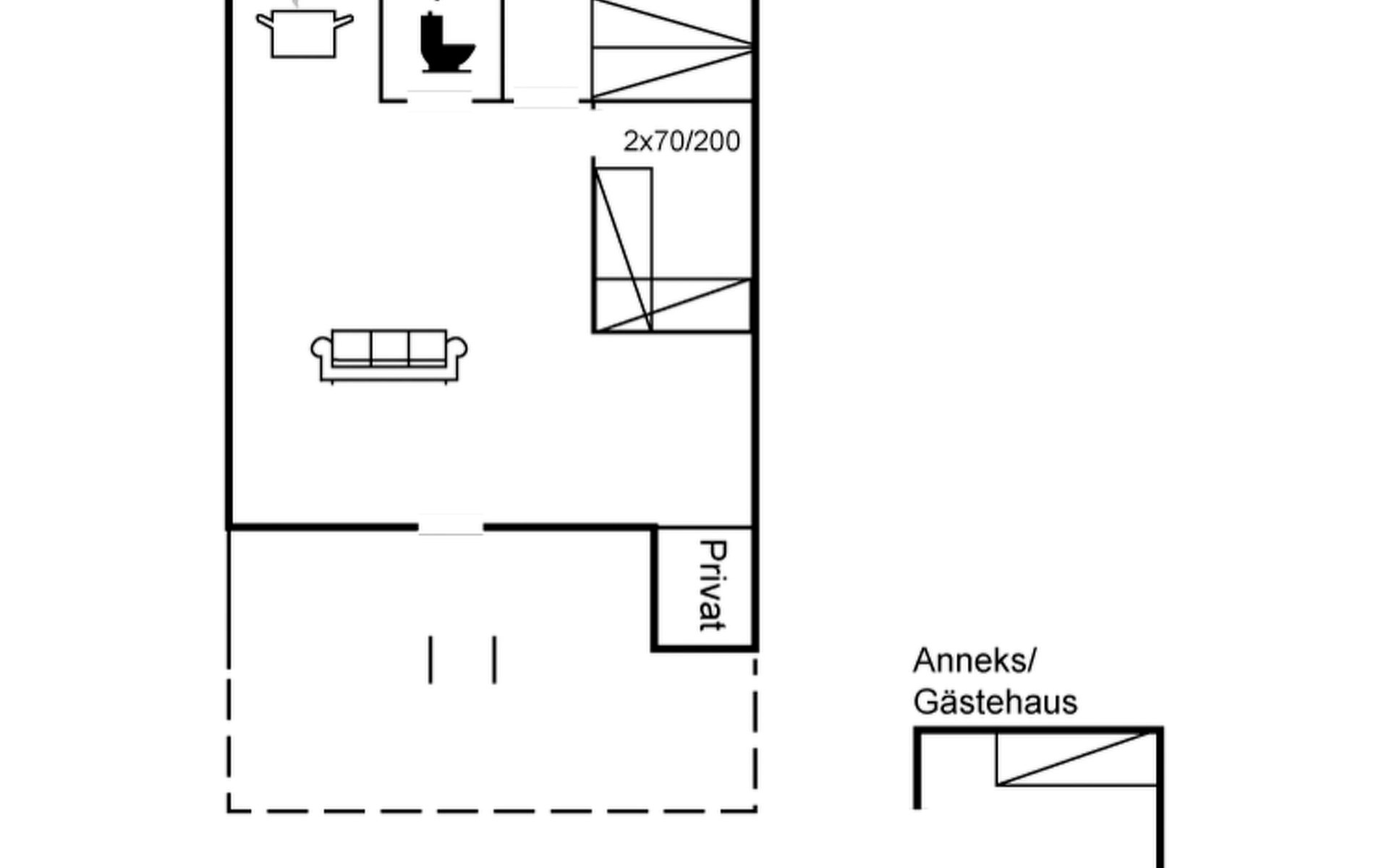 Eengezinswoning, bouwjaar 1979. 4 km van zee. Voor alleengebruik: wild terrein 1.100 m2. Terras (15 m2), parkeerplaats bij het huis. Levensmiddelenwinkel 2 km.