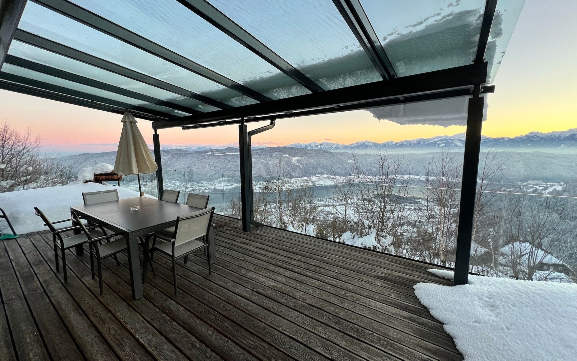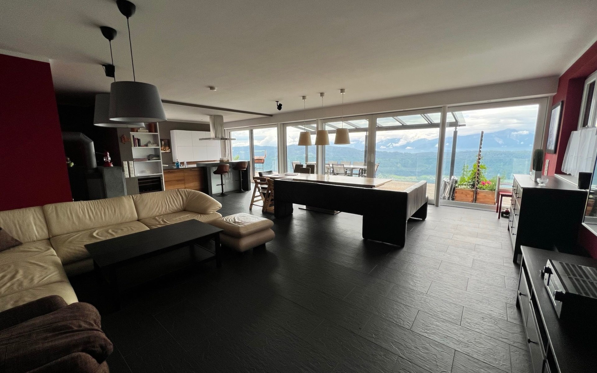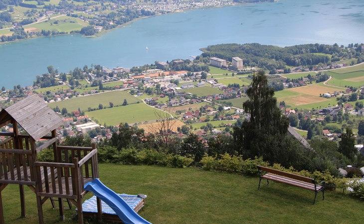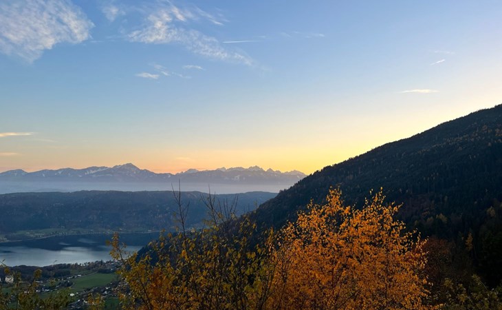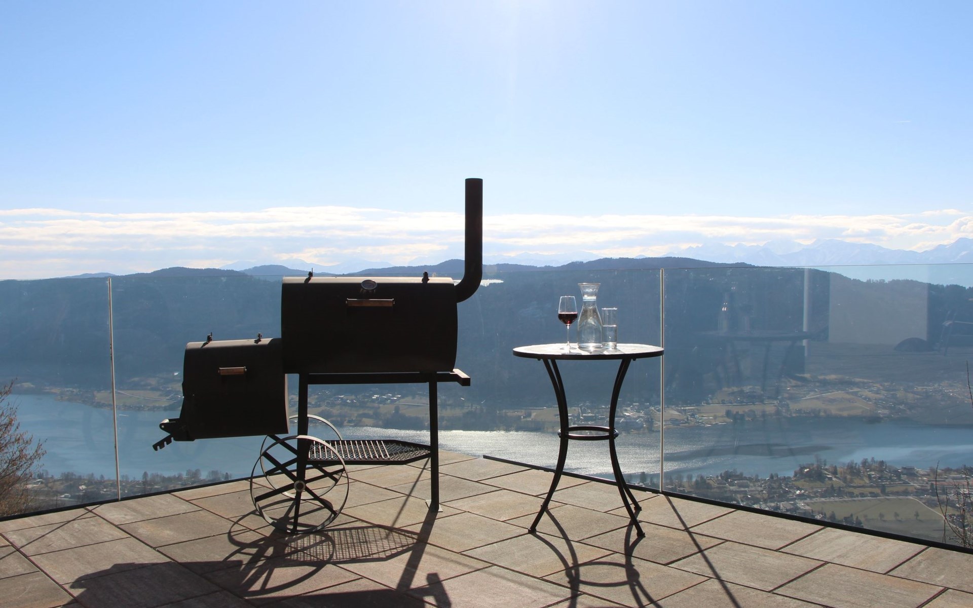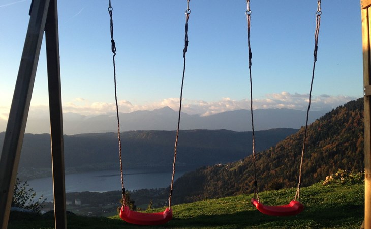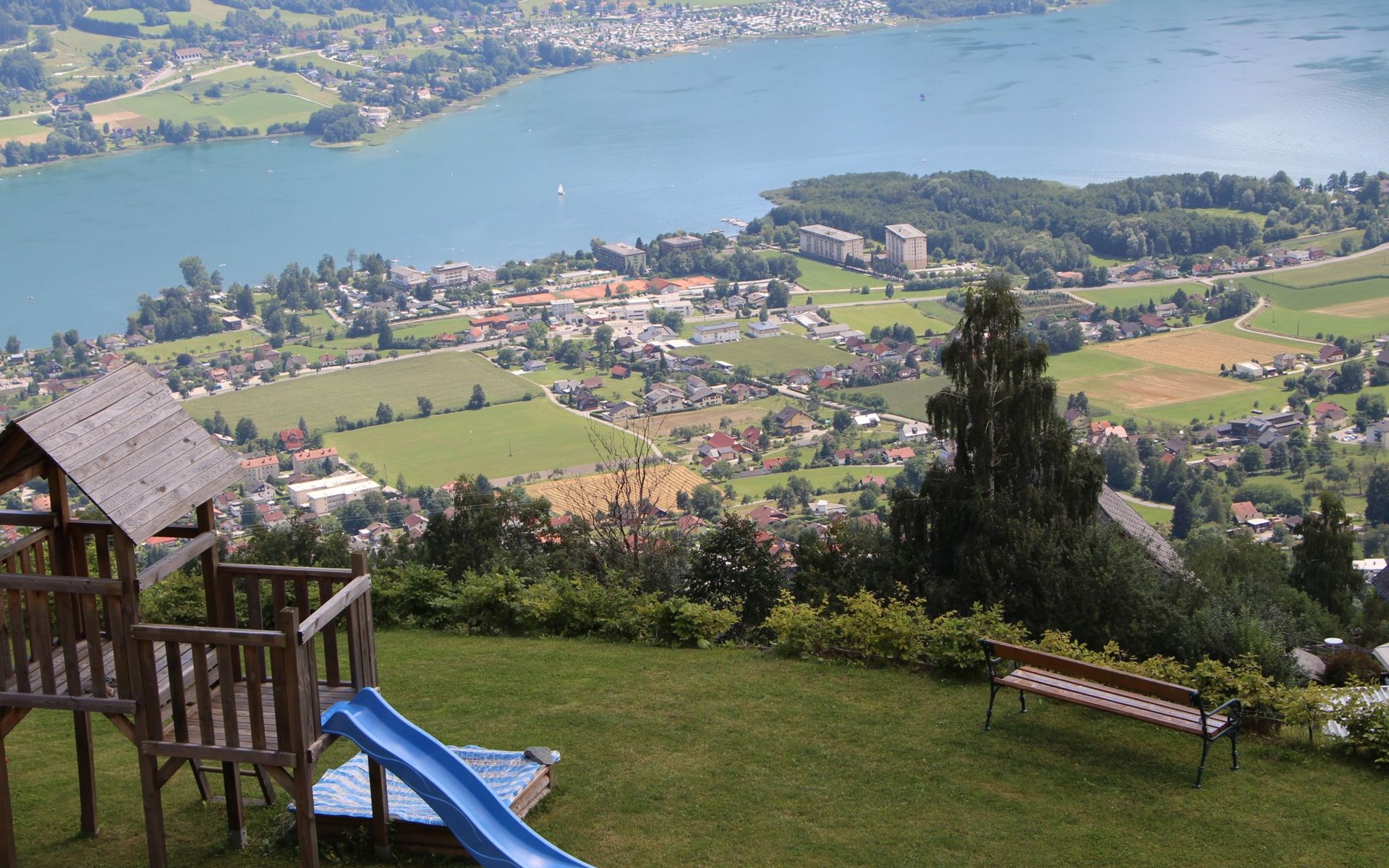 This holiday accommodation is on the ground floor of a detached single-family house amidst nature.The living room opens onto the big 100m² terrace that faces south, with a table, chairs, a grill and a breathtaking view of the mountains and Ossiacher See. Whether in spring, summer, autumn or winter – this view of nature has a special charm in any season. The generous garden provides garden furniture and play equipment and is for shared use with a further apartment. You can relax here, read a good book or spend leisurely evenings with friends and family. Two car parking spaces are available.Its 120m² of living space for up to four people comprises two bedrooms, an open living room with a kitchen, a bathroom and a guest WC. The open living room provides a TV, a sofa and further seating. The fireplace stove with a glass front, also in the living room, is available for use. The required firewood is provided free of charge. In addition, the living room has a cooking island that includes an induction hob, an oven, microwave, fridge, dishwasher and capsules coffee machine. The bedrooms are each furnished with a double bed (180 x 200cm). The bathroom has a shower, washbasin, washing machine and hairdryer. There is a separate guest WC next to it. Each room has heating and underfloor heating, so it is pleasant also in winter.The nearest grocery shop and various bars, clubs, restaurants are just 4km away. It is just a ten-minute walk to Ossiacher See, where you can swim. You can see it from the accommodation. You can go on a bike tour around the lake and make use of the recreational activities at Ossiacher See. It is 15 minutes to the cable car to Gerlitzen and just 25 minutes to Villach. It is an hour’s drive to the top ski resorts of the Alps such as Nassfeld, Kranjska Gora and Bad Kleinkirchheim. It is a two-hour drive to the sea in Slovenia or Italy.Please note that pets are not allowed. The wellness and fitness area with a sauna, a variety of fitness equipment, several wellness loungers and a shower is for use free of charge, shared with a further apartment. High-speed wireless Internet access is available throughout the property, including on the terrace. There is also a stereo system with a Bose surround sound system for use free of charge. The capsules for the Nespresso machine are available from the owner at a supplementary charge, or else you can bring your own. The wine chilling cupboard with two temperature zones can be filled with some items for you on request at a supplementary charge.