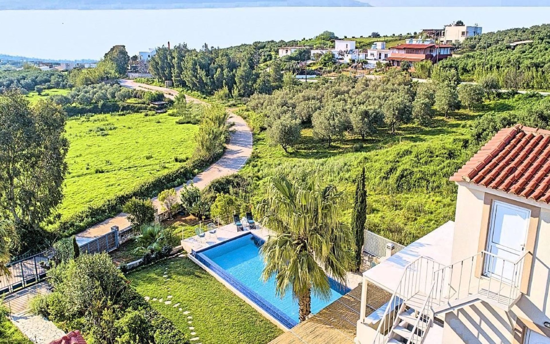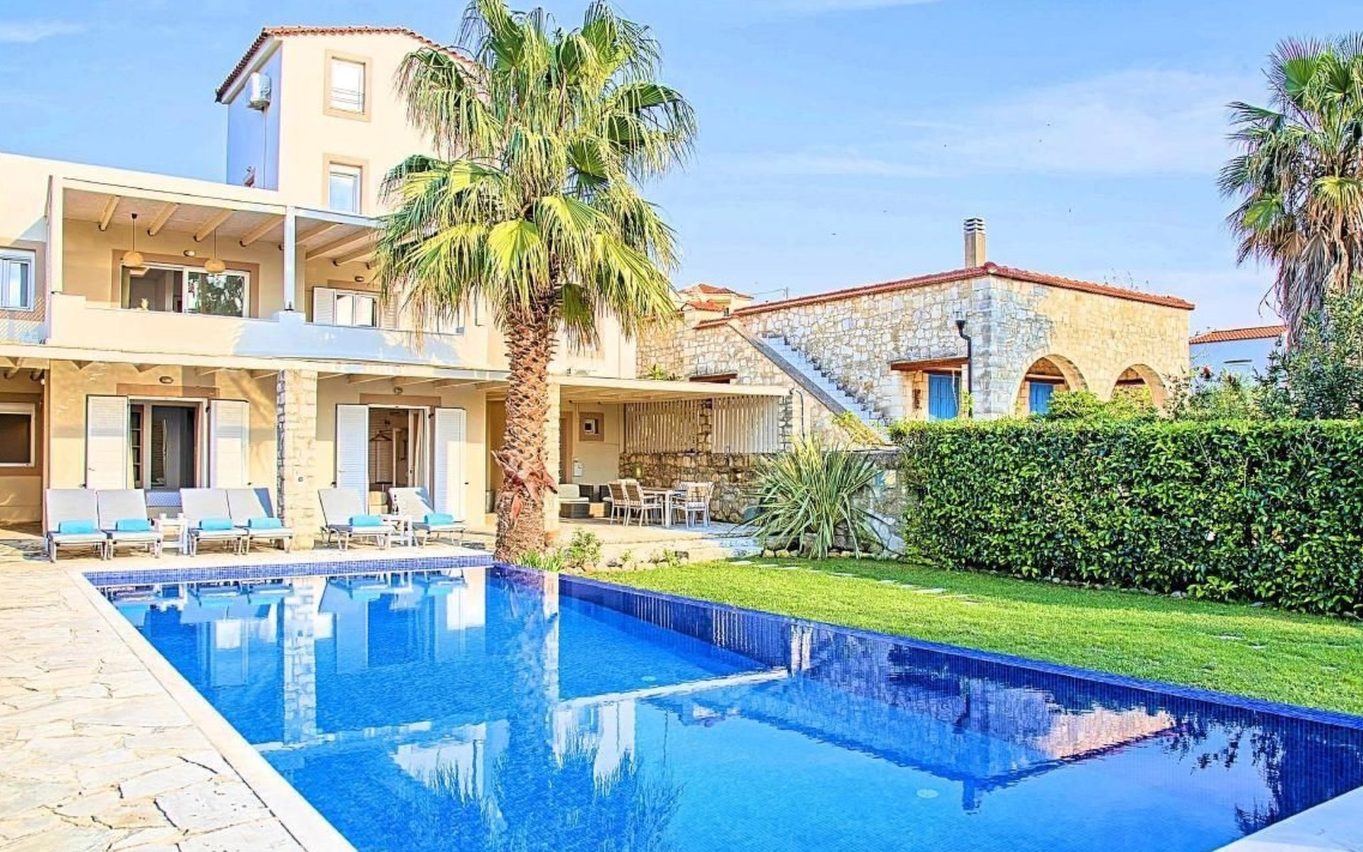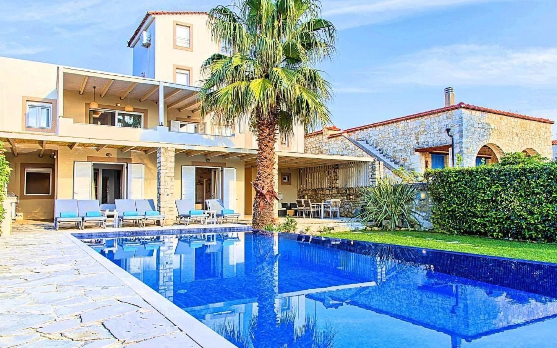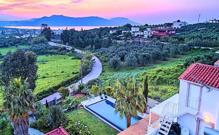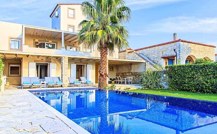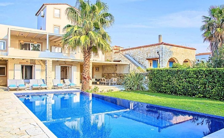 Cretan Mansion is a modern 5-bedroom villa.Located at the village Dramia, Apokoronas municipality, quite close to the tourist village of Kavros, just five hundred meters from the sandy beach of Georgioupolis – Episkopi, at the foot of the White Mountains at the northeastern corner of the prefecture of Chania.Built in 2006 with modern design, it affords guests with everything they need in order to enjoy a relaxing and enjoyable holiday.The rooms of the Mansion are functionally decorated.Its 5 bedrooms all fully equipped and spacious, all with private bathrooms.The lounges, dining rooms, kitchens are equipped with everything essential for a comfortable holiday.The gardens of the Mansion are surrounded by hand-made stone fences full of blossoming bushes, fruit trees and white oleanders.Swim in the private pool. Enjoy your coffee or drink at one of the terraces of our Mansion, looking out towards the White Mountains and the sandy beach of Georgioupolis.As you gaze at the valley surrounding the village, which is covered by a thick olive grove, you will relax immersed in aromas of rosemary, lavender and mint, engulfing you in a dream of the natural scent of the Cretan land.The outdoor pool is heated and can reach 6 to 8 degrees more that the air temperature with maximum value of 29°CShort descriptionOther : Non-smoking houseShort description 1Number of kitchens : 2SurroundingNearby sports facilities : FishingRental Facilities : Boat rental serviceGarden and outdoorGarden facilities : Garden furniture provided, GrillOn-site leisure facilities : Outdoor swimming pool exclusive use, Swimming poolBuilt with modern design, it affords guests with everything they need in order to enjoy a relaxing and enjoyable holiday. The rooms of the Mansion are functionally decorated. Its 5 bedrooms all fully equipped and spacious, all with private bathrooms. The lounges, dining rooms, kitchens are equipped with everything essential for a comfortable holiday. The gardens of the Mansion are surrounded by hand-made stone fences full of blossoming bushes, fruit trees and white oleanders. Swim in the private pool. Enjoy your coffee or drink at one of the terraces of our Mansion, looking out towards the White Mountains and the sandy beach of Georgioupolis. As you gaze at the valley surrounding the village, which is covered by a thick olive grove, you will relax immersed in aromas of rosemary, lavender and mint, engulfing you in a dream of the natural scent of the Cretan land.The Mansion is built on 4 levels and can accommodate up to 15 people, all 12 months year round. The first level of the west garden and the pool has 2 independent studios with their own private entrances. The same level of the main building has a lounge with a corner sofa seating 5 people, with an auxiliary kitchen and a spacious bedroom. Outside the same level, at the western garden overlooking the pool, there is a large dining space with sun loungers. Inside, a staircase leads upstairs to the second level of the Mansion. The main entrance from the upper street and the east garden is at this level. This second level has a fully equipped kitchen, a large lounge with comfortable sofas, a guest bathroom and a vast terrace with a dining table. At the third and fourth level there are the master bedroom of the mansion, a large loft bedroom, and two more terraces.Our village, Dramia, today is a small, quiet, residential village of 250 inhabitants, administratively belonging to the municipality of Apokoronas. The position and orientation of the village are ideal. It is located among olive groves and looks over the plain of Kournas.The outdoor pool is heated and can reach 6 to 8 degrees more that the 24 h average air temperature with maximum value of 29°C. 1042K10002994601
