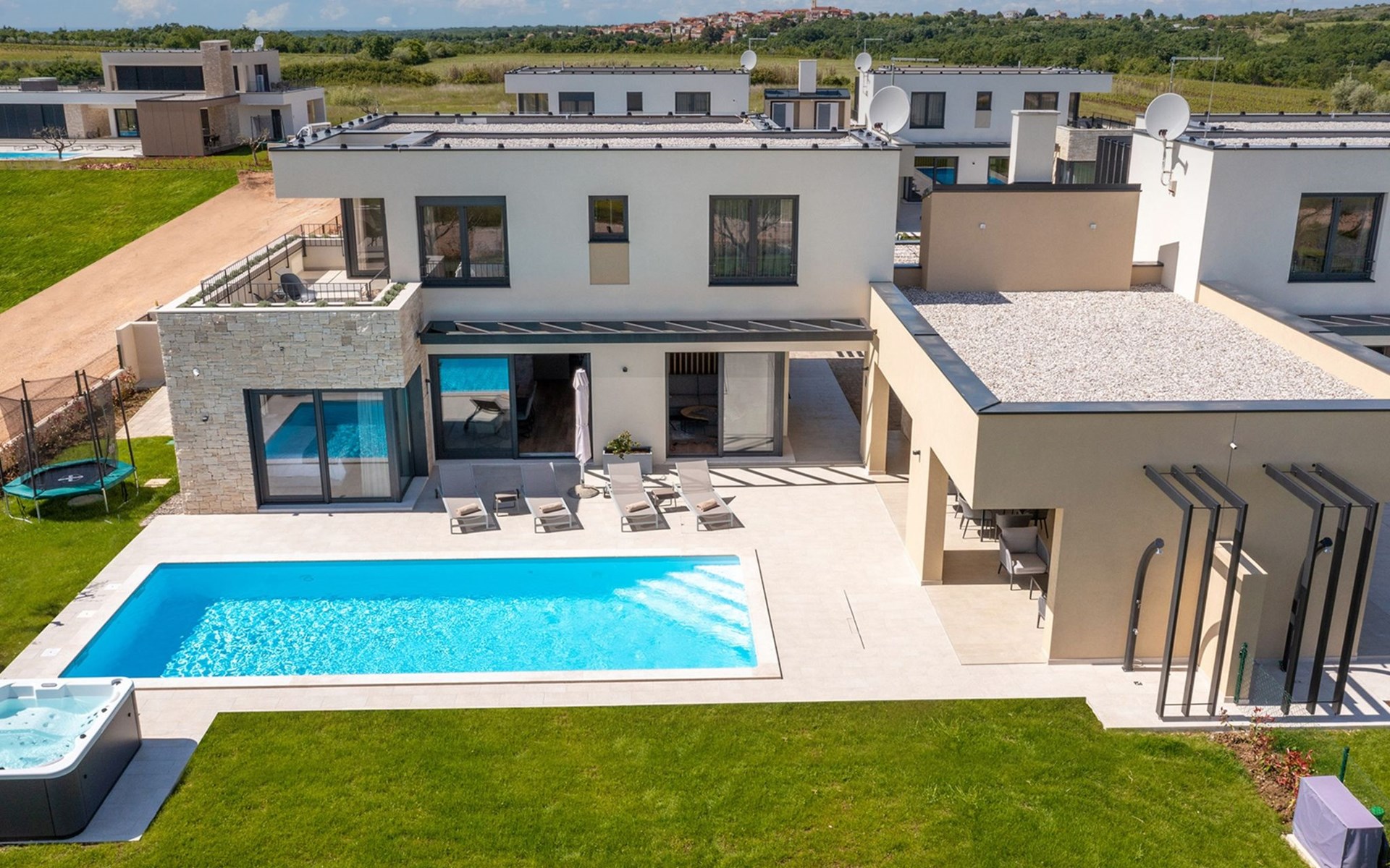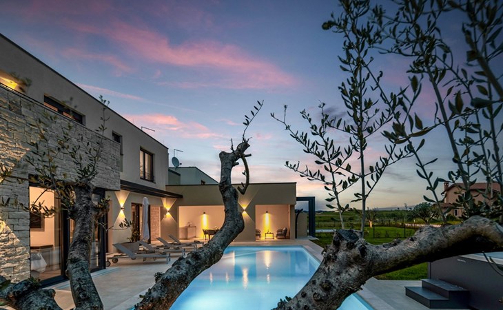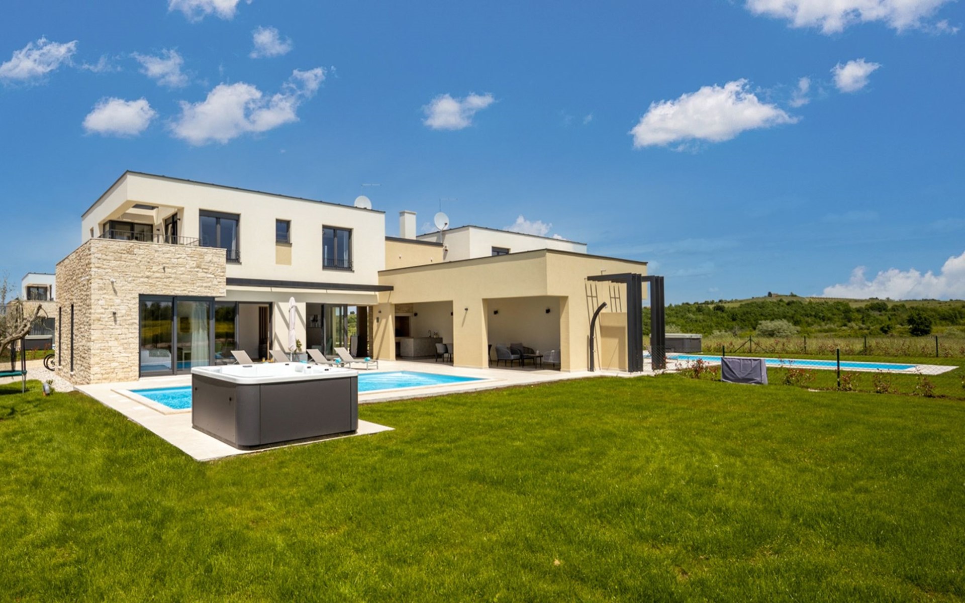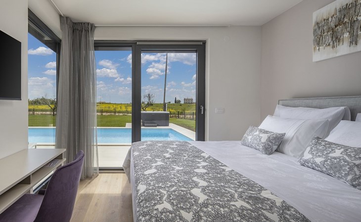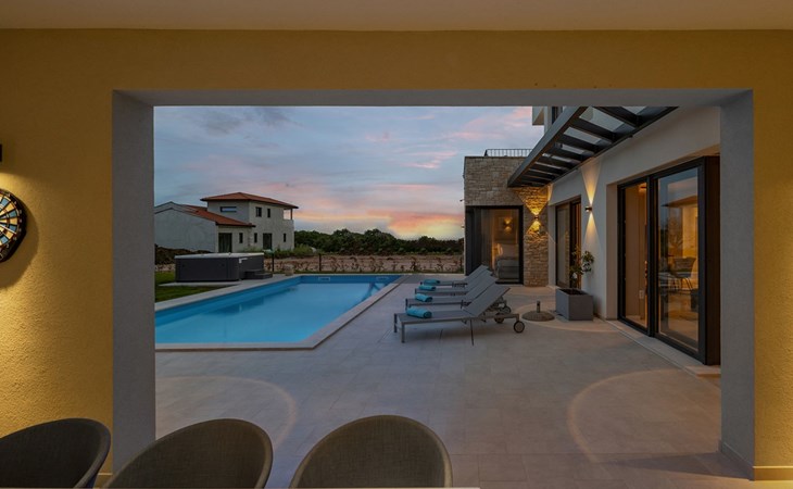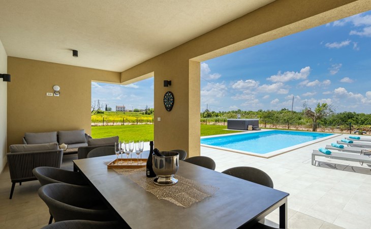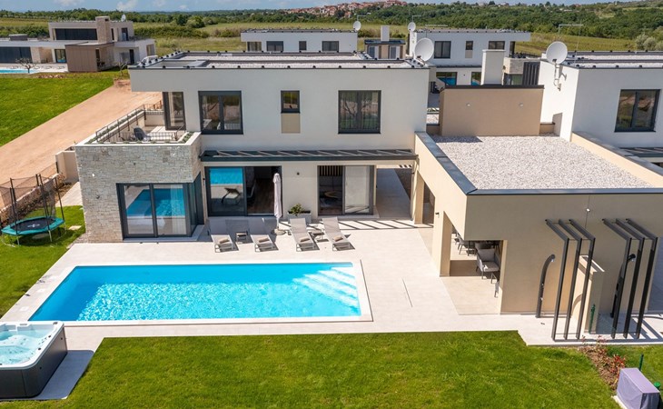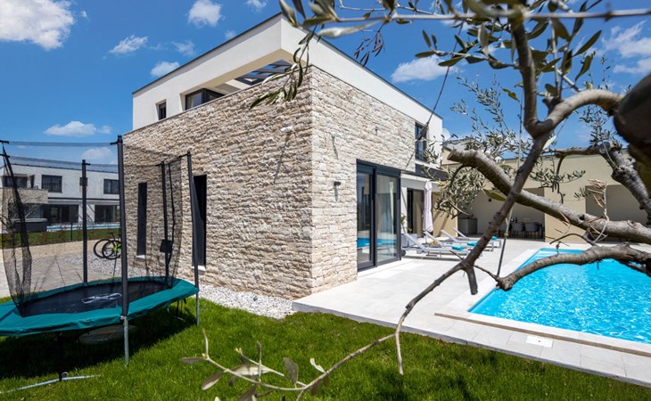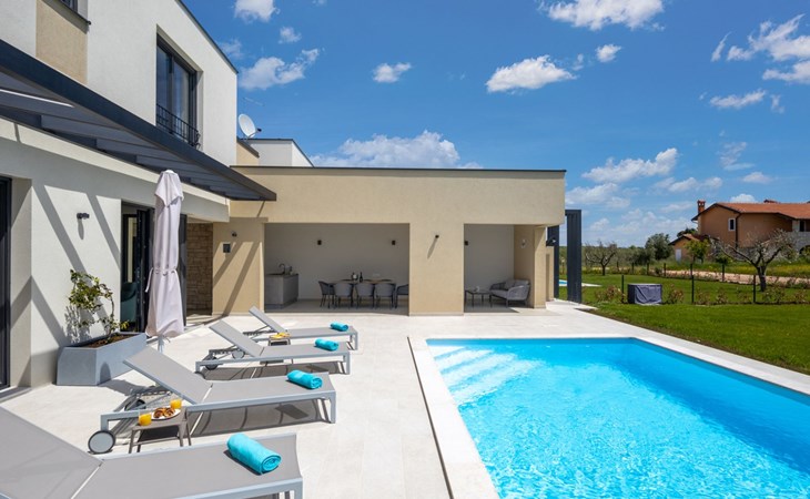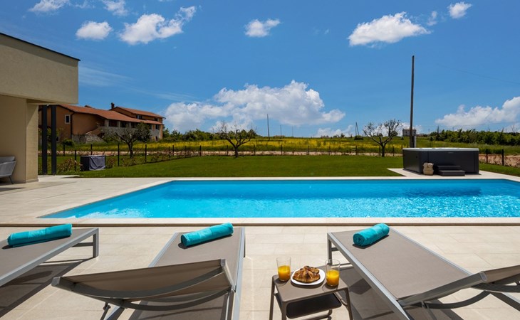 Luxueuze villa "Stella", van 2 verdiepingen, bouwjaar 2021. 1 km van het centrum van Nova Vas, 2 km van het centrum van Brtonigla, 10 km van het centrum van Novigrad, 8.2 km van zee. Voor alleengebruik: terrein 900 m2 (omheind) met gazon, openluchtzwembad hoekig, verwarmd (4 x 10 m, 135 cm diepte, seizoensgebonden beschikbaarheid: 10.Apr. - 01.Nov.) met trap. Buitendouche, hot tub, badminton, terras (10 m2), tuinmeubelen, grill. In het huis: internetaansluiting, trampoline, wasmachine, fietsen beschikbaar. Beschikbaar: fietsen (2), kinderfietsen (1). Toegangsweg (500 m onverharde weg). Parkeerplaats (voor 3 auto's) bij het huis op het terrein. Winkel 1.5 km, restaurant 650 m, bushalte 4 km, kiezelstrand 8.2 km. Wandelroutes, vanaf het huis, fietspad 100 m. Attracties in de buurt: Aquapark 2 km. Groepen jongeren uitsluitend op aanvraag. Vliegveld 20 km van het huis. Openluchtzwembad verwarmd (extra). Videobewaking bij de oprit en parkeerplaats.