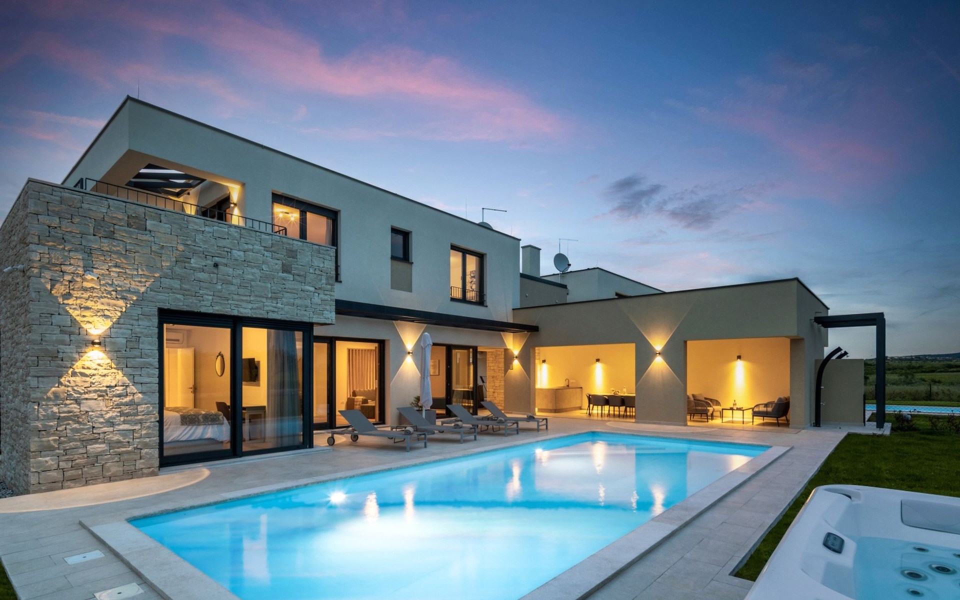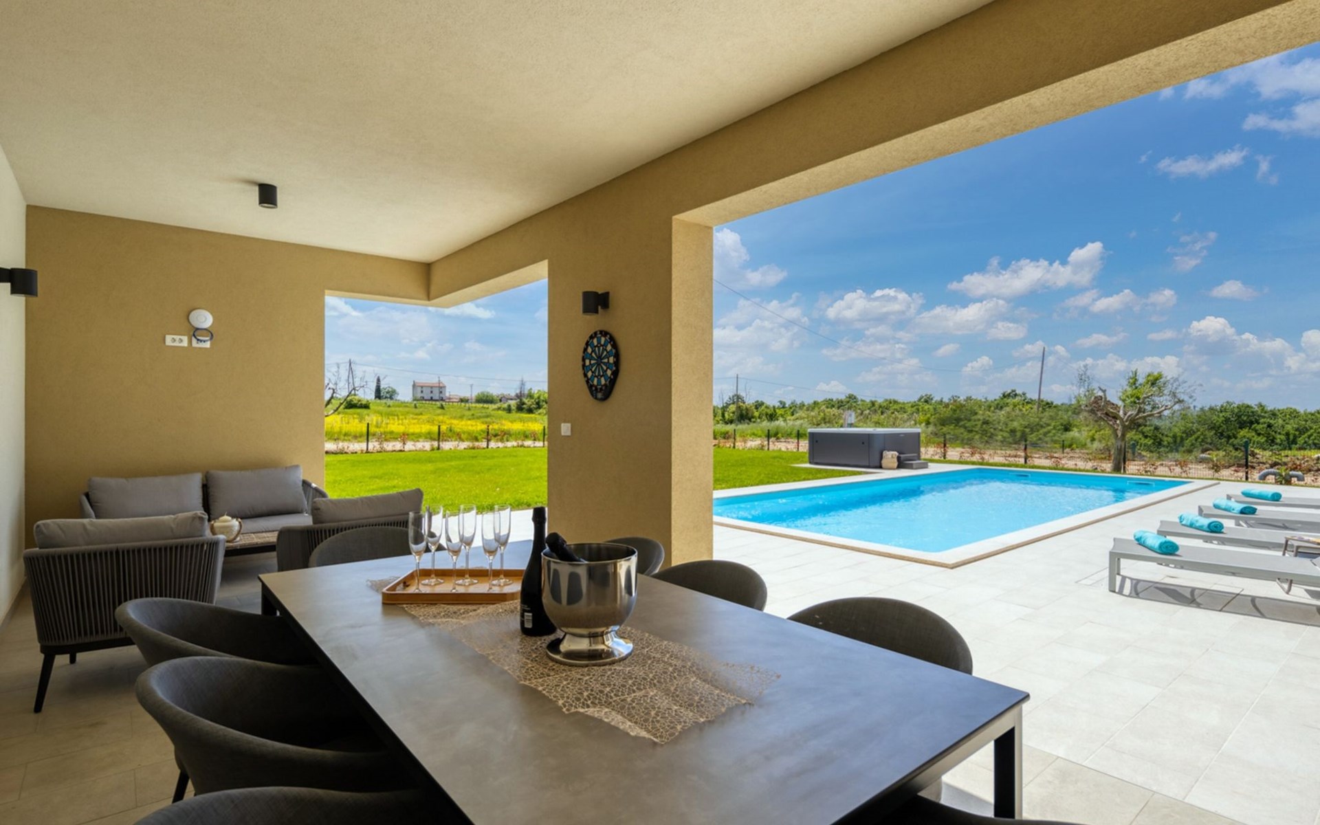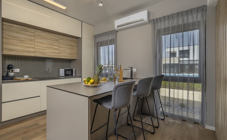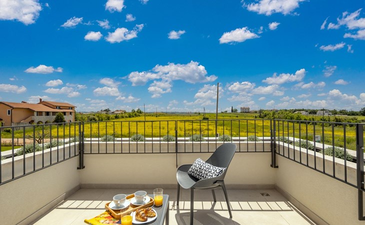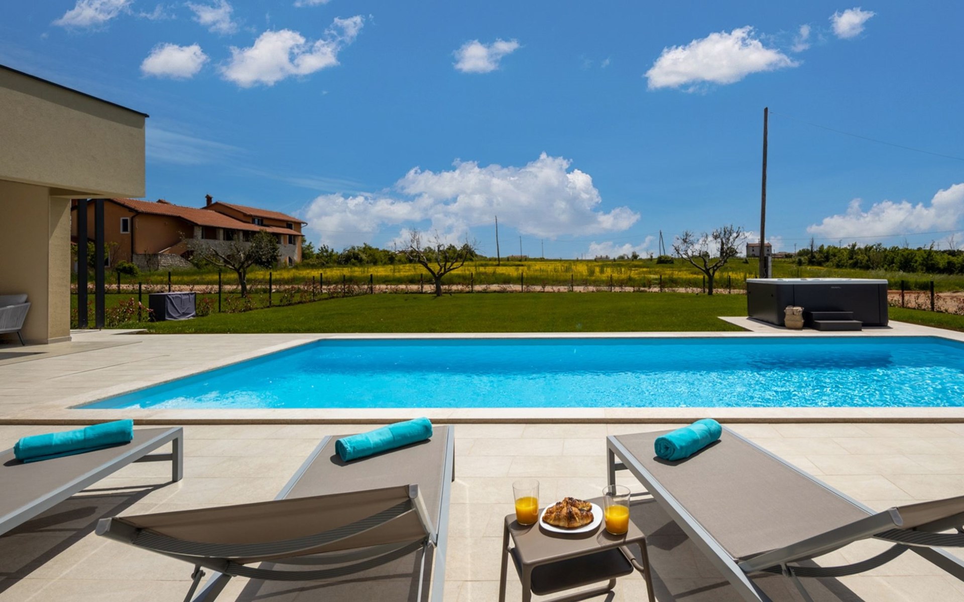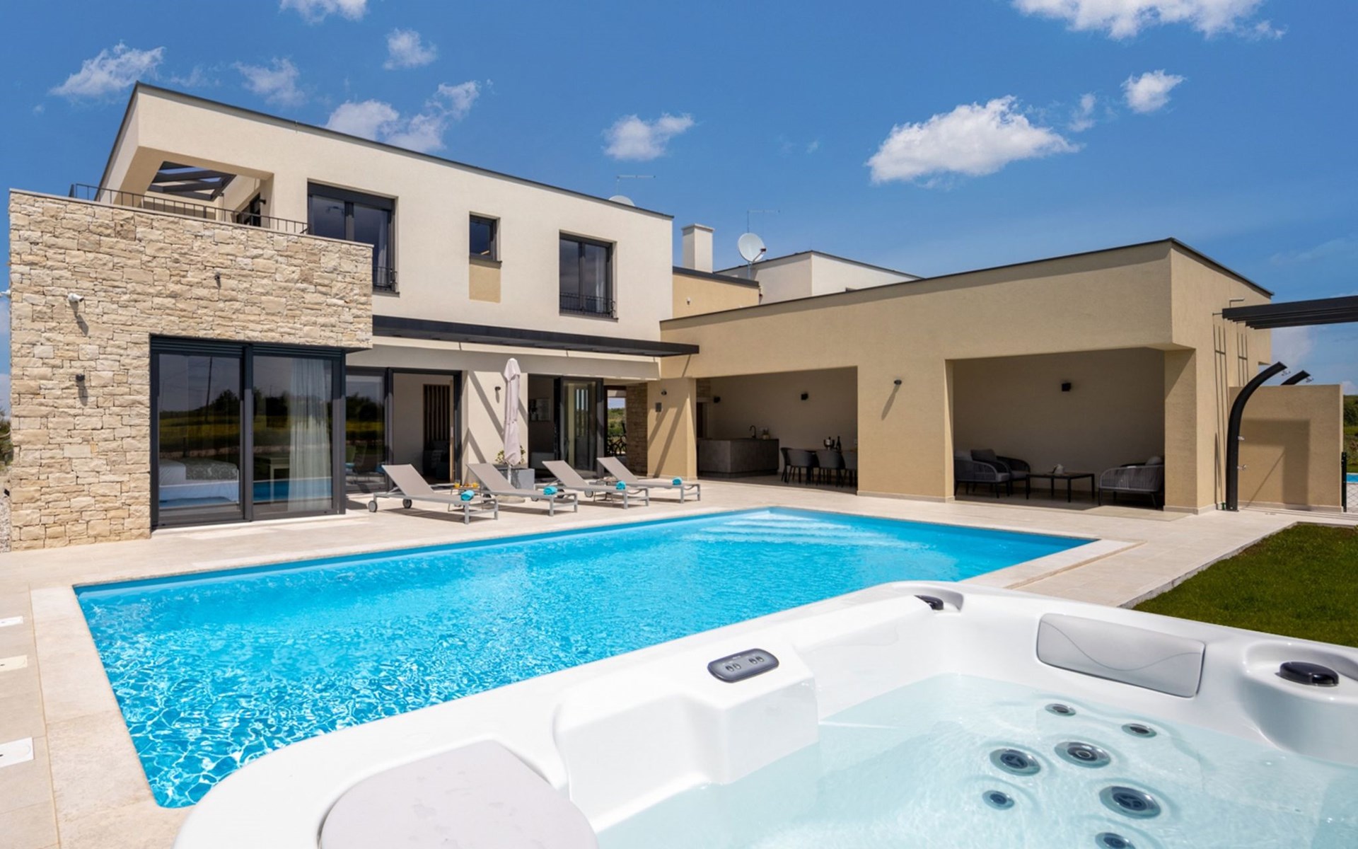 Luxueuze villa "Stella", van 2 verdiepingen, bouwjaar 2021. 1 km van het centrum van Nova Vas, 2 km van het centrum van Brtonigla, 10 km van het centrum van Novigrad, 8.2 km van zee. Voor alleengebruik: terrein 900 m2 (omheind) met gazon, openluchtzwembad hoekig, verwarmd (4 x 10 m, 135 cm diepte, seizoensgebonden beschikbaarheid: 10.Apr. - 01.Nov.) met trap. Buitendouche, hot tub, badminton, terras (10 m2), tuinmeubelen, grill. In het huis: internetaansluiting, trampoline, wasmachine, fietsen beschikbaar. Beschikbaar: fietsen (2), kinderfietsen (1). Toegangsweg (500 m onverharde weg). Parkeerplaats (voor 3 auto's) bij het huis op het terrein. Winkel 1.5 km, restaurant 650 m, bushalte 4 km, kiezelstrand 8.2 km. Wandelroutes, vanaf het huis, fietspad 100 m. Attracties in de buurt: Aquapark 2 km. Groepen jongeren uitsluitend op aanvraag. Vliegveld 20 km van het huis. Openluchtzwembad verwarmd (extra). Videobewaking bij de oprit en parkeerplaats.
