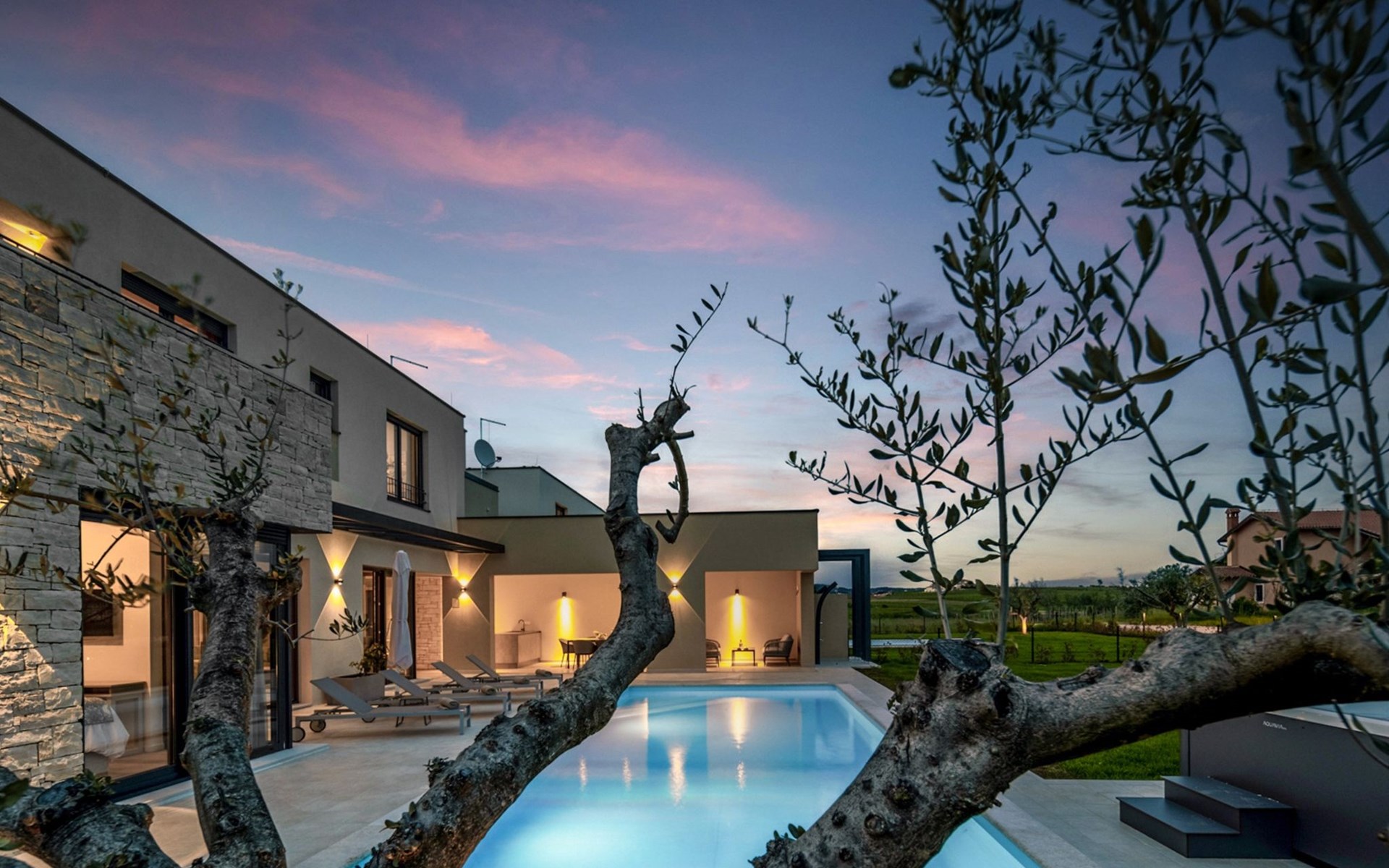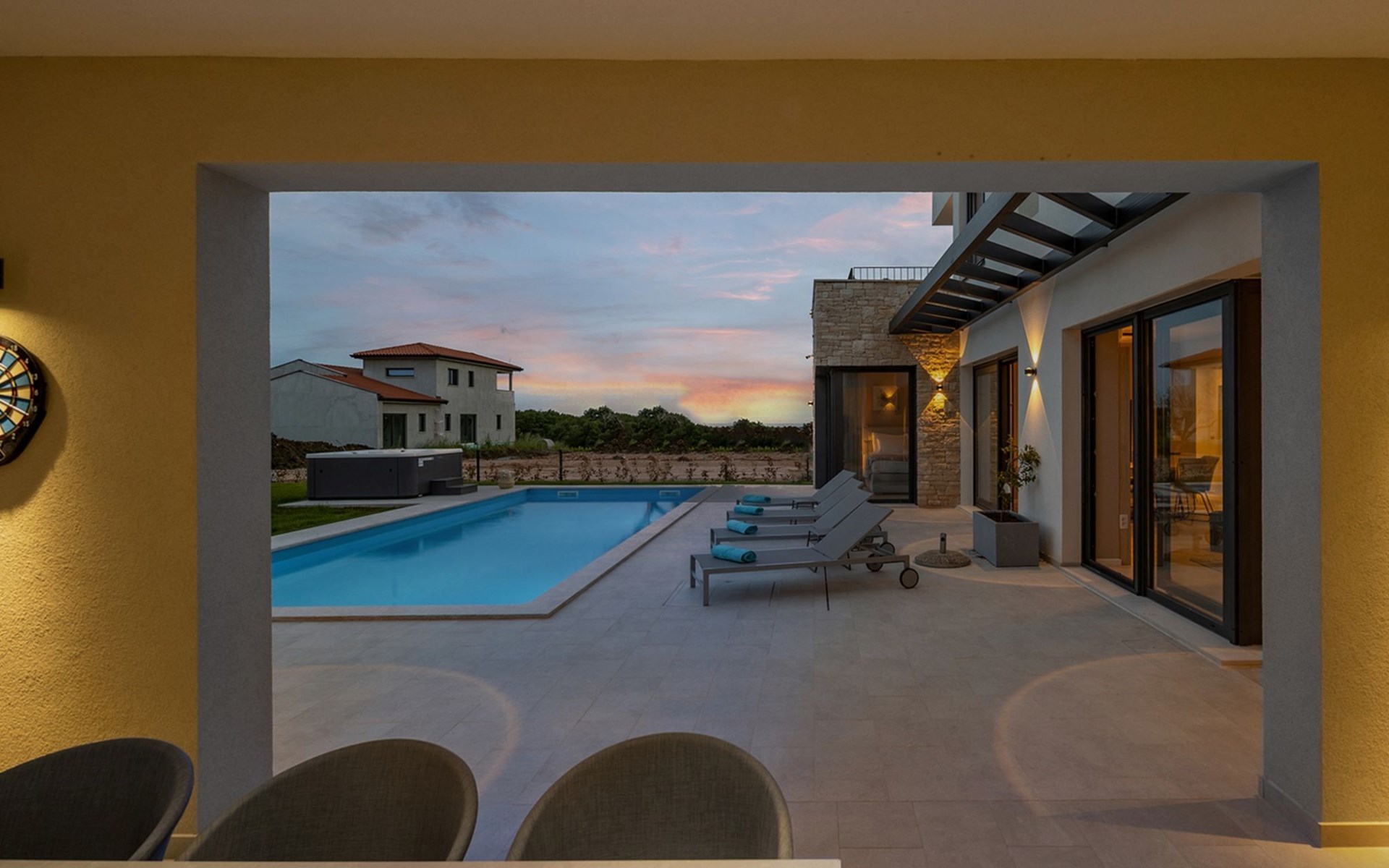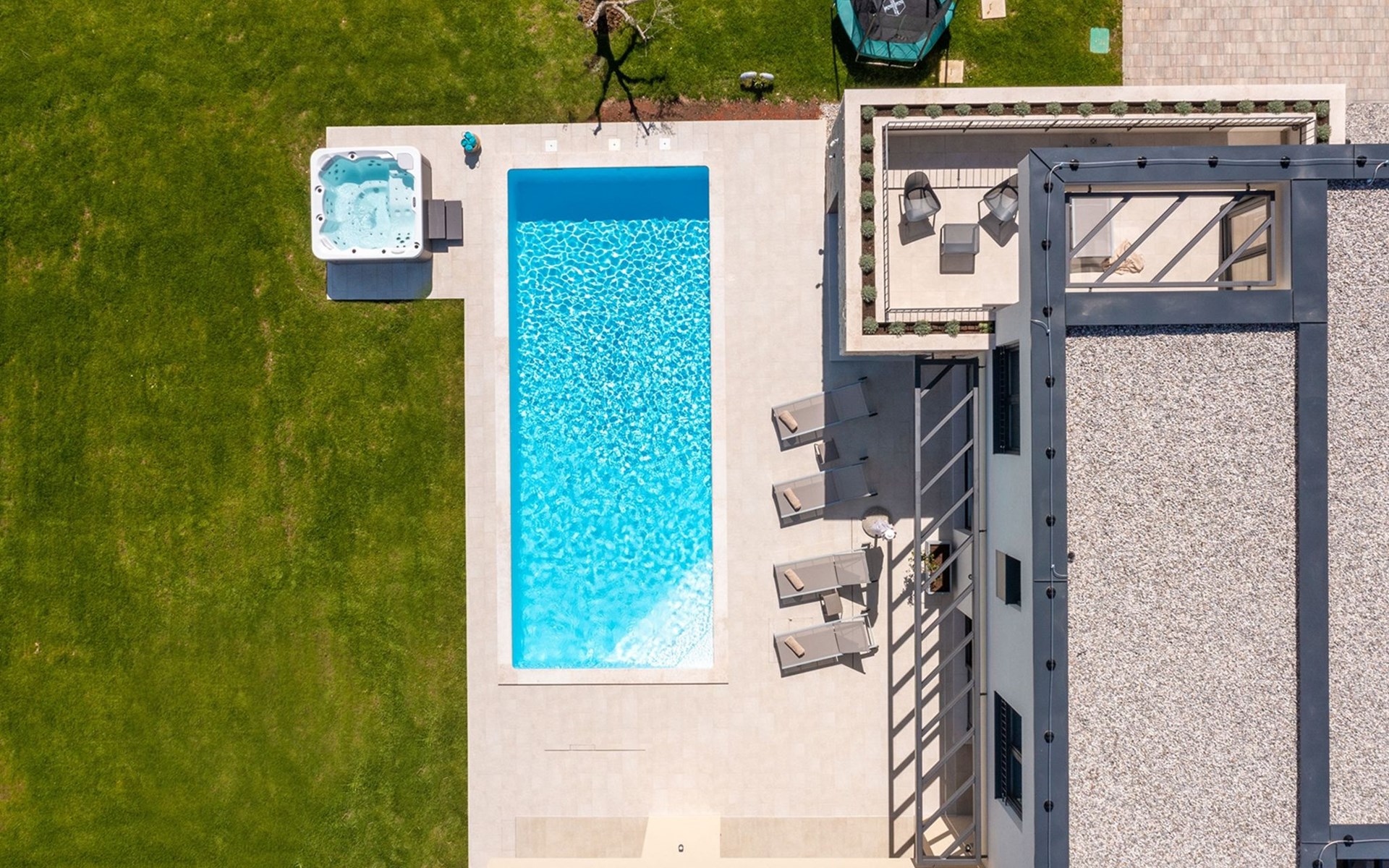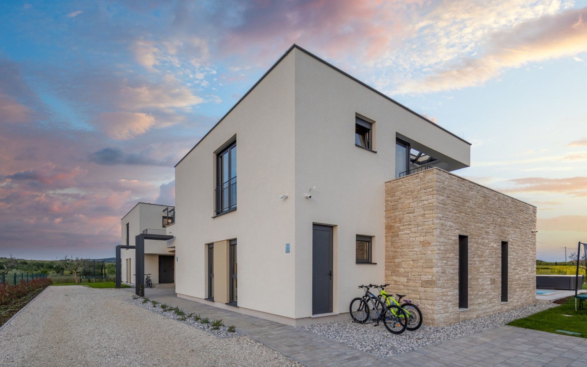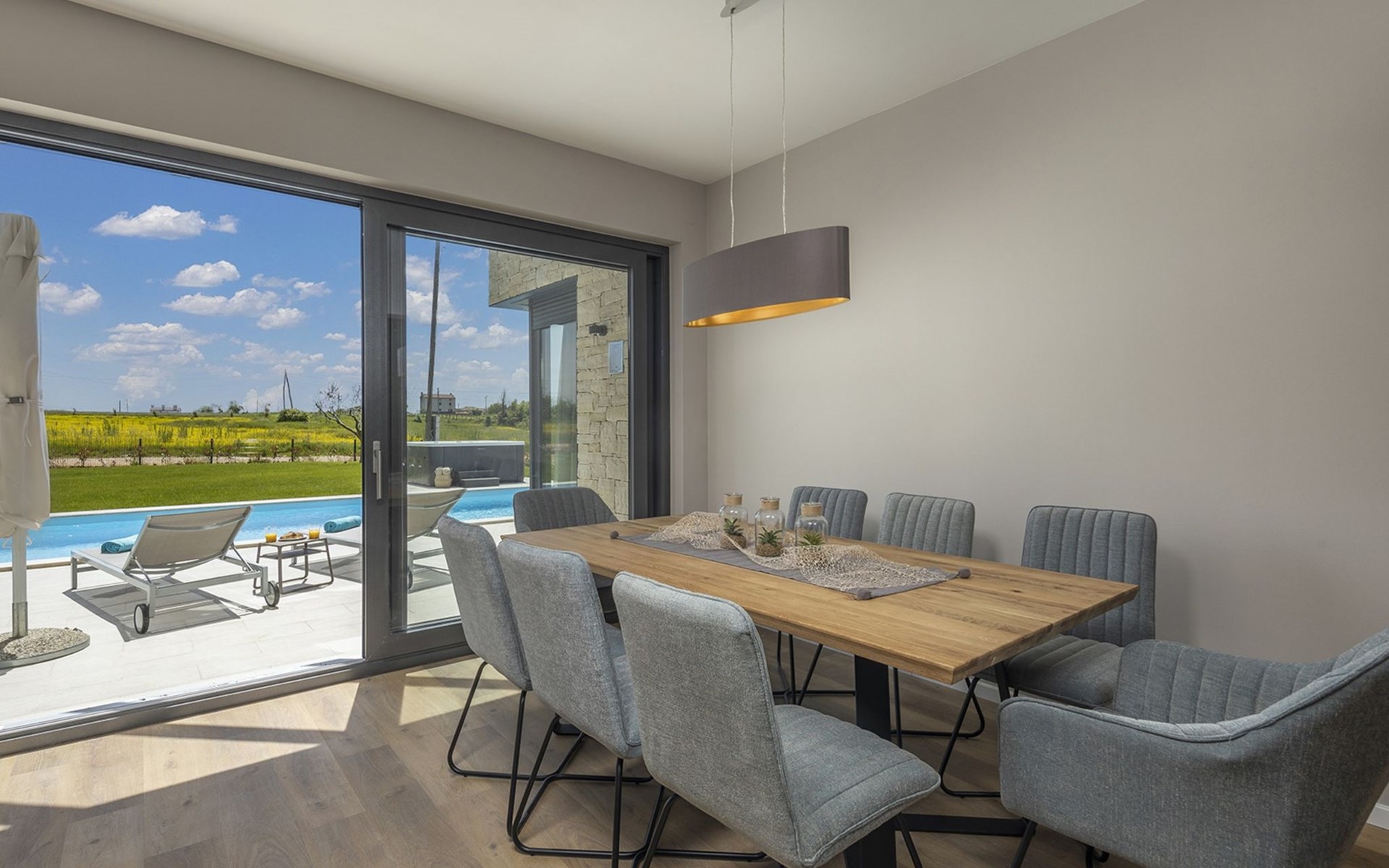 Luxueuze villa "Stella", van 2 verdiepingen, bouwjaar 2021. 1 km van het centrum van Nova Vas, 2 km van het centrum van Brtonigla, 10 km van het centrum van Novigrad, 8.2 km van zee. Voor alleengebruik: terrein 900 m2 (omheind) met gazon, openluchtzwembad hoekig, verwarmd (4 x 10 m, 135 cm diepte, seizoensgebonden beschikbaarheid: 10.Apr. - 01.Nov.) met trap. Buitendouche, hot tub, badminton, terras (10 m2), tuinmeubelen, grill. In het huis: internetaansluiting, trampoline, wasmachine, fietsen beschikbaar. Beschikbaar: fietsen (2), kinderfietsen (1). Toegangsweg (500 m onverharde weg). Parkeerplaats (voor 3 auto's) bij het huis op het terrein. Winkel 1.5 km, restaurant 650 m, bushalte 4 km, kiezelstrand 8.2 km. Wandelroutes, vanaf het huis, fietspad 100 m. Attracties in de buurt: Aquapark 2 km. Groepen jongeren uitsluitend op aanvraag. Vliegveld 20 km van het huis. Openluchtzwembad verwarmd (extra). Videobewaking bij de oprit en parkeerplaats.