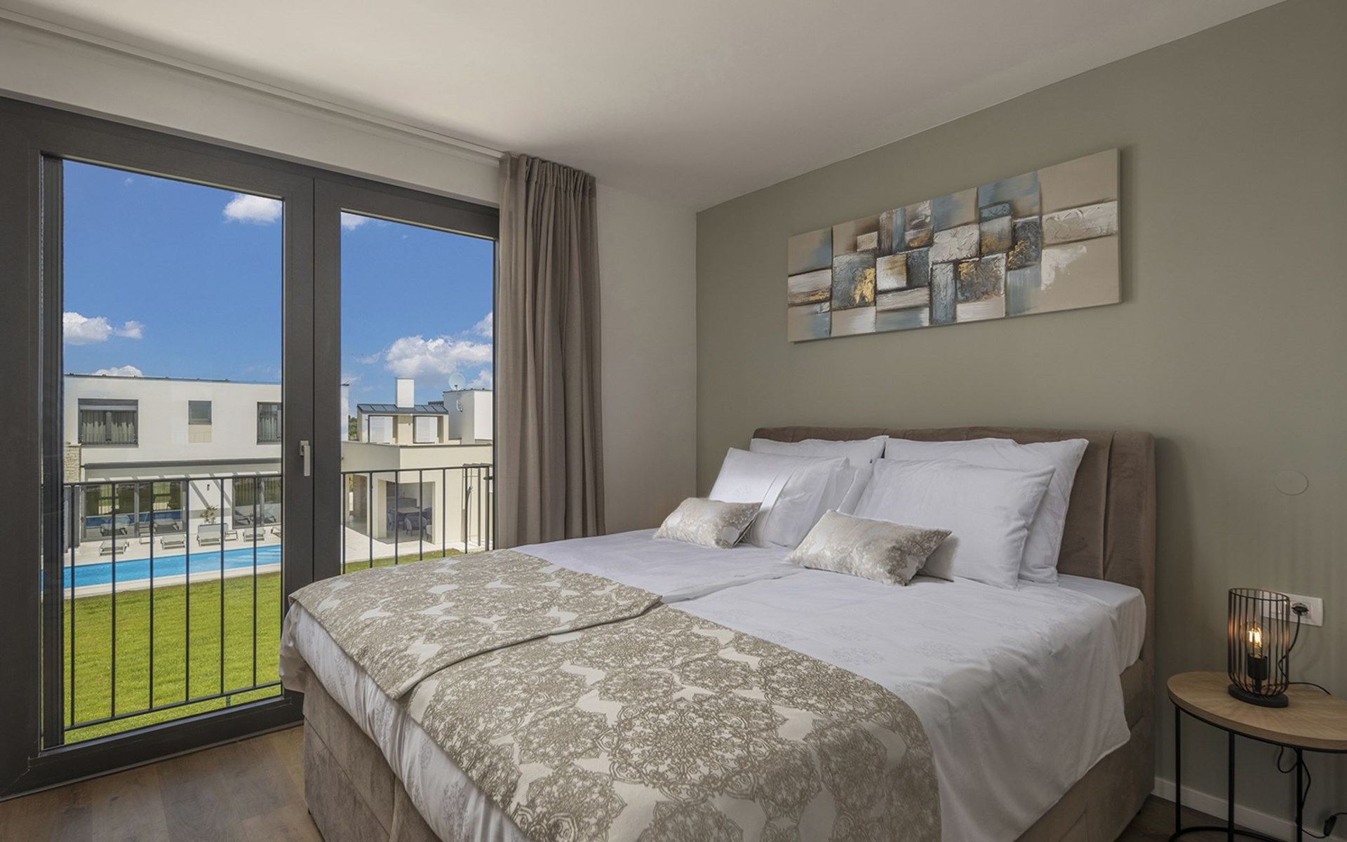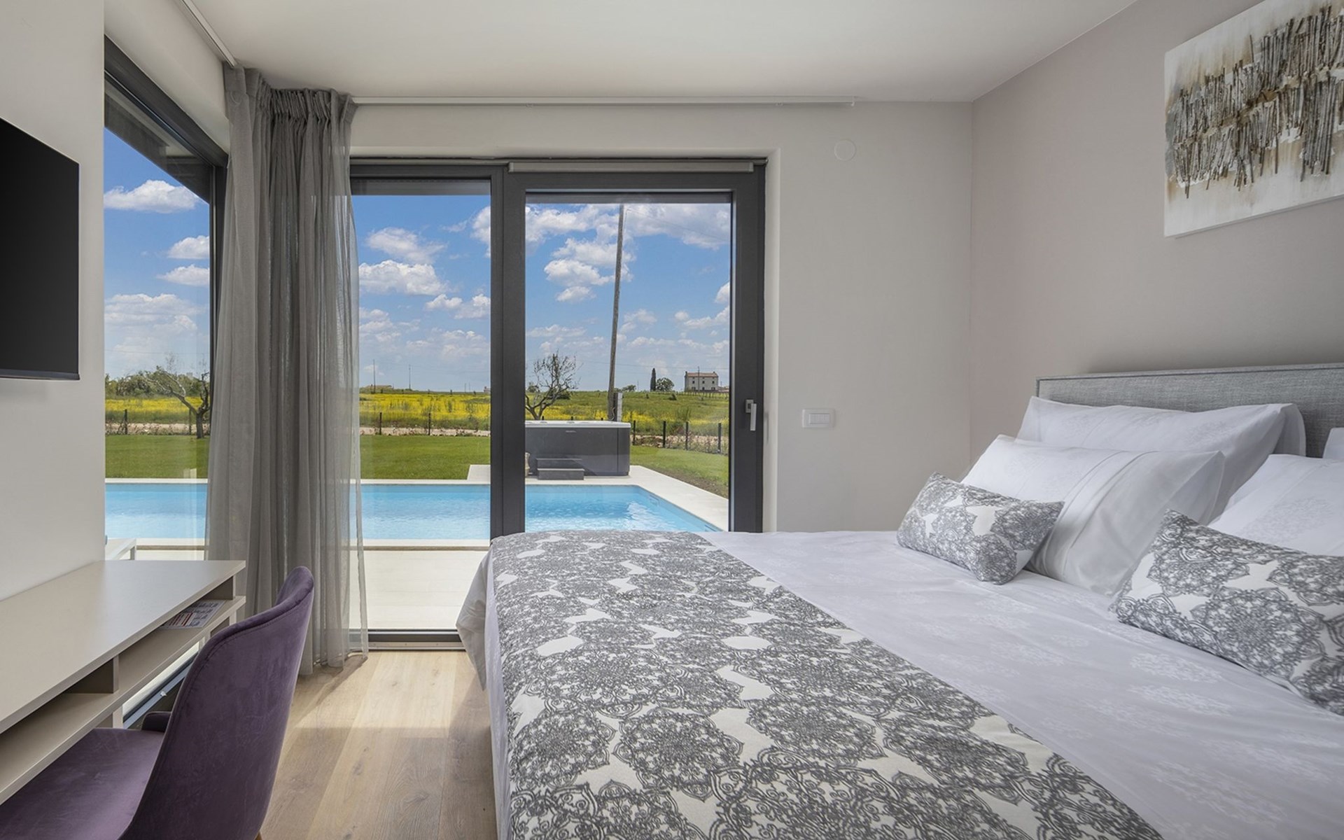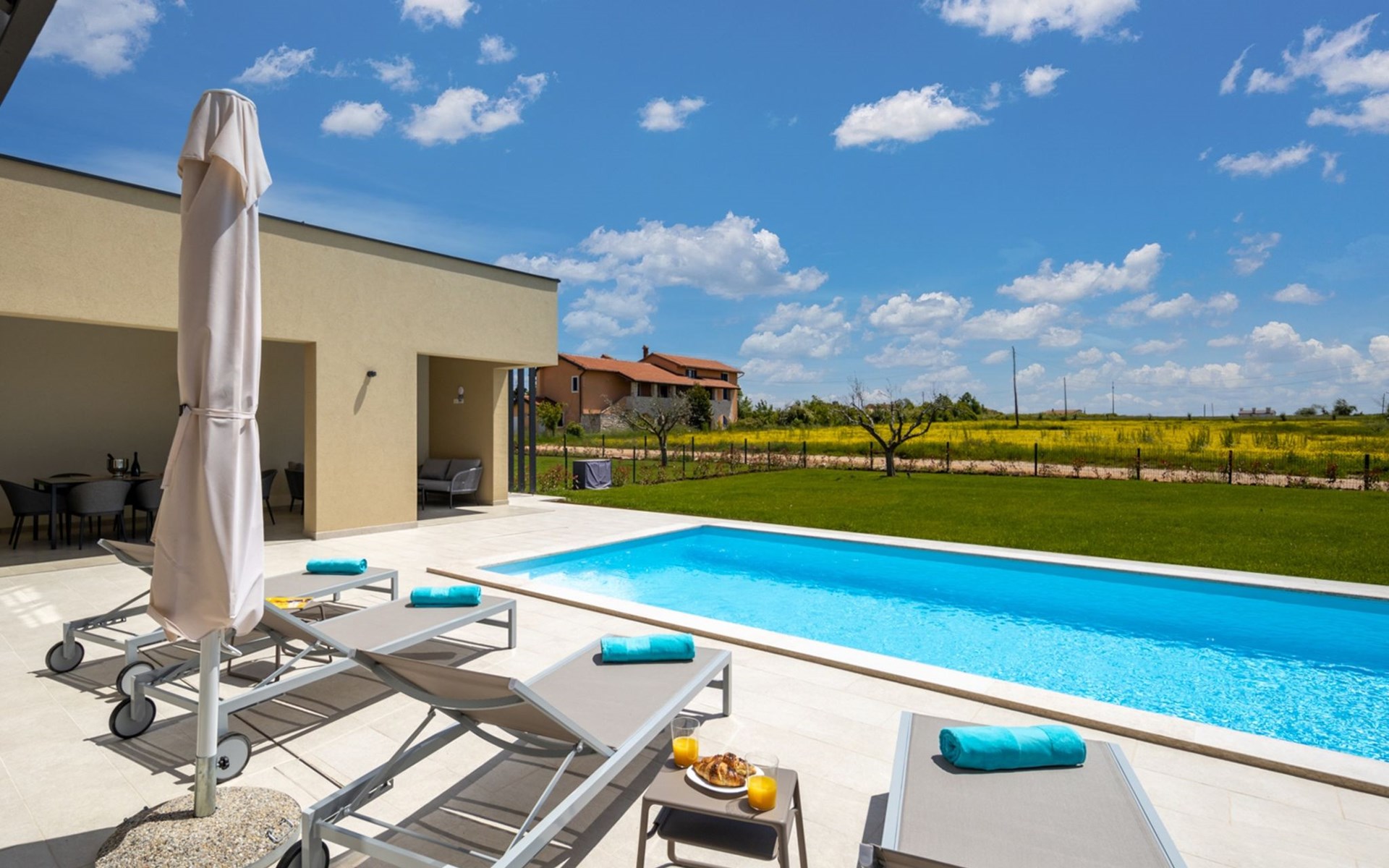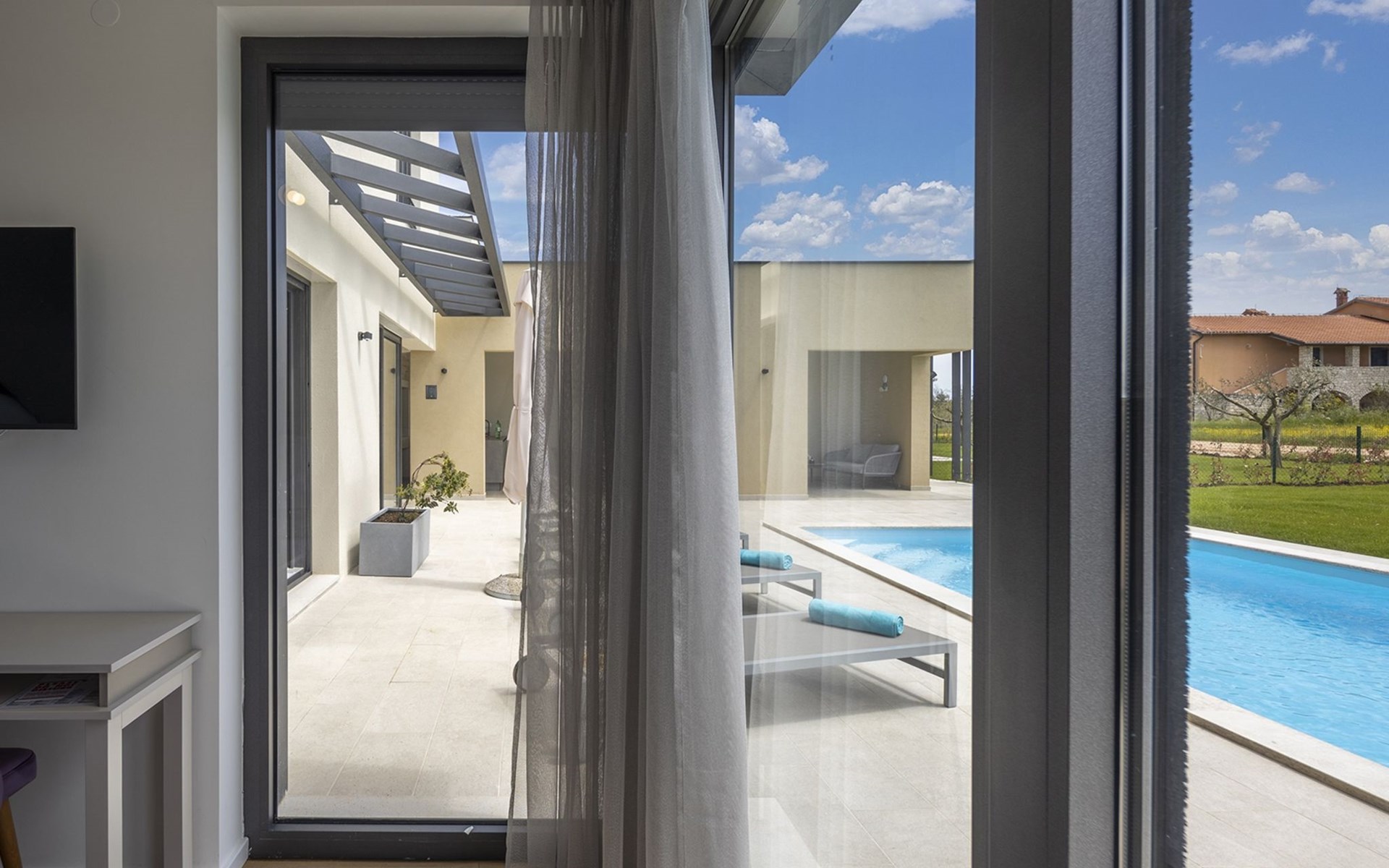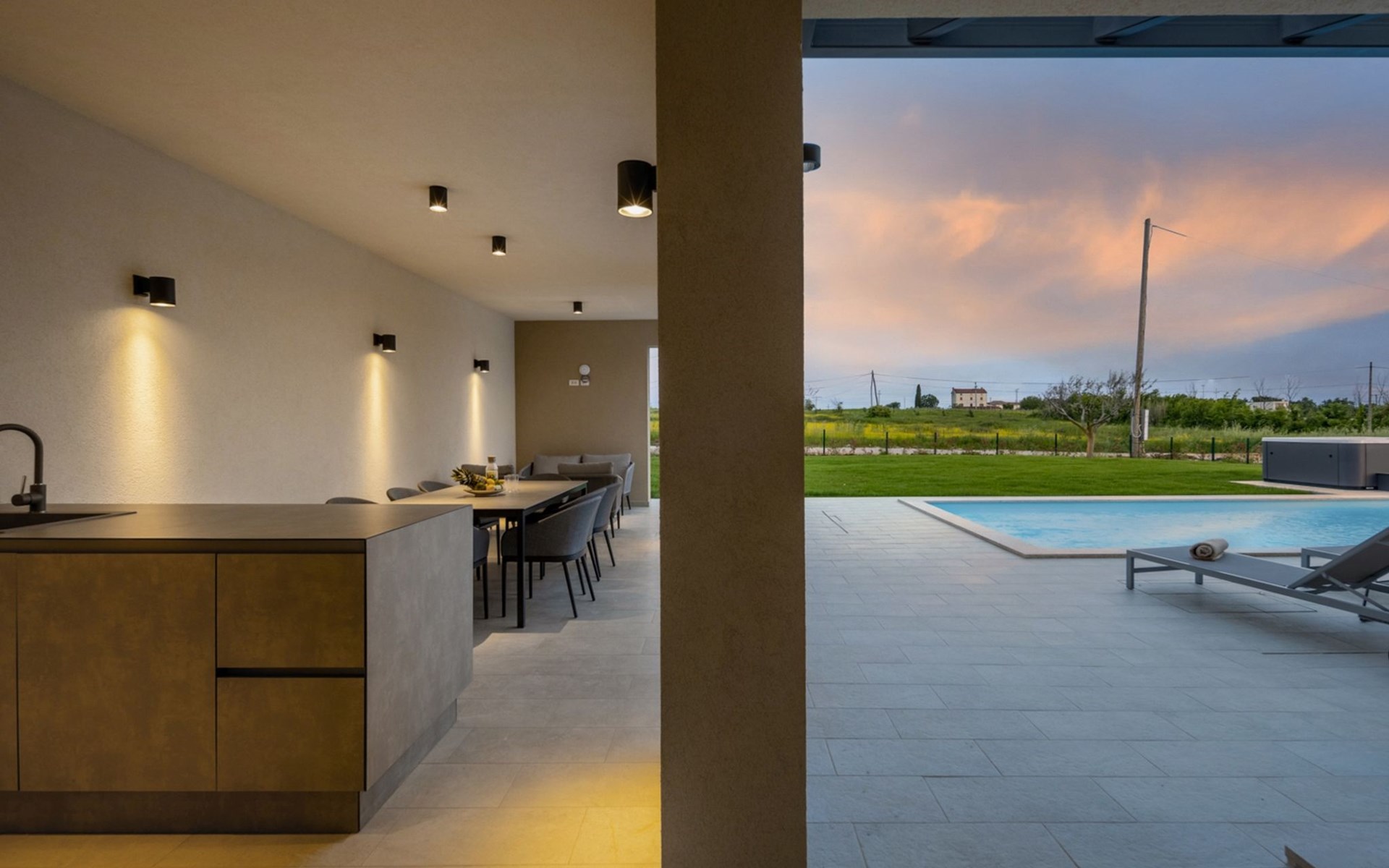 Luxueuze villa "Stella", van 2 verdiepingen, bouwjaar 2021. 1 km van het centrum van Nova Vas, 2 km van het centrum van Brtonigla, 10 km van het centrum van Novigrad, 8.2 km van zee. Voor alleengebruik: terrein 900 m2 (omheind) met gazon, openluchtzwembad hoekig, verwarmd (4 x 10 m, 135 cm diepte, seizoensgebonden beschikbaarheid: 10.Apr. - 01.Nov.) met trap. Buitendouche, hot tub, badminton, terras (10 m2), tuinmeubelen, grill. In het huis: internetaansluiting, trampoline, wasmachine, fietsen beschikbaar. Beschikbaar: fietsen (2), kinderfietsen (1). Toegangsweg (500 m onverharde weg). Parkeerplaats (voor 3 auto's) bij het huis op het terrein. Winkel 1.5 km, restaurant 650 m, bushalte 4 km, kiezelstrand 8.2 km. Wandelroutes, vanaf het huis, fietspad 100 m. Attracties in de buurt: Aquapark 2 km. Groepen jongeren uitsluitend op aanvraag. Vliegveld 20 km van het huis. Openluchtzwembad verwarmd (extra). Videobewaking bij de oprit en parkeerplaats.