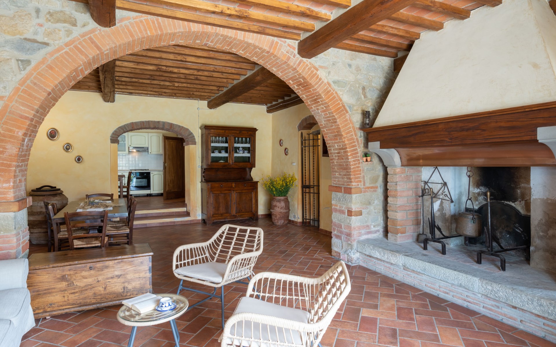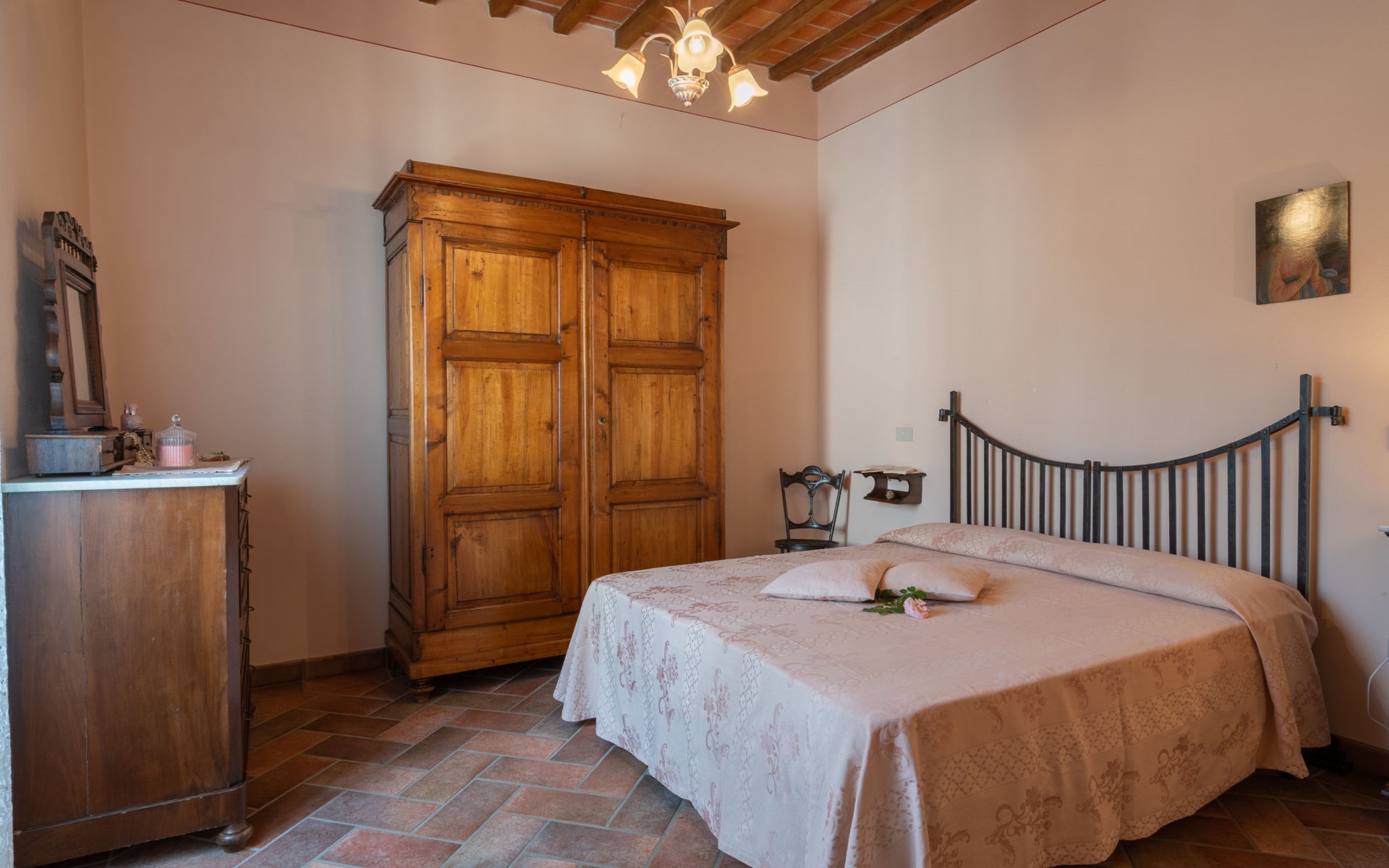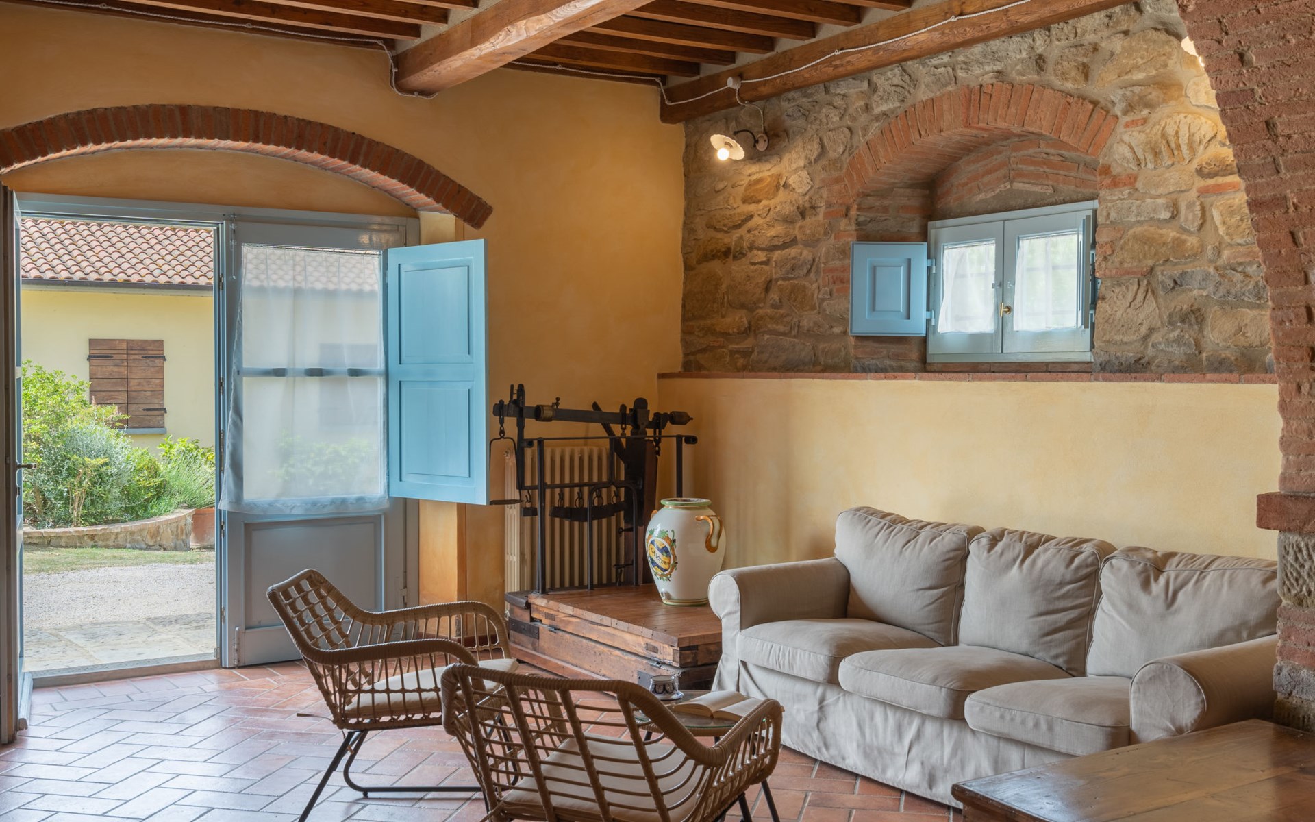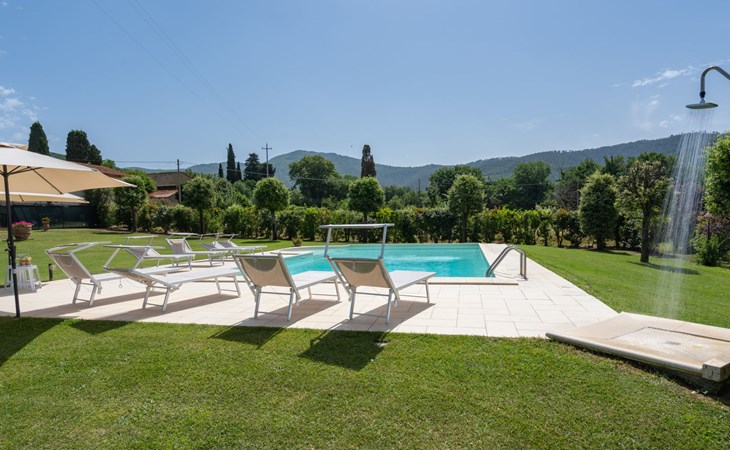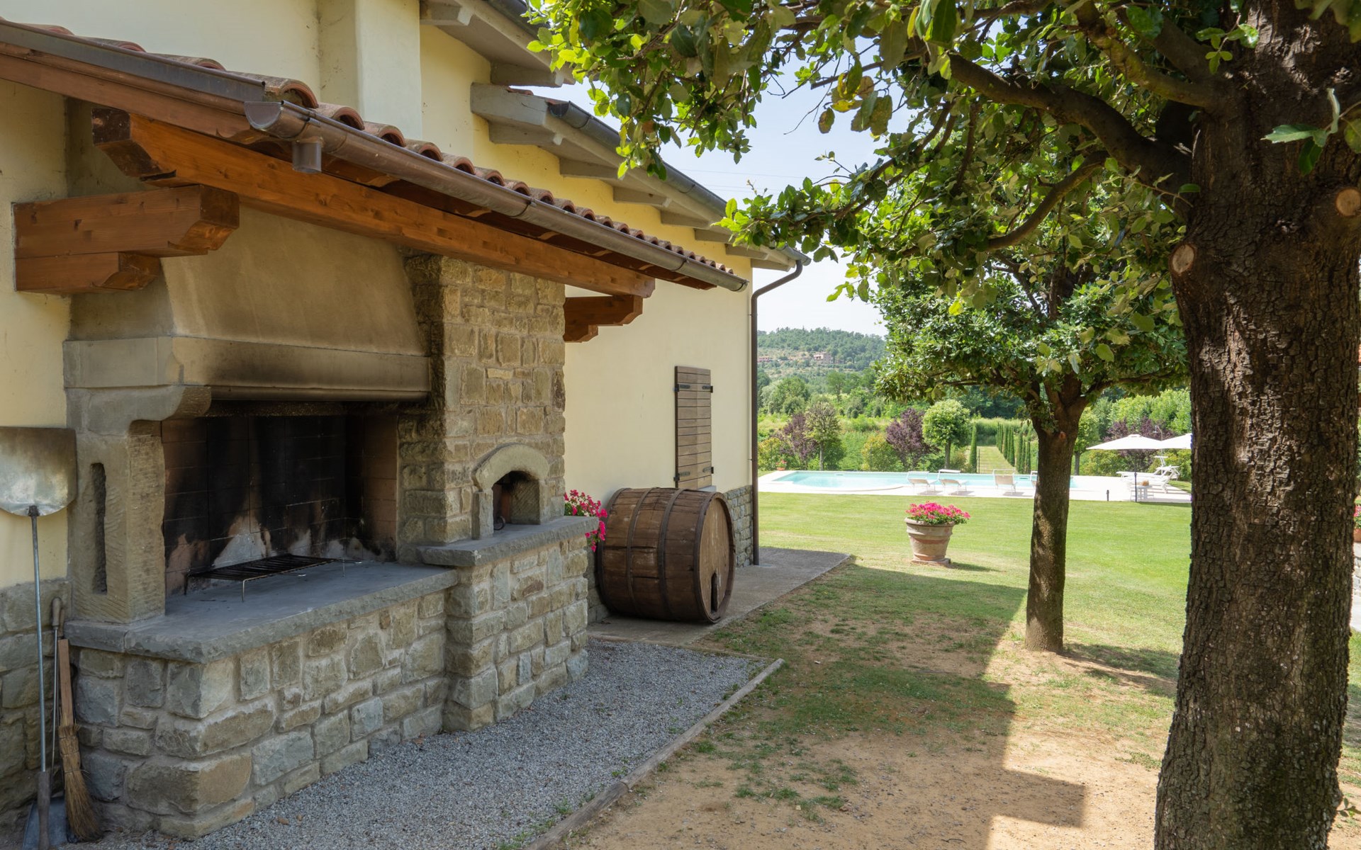 Cottage "Santa Lucia", eenzijdig aangebouwd. 2.5 km van het centrum van Castiglion Fiorentino, 20 km van het centrum van Arezzo, 12 km van het centrum van Cortona, 35 km van het meer. Voor medegebruik: terrein 3 ha, boomgaard. Voor alleengebruik: terrein 1.500 m2, tuin gazon en bomen, openluchtzwembad (12 x 6 m, 140 - 200 cm diepte, seizoensgebonden beschikbaarheid: 01.Mei. - 30.Sep.). Buitendouche, parkeerplaats op het terrein. Winkel 1 km, supermarkt 2.5 km, bushalte 1 km, treinstation "Castiglion Fiorentino" 2.5 km, meer (zwemmen) "Trasimeno" 35 km. Golfterrein (9 holes) 20 km. Attracties in de buurt: Valdichiana Outlet Village 25 km.