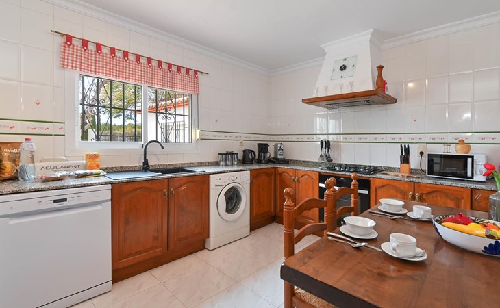 - keuken met gasfornuis, electrische oven, magnetron, afwasmachine, koel-vriescombinatie, koffiezetapparaat, waterkoker, mixer, broodrooster en citruspers