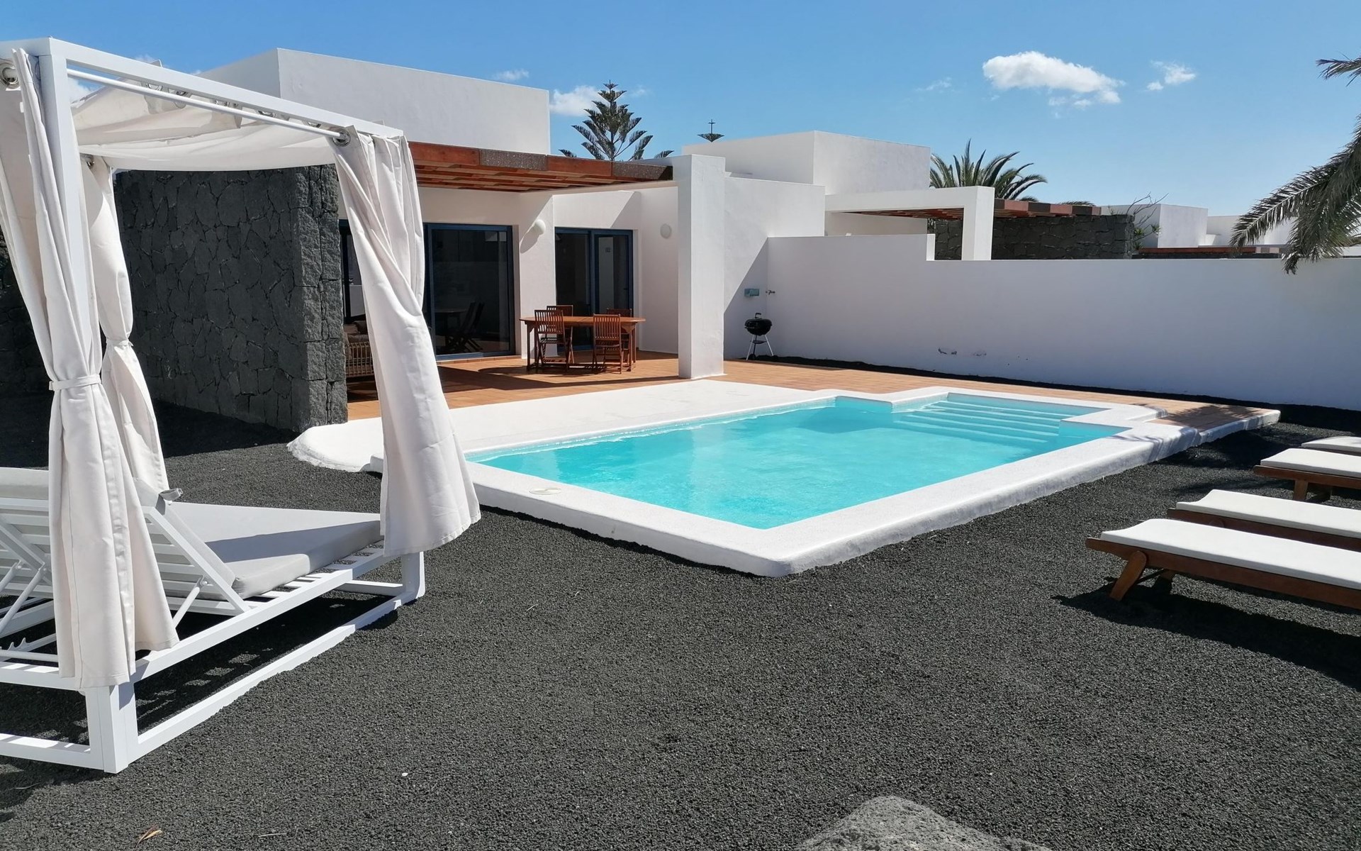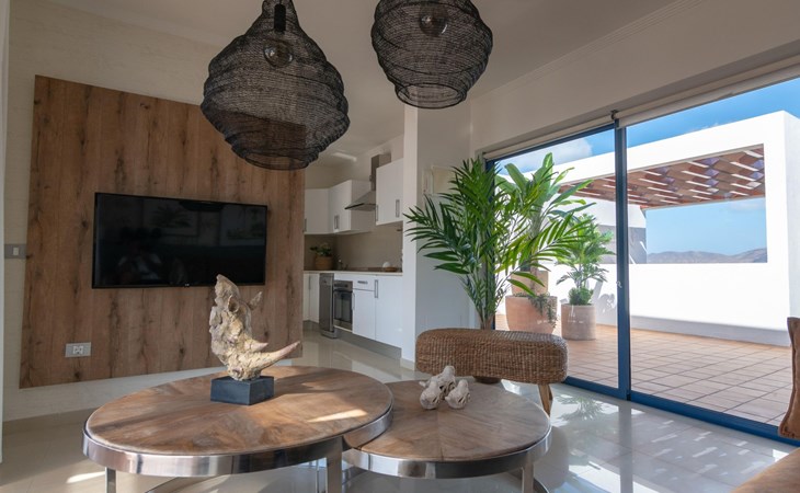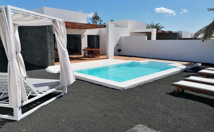 Bellavista 3 km van Playa Blanca: Mooi rijtjeshuis "Bellavista". 2.5 km van zee. Voor alleengebruik: terrein 500 m2, openluchtzwembad hoekig, verwarmd (6 x 4 m, seizoensgebonden beschikbaarheid: 01.Jan. - 31.Dec.) met trap. Barbecue. Trappenweg (14 treden) naar het huis. Supermarkt 500 m, restaurant 1.5 km, bushalte "El Pueblito" 550 m, zandstrand "Flaamingo" 2.5 km. Golfterrein (18 holes) 32 km, manege 1.5 km. Attracties in de buurt: Paque acĂșatico Agualava 1.8 km. Auto noodzakelijk.