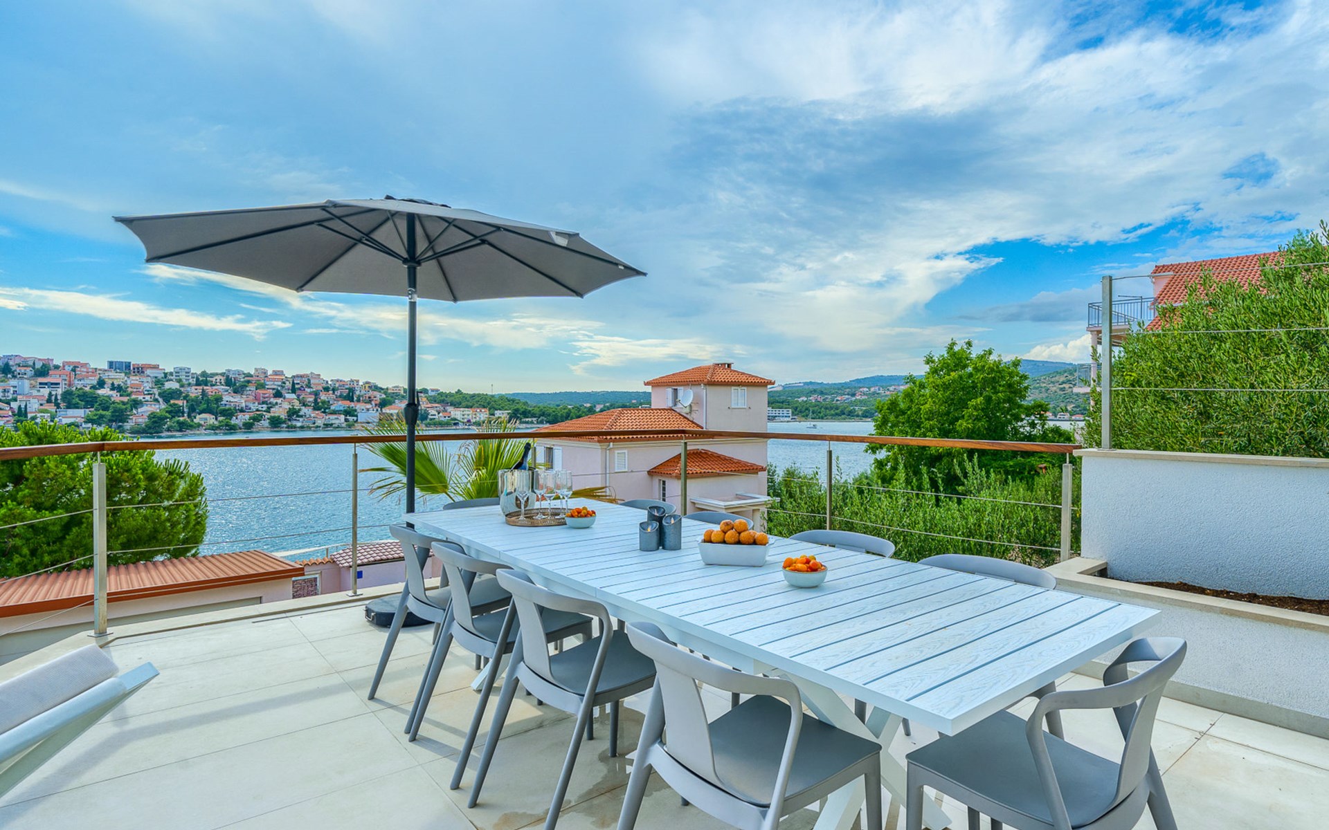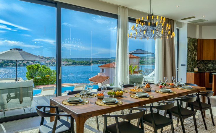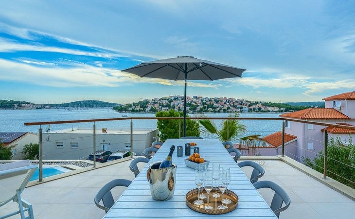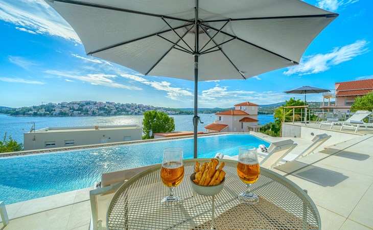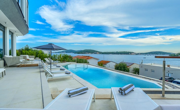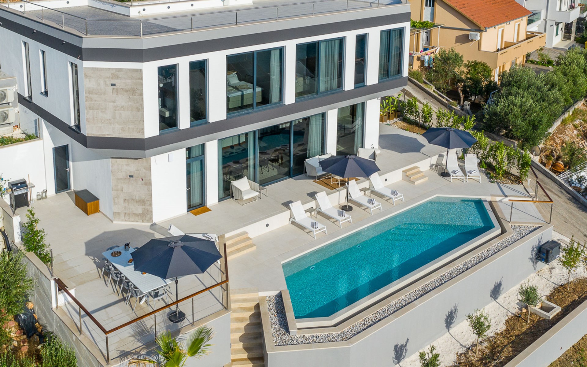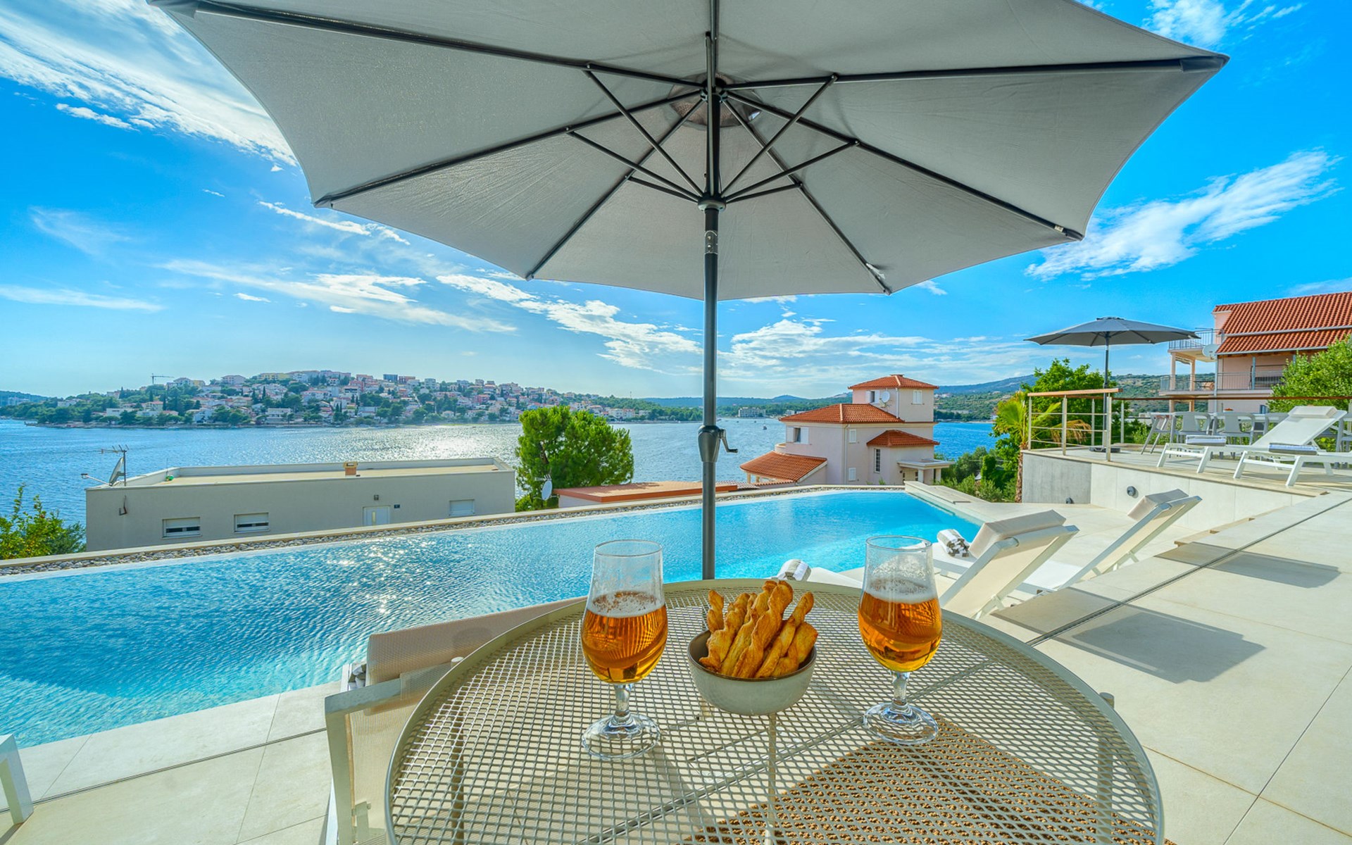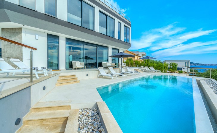Villa "Allina", van 2 verdiepingen, vrijstaand. Zatoglav, 5 km van het centrum van Rogoznica, rustige, zonnige, verhoogde ligging, 50 m van zee, 180 m van het strand, op het westen. Voor alleengebruik: terrein 750 m2, openluchtzwembad hoekig (50 m2, 150 cm diepte, seizoensgebonden beschikbaarheid: 01.Mei. - 01.Okt.). Buitendouche, terras (15 m2), barbecue. In het huis: internetaansluiting, Internet (WiFi), wasmachine, droger. Parkeerplaats (voor 3 auto's) bij het huis op het terrein. Winkel 4 km, restaurant 5 km, bakkerij 4 km, bushalte 1.5 km, rotsstrand 180 m. Jachthaven 5 km.